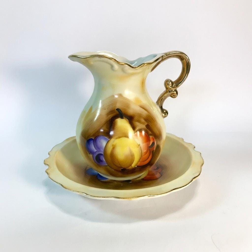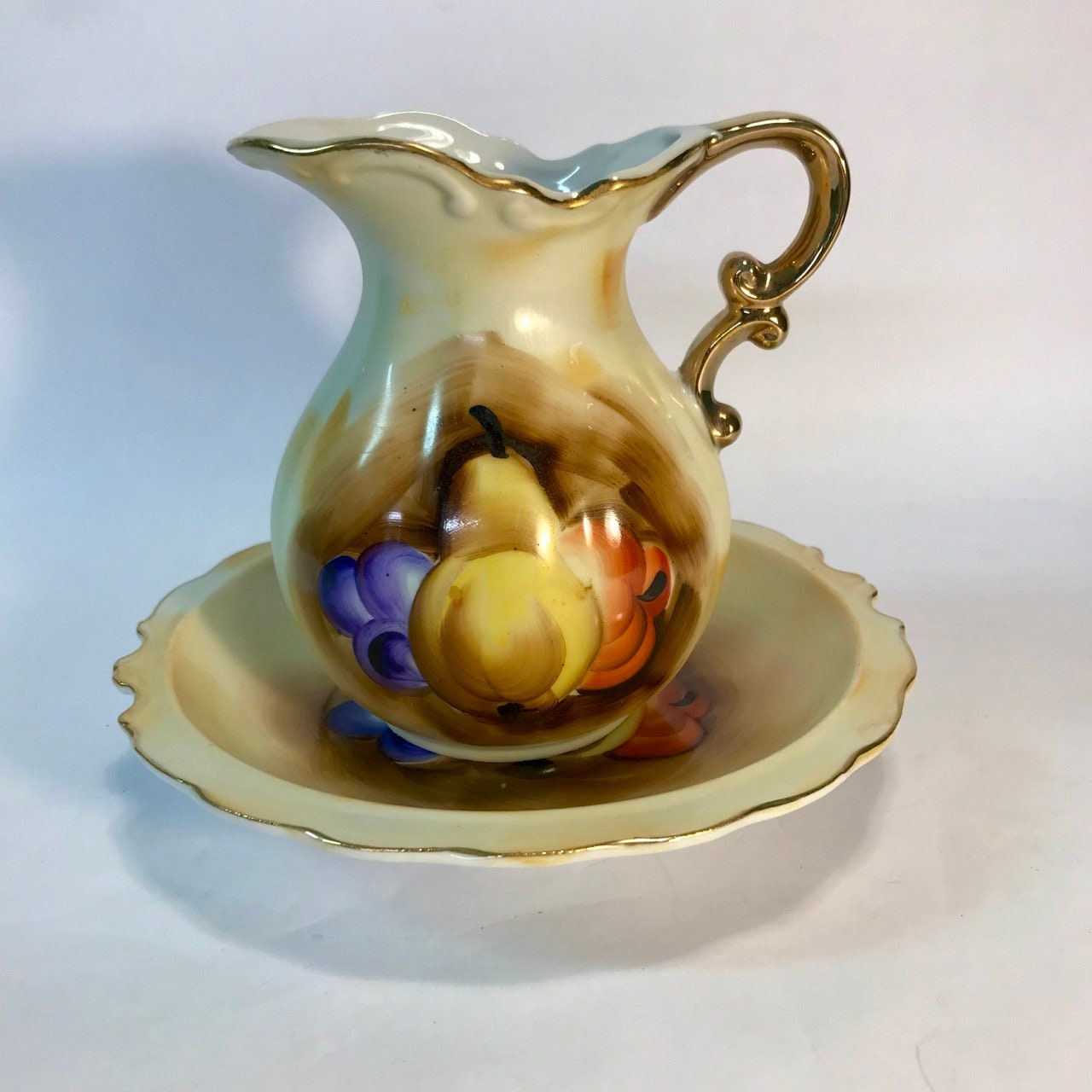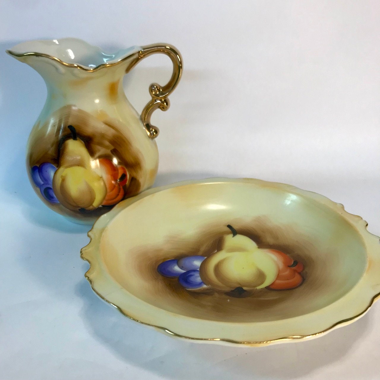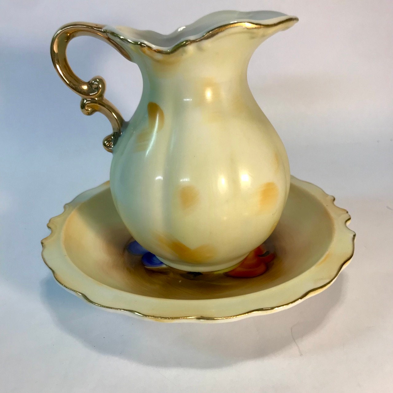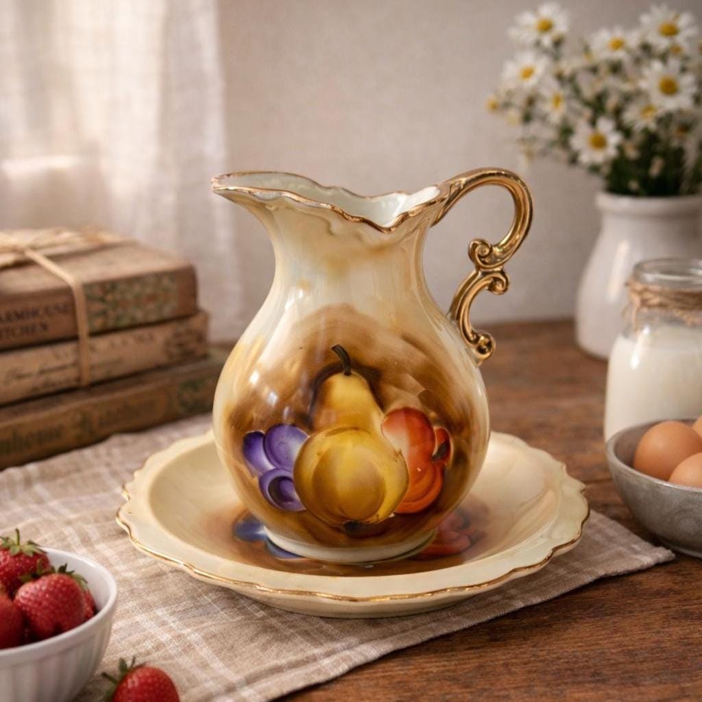 This beautifully hand painted pitcher and bowl set showcases fruit and accents of gold on the detailed handle and rim. Pitcher measures 5 1/2" high and 5" from handle to rim. Saucer measures 7 1/4" in diameter. No chips, cracks or crazing.