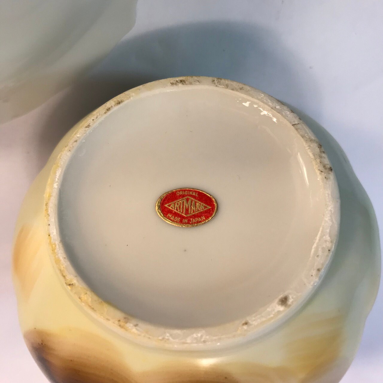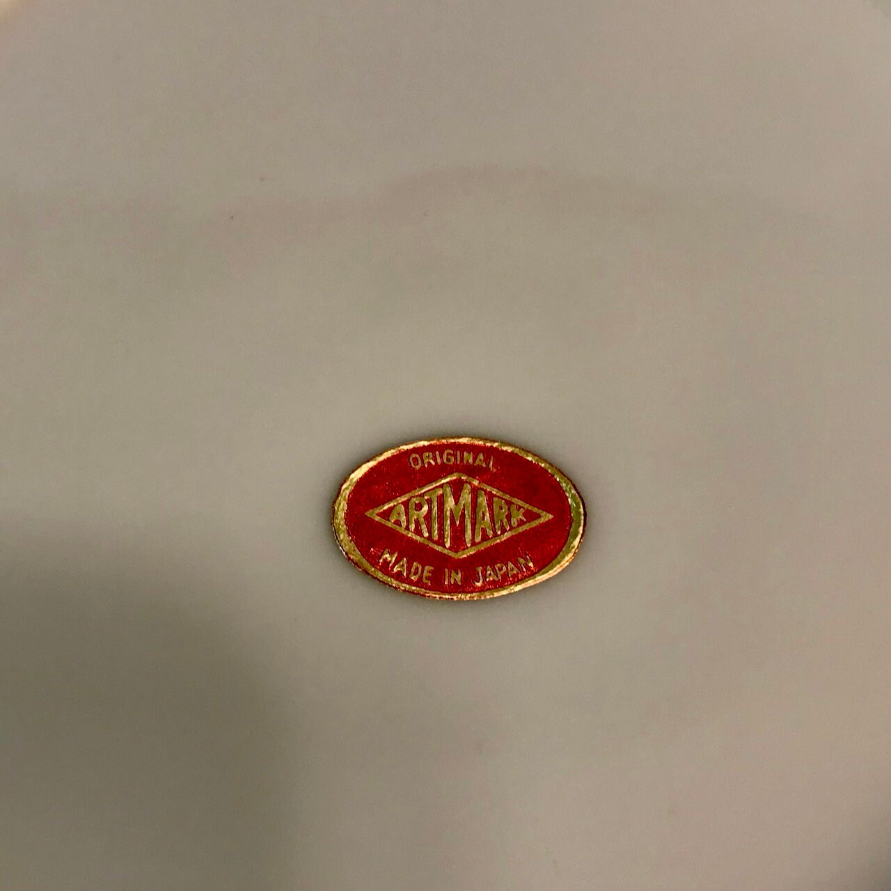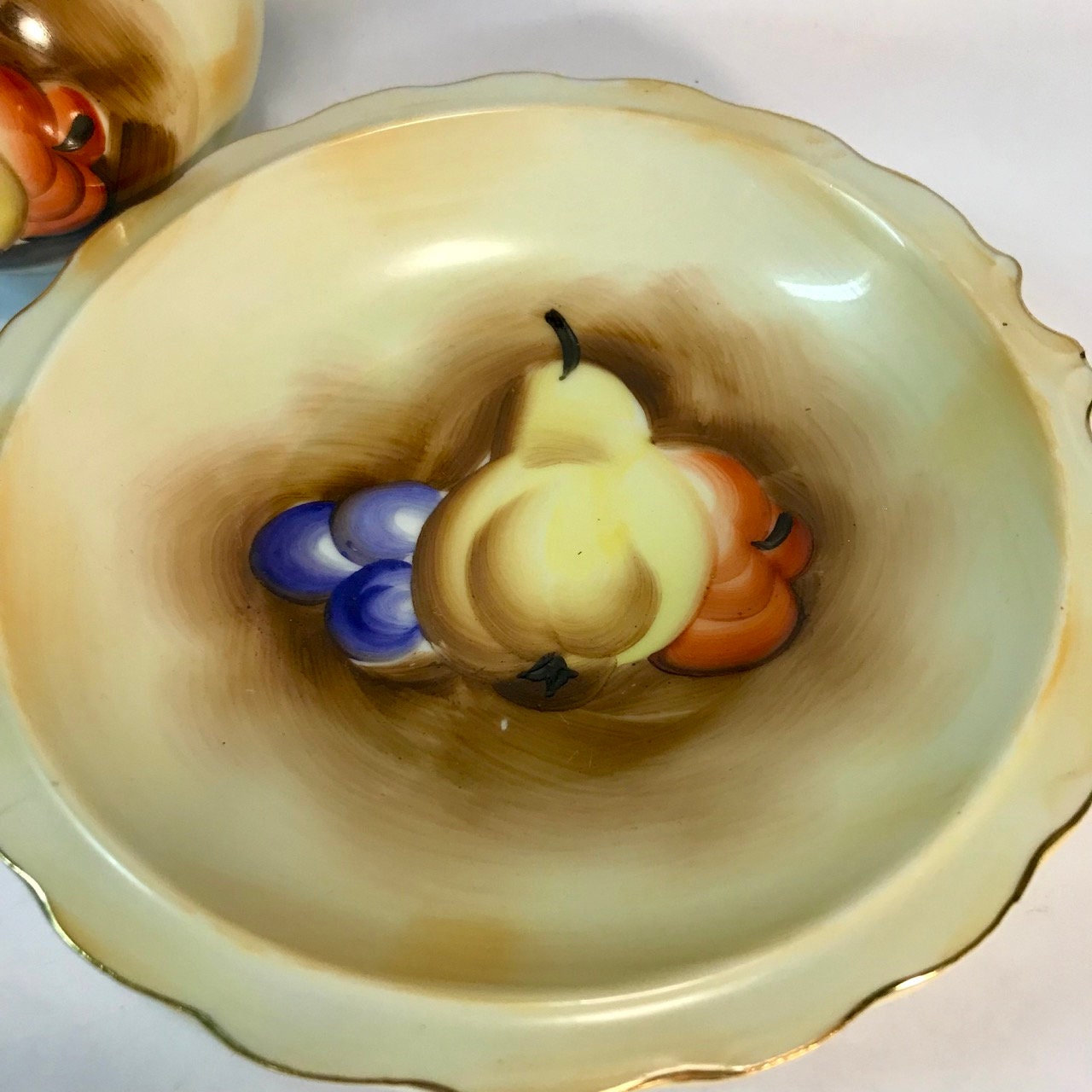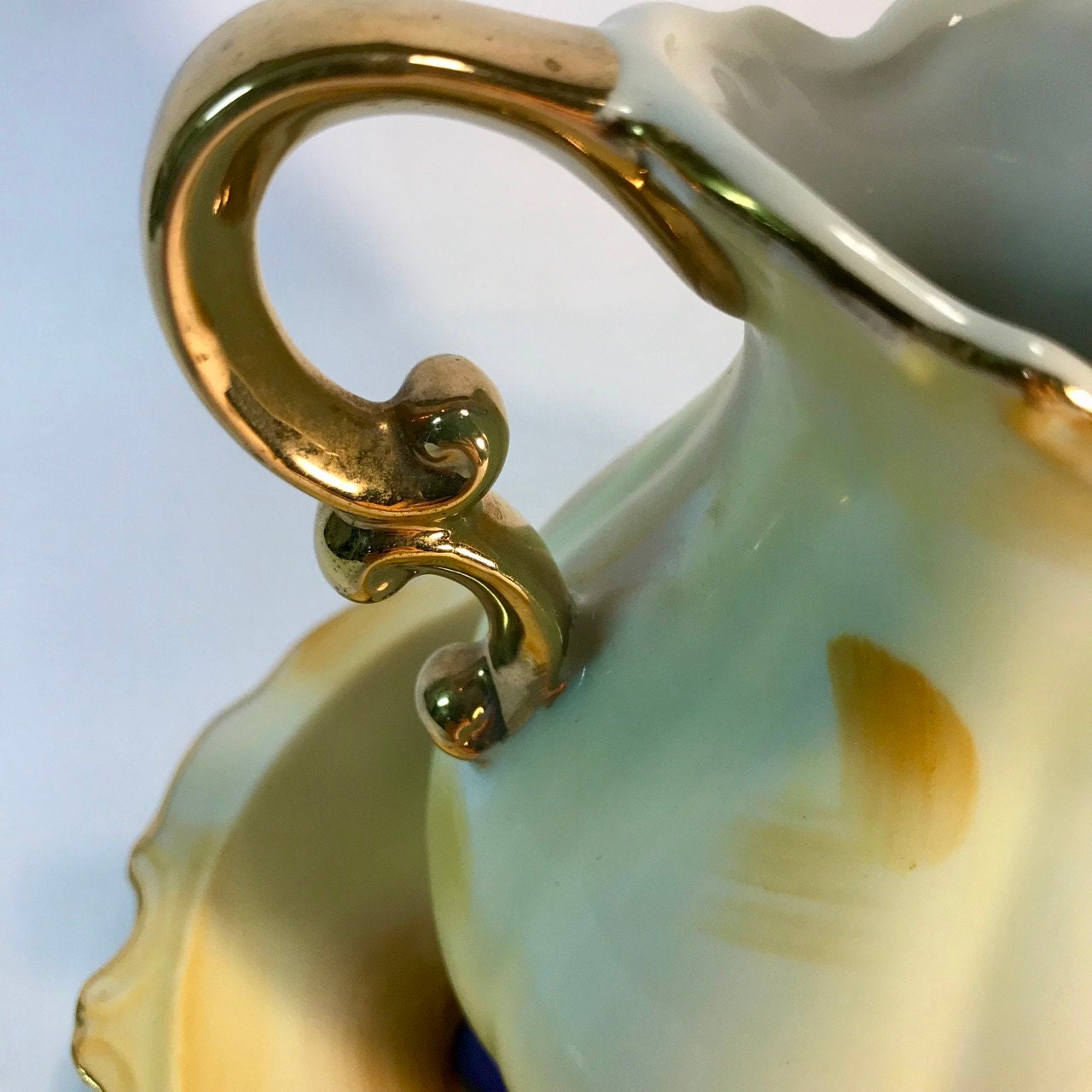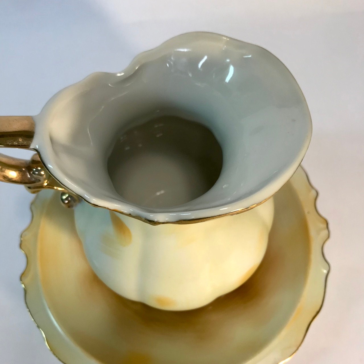 This beautifully hand painted pitcher and bowl set showcases fruit and accents of gold on the detailed handle and rim. Pitcher measures 5 1/2" high and 5" from handle to rim. Saucer measures 7 1/4" in diameter. No chips, cracks or crazing.