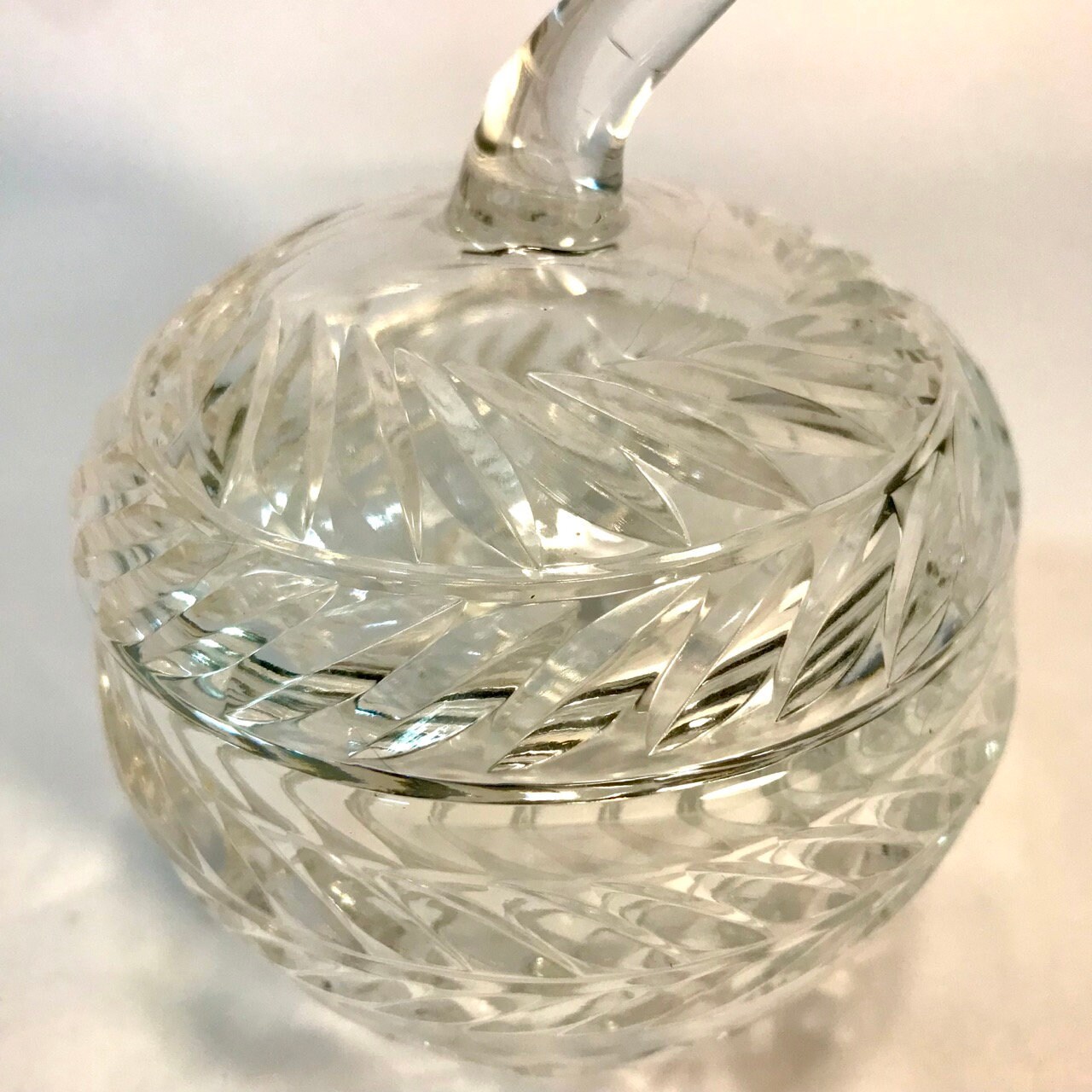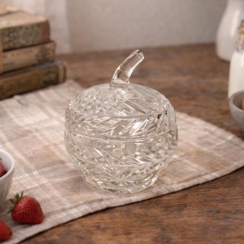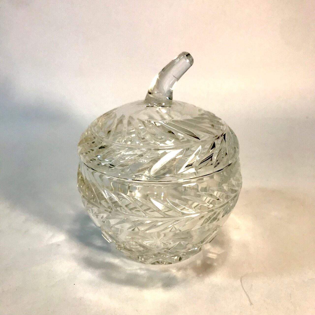 This is a heavy cut glass jar with a beautiful apple shape. Glass is clear. No chips or cracks or irregularities. Measures 4 3/4" x 4" diameter.