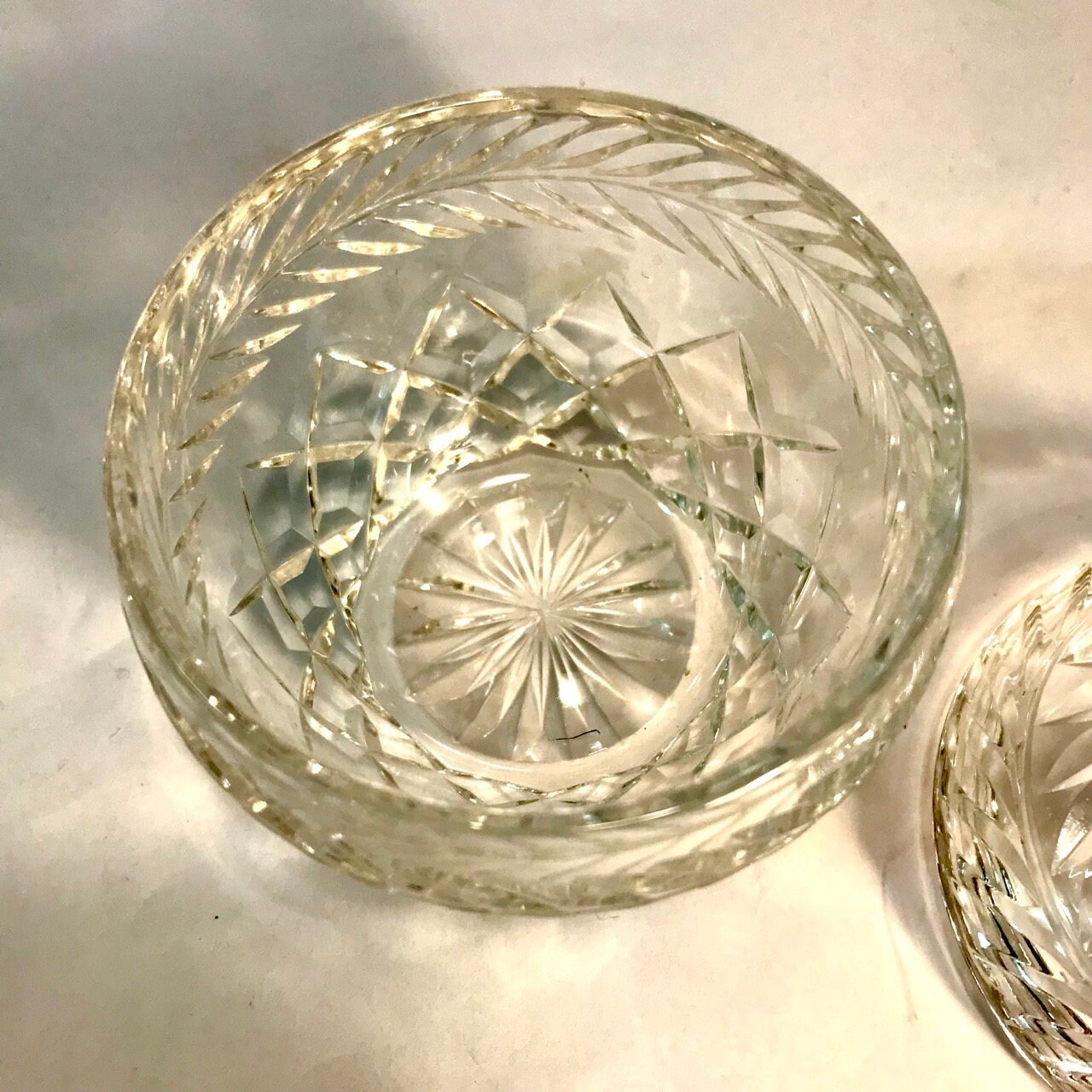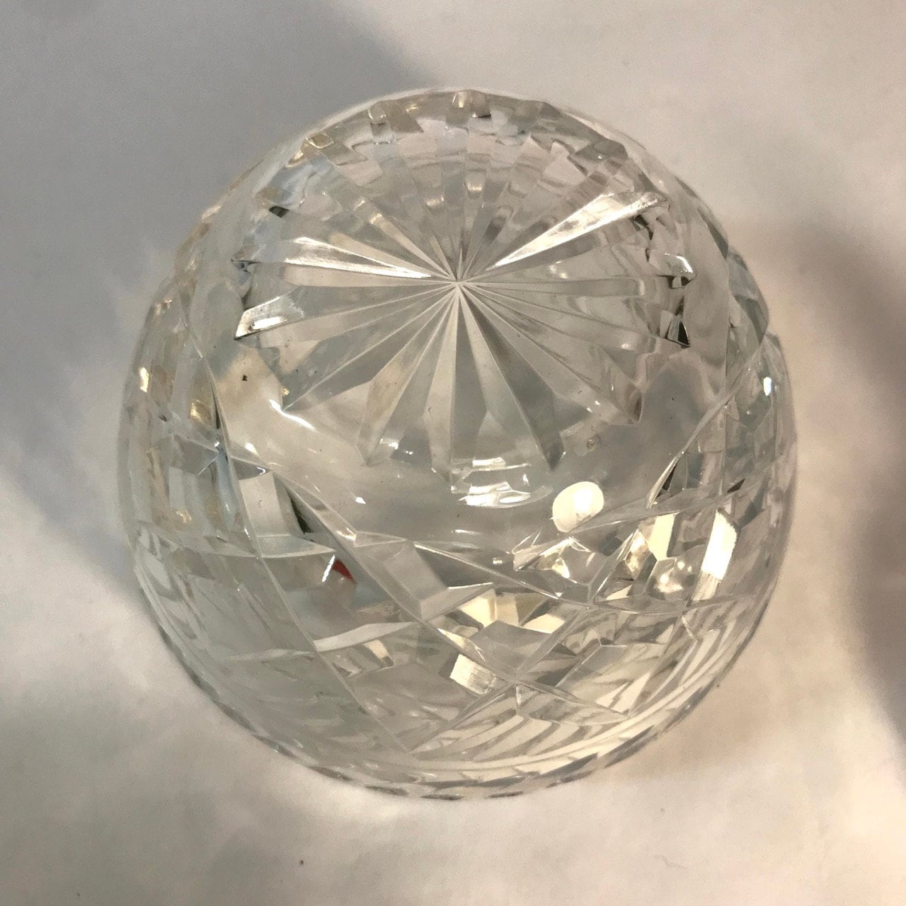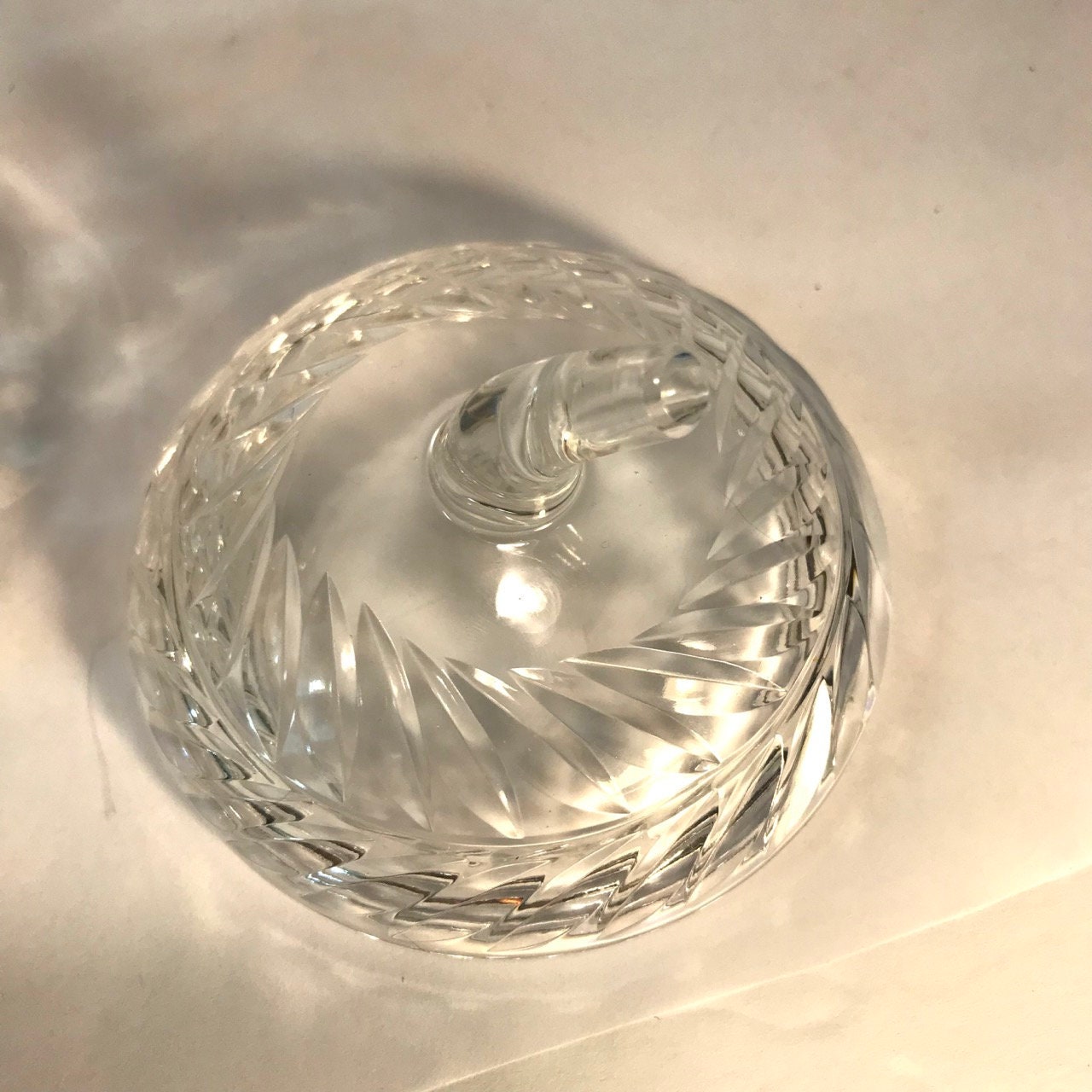 This is a heavy cut glass jar with a beautiful apple shape. Glass is clear. No chips or cracks or irregularities. Measures 4 3/4" x 4" diameter.