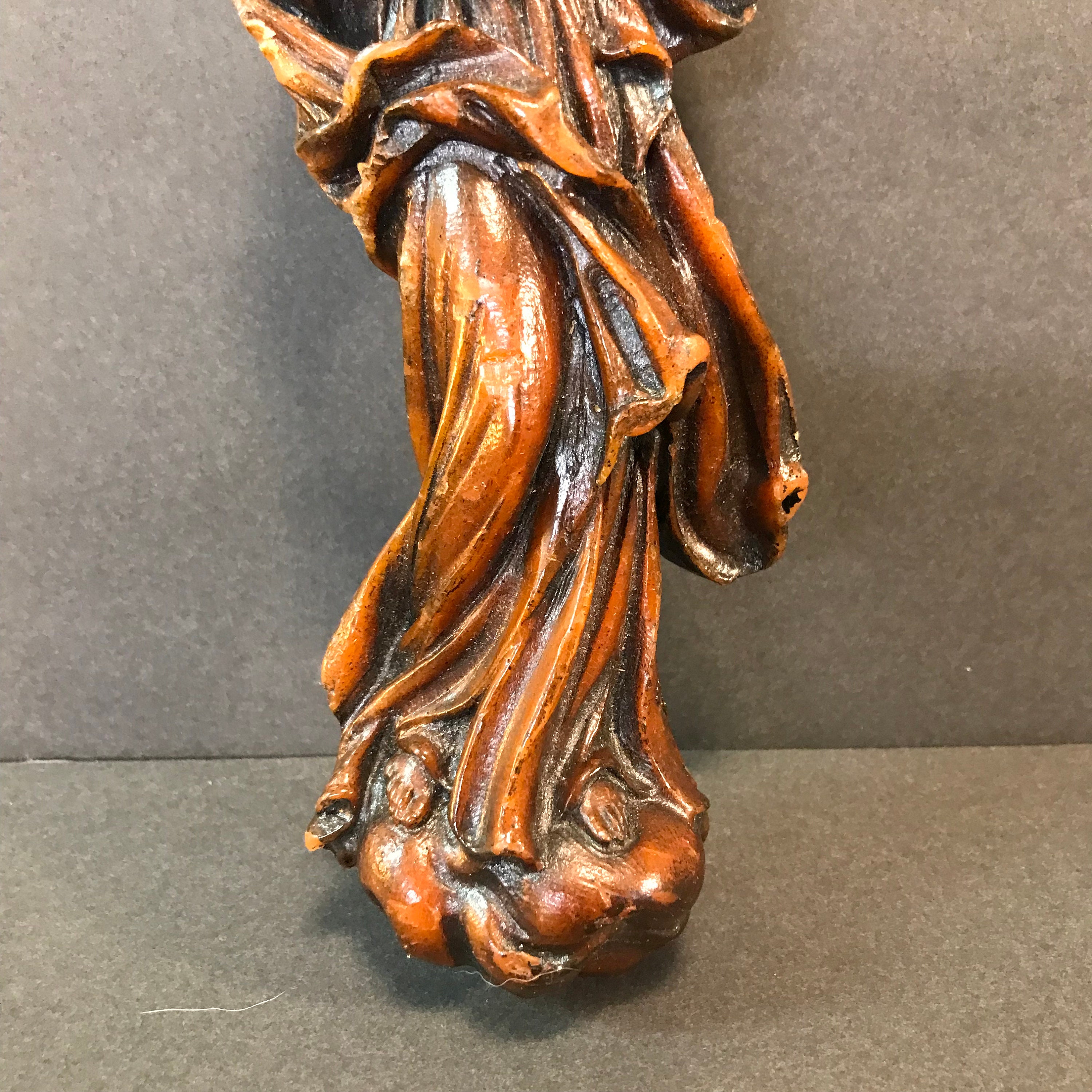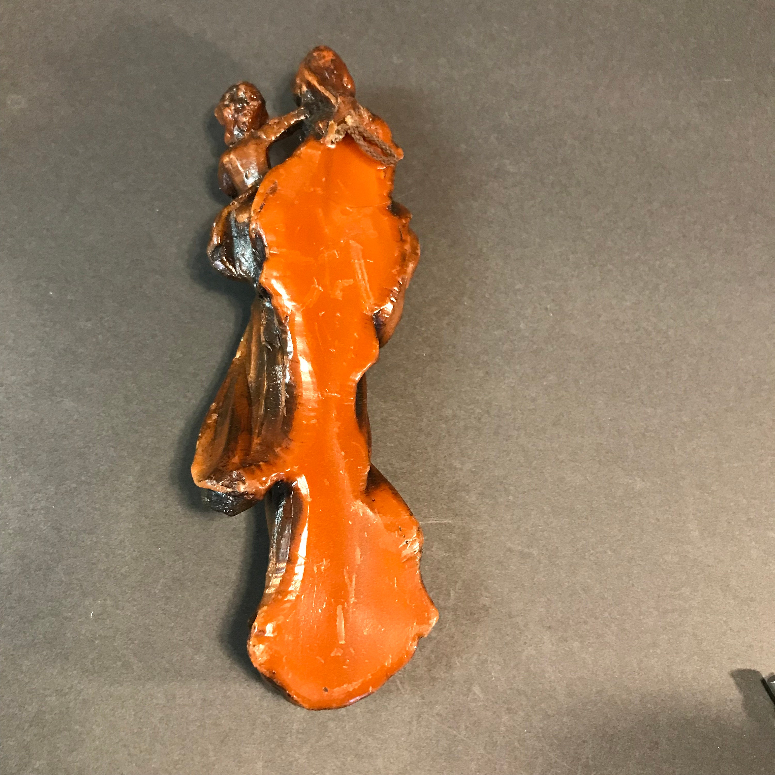This lovely hard wax sculpture is very unique. It is delicately carved and in excellent condition with no chips or cracks or irregularities. A beautiful walnut color. Has hanger on back. Measures 9" x 3".