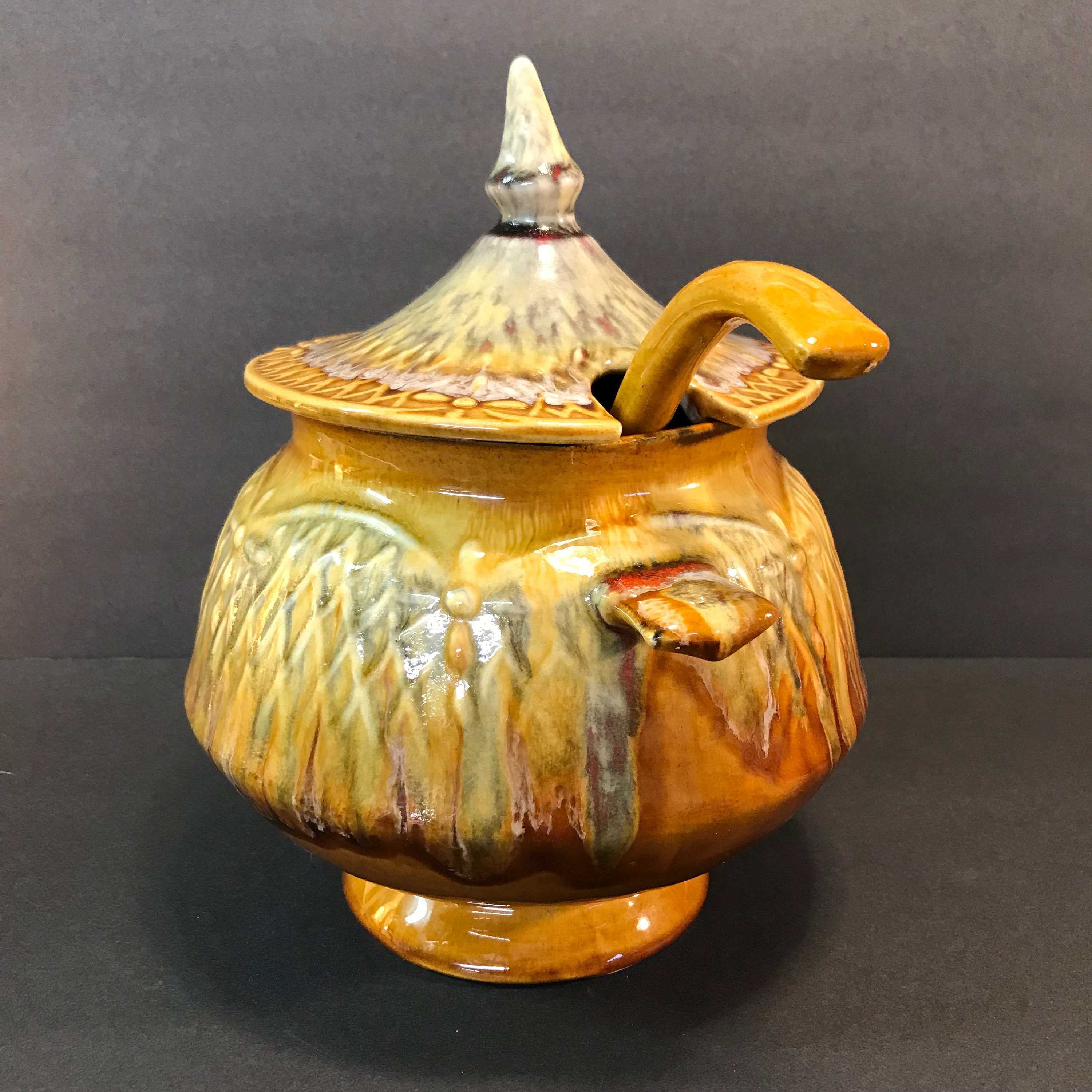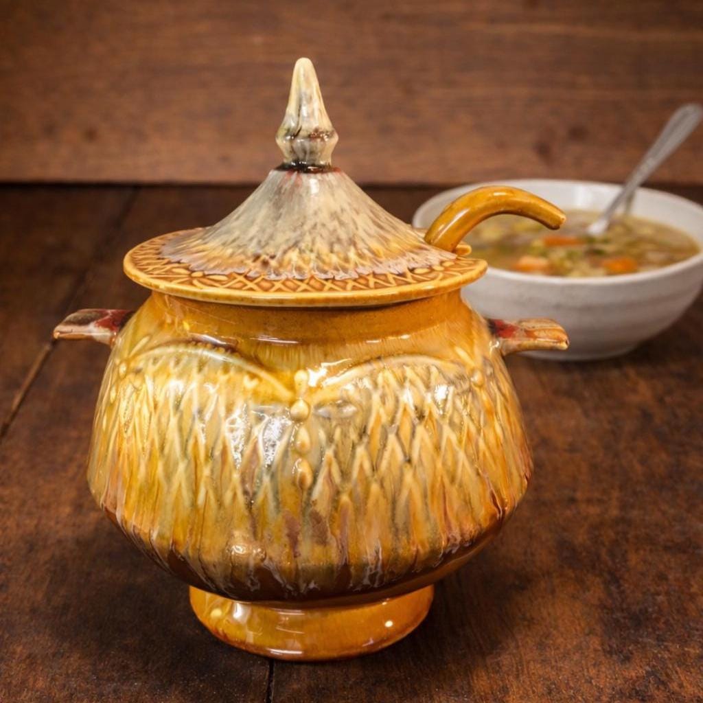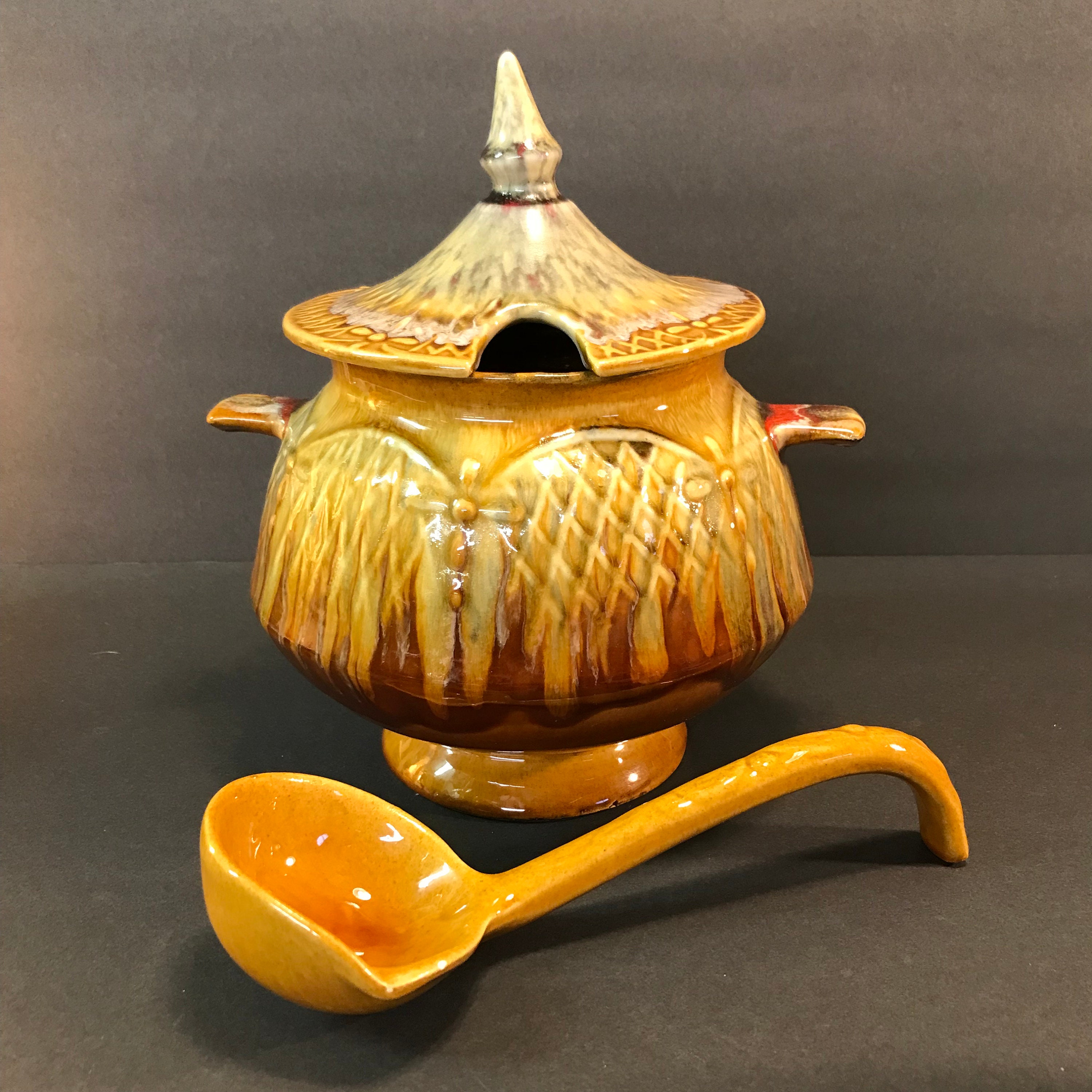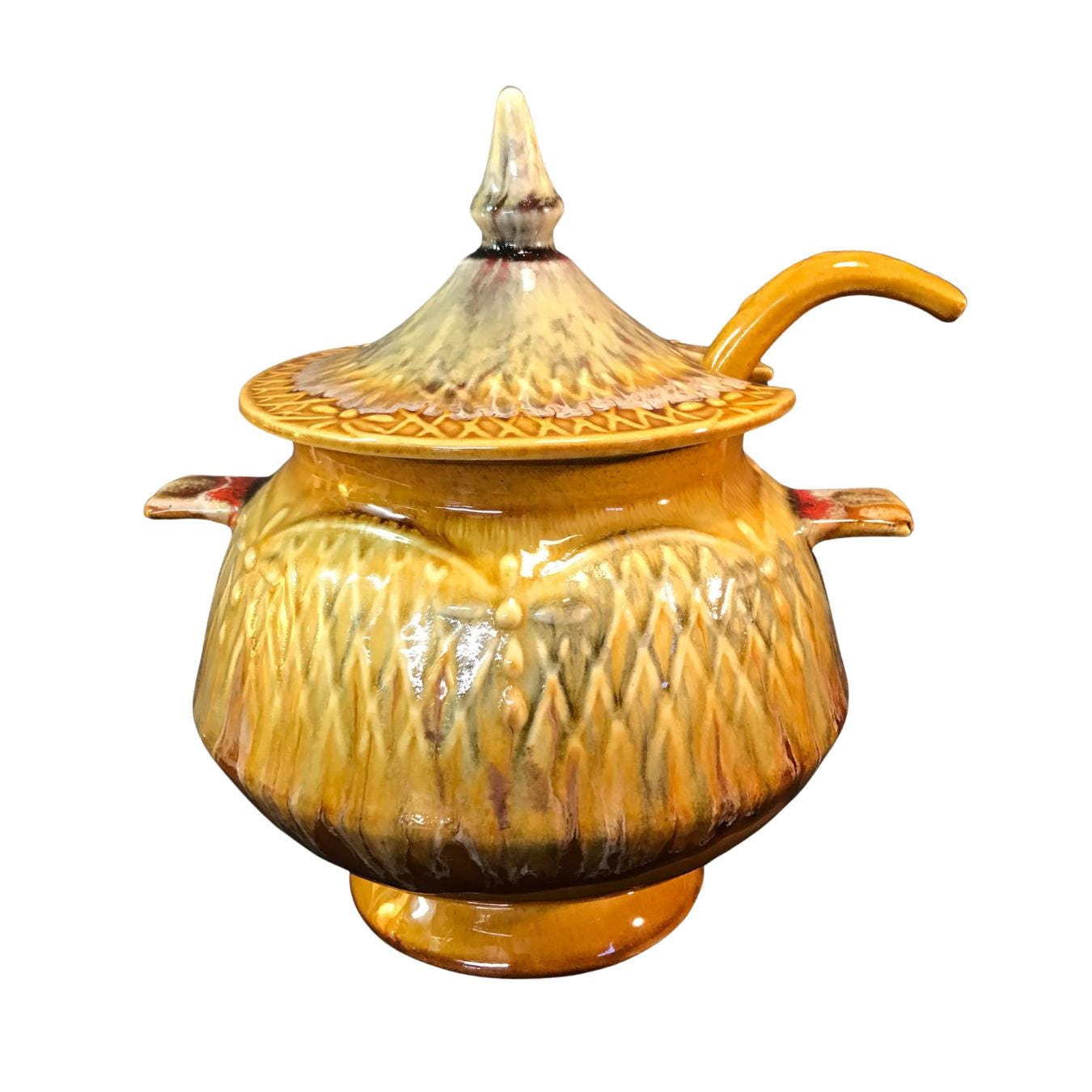 This soup tureen is absolutely gorgeous. The colors and glaze on this piece are very unique. Original ladle included.In pristine condition with a tiny flea bite on the ladle. Please see photos. It measures 9 1/4" in diameter and 9 3/4" in height.