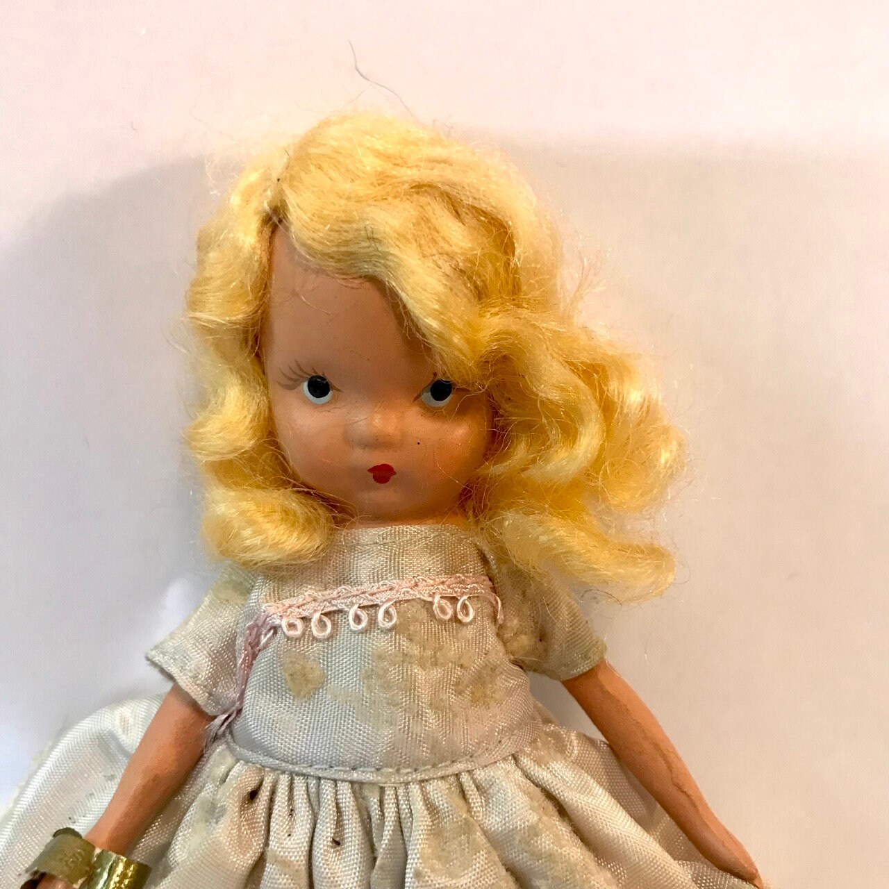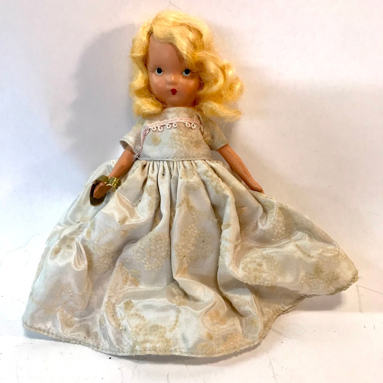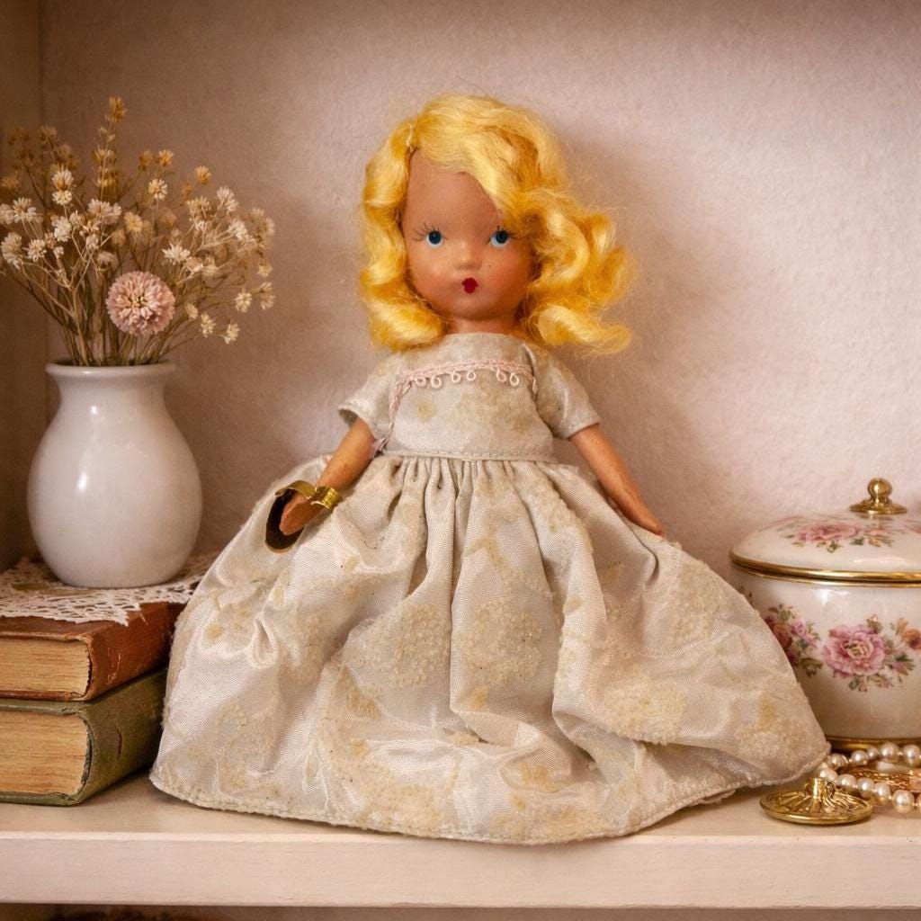 Introducing this charming vintage Nancy Ann Story Book doll! Her sweet little face is everything, capturing the essence of childhood nostalgia. Made in San Francisco between the 1930s and 1950s, this collectible treasure stands at 5 1/2 tall, making her the perfect addition to your doll collection or a unique decorative piece. Don’t miss out on this piece of history that brings joy and whimsy to any space. Add her to your cart today and embrace the magic of vintage storytelling!