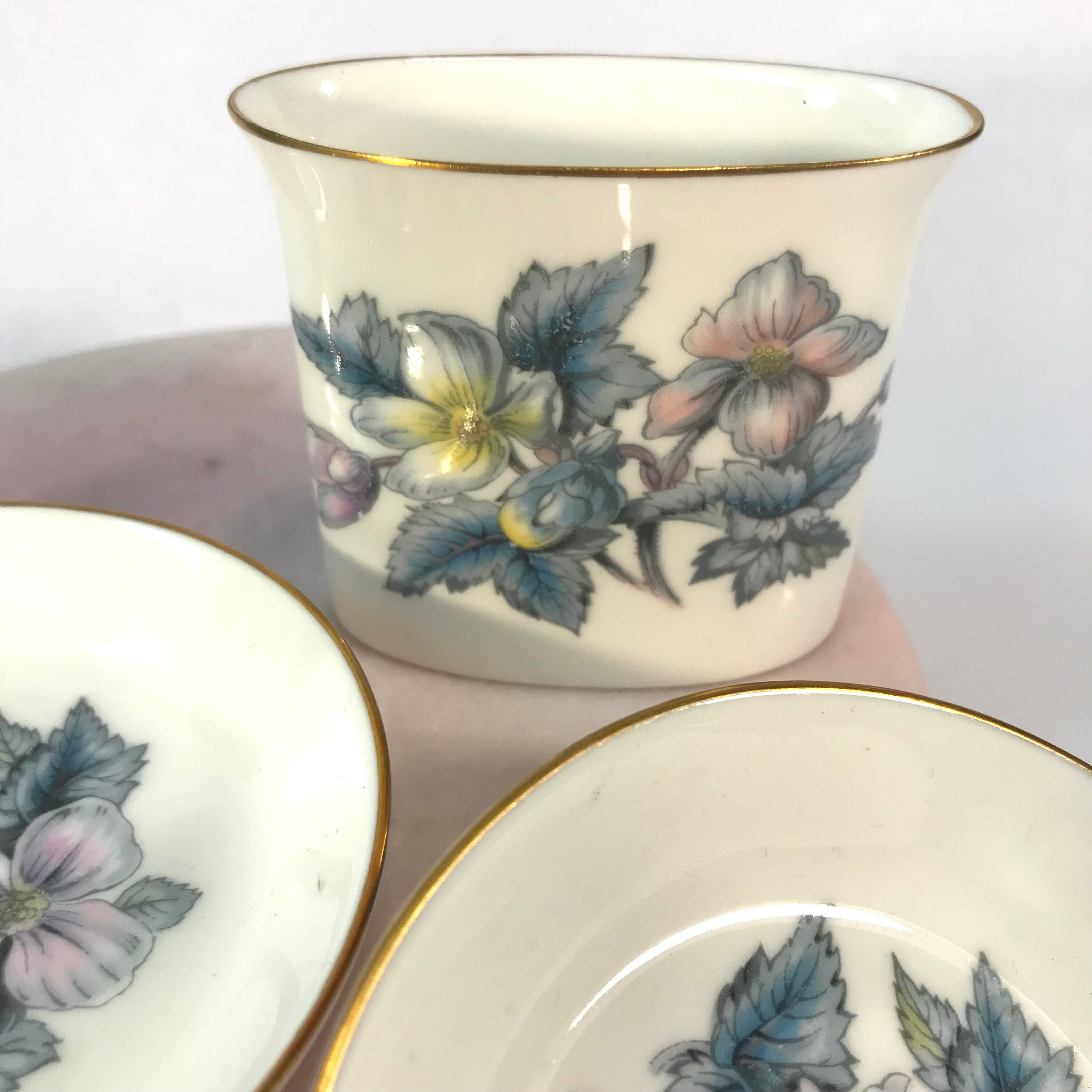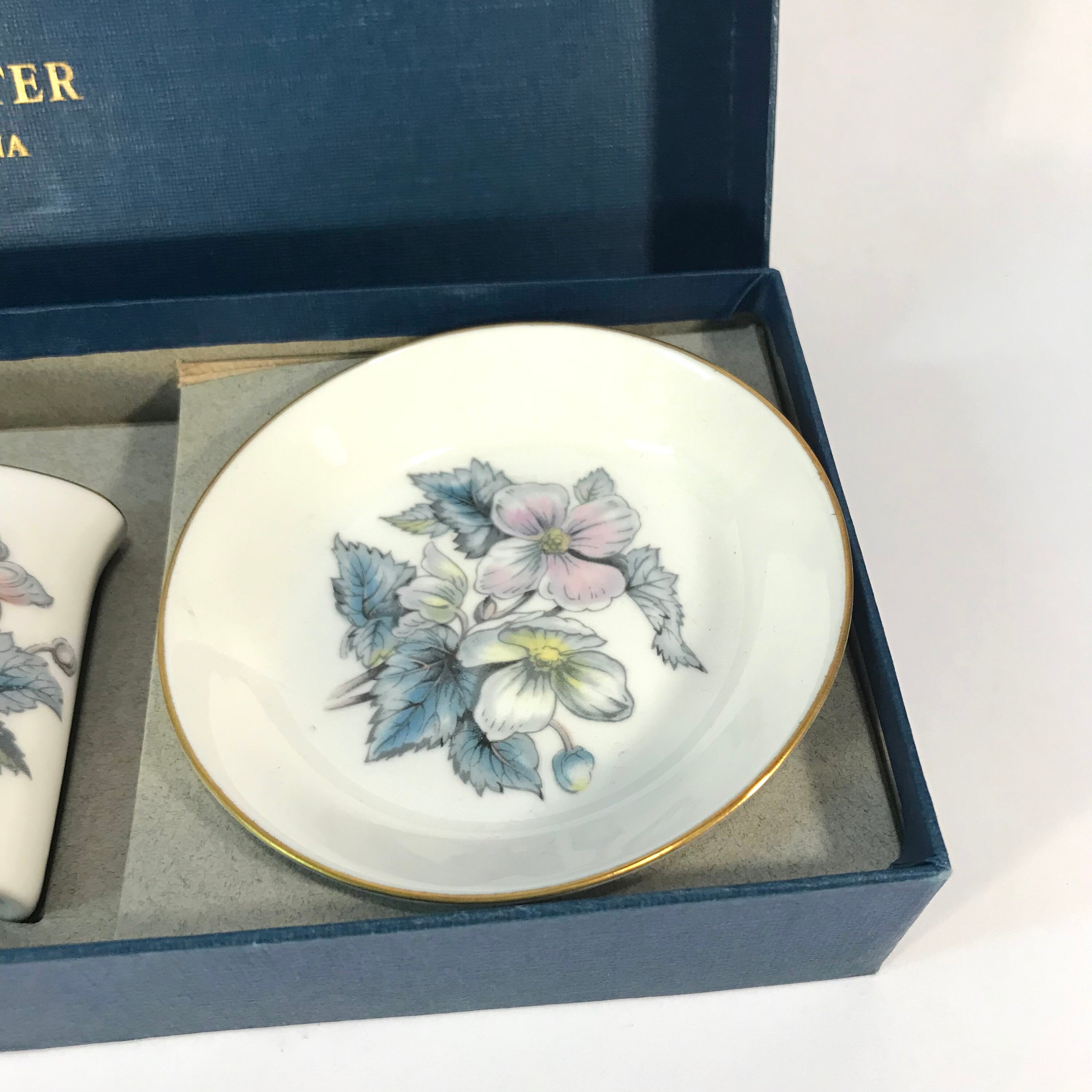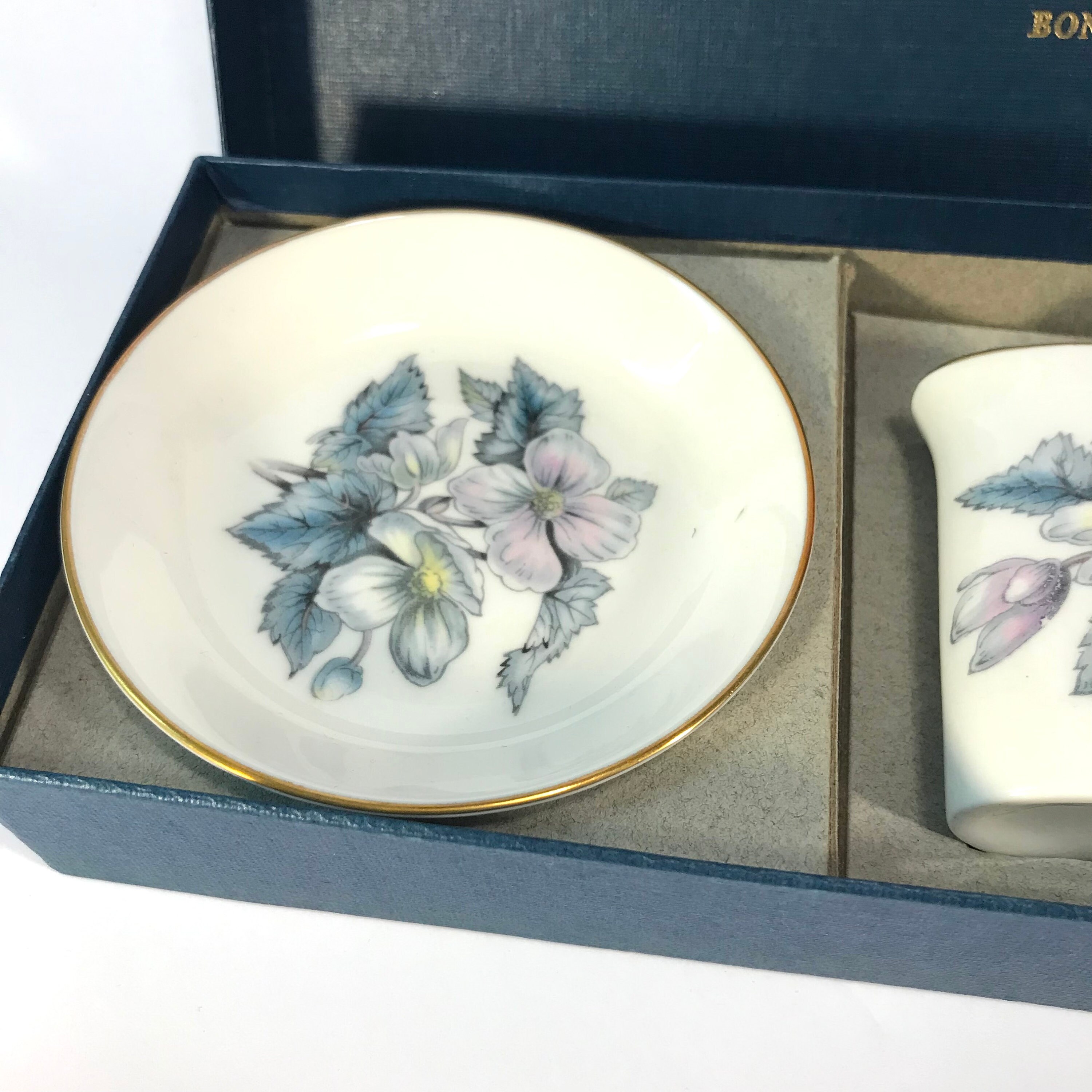 Like new condition. Comes with original box. Three piece set. Two small plates and one jar/container. Beautiful floral design. No chips or cracks. England #51