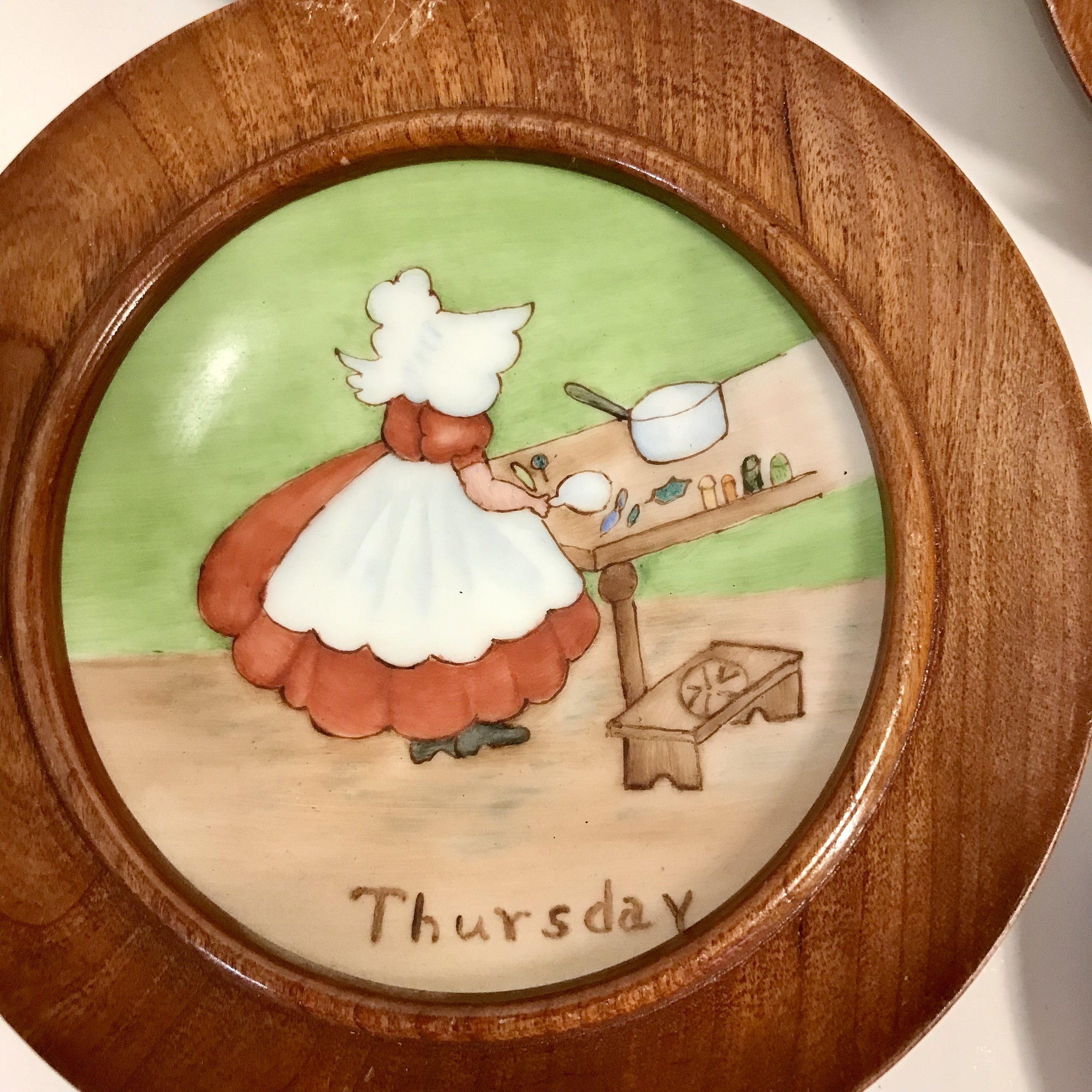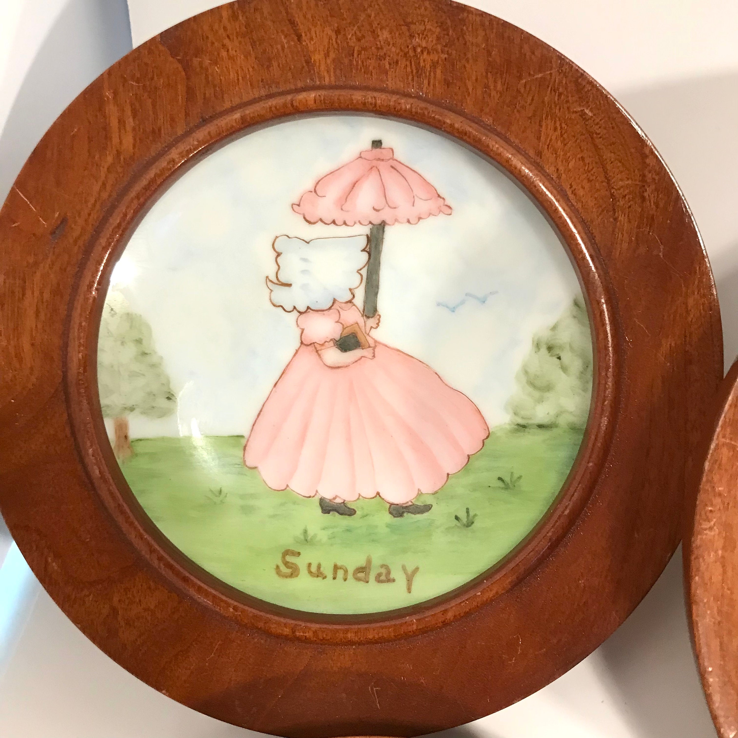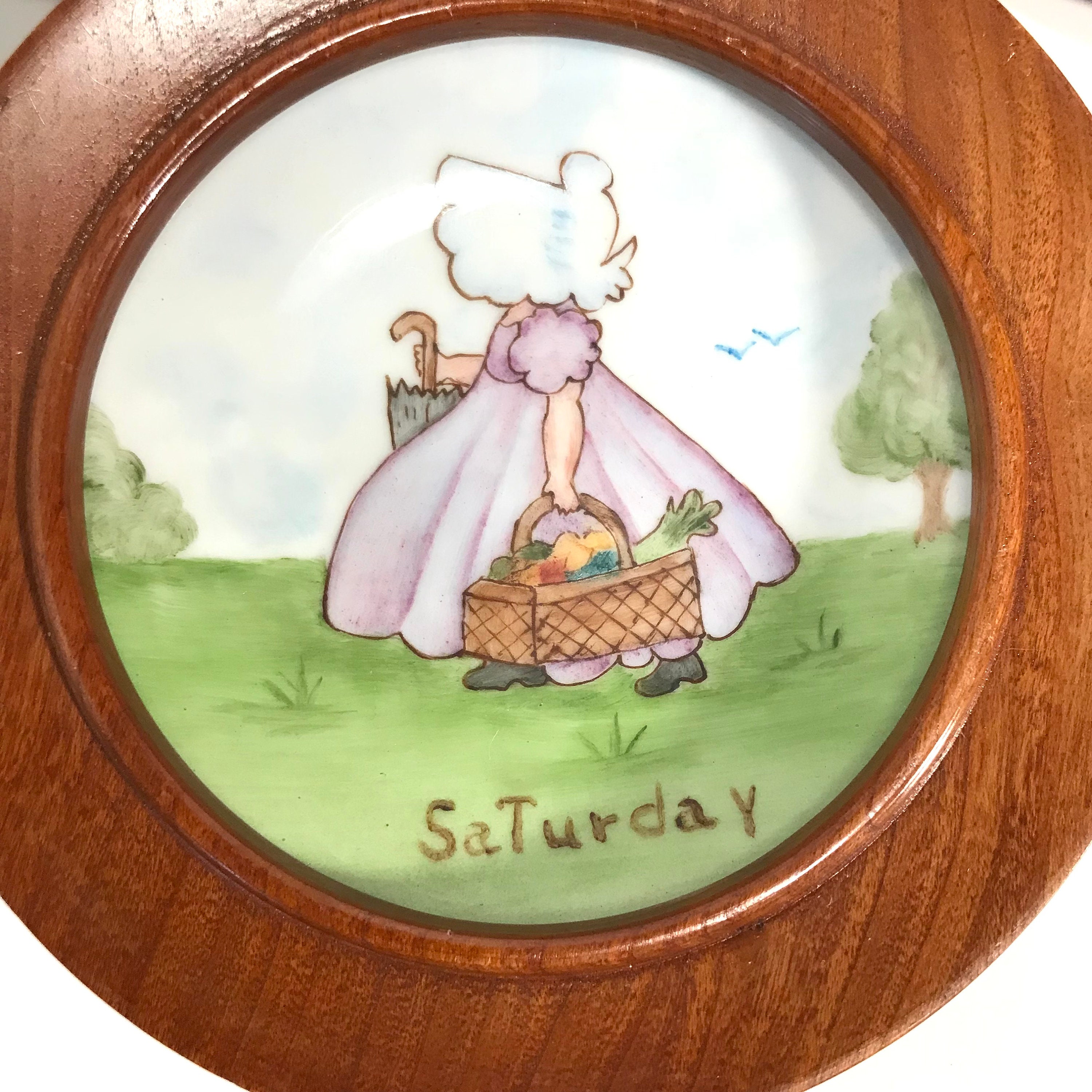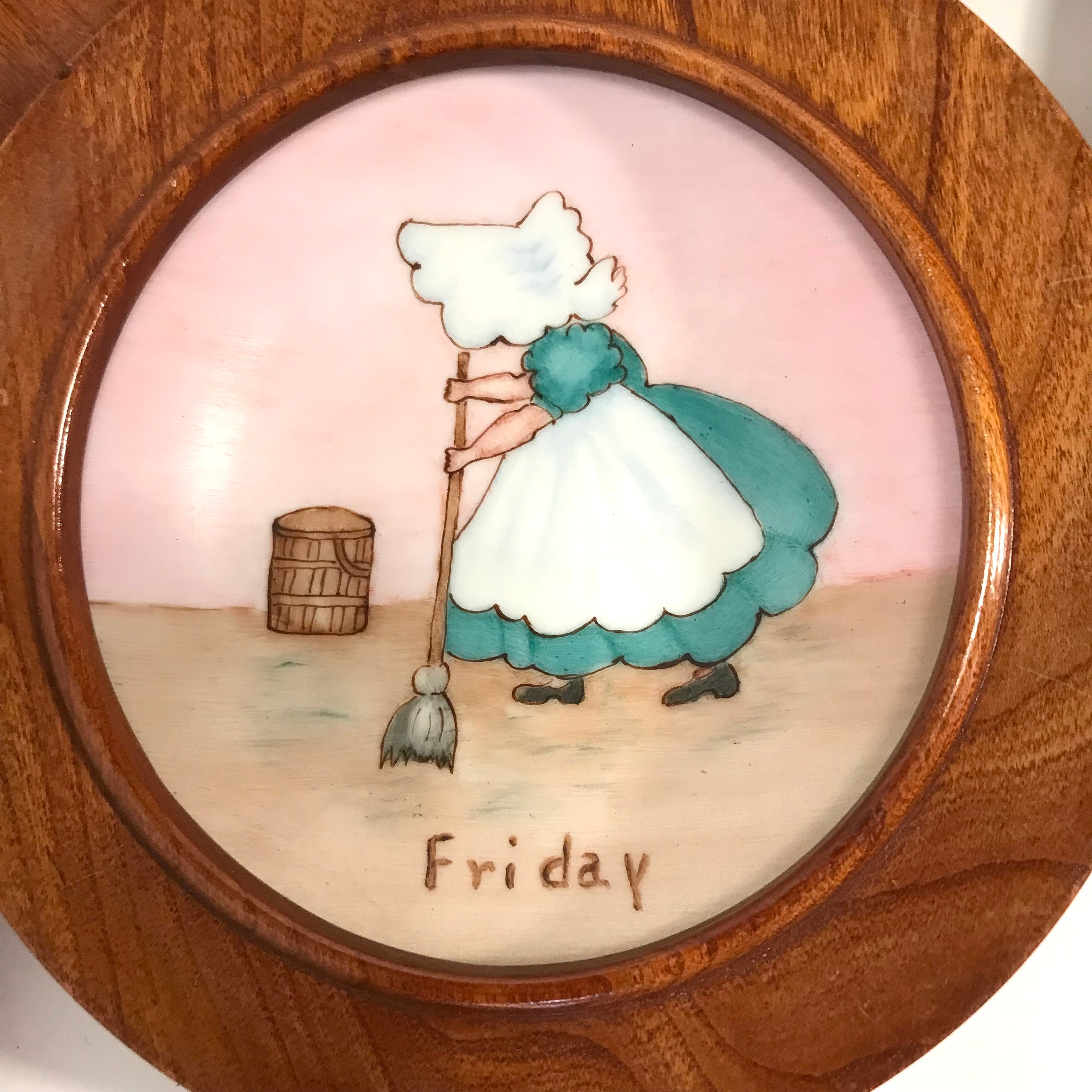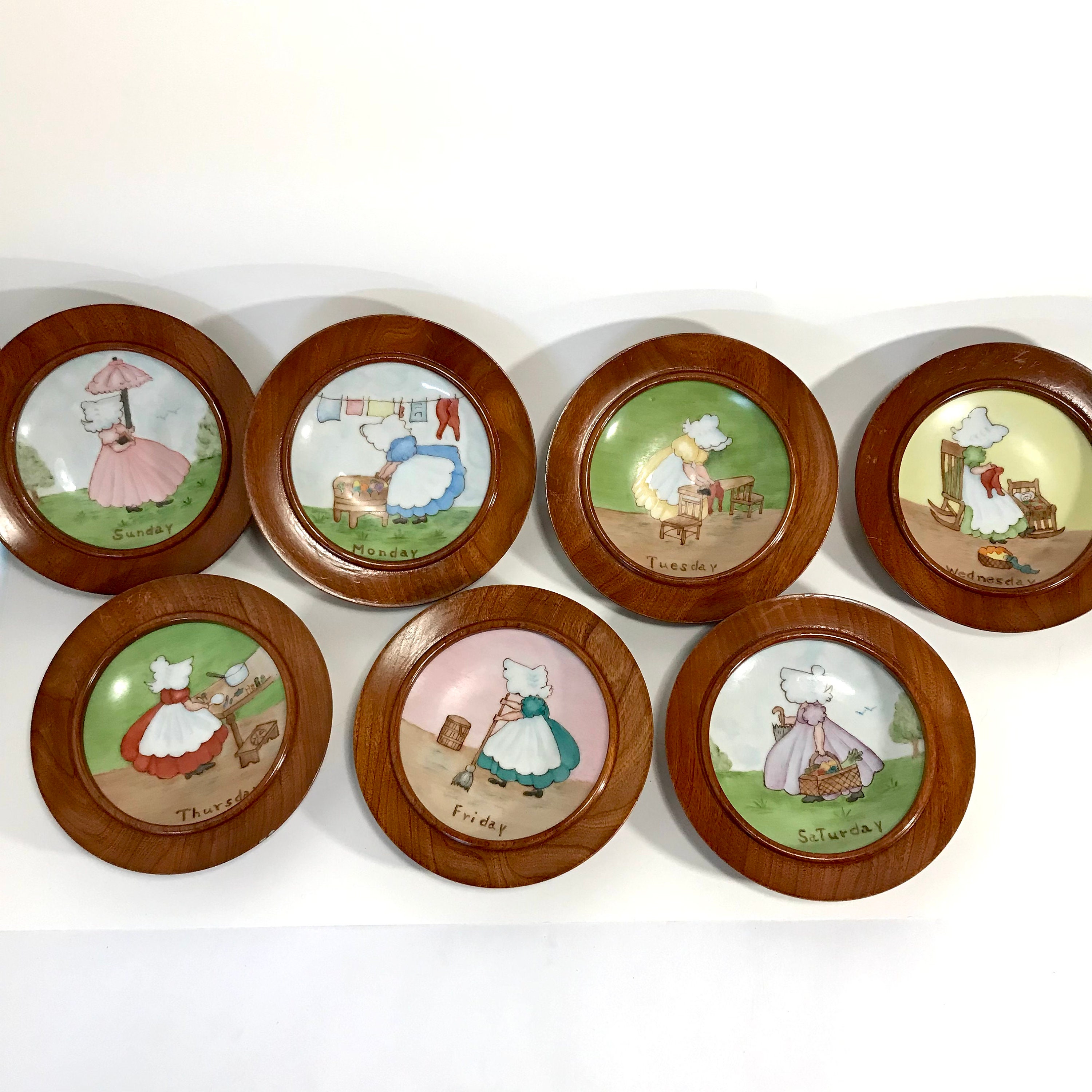 1968 Hand painted and signed Days of the Week Little Girls Collector Plates in Round Wooden Frames. All Seven days included. All in excellent condition. No cracks or chips. A small flea bite on one frame, but not chipped. Signed by Alfreda 1968. OOAK. The plates measure approximately 4 1/4 inches and the frames measure 5 inches in diameter.