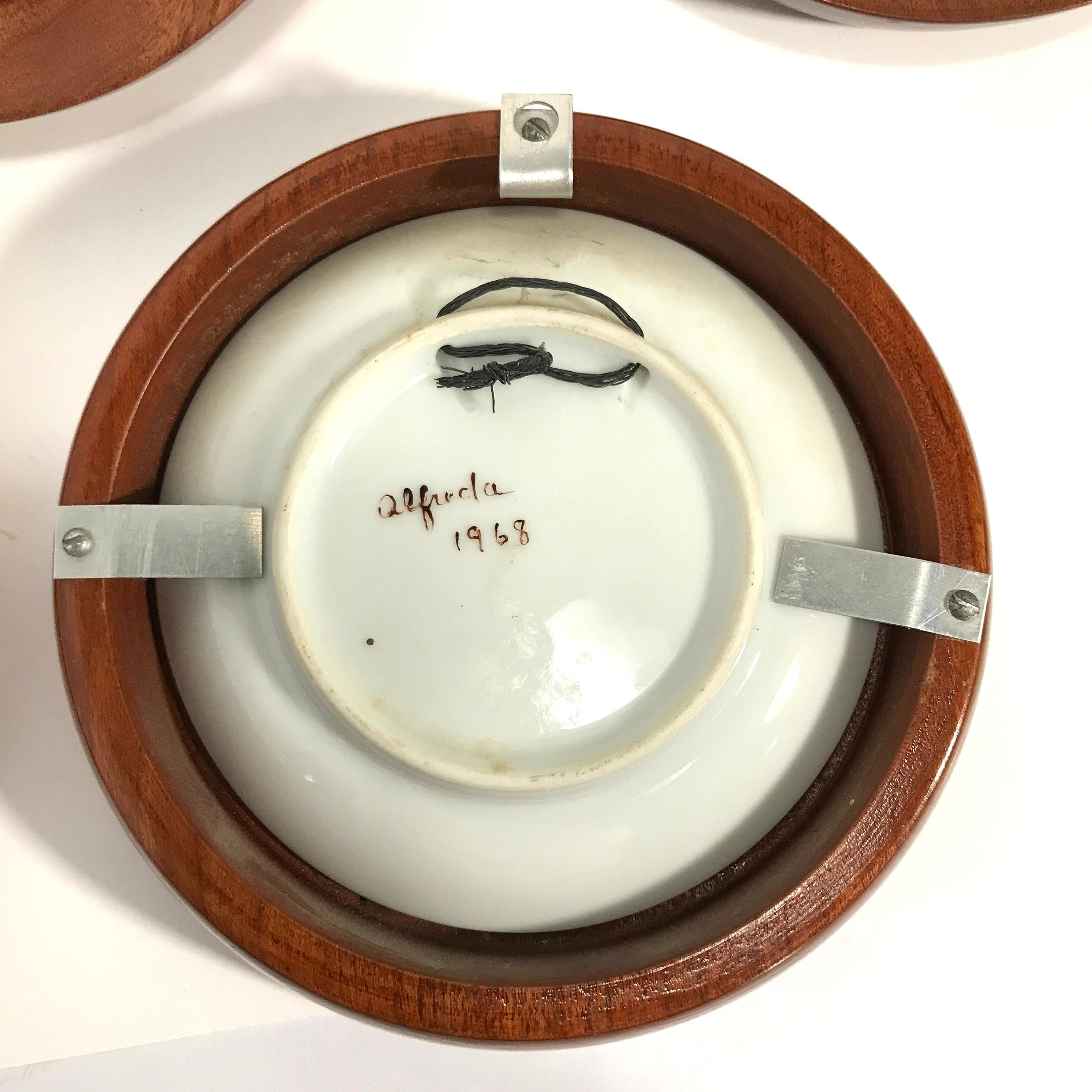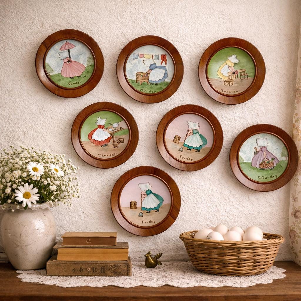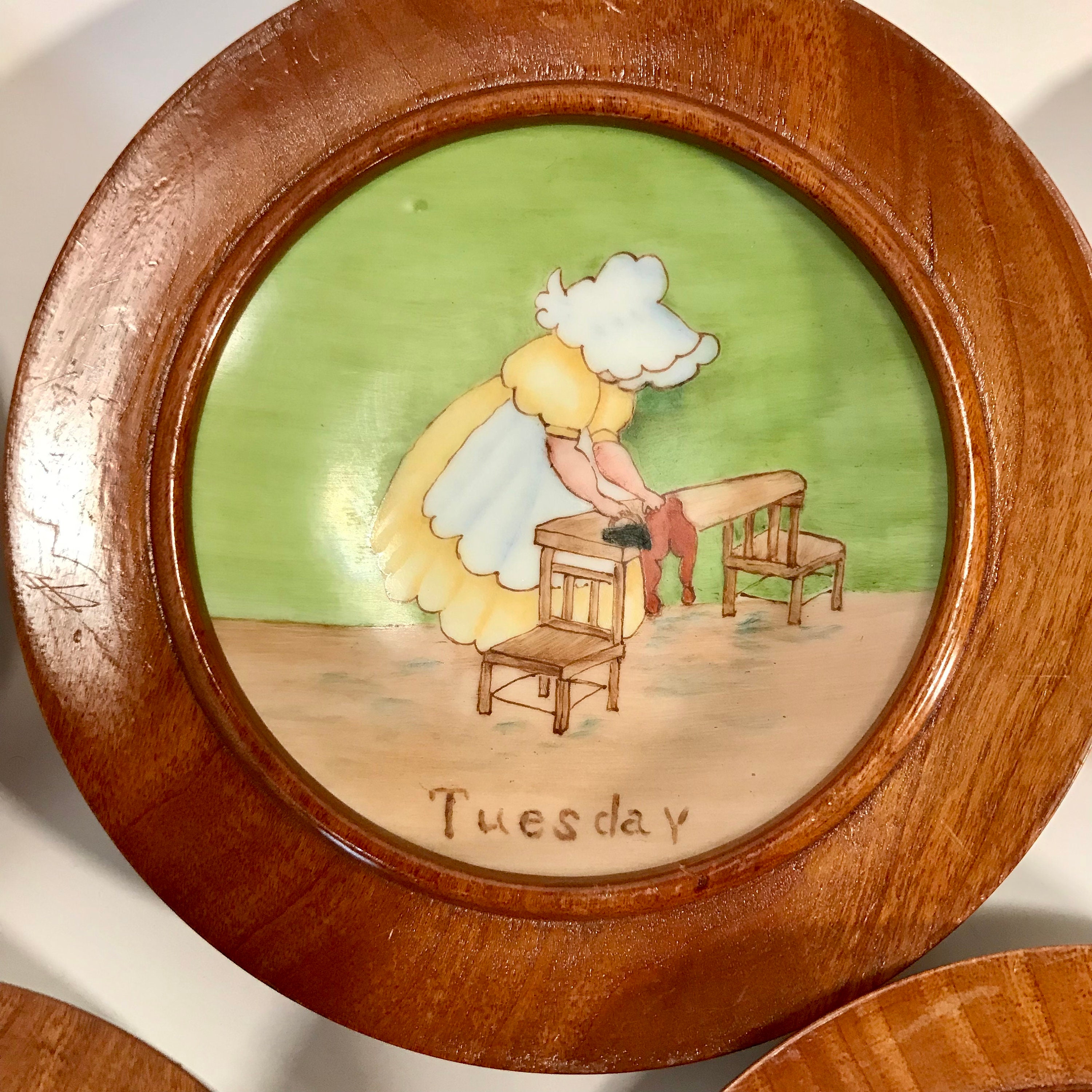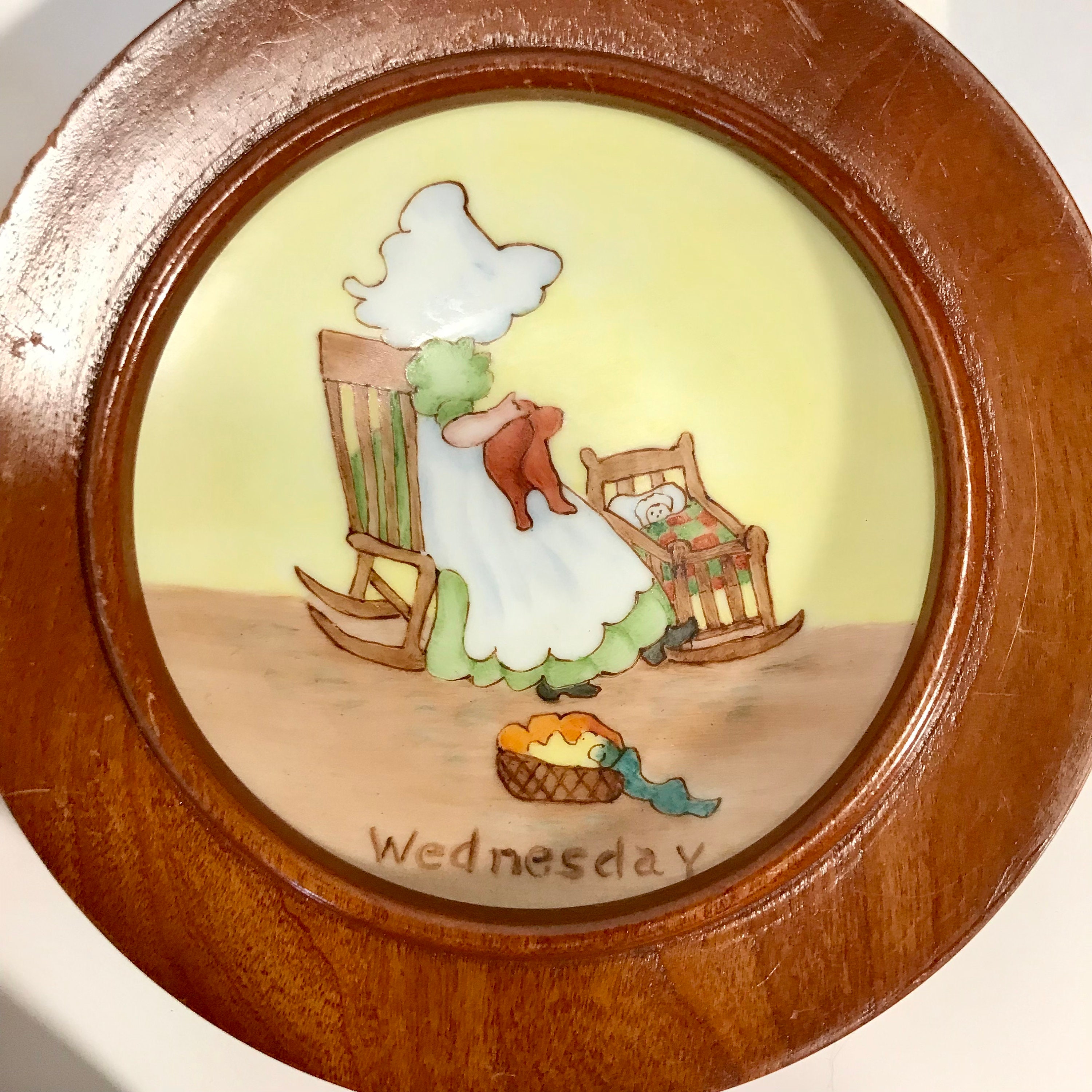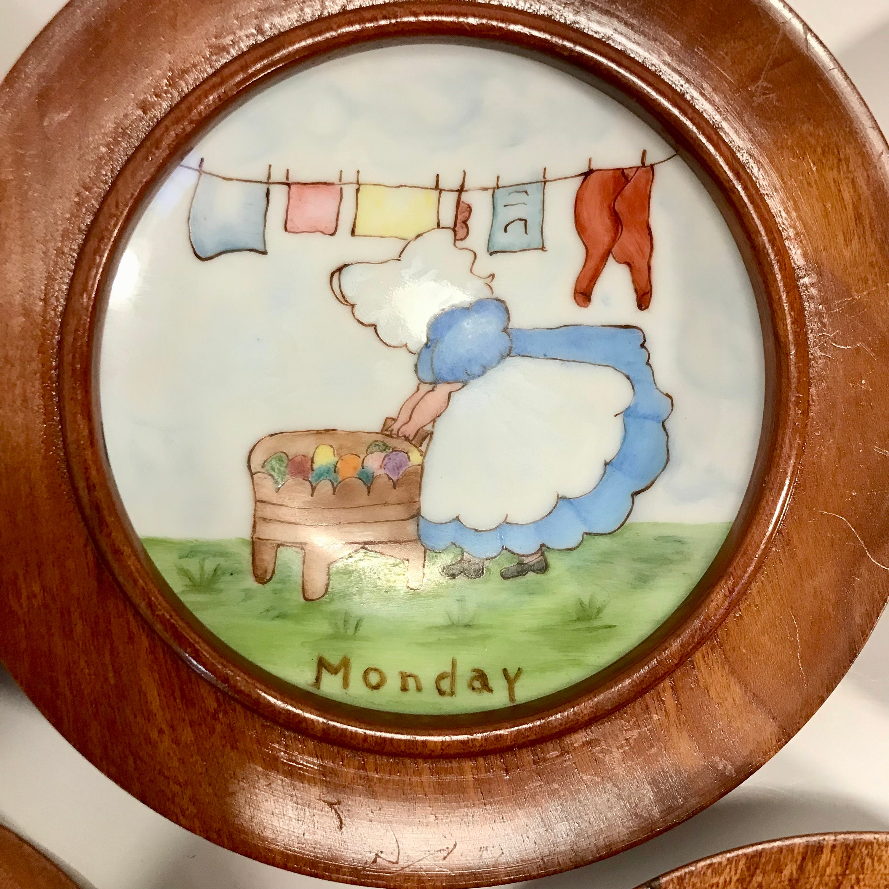 1968 Hand painted and signed Days of the Week Little Girls Collector Plates in Round Wooden Frames. All Seven days included. All in excellent condition. No cracks or chips. A small flea bite on one frame, but not chipped. Signed by Alfreda 1968. OOAK. The plates measure approximately 4 1/4 inches and the frames measure 5 inches in diameter.