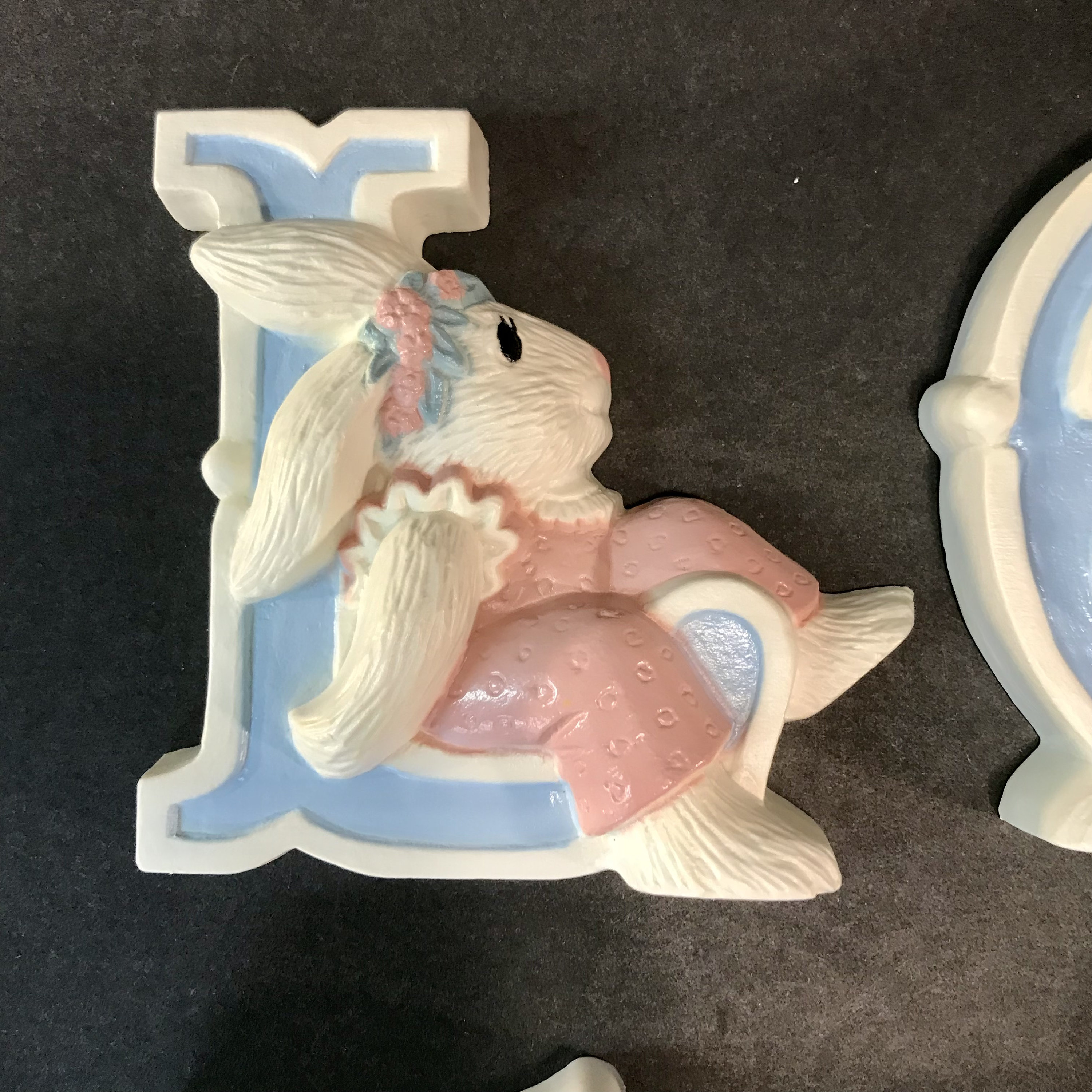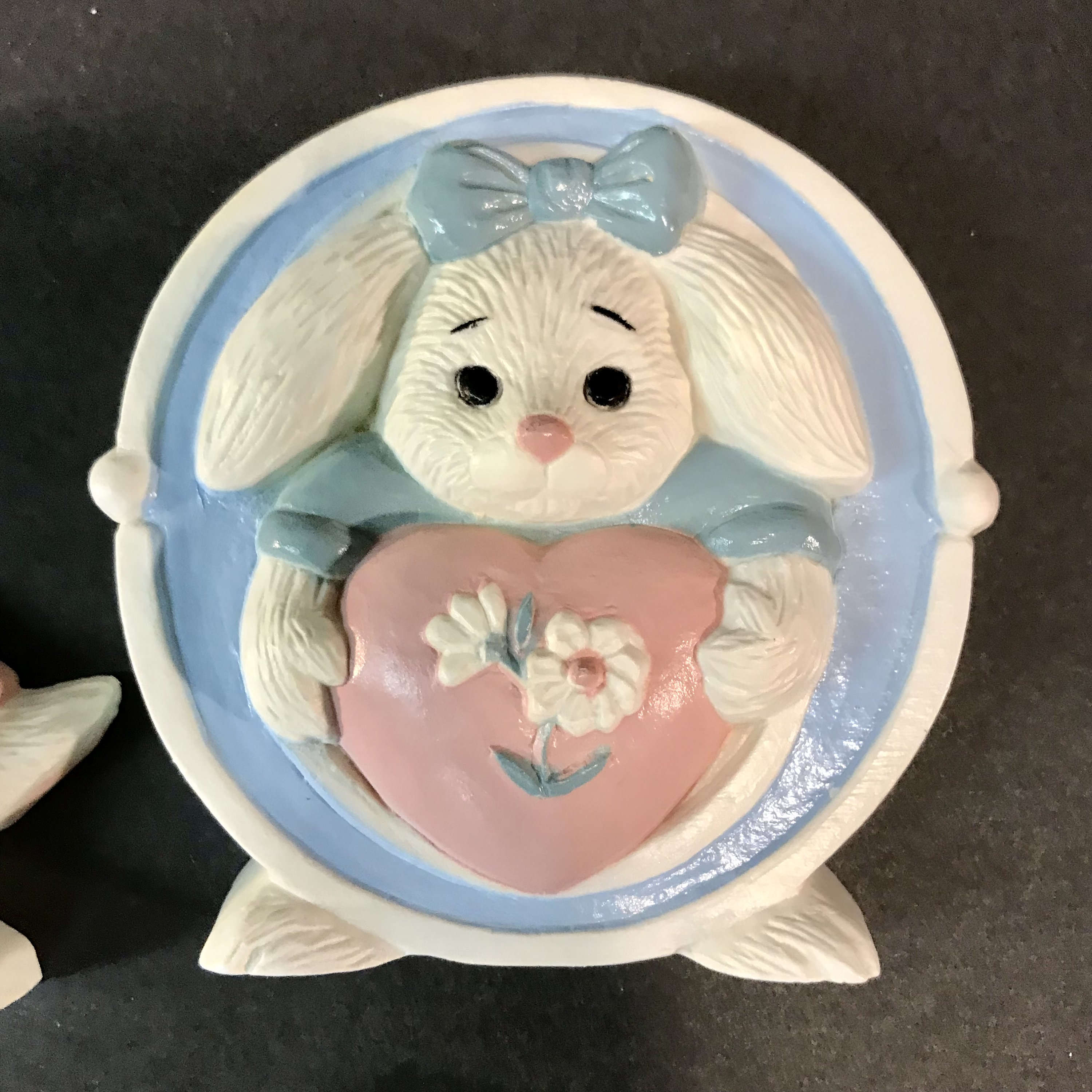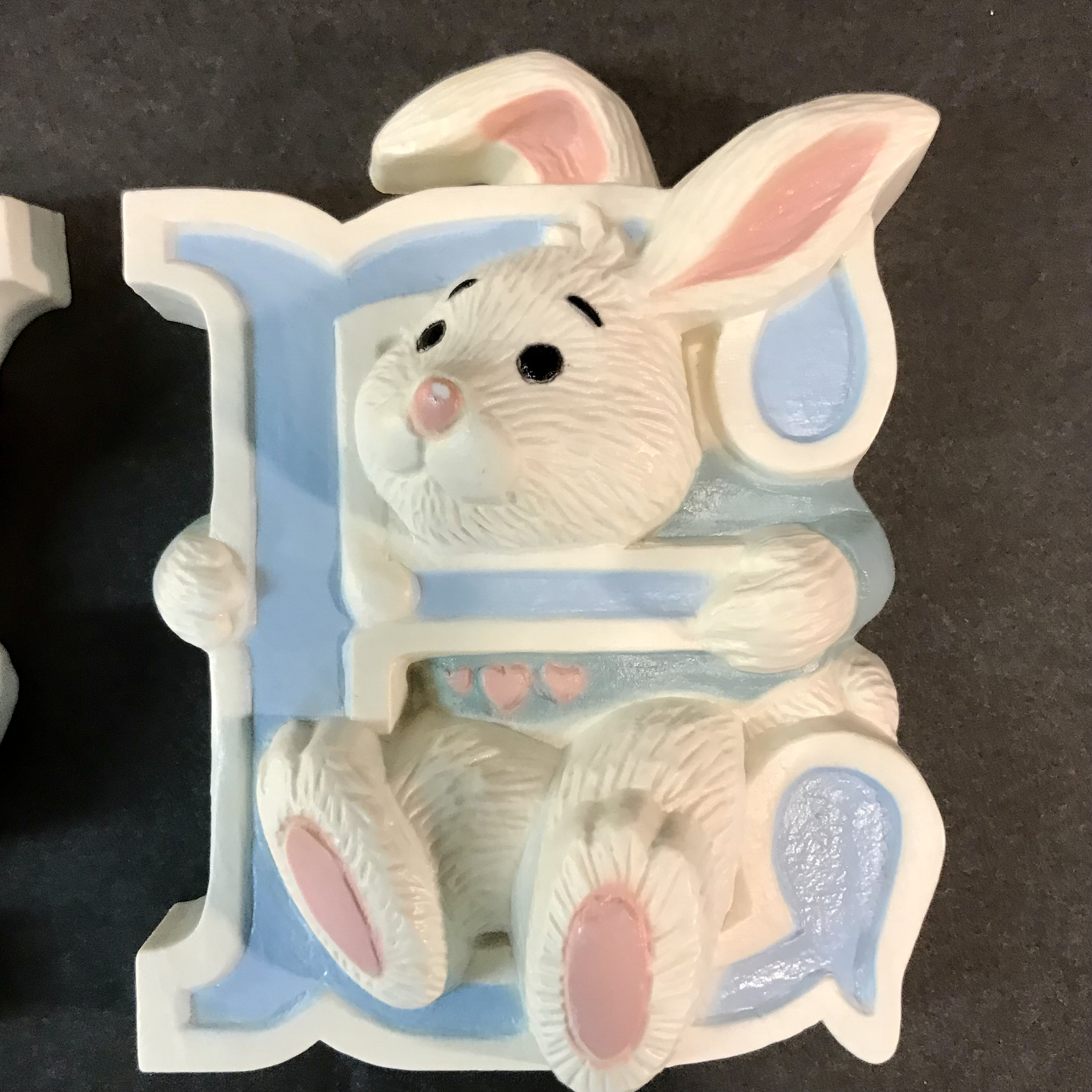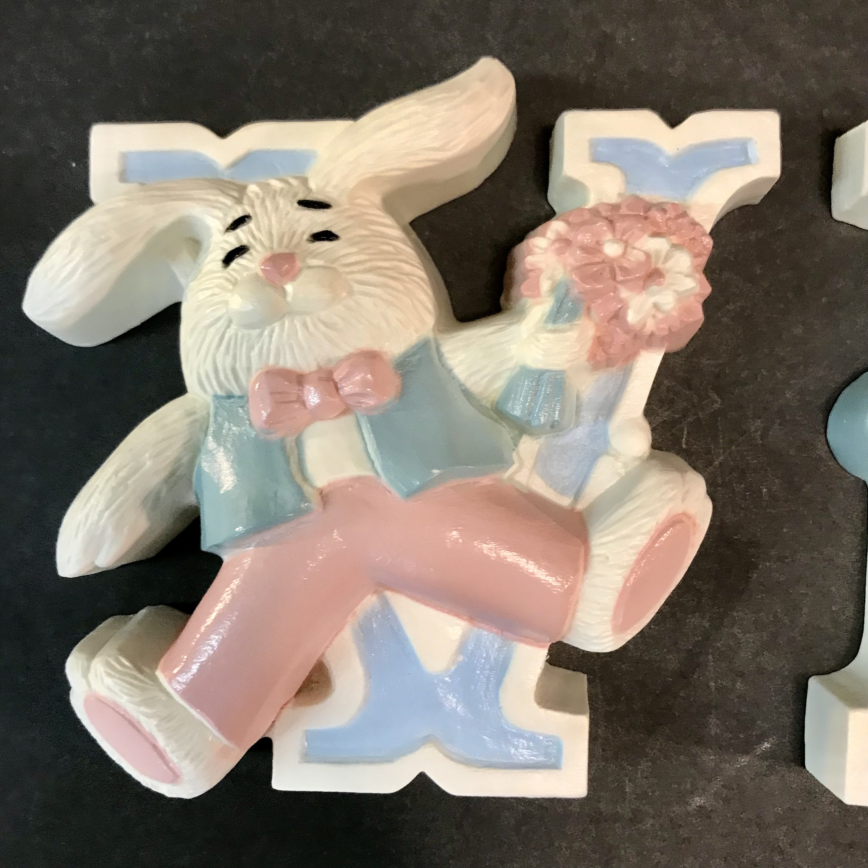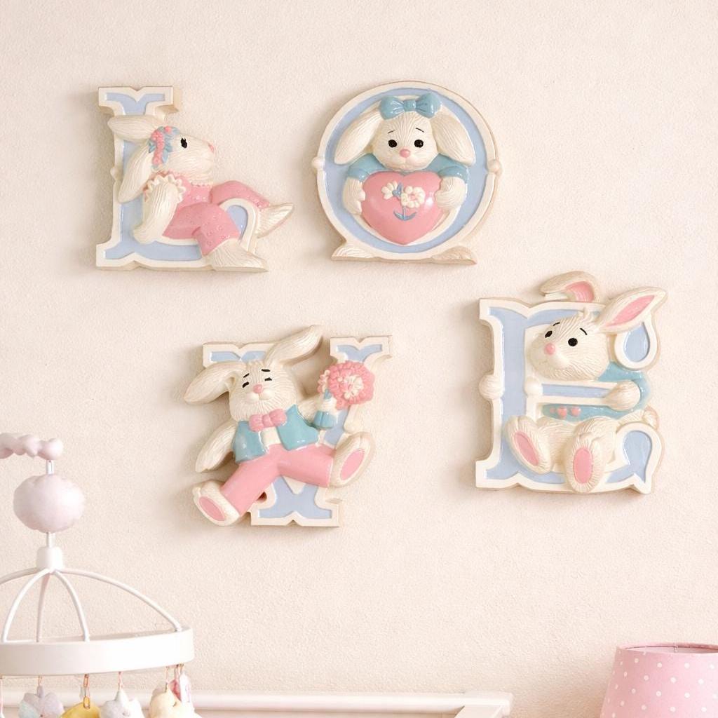 Bring a touch of nostalgia to your space with this Adorable 1992 Bunny Rabbits Wall Hanging! This charming decor features four delightful rabbits that spell out LOVE, perfect for a nursery theme. Crafted from durable hard plastic, it adds a whimsical touch to any room. Ideal for collectors or those looking to infuse their home with a sweet, vintage vibe. Celebrate love and joy with these enchanting bunnies, a wonderful addition to your wall decor!Each measures approximately 5" x 4 1/2" high. Hanging feature on backs. 3280-1B, 2B, 3B AND 4B. In Excellent condition. No cracks or chips or paint loss.