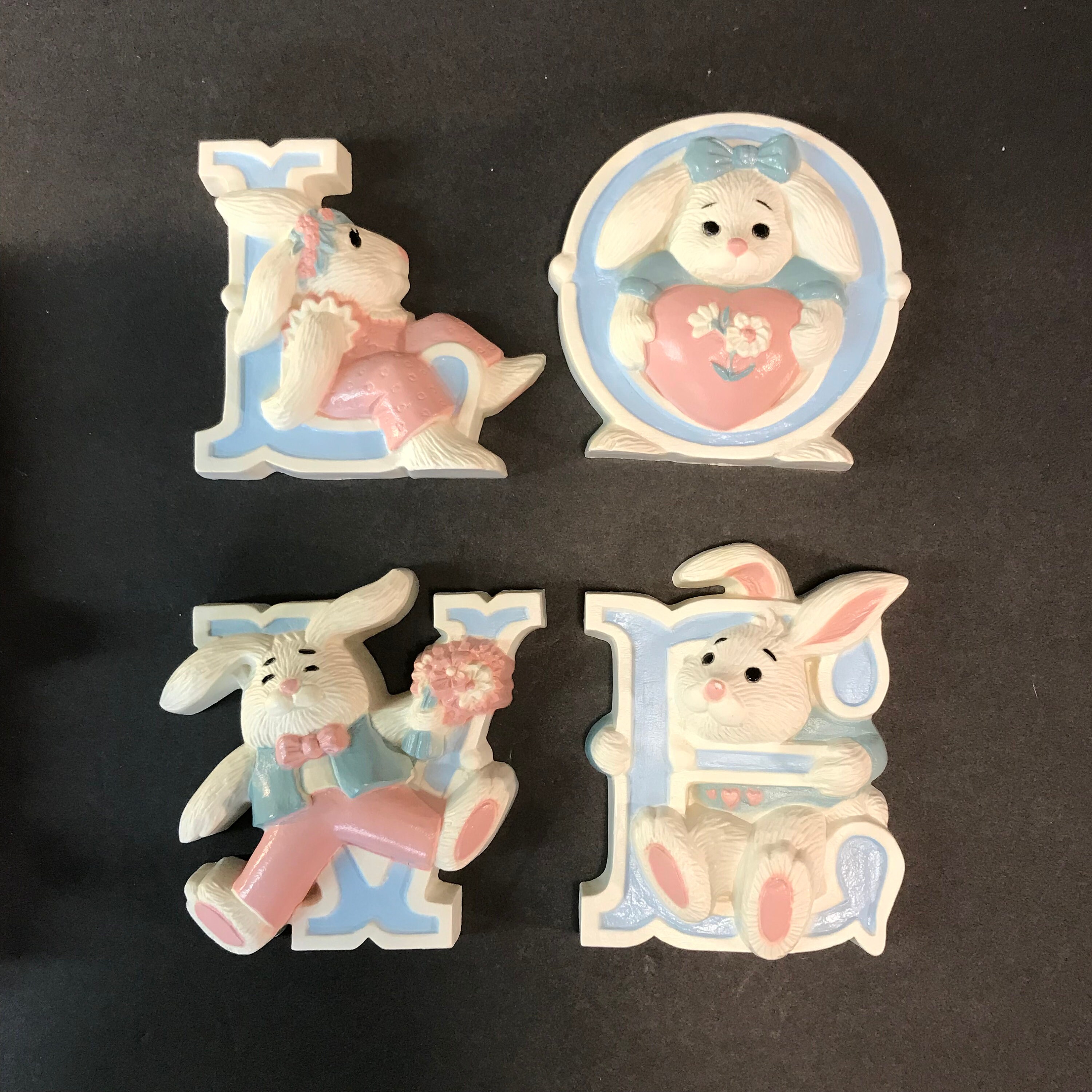 These kitschy rabbits spell LOVE! Made in the 1992 in the USA. By Burwood Products.