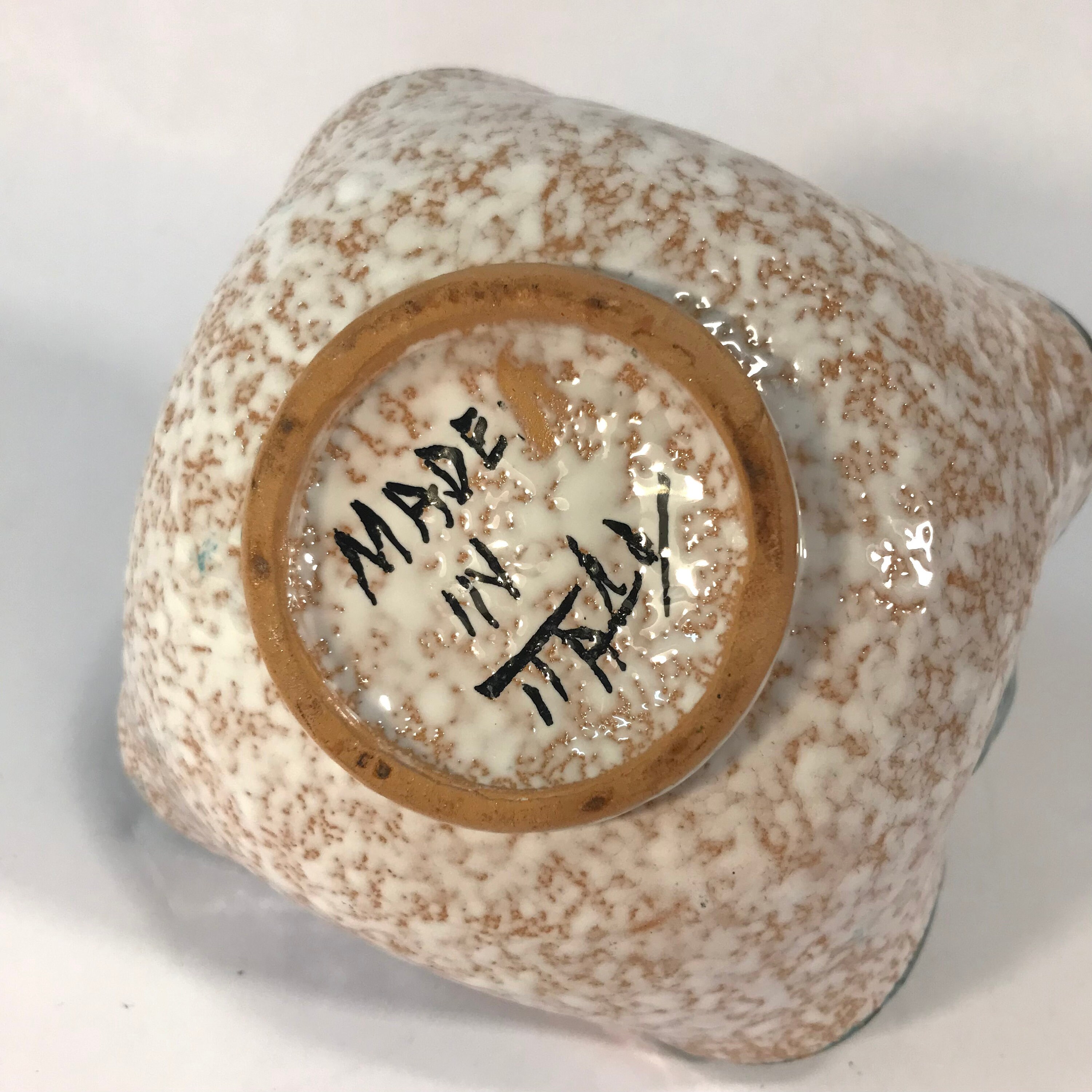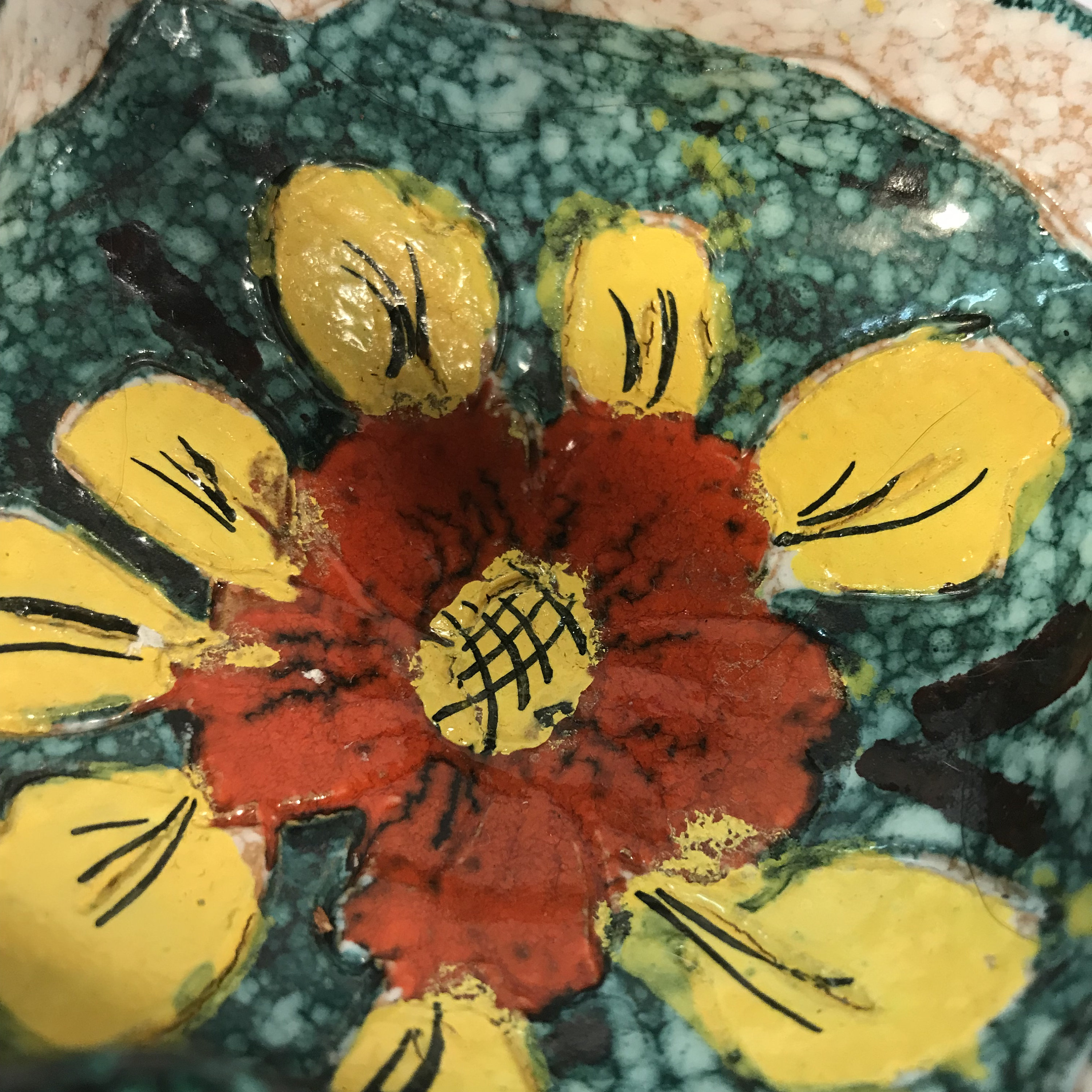 This one-of-a-kind, beautiful bowl was purchased at an auction and is in excellent condition, with no chips or cracks. Hand-carved floral design in the center of bowl with twisted handle. Italy. Measures 4 1/2" high by 5" wide.