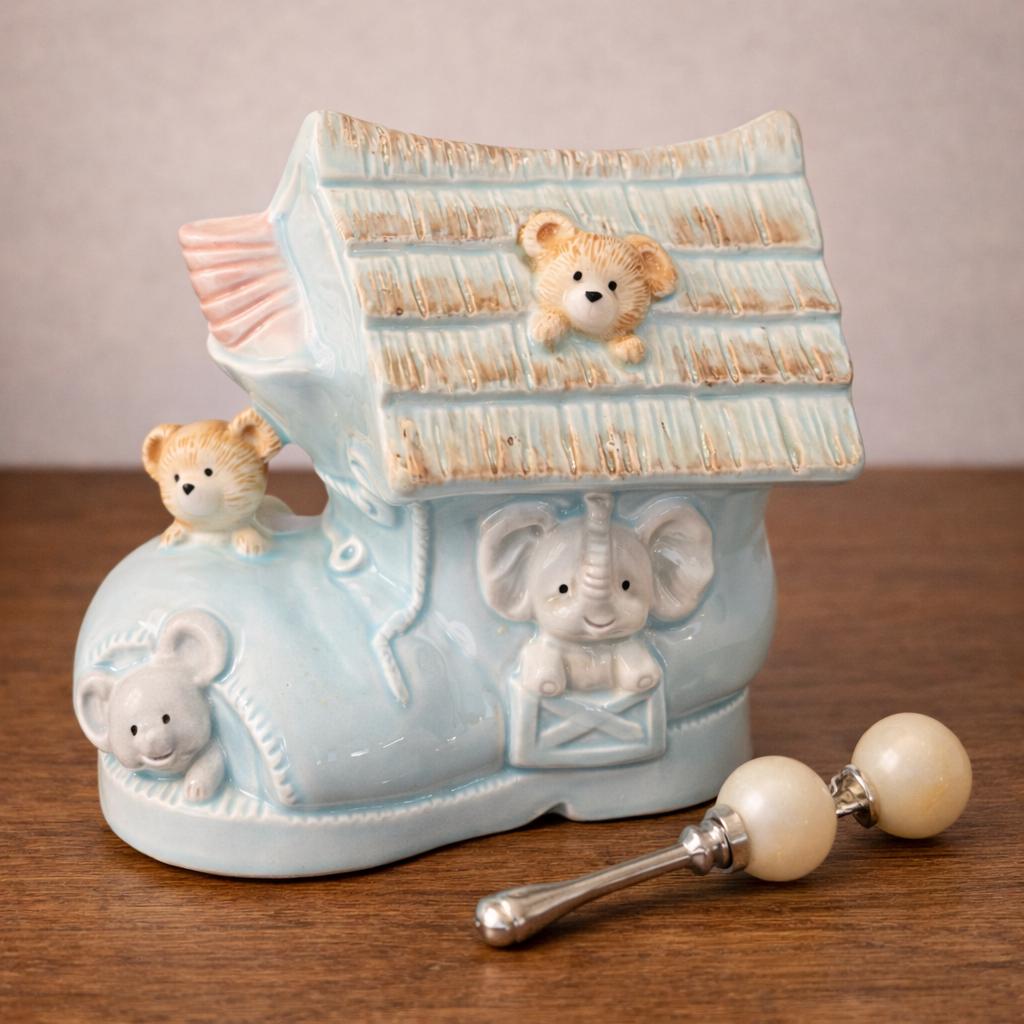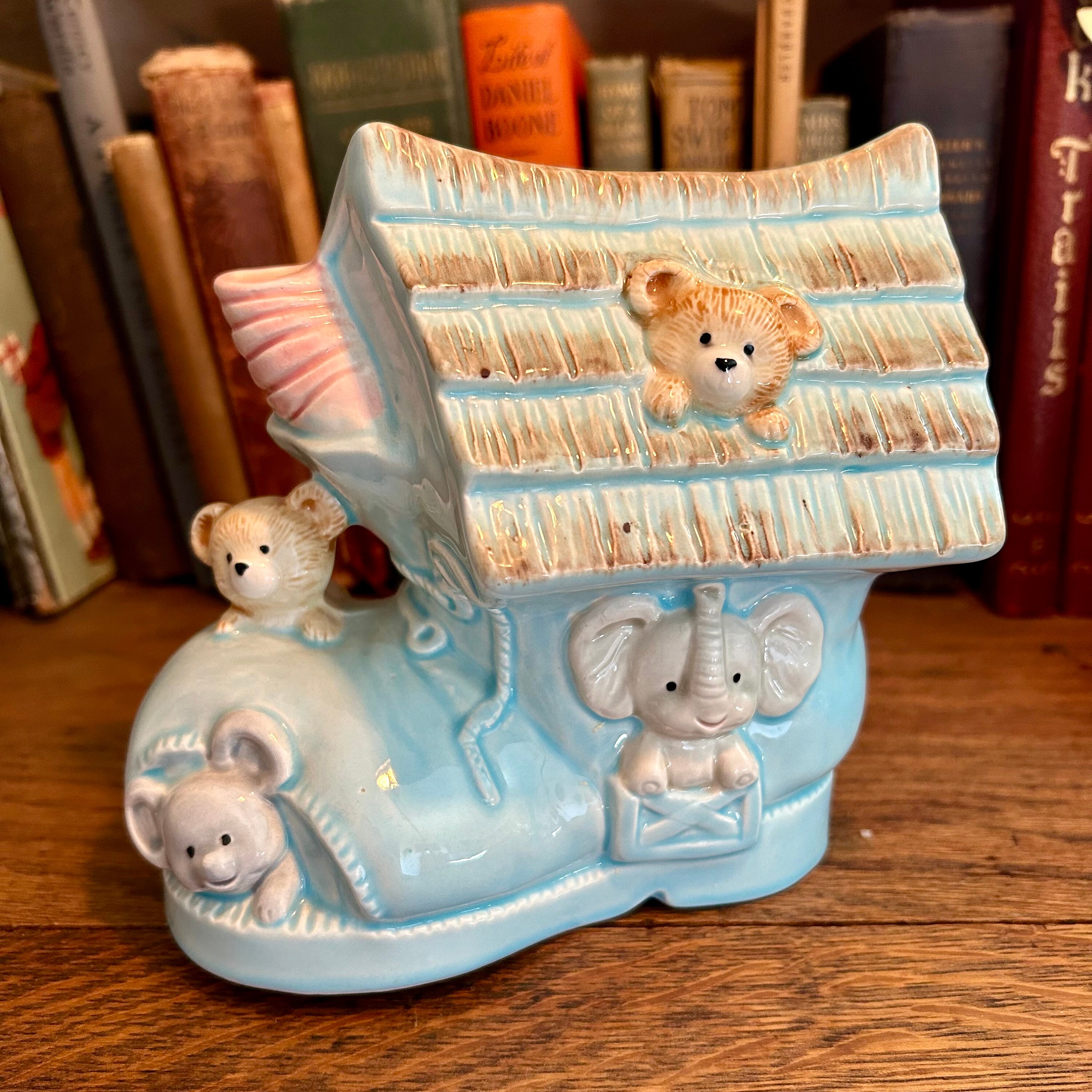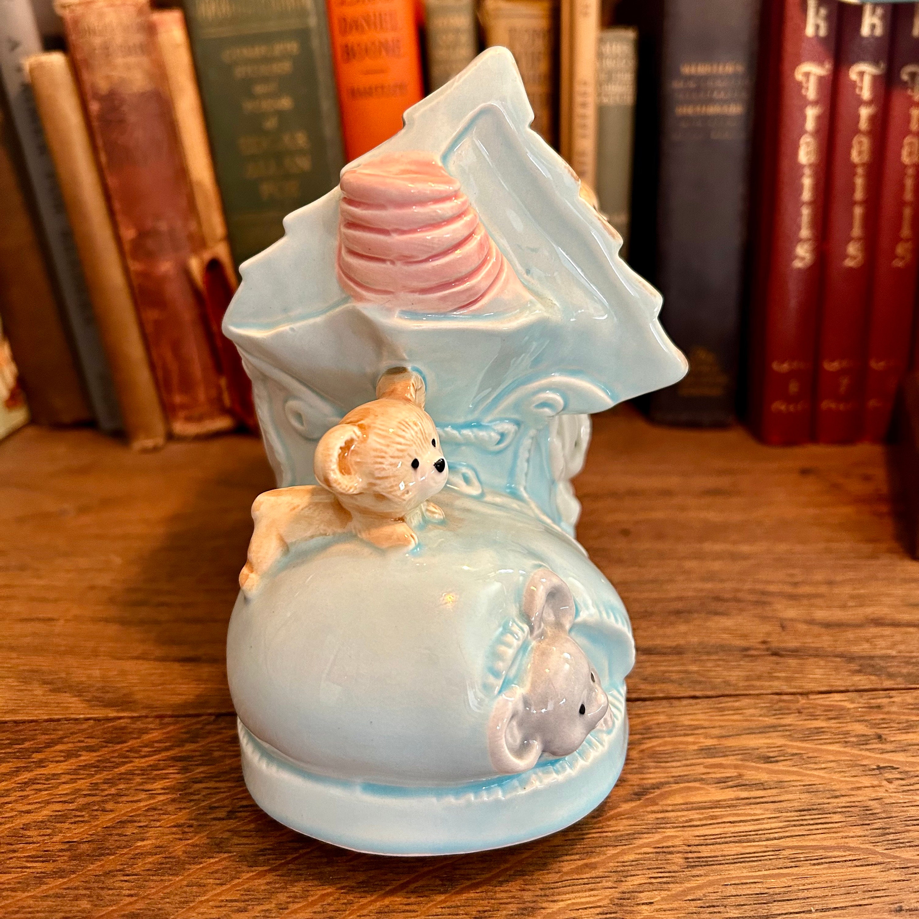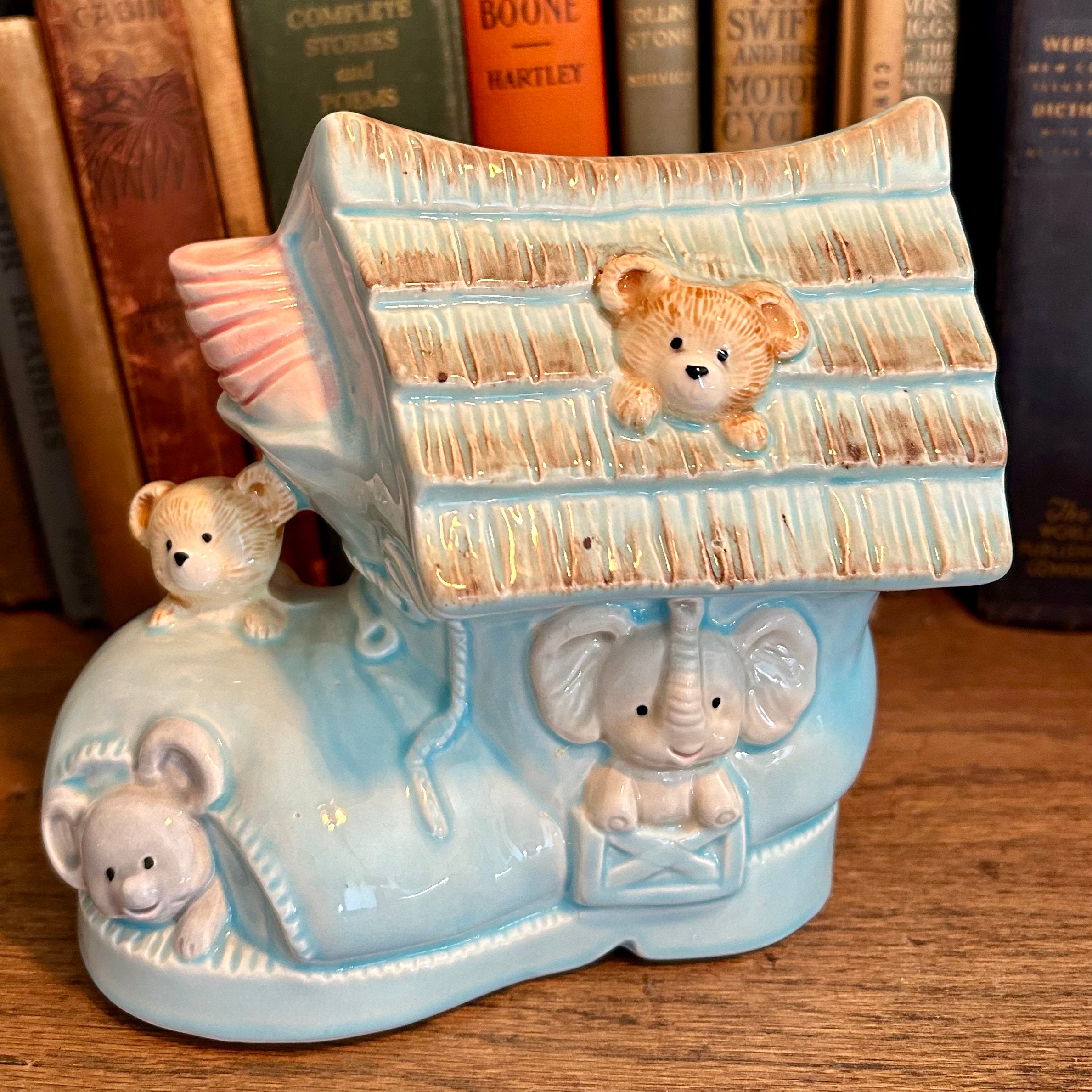 This vintage musical planter from Inarco is a charming addition to any collection. With a design featuring a boot house, an elephant, a teddy bear, and a mouse, it's a delightful decor choice for any home. Made in 1985, it's sure to bring a touch of nostalgia to your space.
