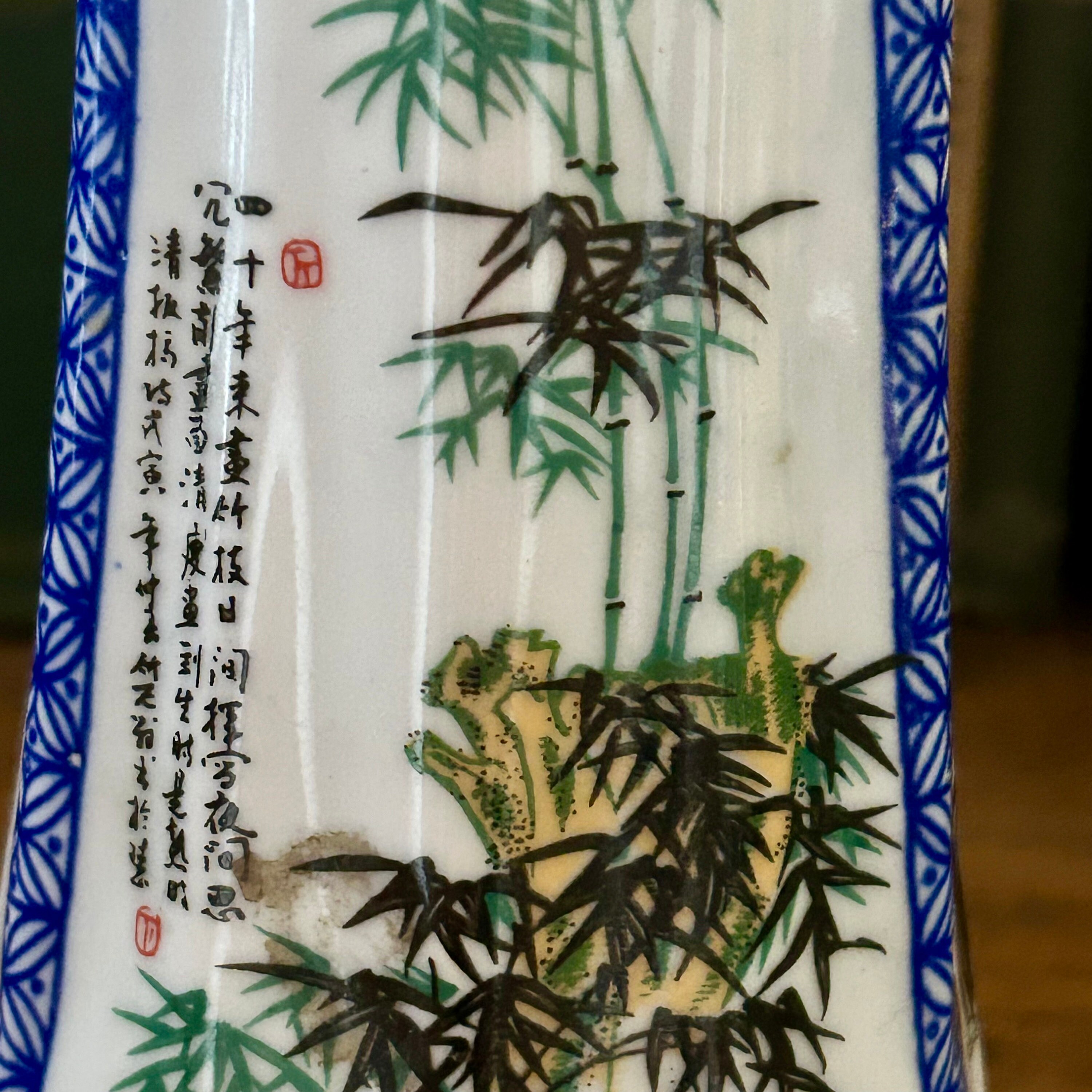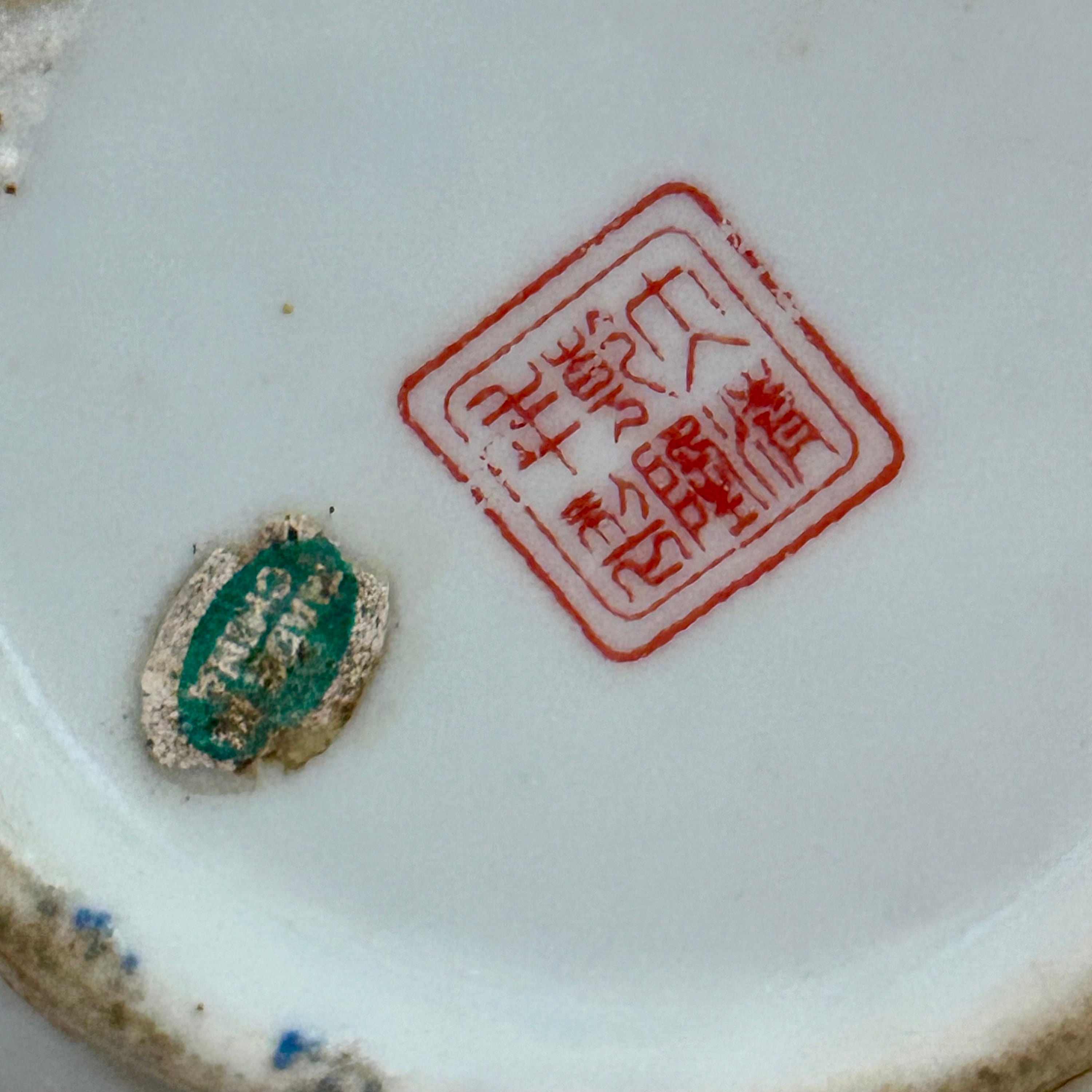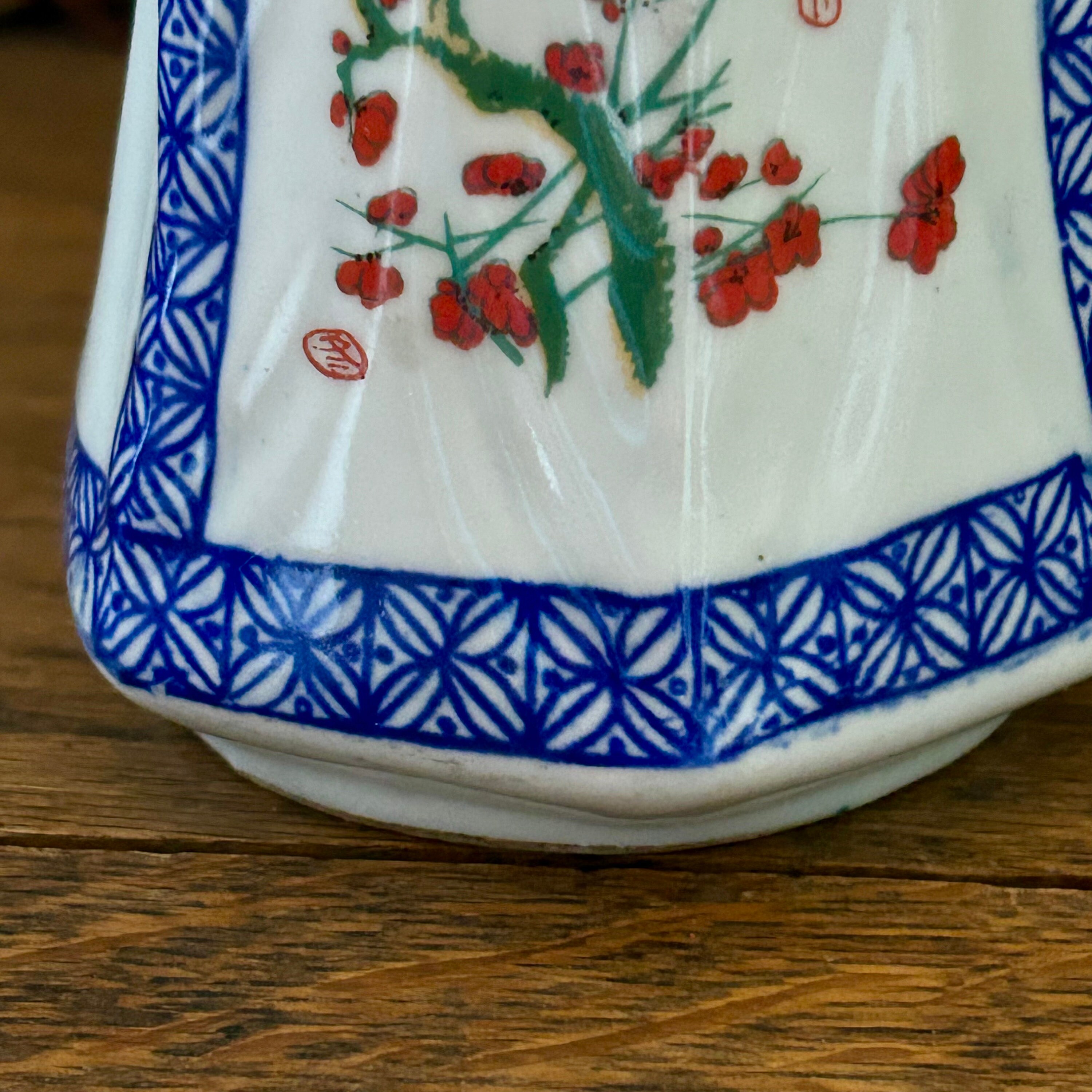 This is a beautiful piece and is in excellent condition with no chips or cracks or crazing. It features floral designs, japanese writing, and bamboo designs around the exterior. Stamped with Japanese symbol on bottom and original sticker which I cannot make out.