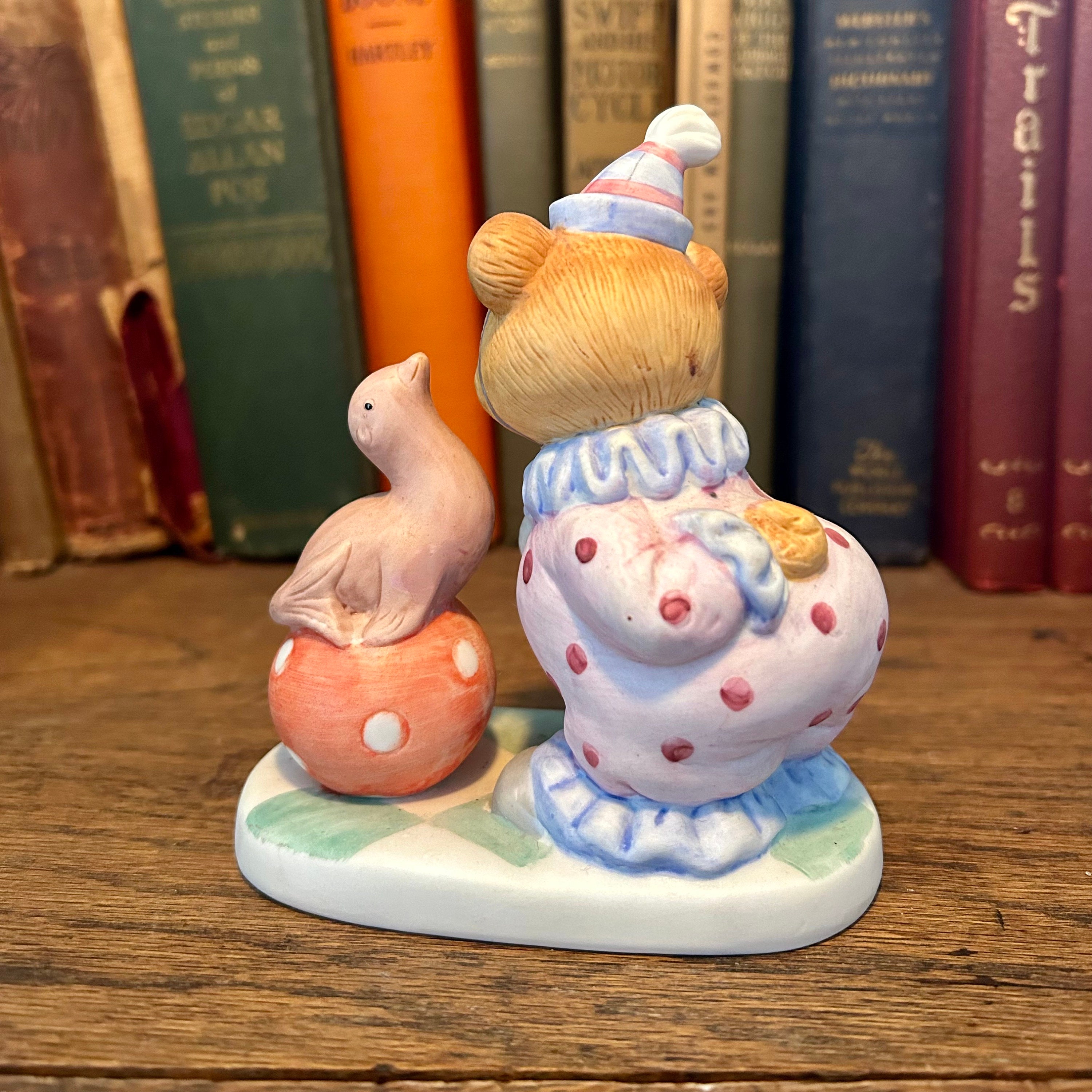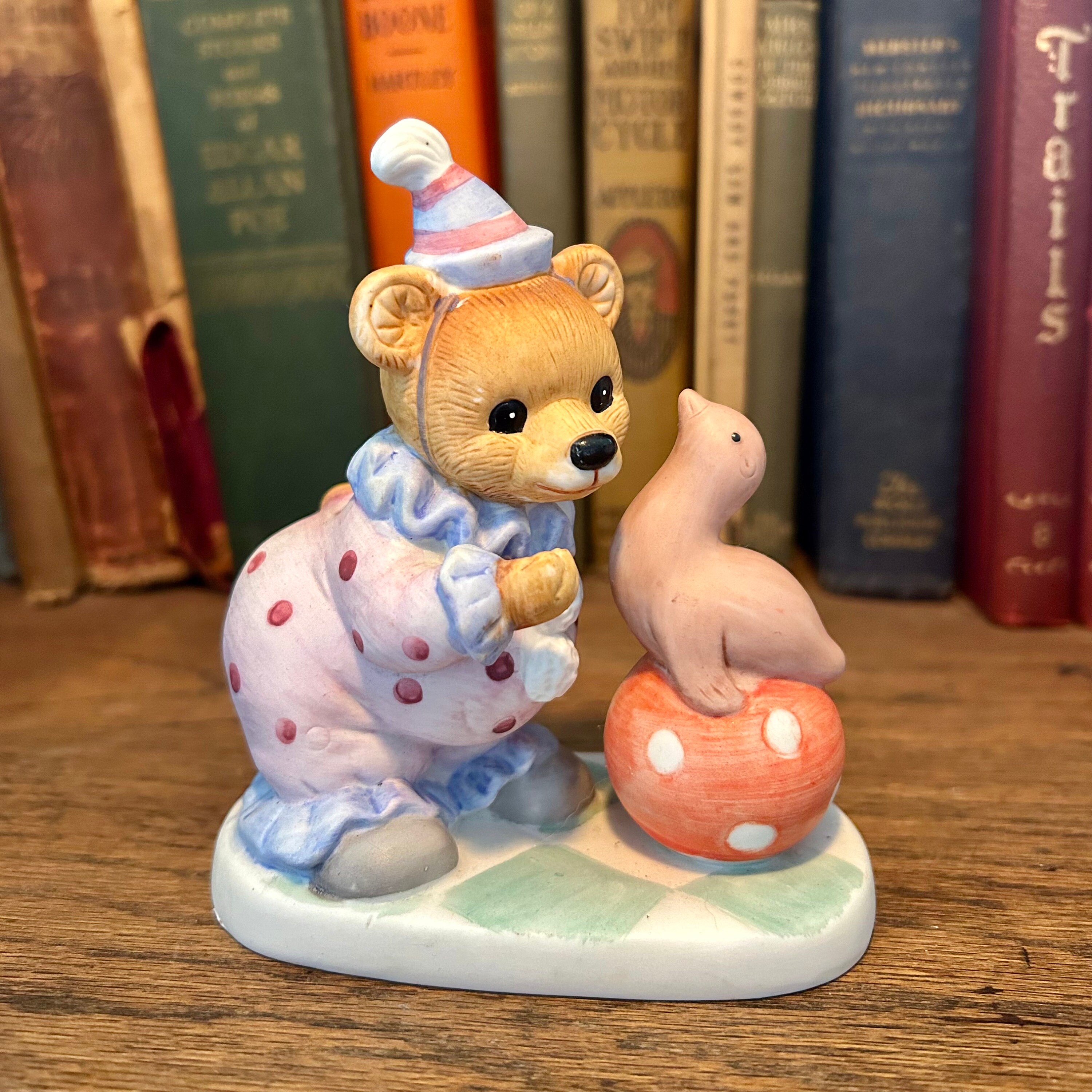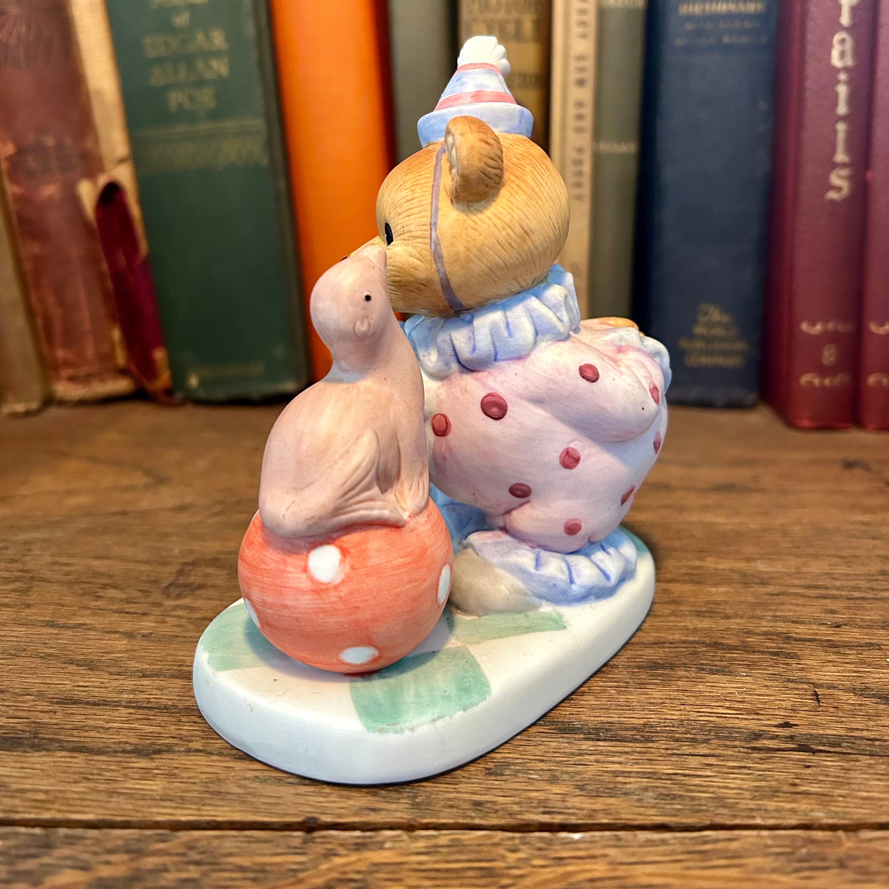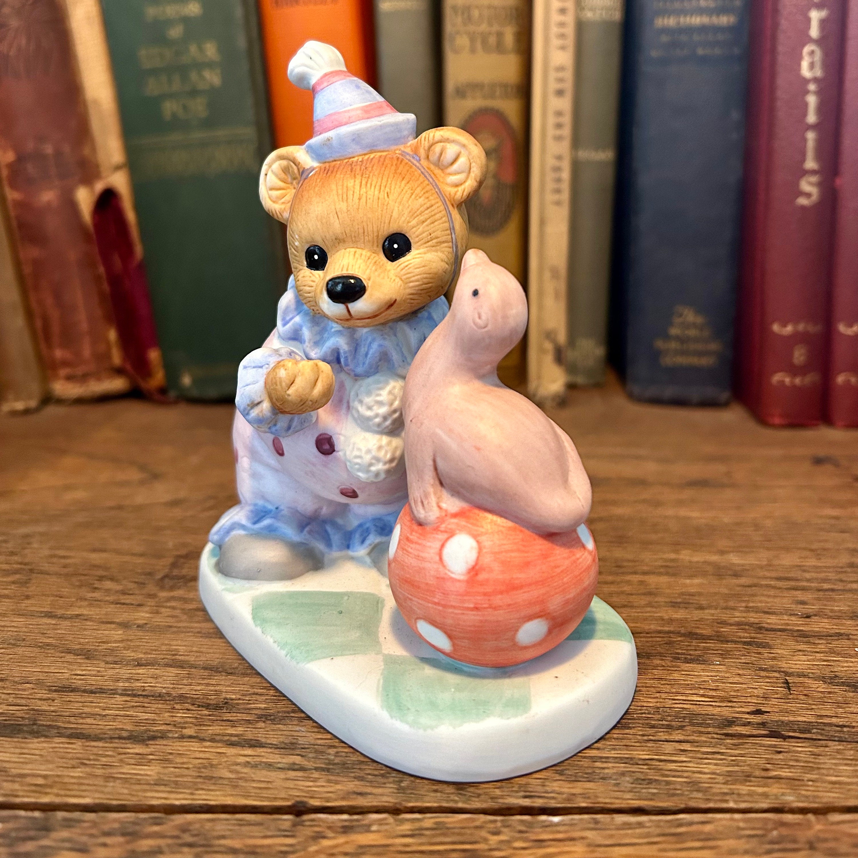 This vintage Homco figurine is so cute with the clown bear playing with a seal on a polka dotted ball. In excellent vintage condition with no cracks or chips. Original Homco sticker still on bottom.Measures 5" tall x 4" wide.