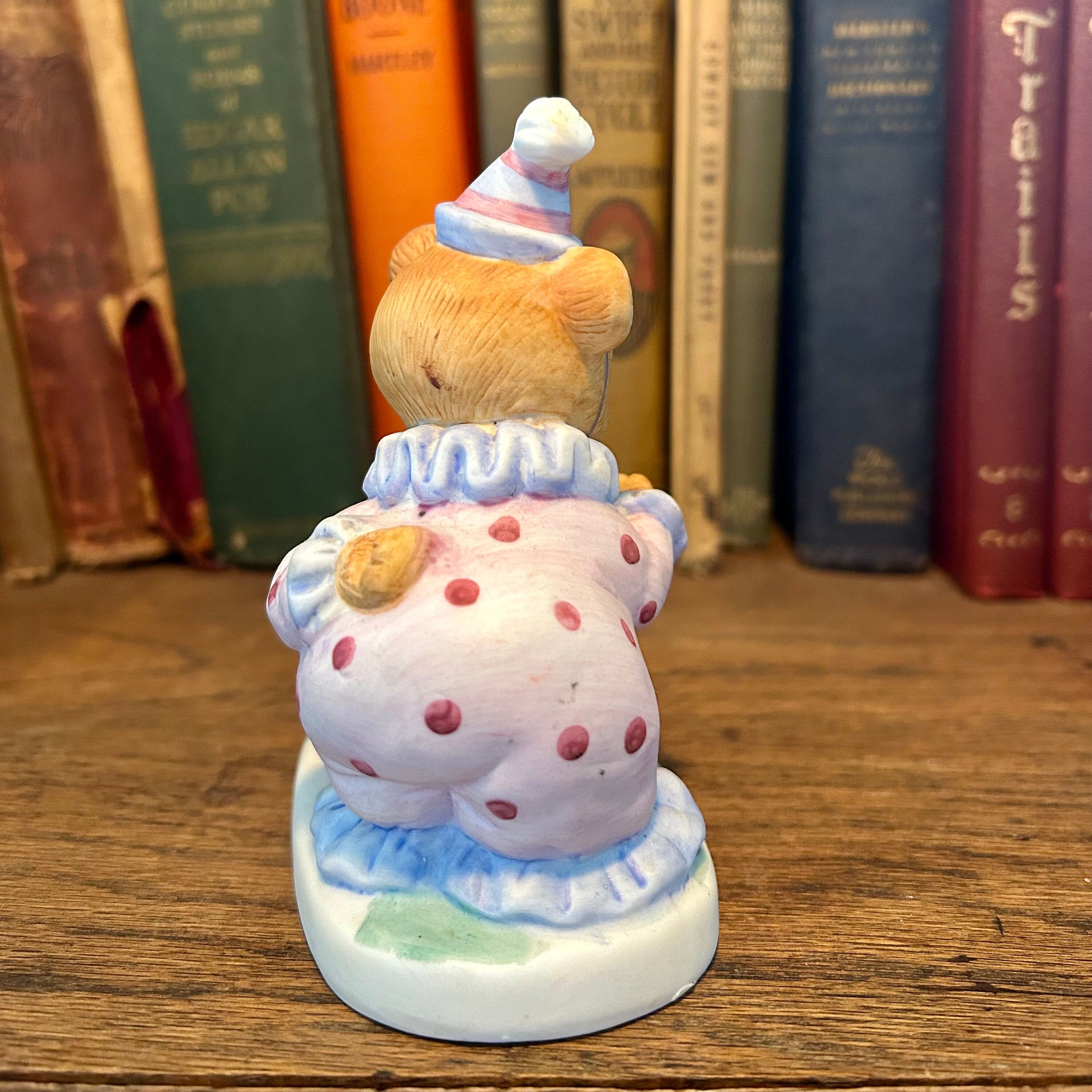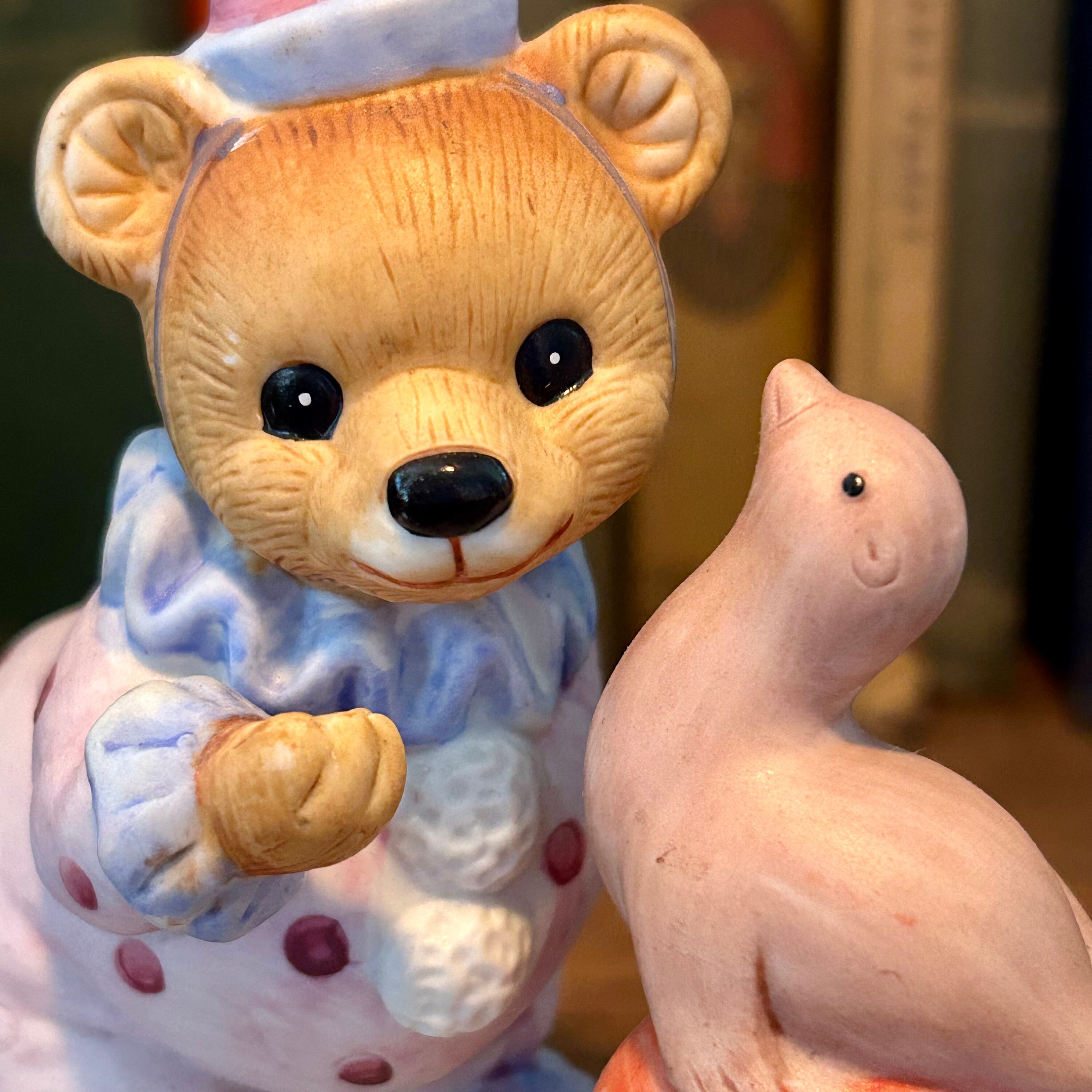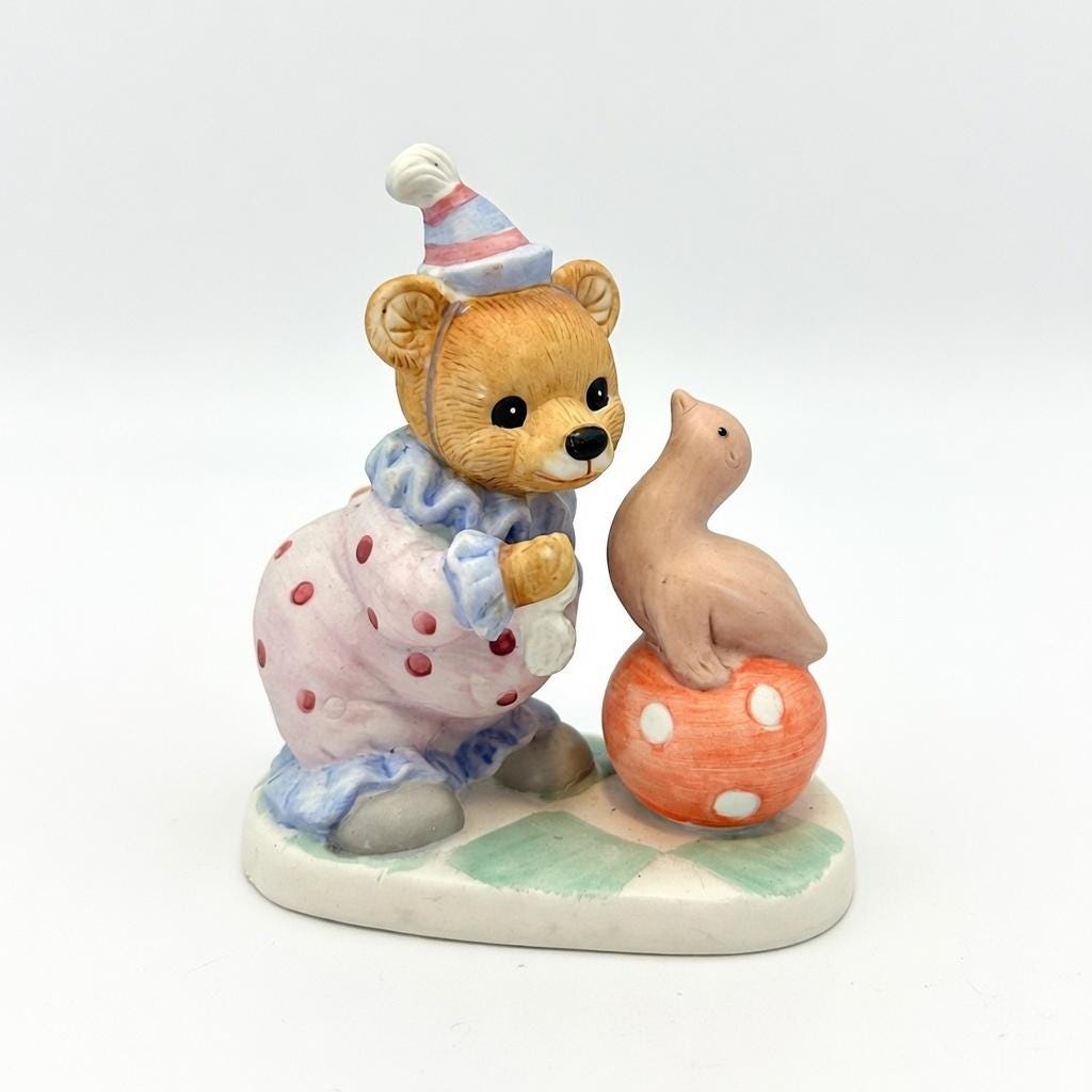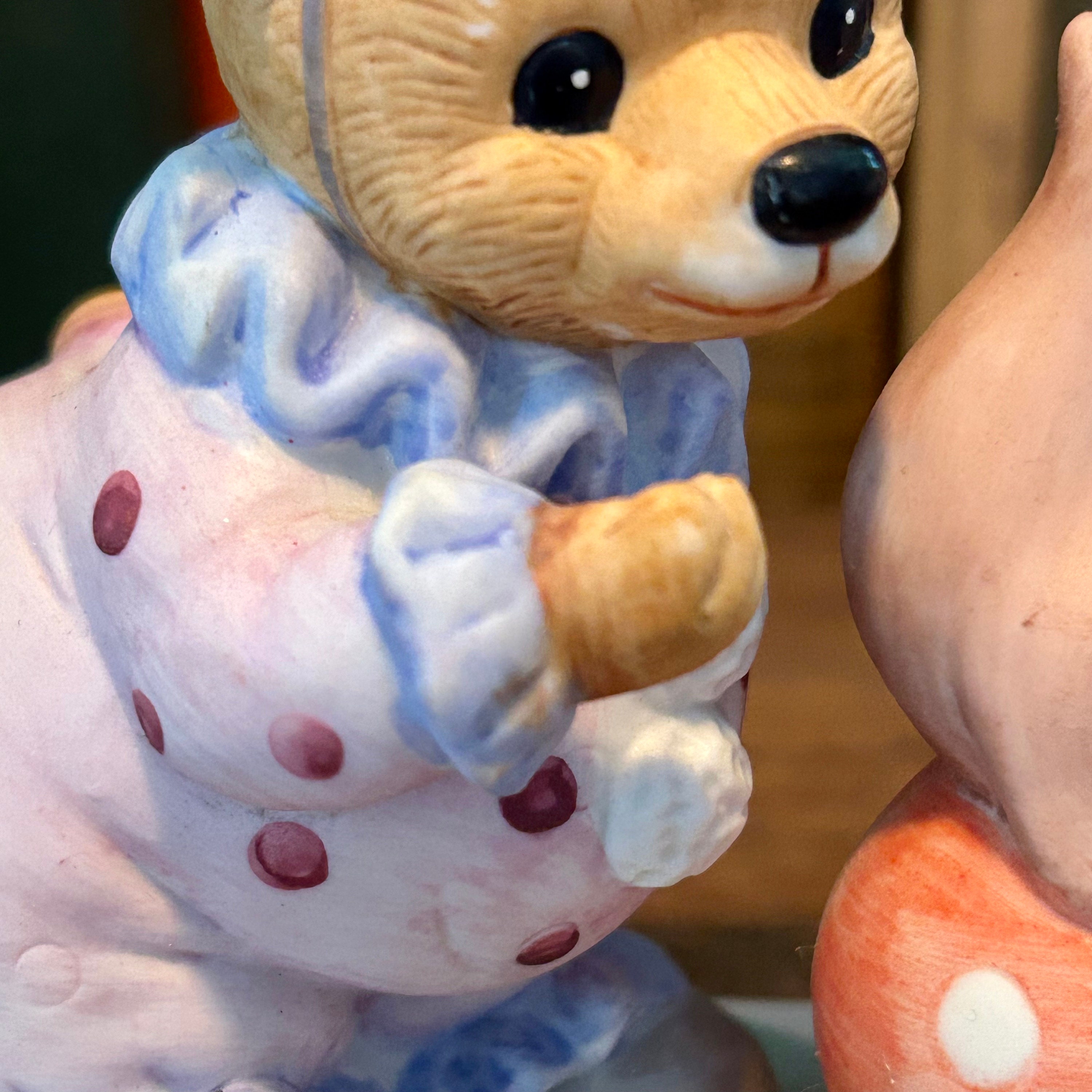 This vintage Homco figurine is so cute with the clown bear playing with a seal on a polka dotted ball. In excellent vintage condition with no cracks or chips. Original Homco sticker still on bottom.Measures 5" tall x 4" wide.