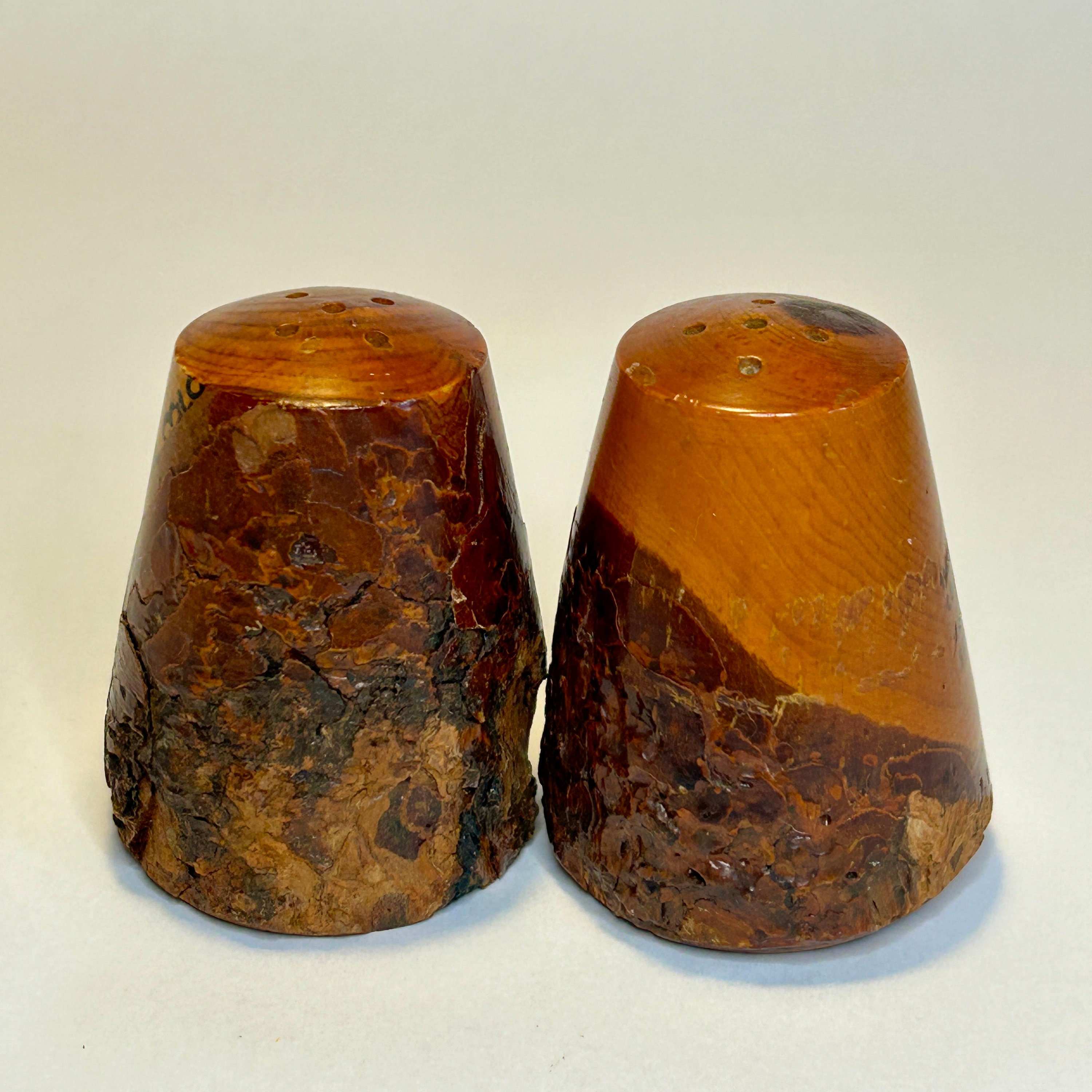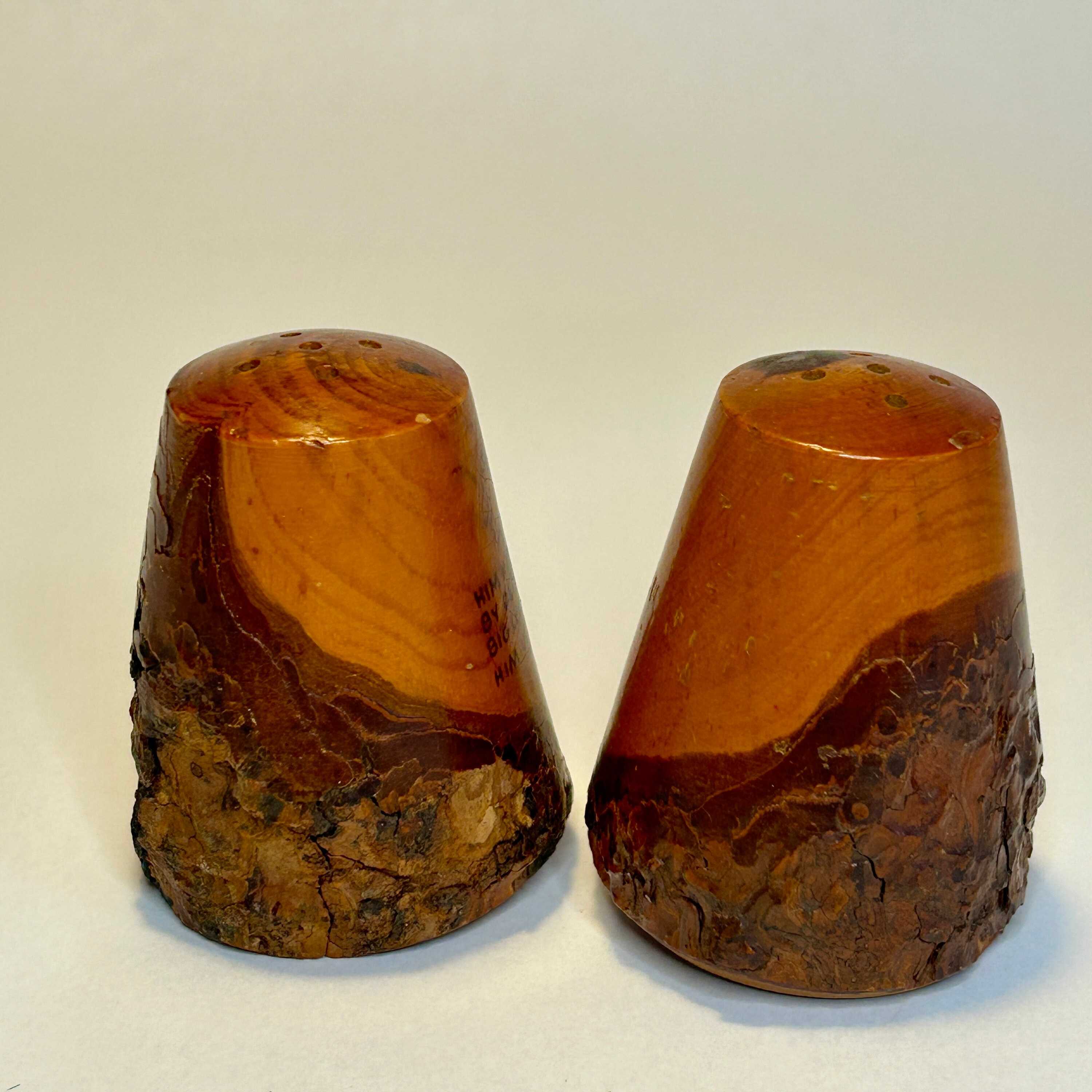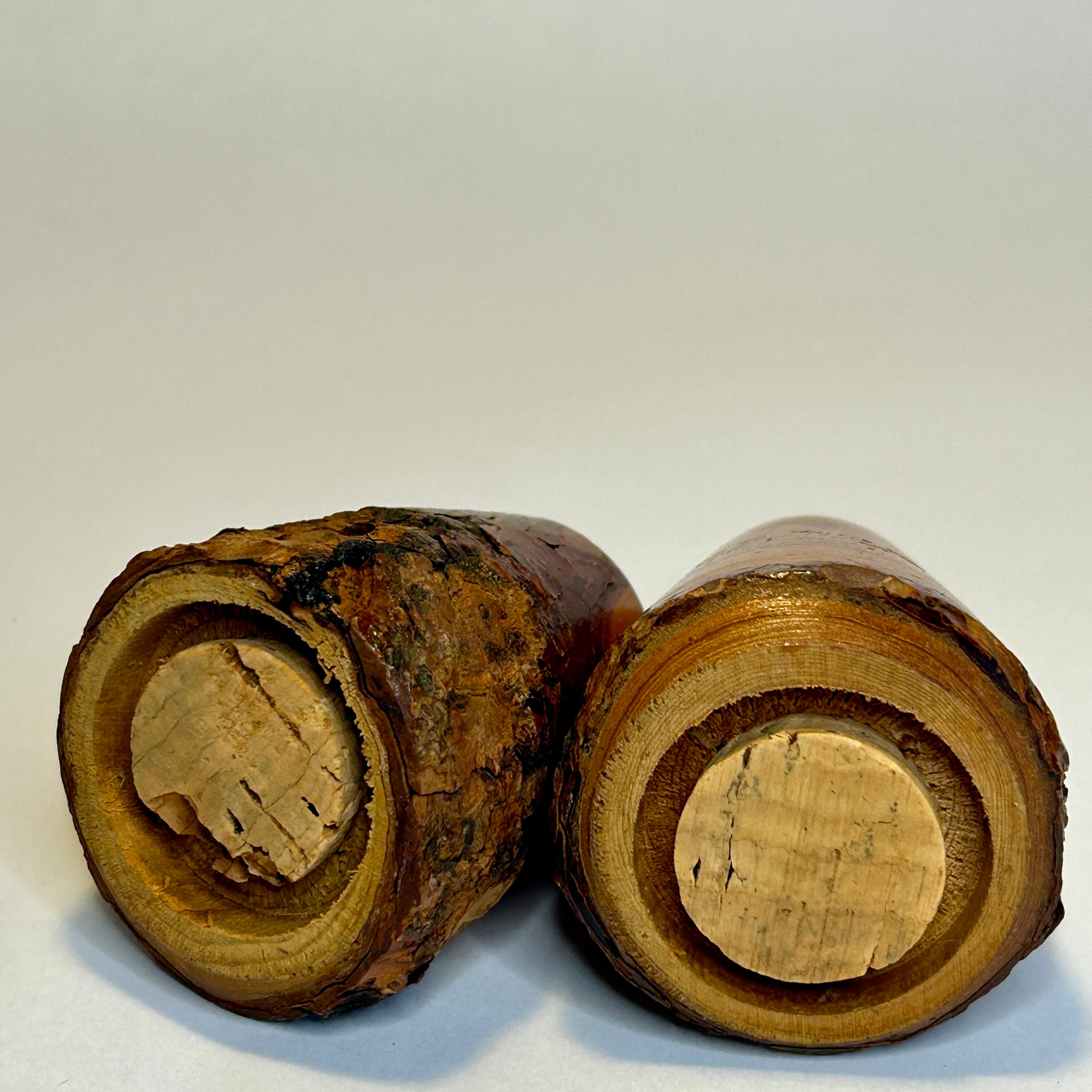 In beautiful myrtlewood and in excellent condition with both cork stoppers intact. Approximately 2 1/2" inch.