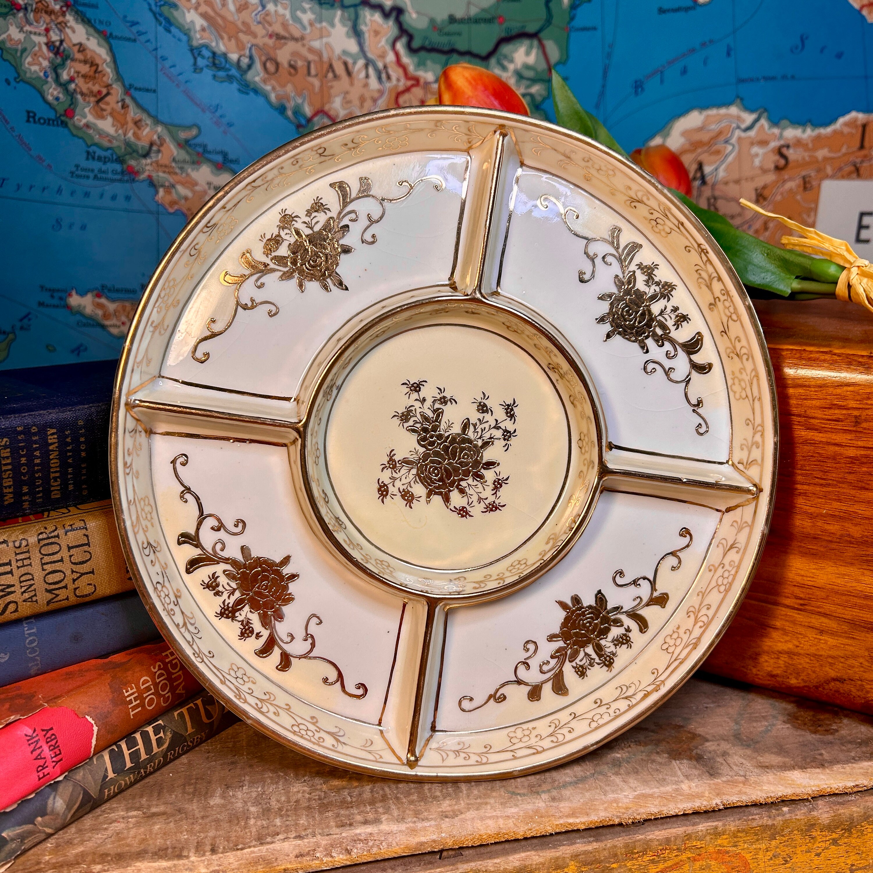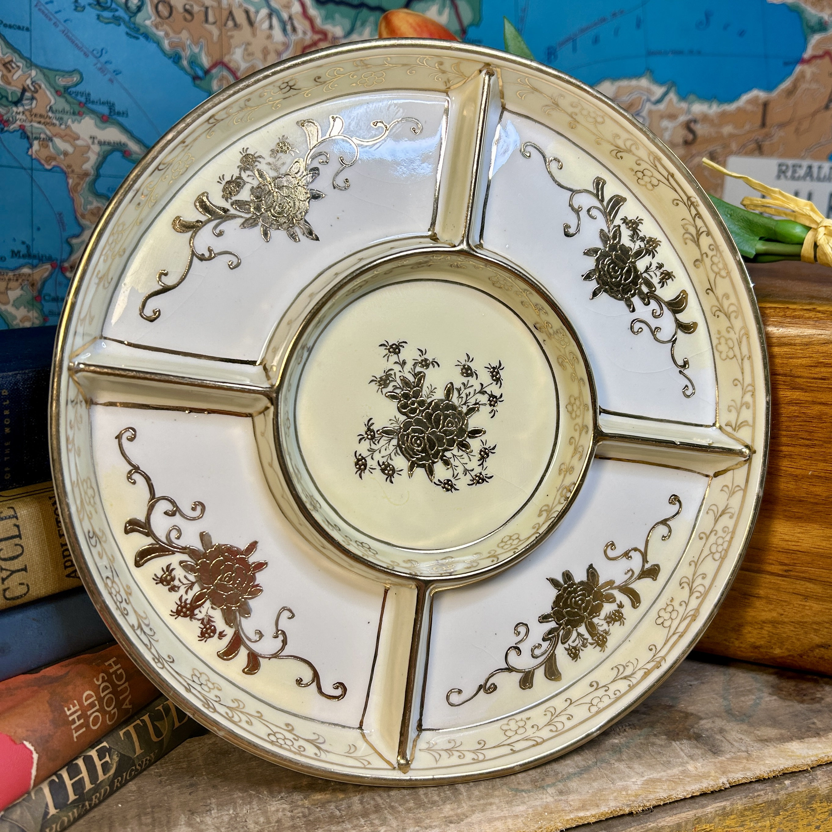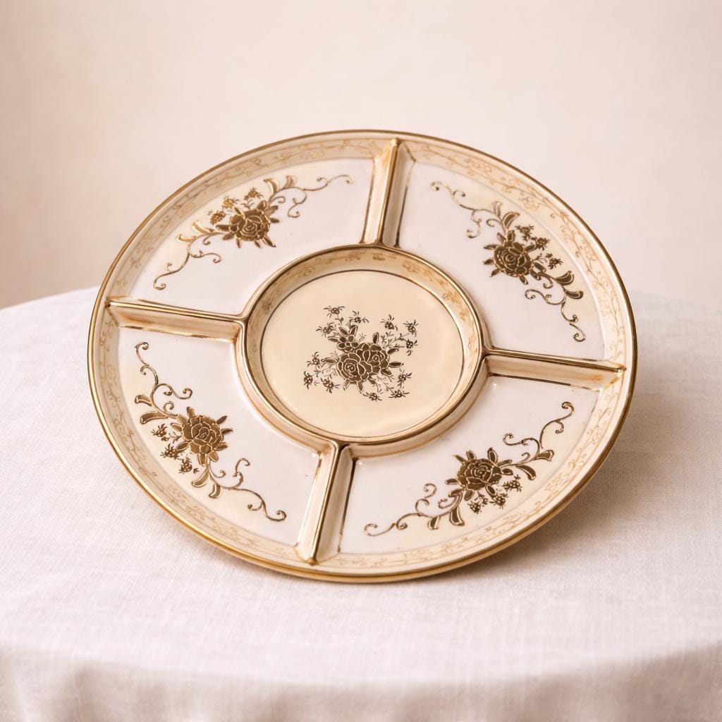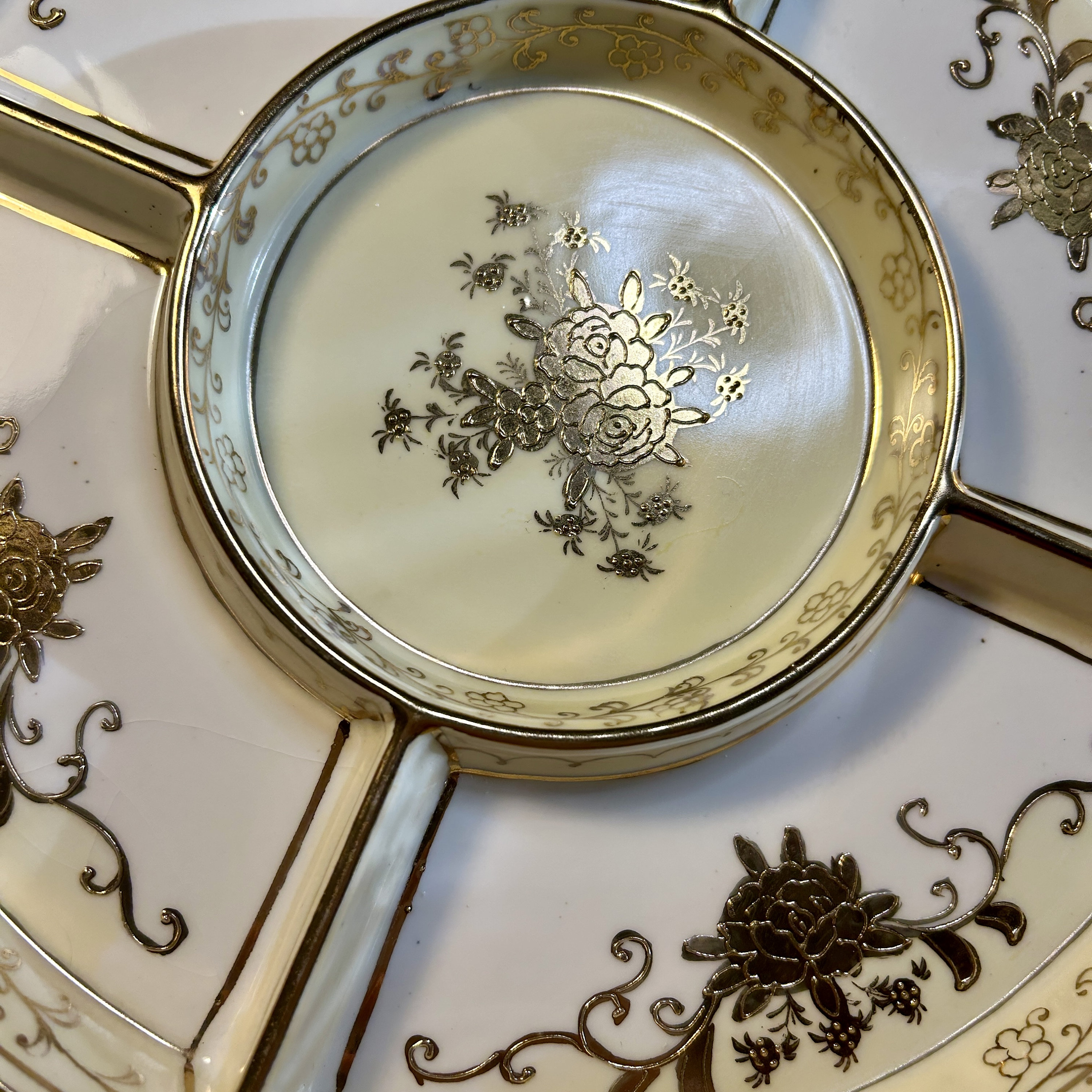Antique Moriyama Mori-Machi 5 Part Divided Serving Tray. The is a circular segment in the middle surrounded by 4 equal segments around the edge. There is gold painted designs in relief decorating each segment of the dish. Also there is gold paint trim along the inner sides and edges. The bottom contains the Moriyama Mori-machi maker's mark indicating this piece dates back to the early 20th century, probably the mid to late 1920's. The tray measures just under 10 inches and is almost 1 inch high.