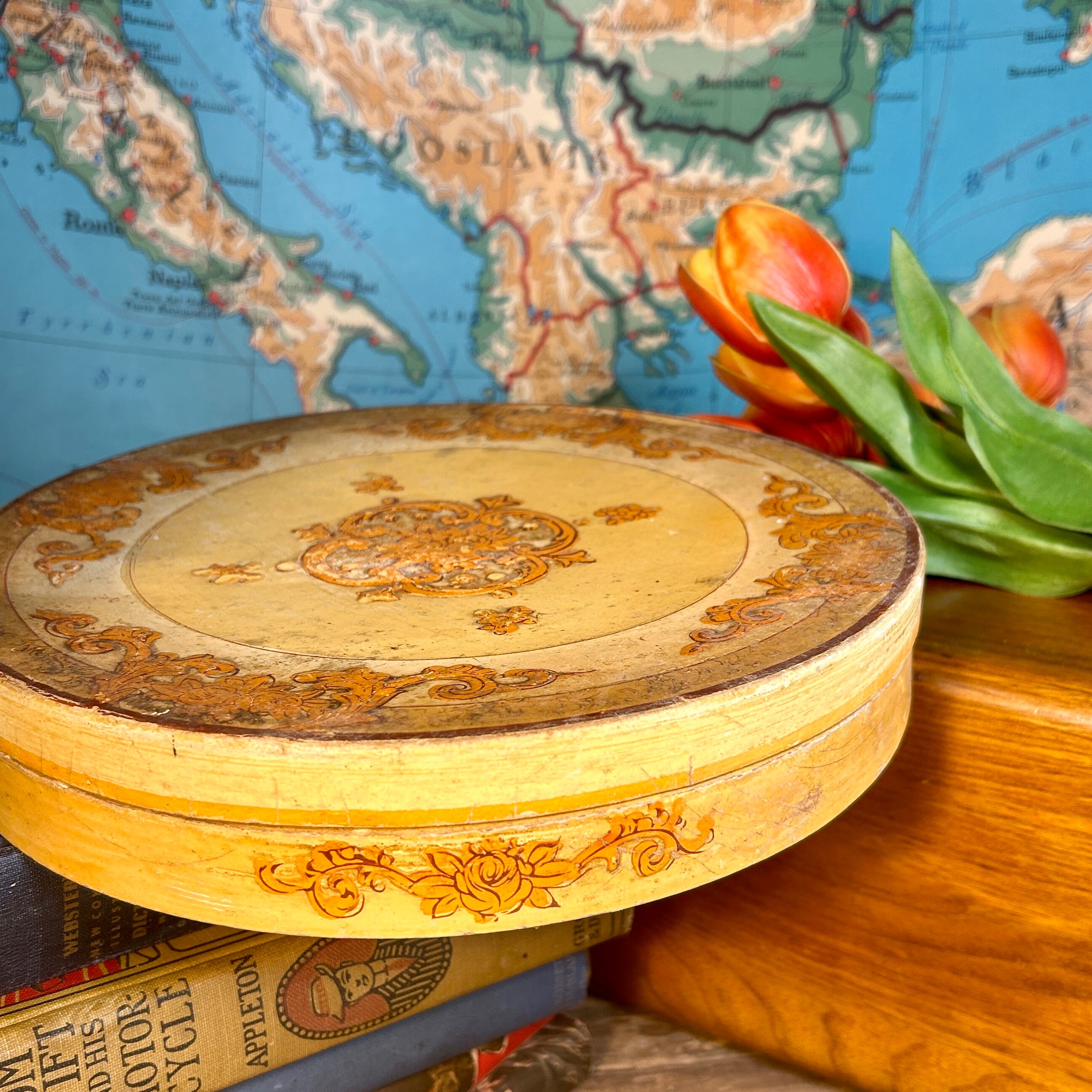 The box is in good overall condition with some staining on the outside. It is a very sturdy box. Cool pattern and color palette on the box.