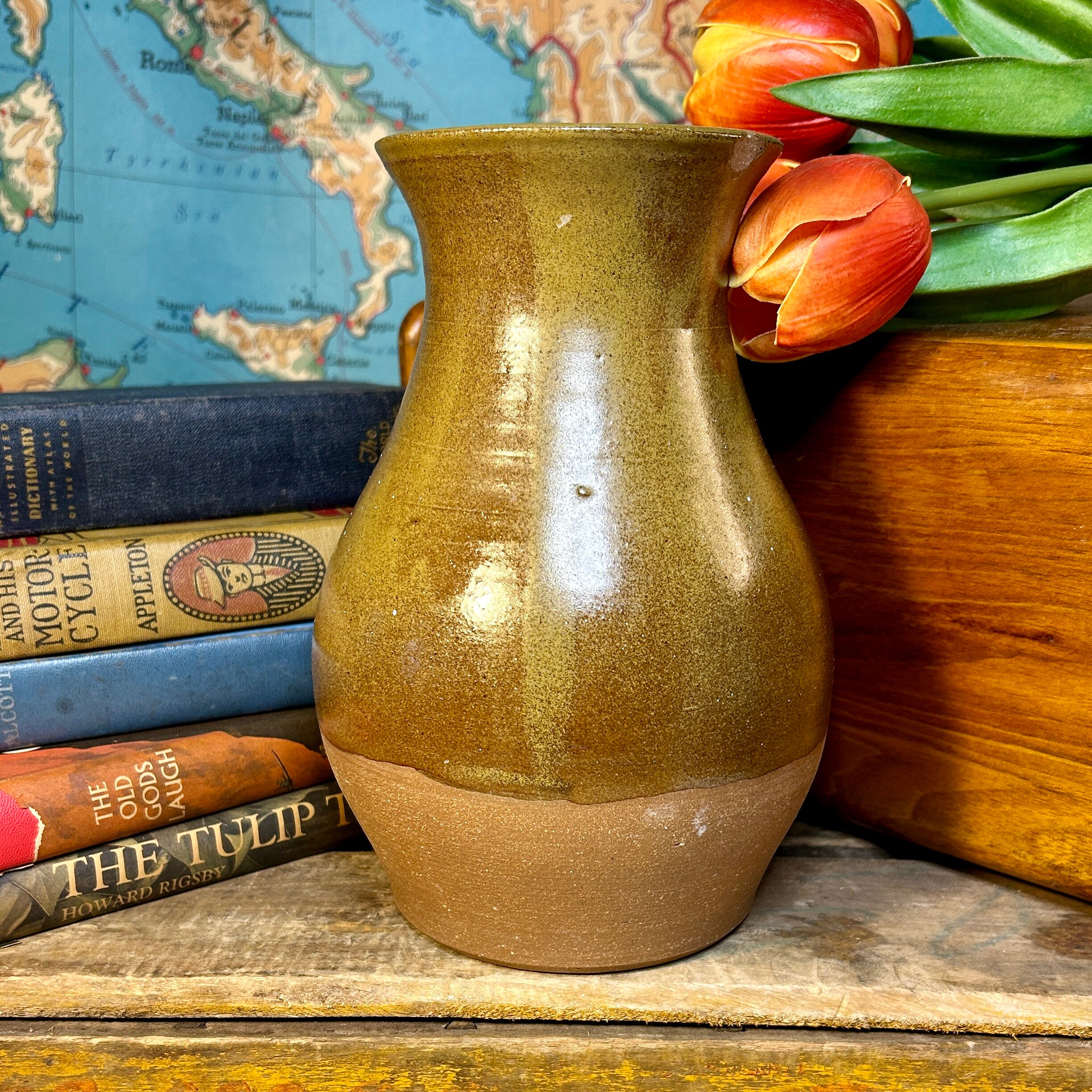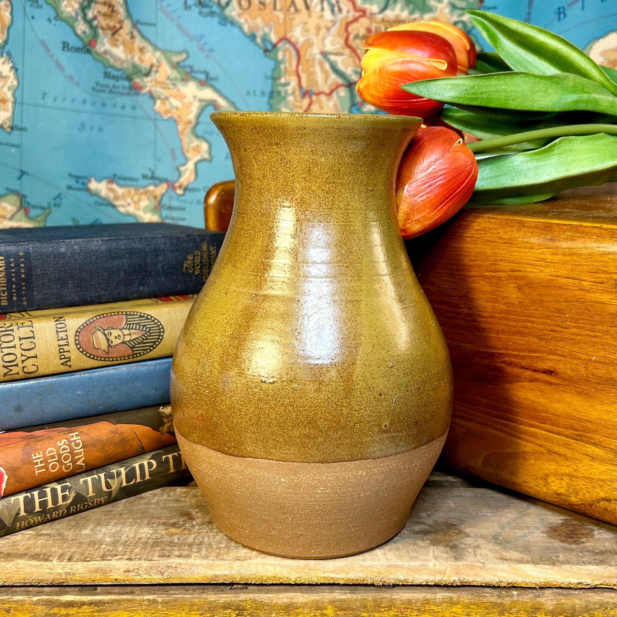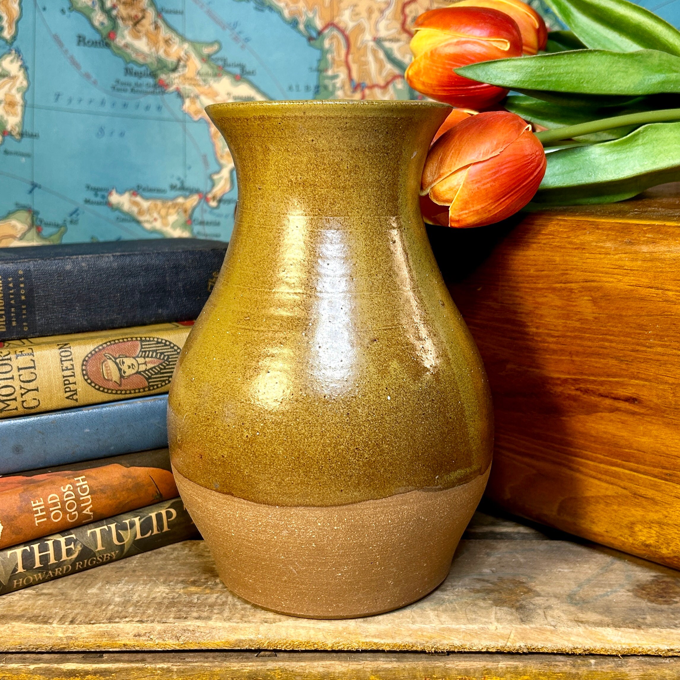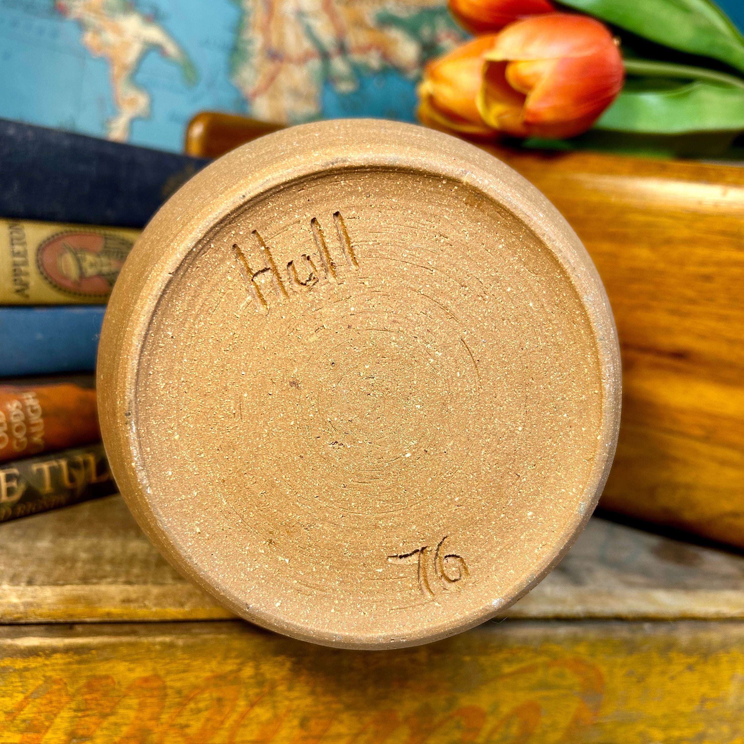 This lovely two-toned beige and brown vintage Hull vase is dated 1976. It is beautiful condition with one chip at the top rim. Glazed on the inside and 2/3 of the way down on the outside. Measures 8 1/2" tall and 4" in diameter.