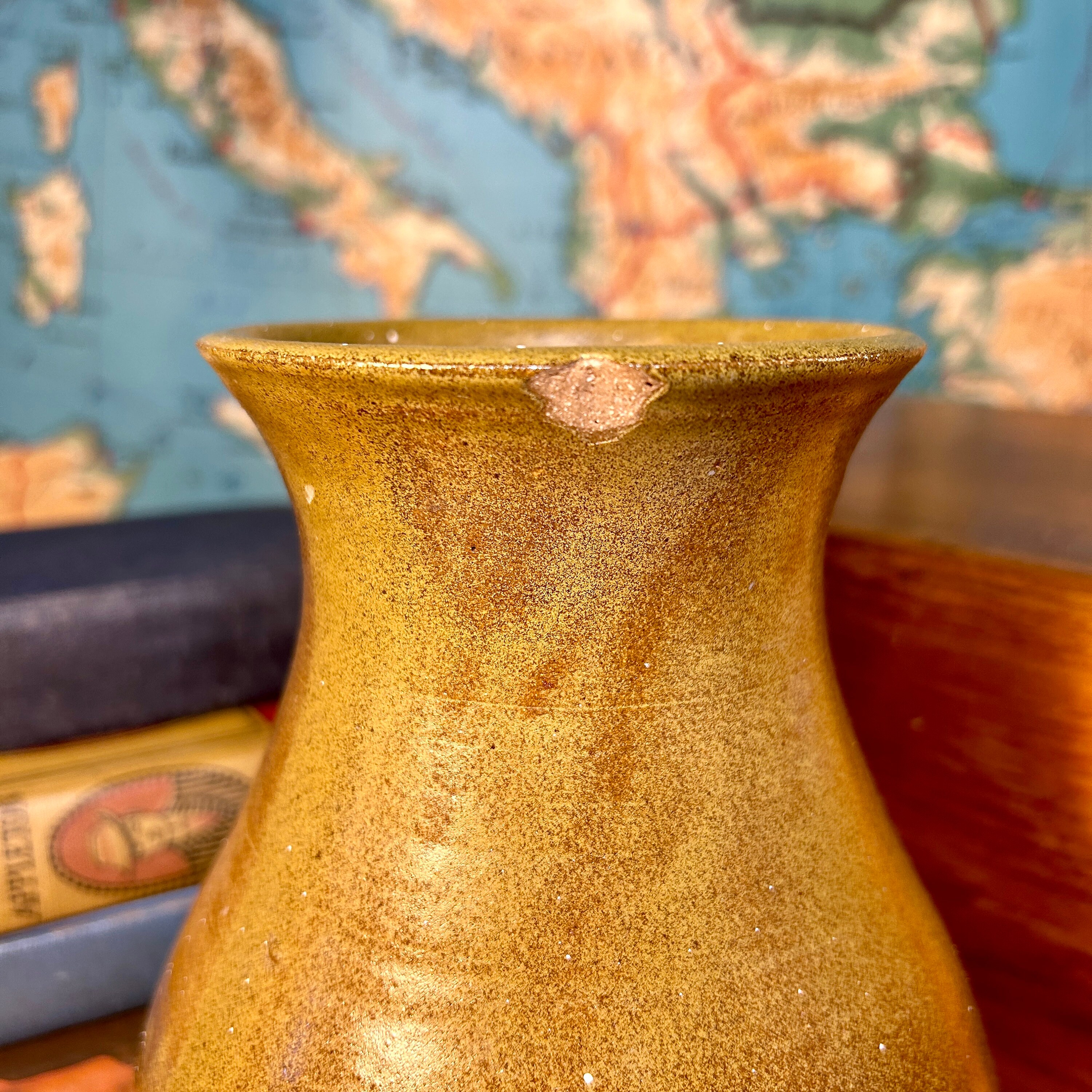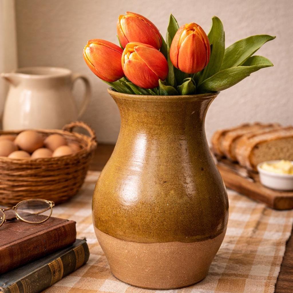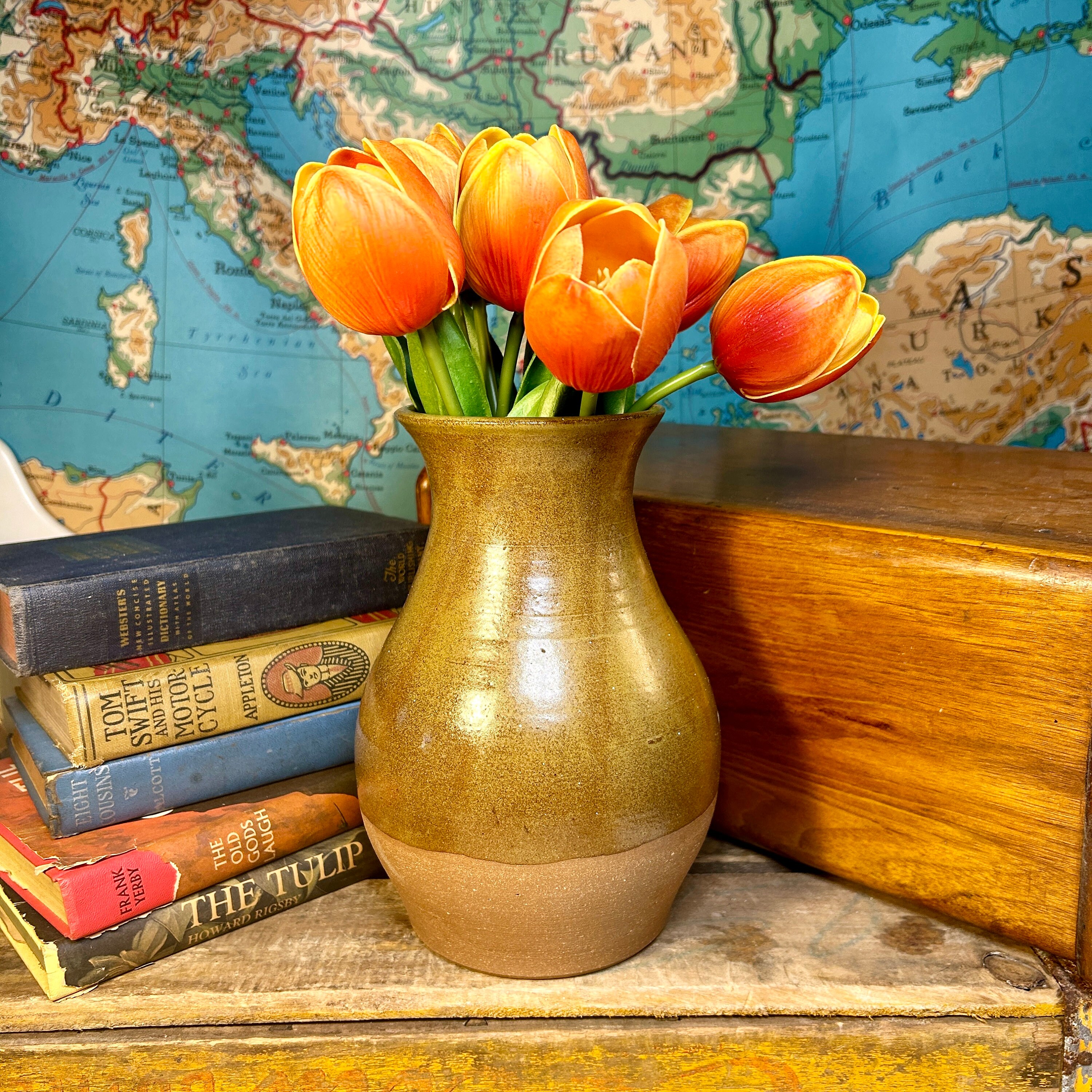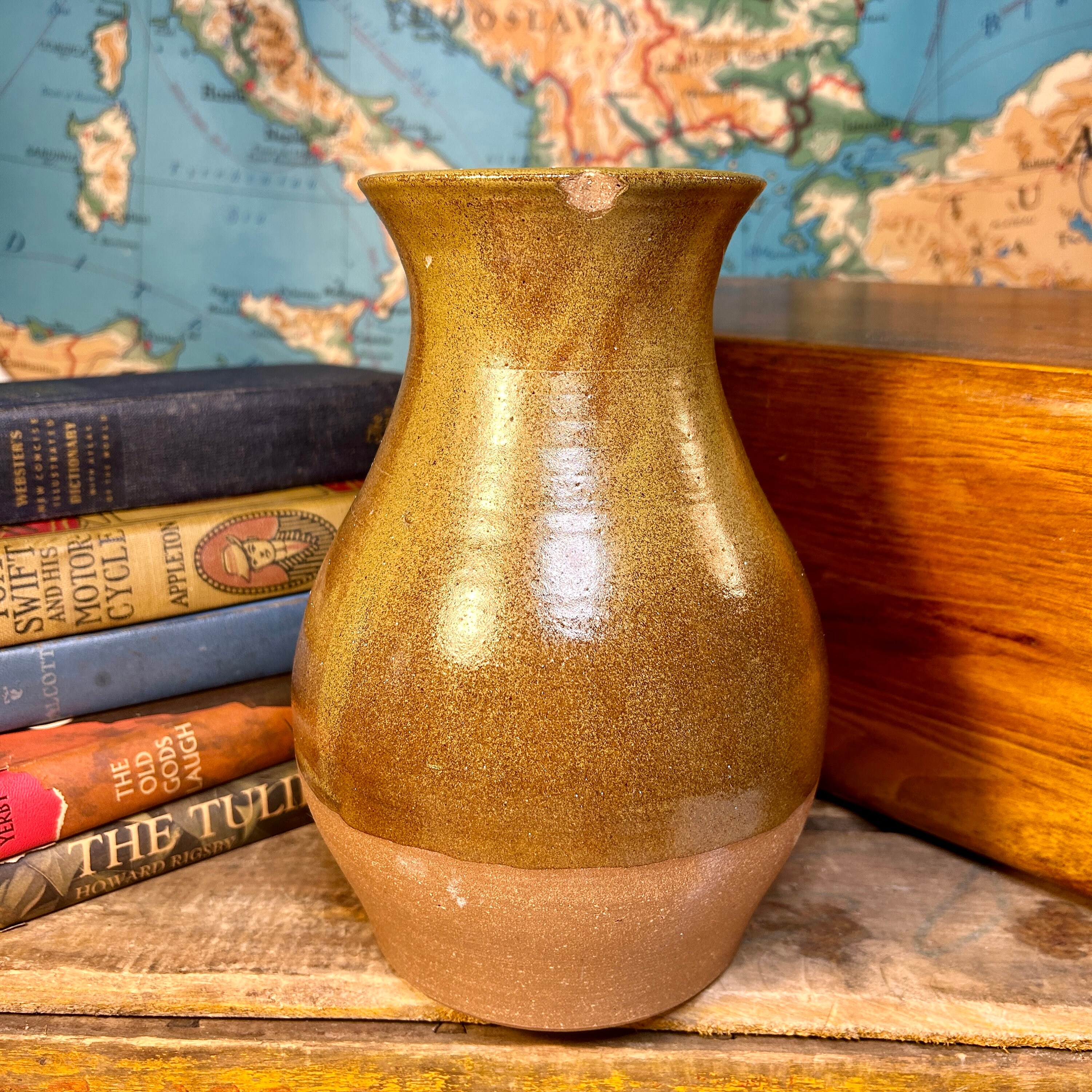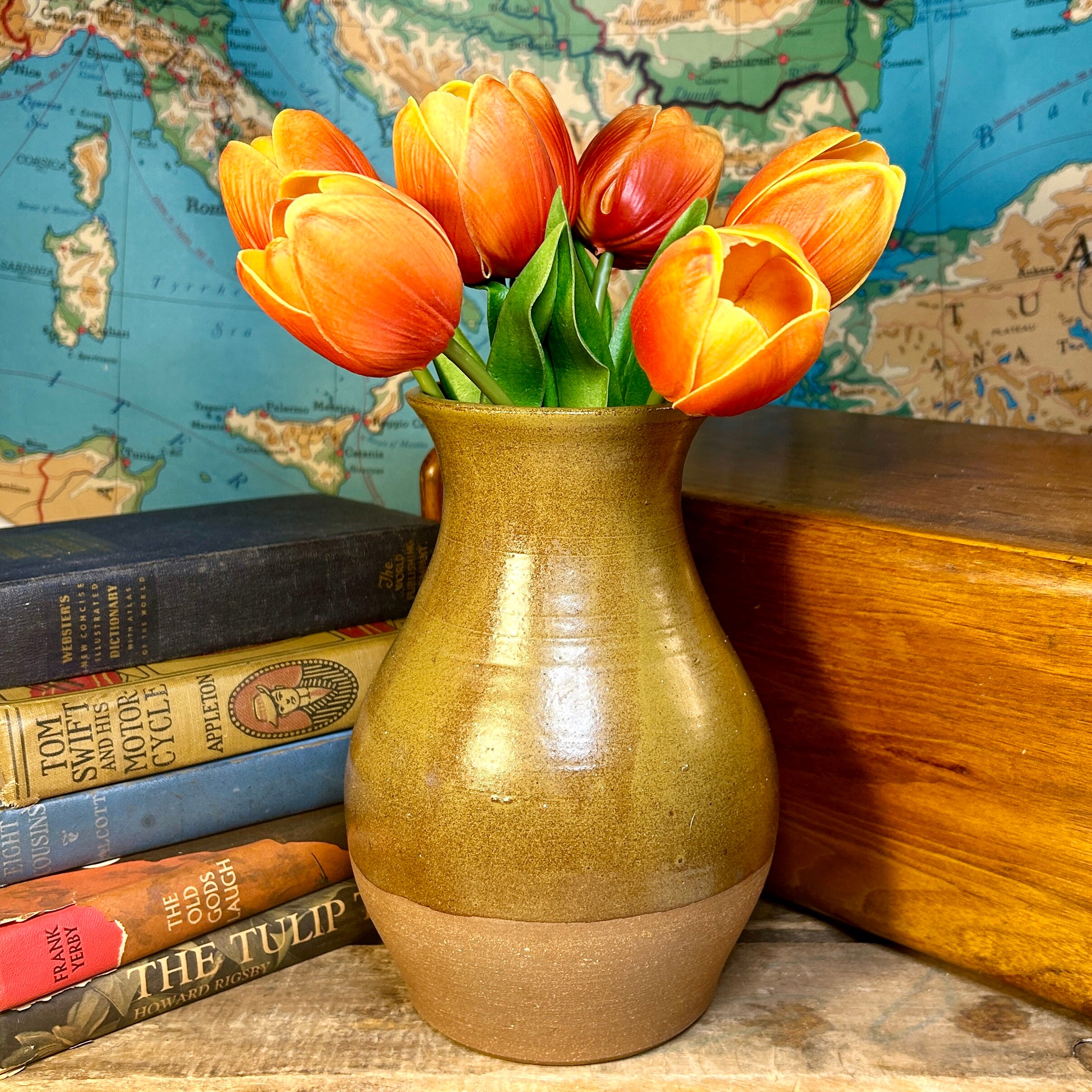 This lovely two-toned beige and brown vintage Hull vase is dated 1976. It is beautiful condition with one chip at the top rim. Glazed on the inside and 2/3 of the way down on the outside. Measures 8 1/2" tall and 4" in diameter.