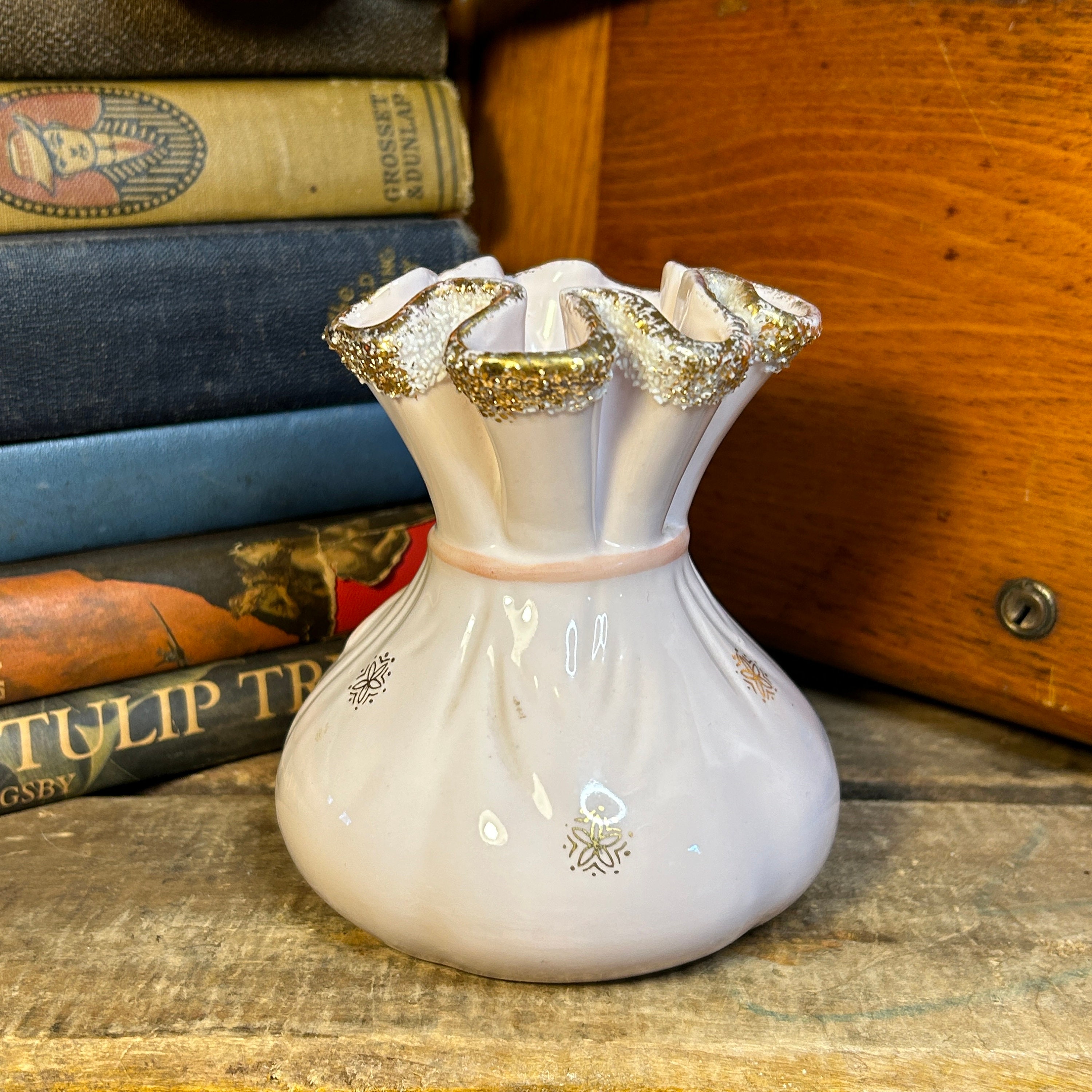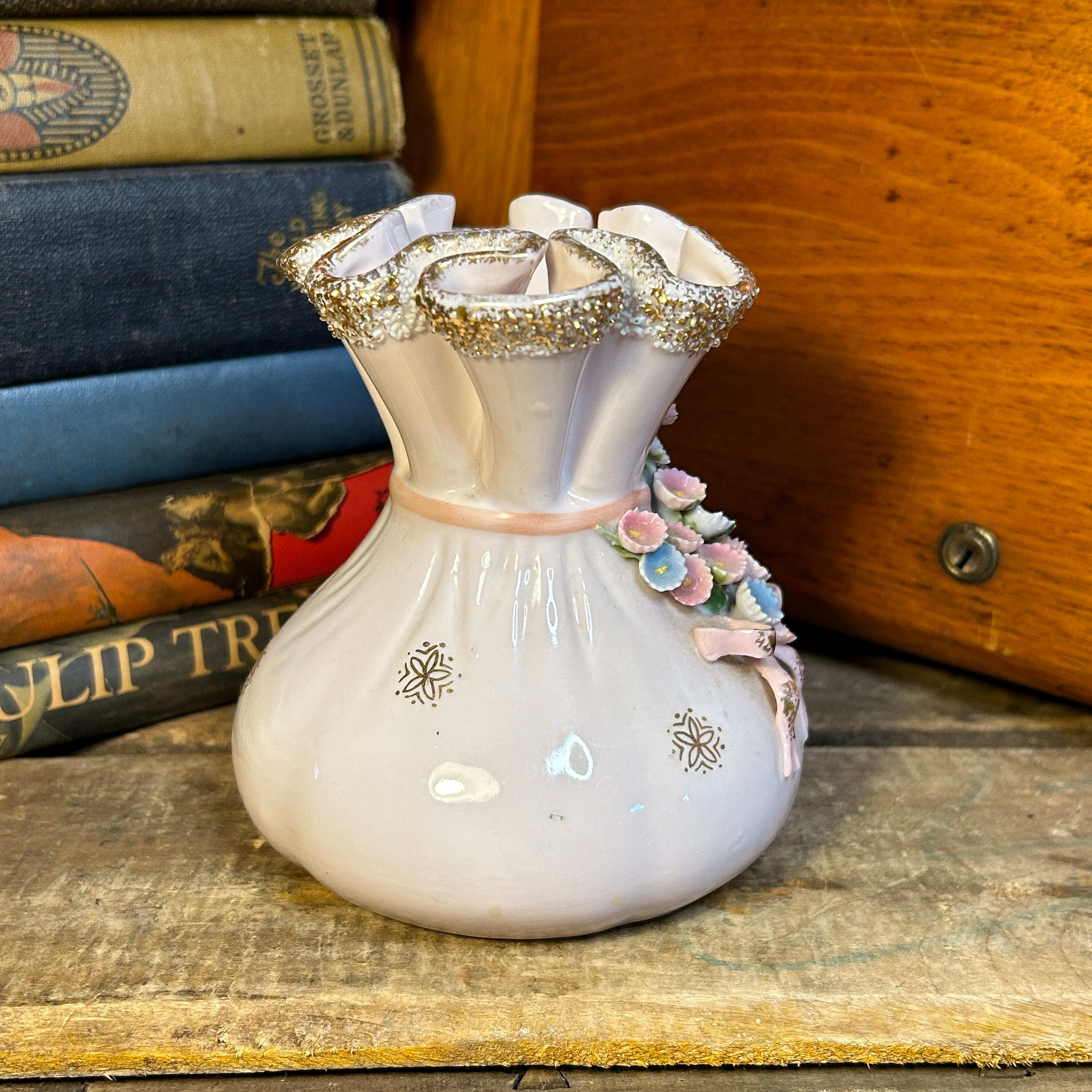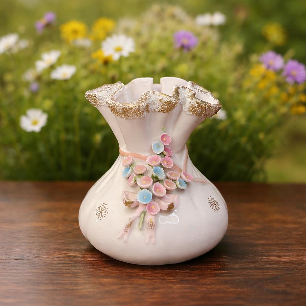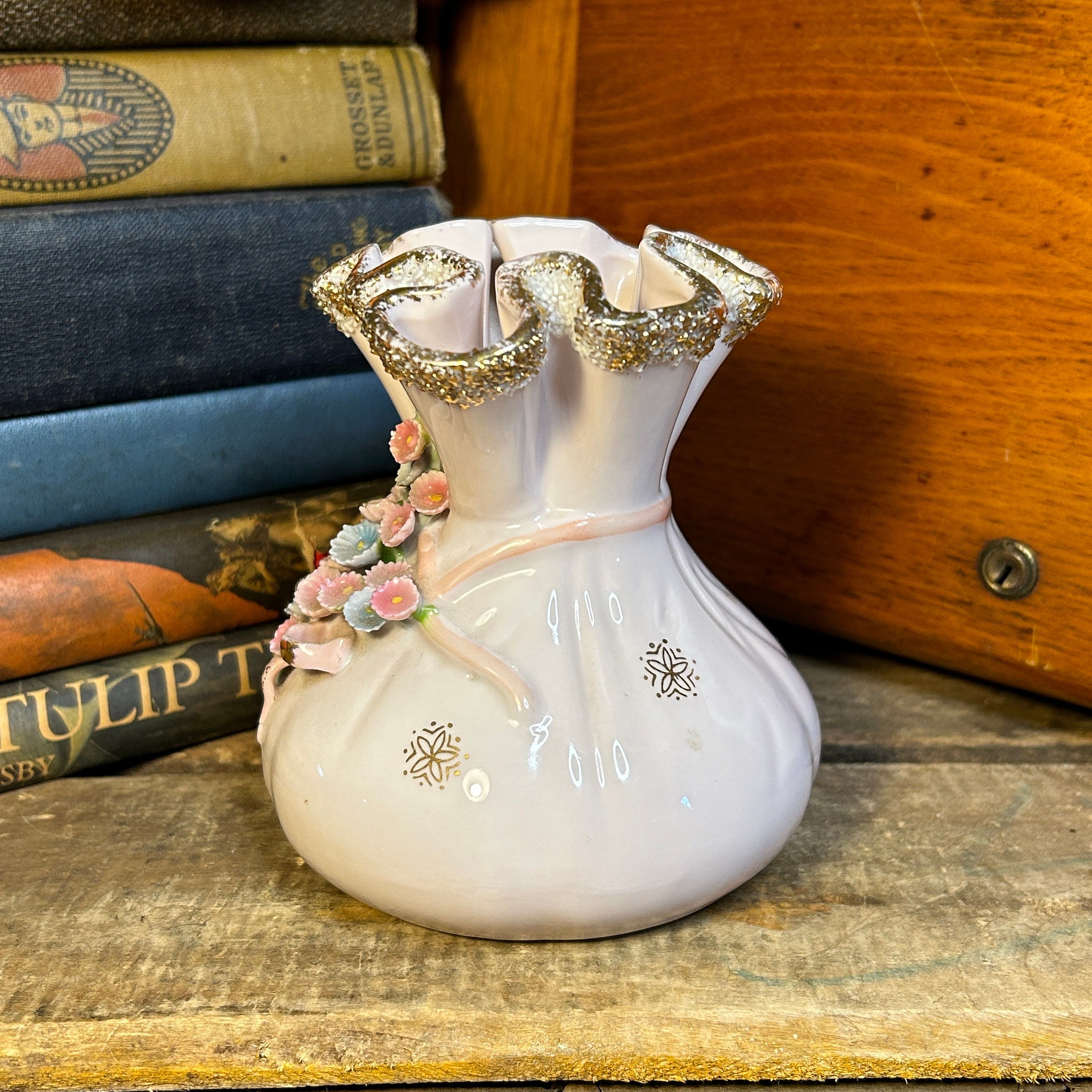 Gorgeous pale pink. Delicate flowers. Gold accents. Excellent condition with no cracks, chips or crazing. Measures 4 1/2" tall and 4" in diameter.Vintage Lefton Handpainted Ruffled Bag Vase Pastel Blue & Pink Flowers Gold Glitter Decor
