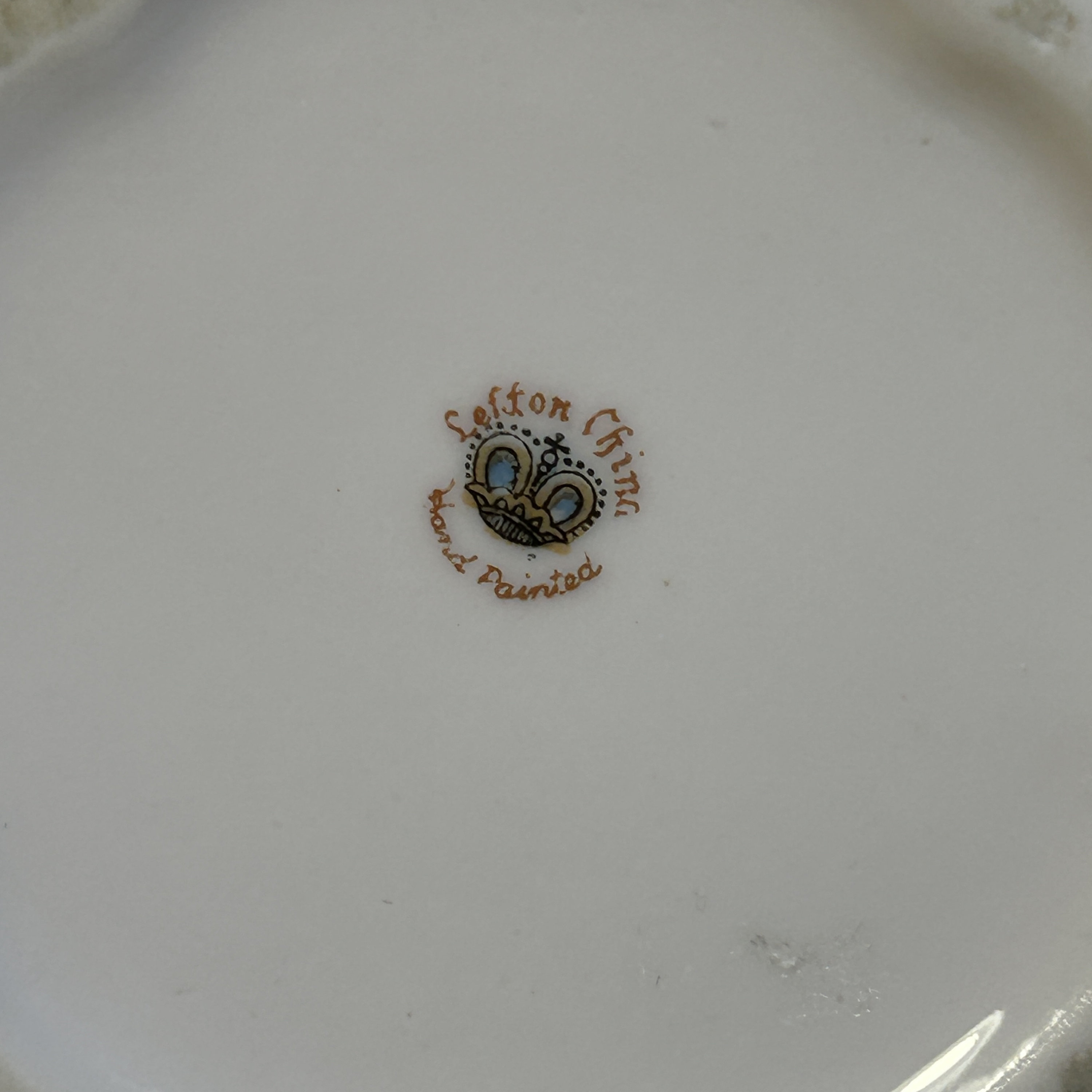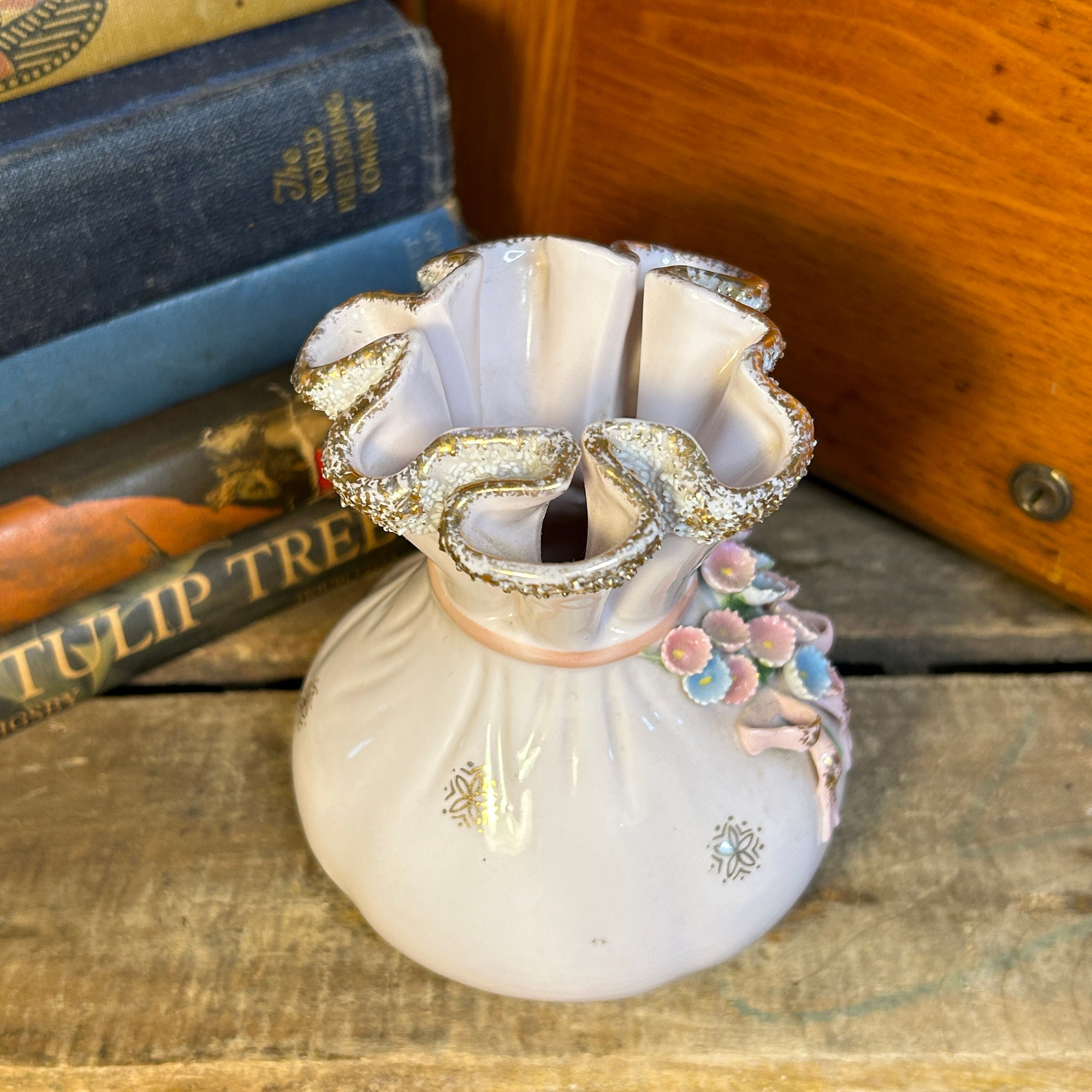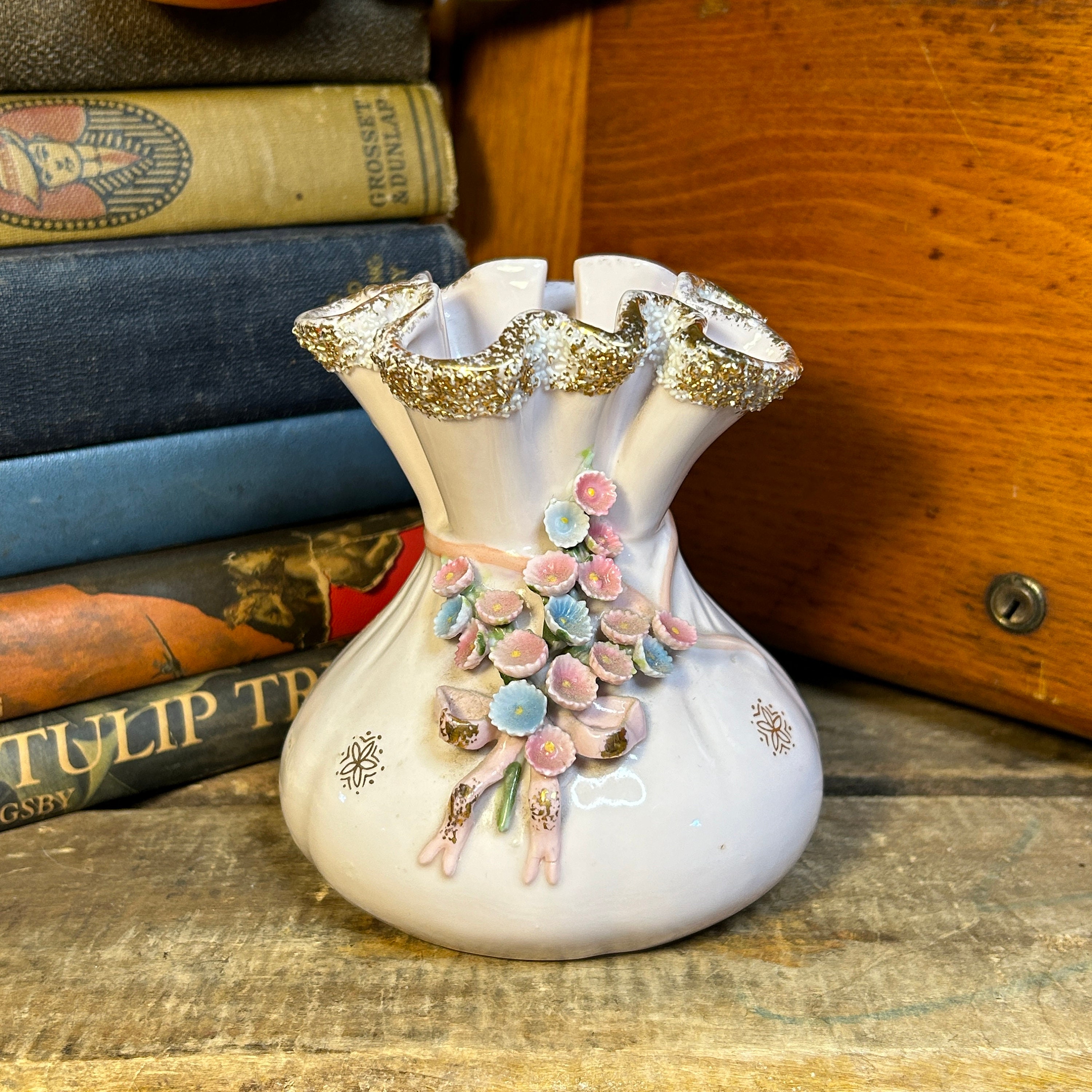 Gorgeous pale pink. Delicate flowers. Gold accents. Excellent condition with no cracks, chips or crazing. Measures 4 1/2" tall and 4" in diameter.Vintage Lefton Handpainted Ruffled Bag Vase Pastel Blue & Pink Flowers Gold Glitter Decor