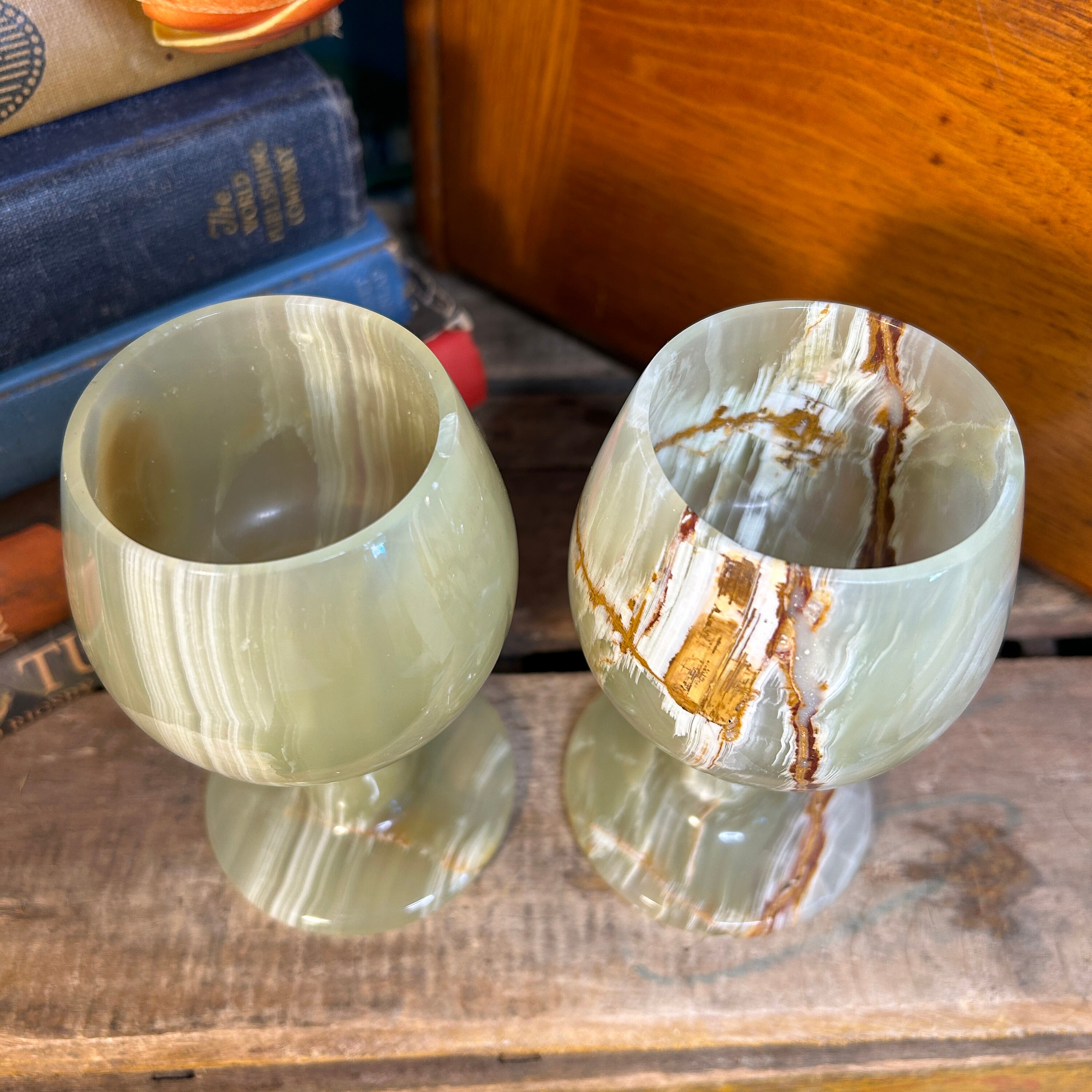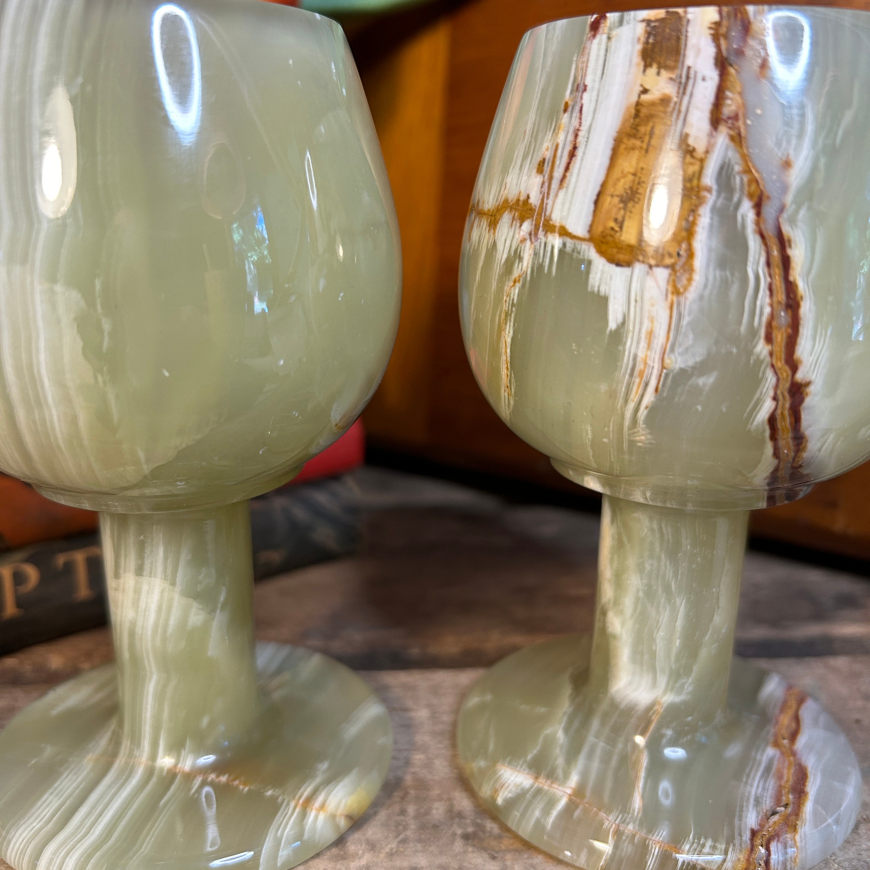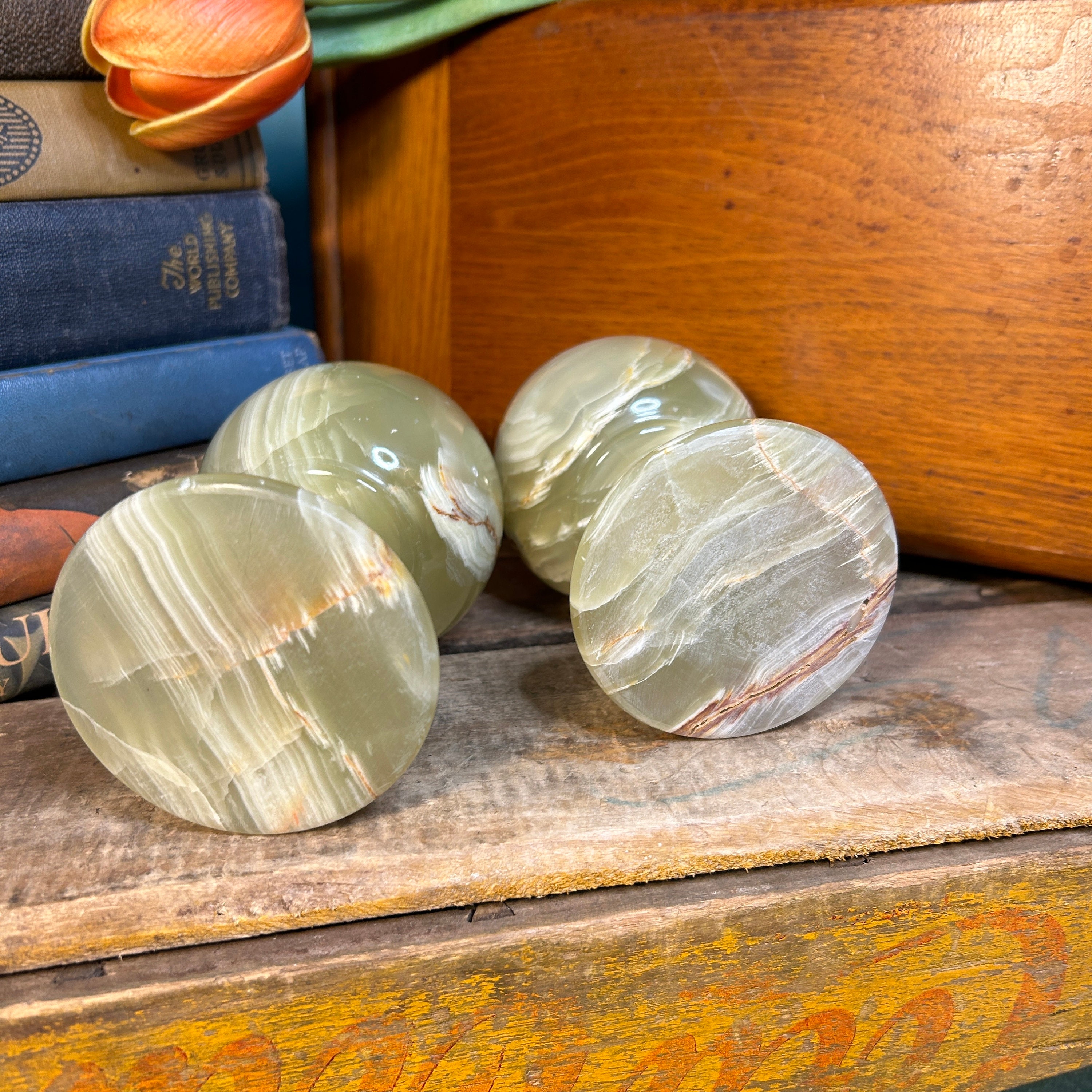 Beautiful Banded Onyx Rich in Earthy Colors. As with all things in nature no two are alike so actual patterns will vary. Heavy and solid. Beautiful combination of light green, caramel, and ivory marble. No cracks or chips. In pristine condition.