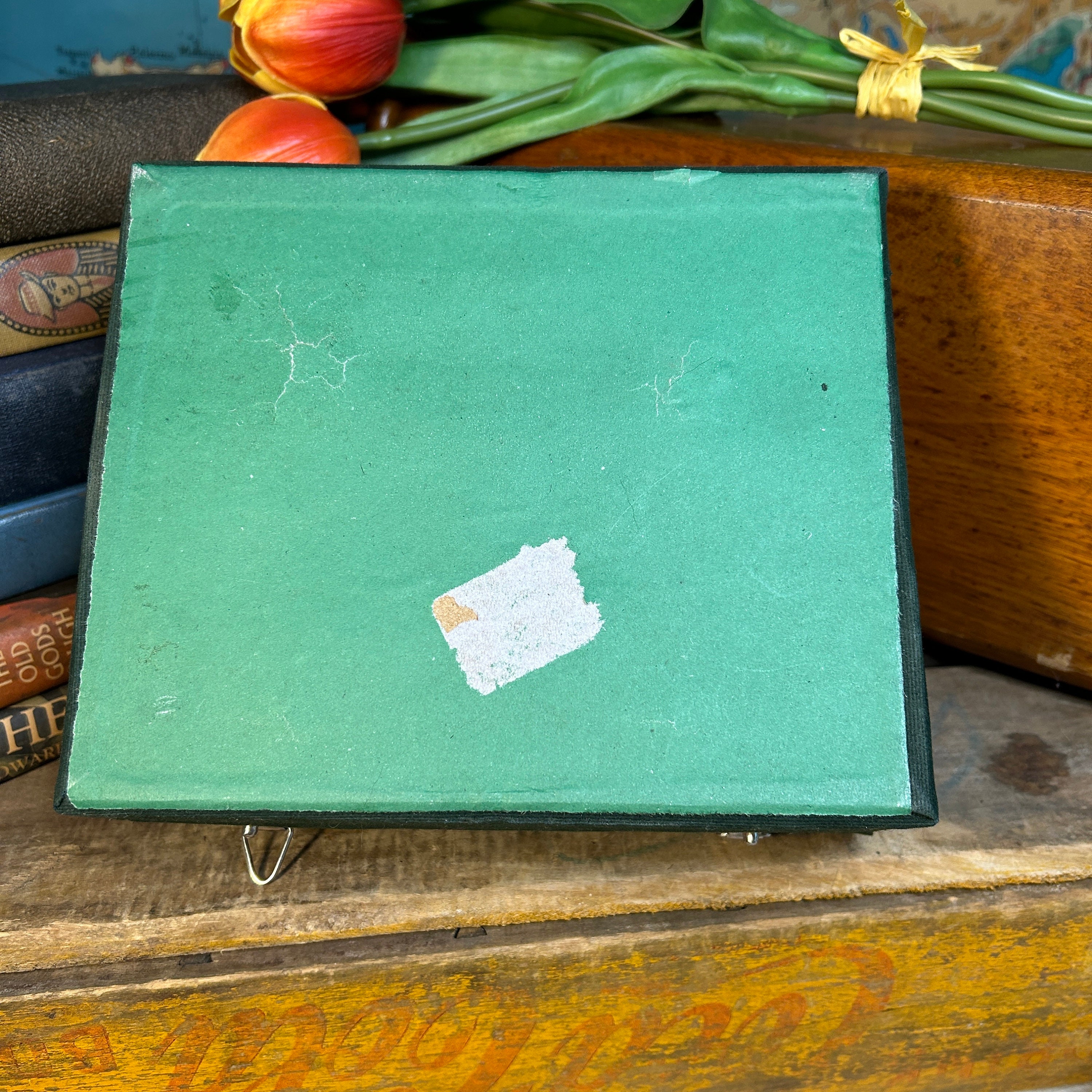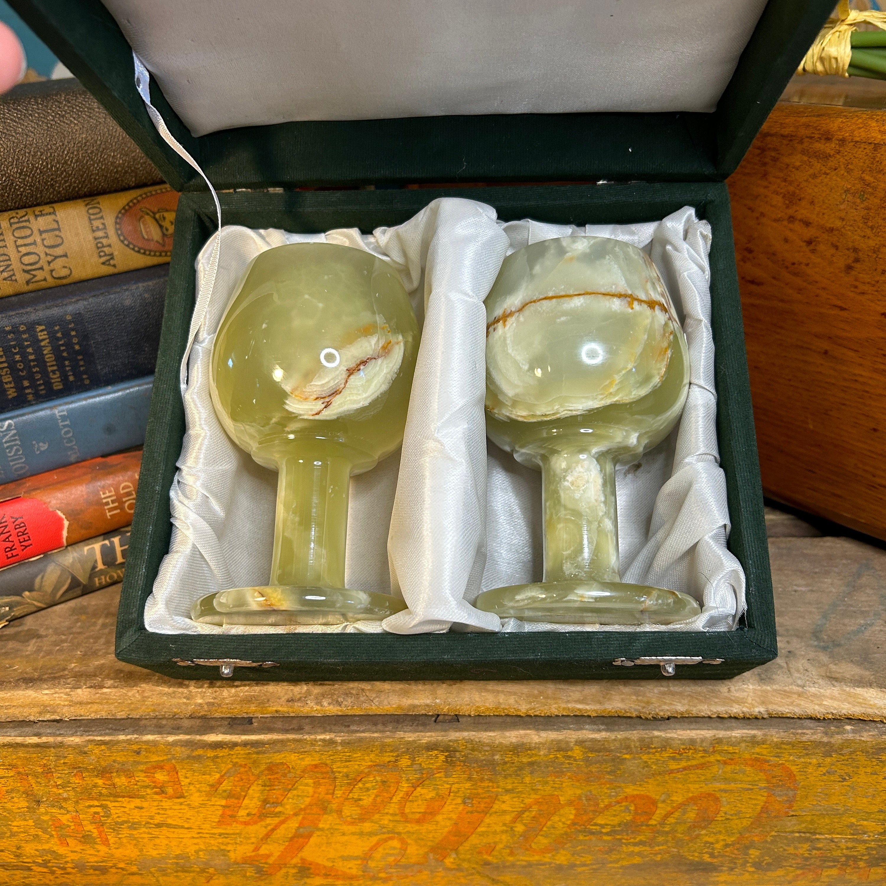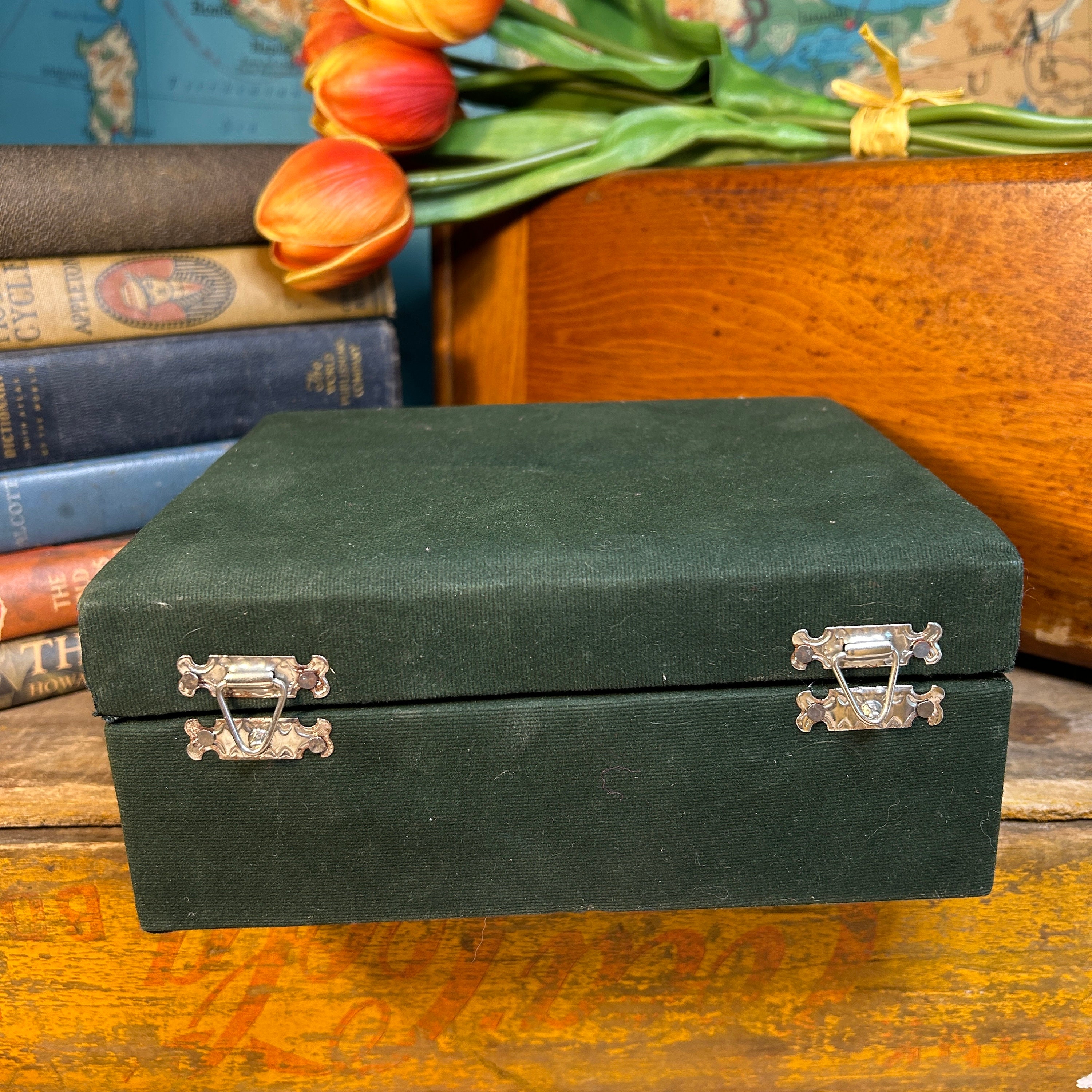 Box is dark green velvet lined with white silk with a 2 latch cover. Box is also in excellent condition.