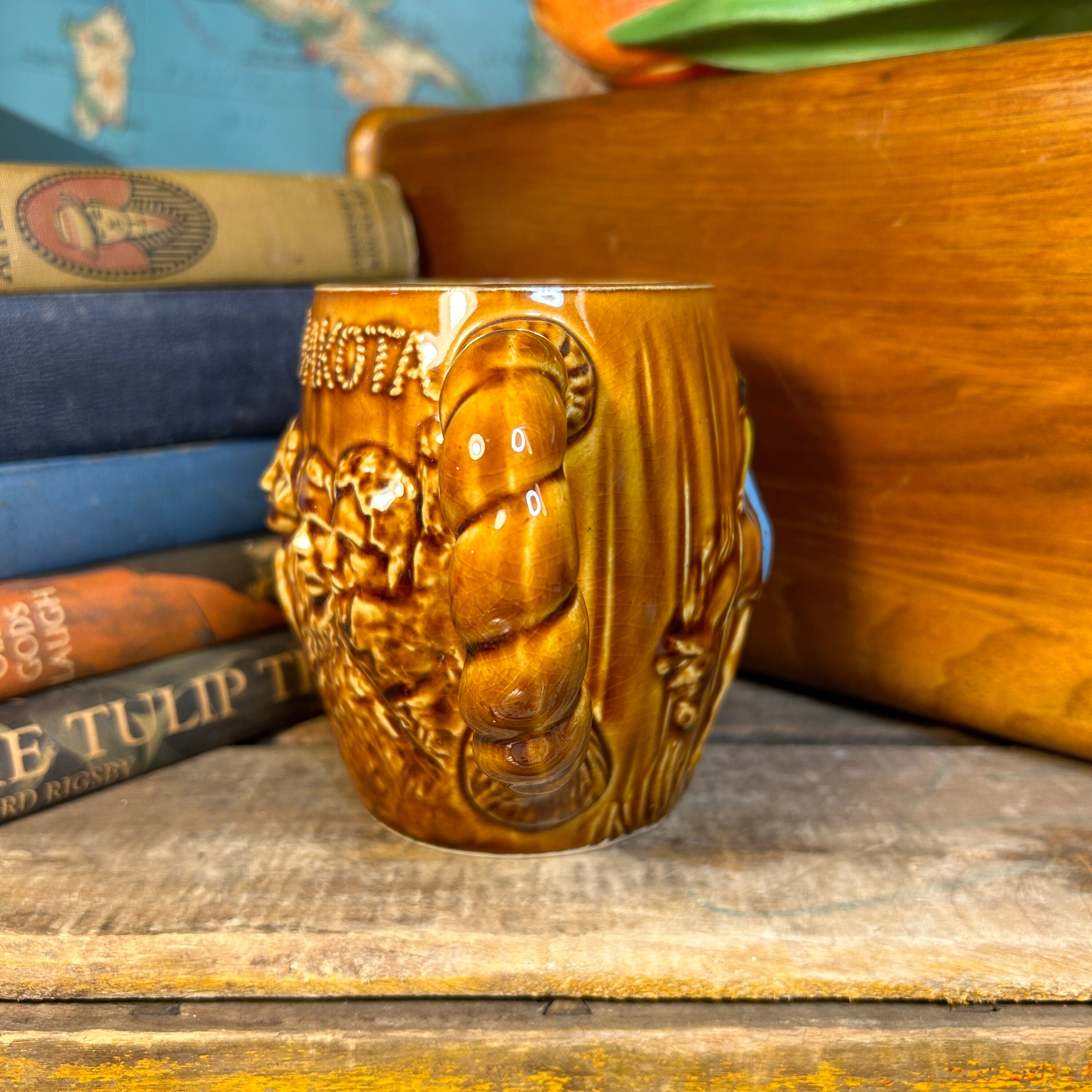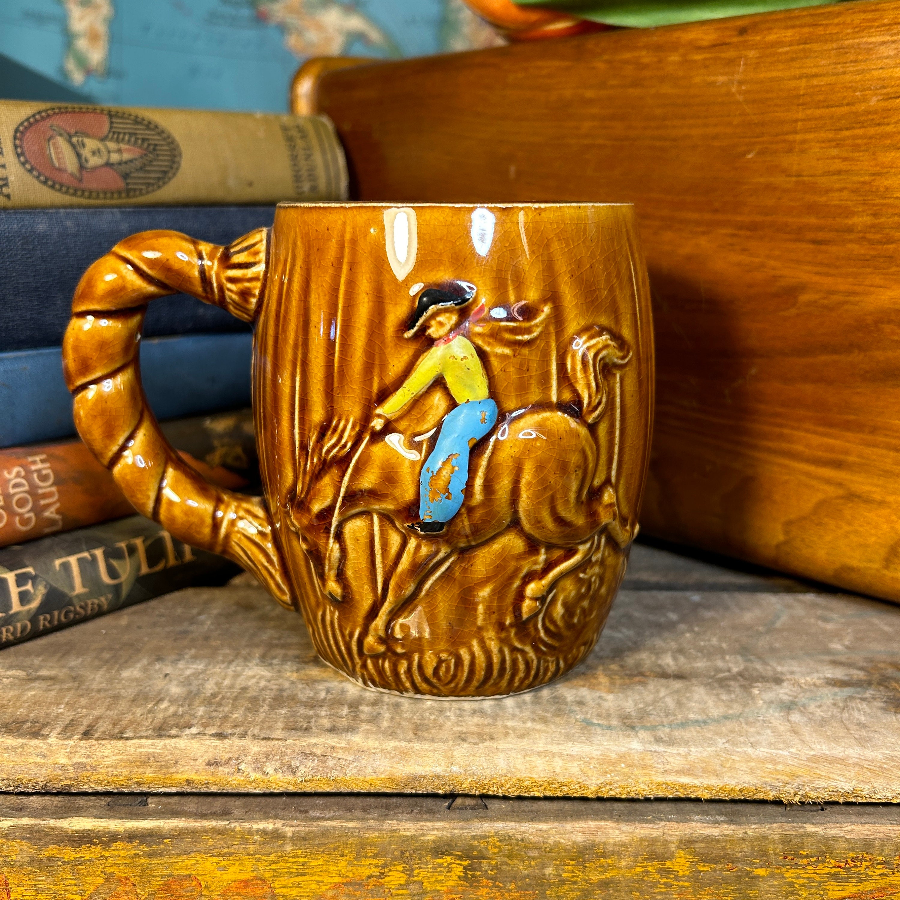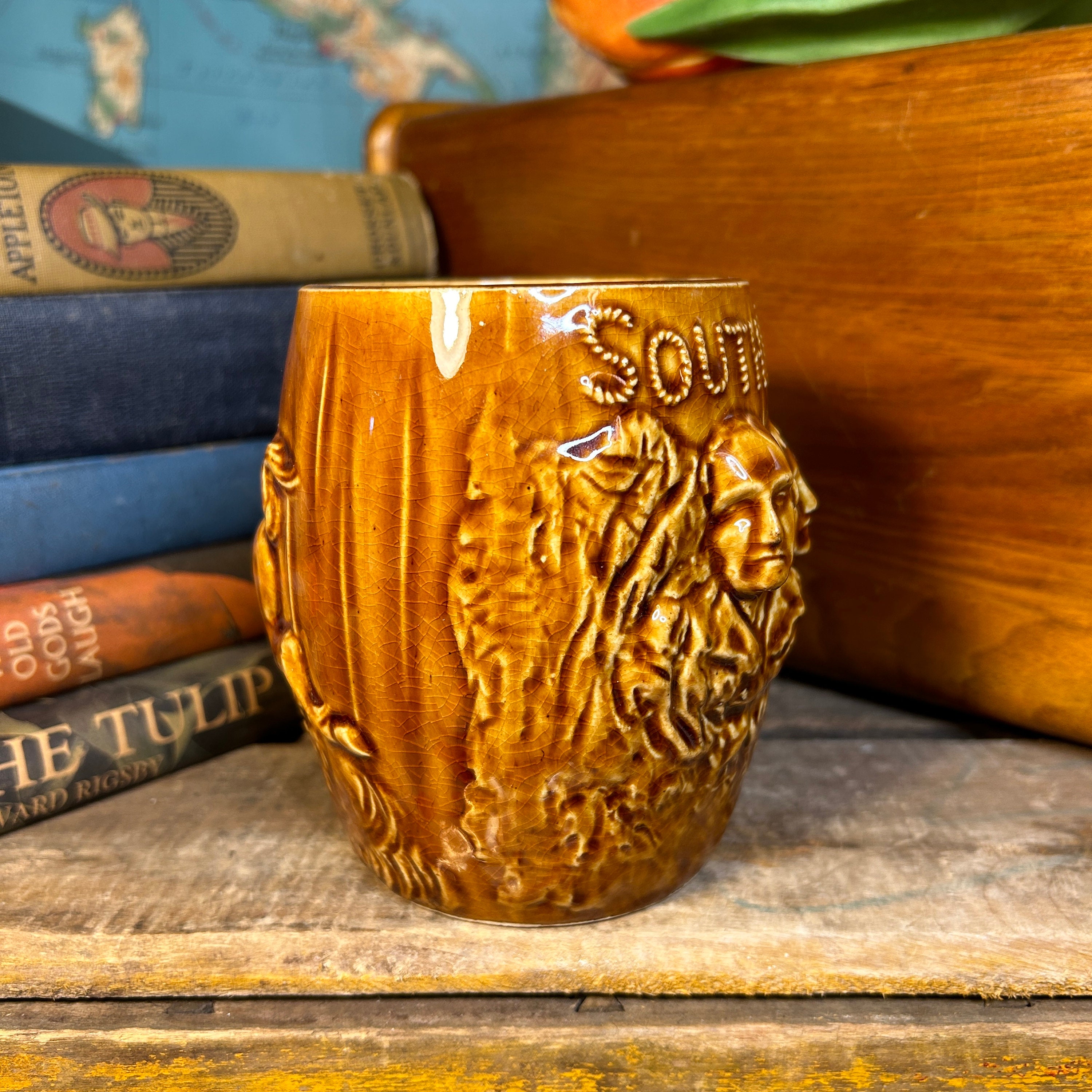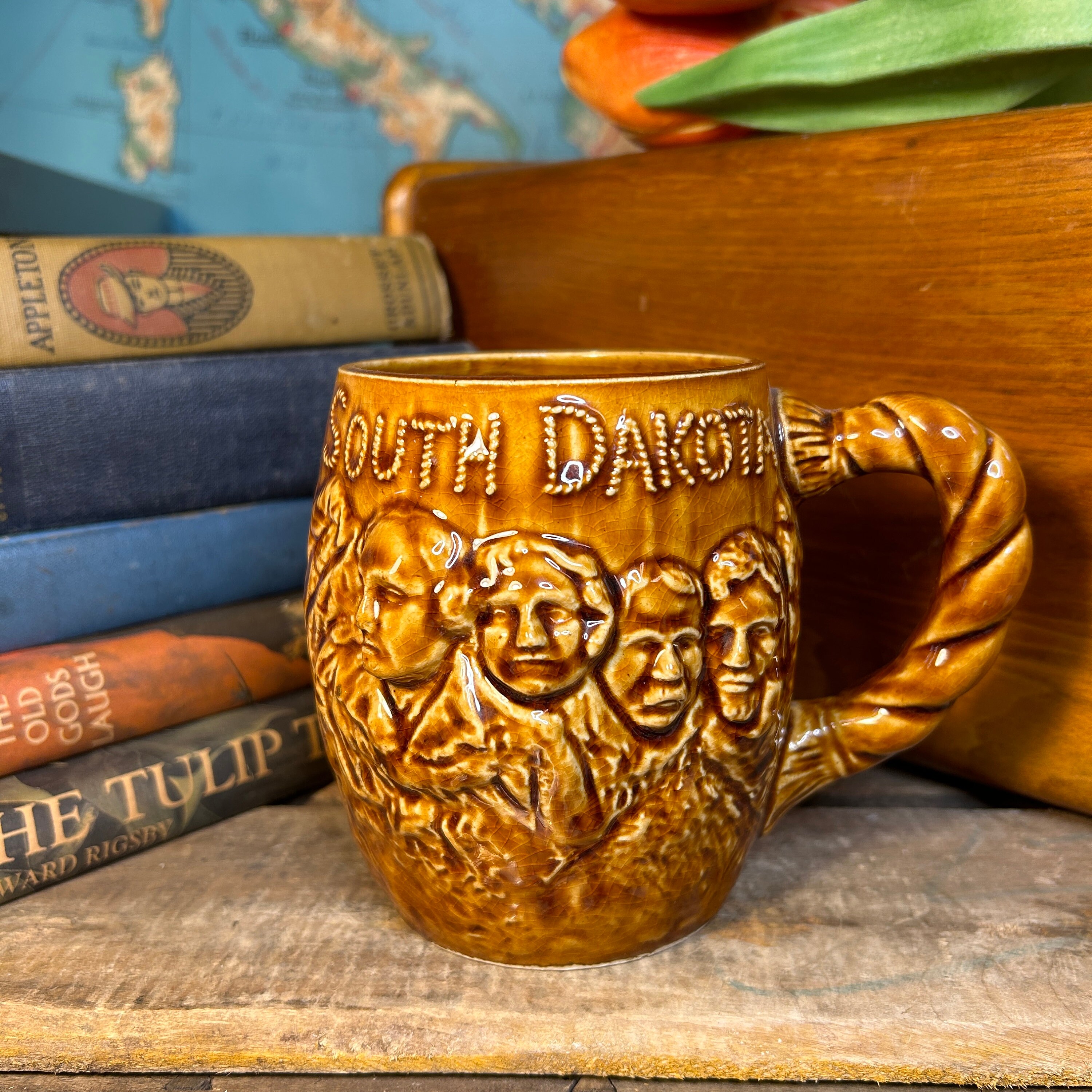 Vintage ceramic South Dakota Mount Rushmore Brown mug. Mount Rushmore with South Dakota above it on one side. Cowboy on the other side 3D. Great condition no chips or cracks. 4 1/2 inches Tall 5 1/2 inches wide with the handle.