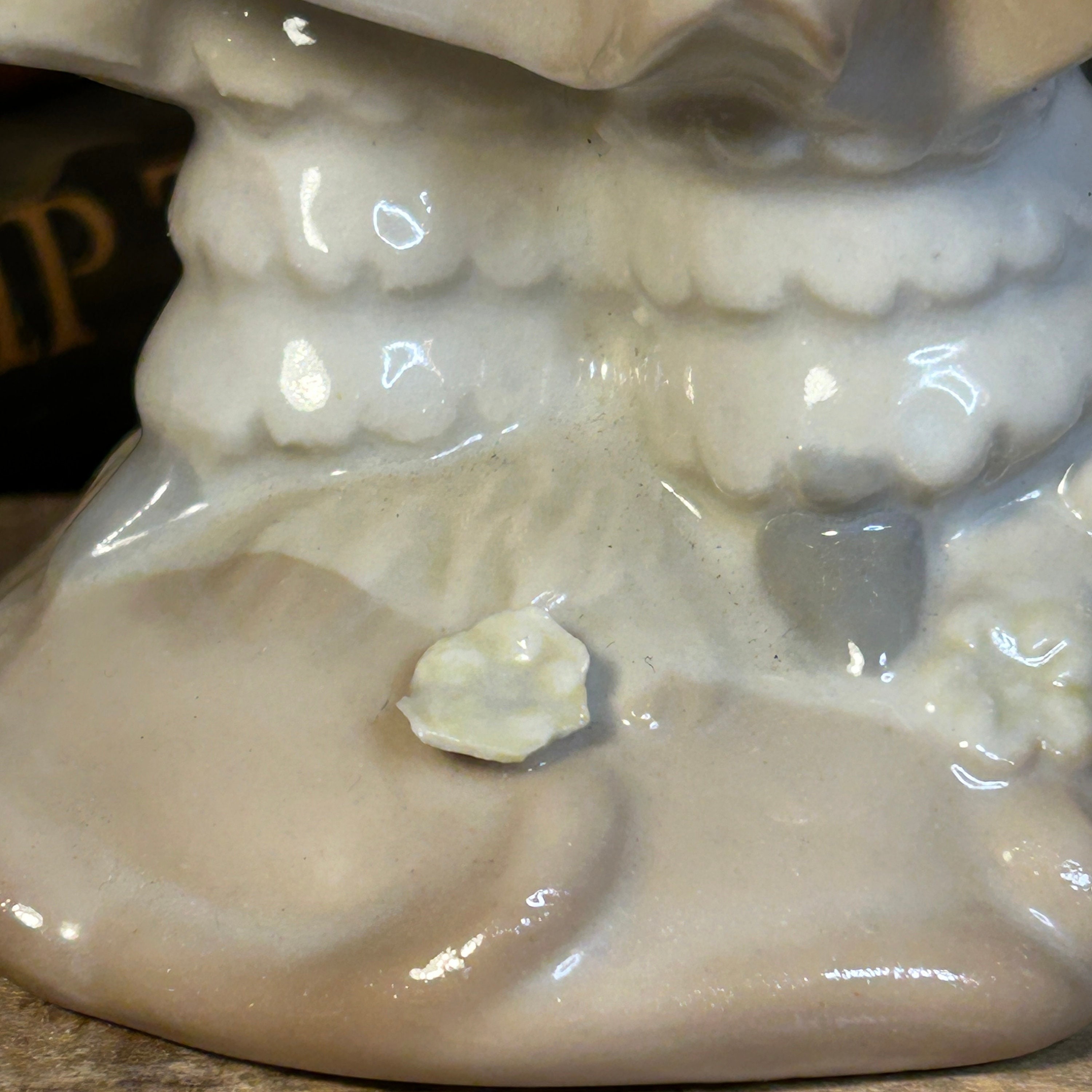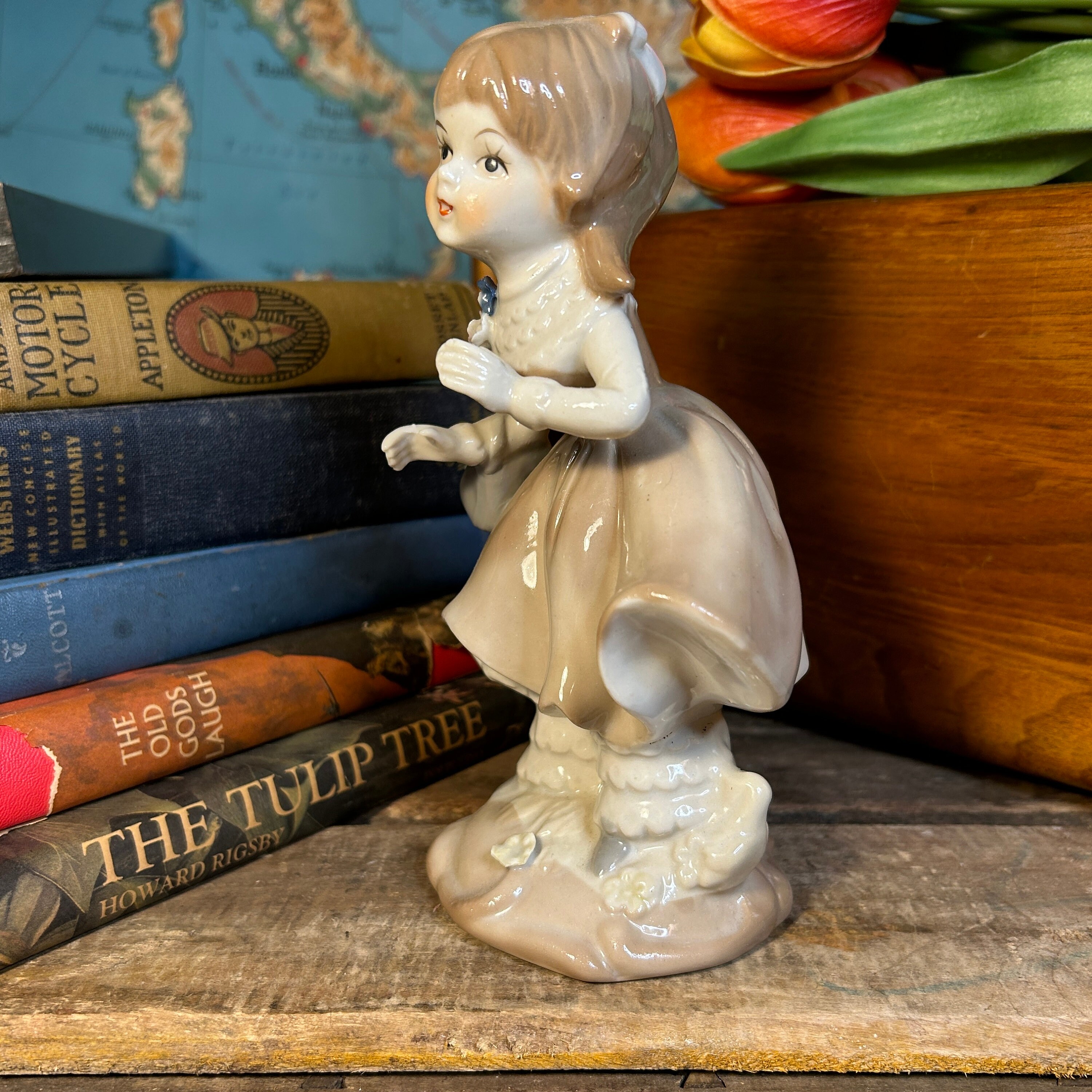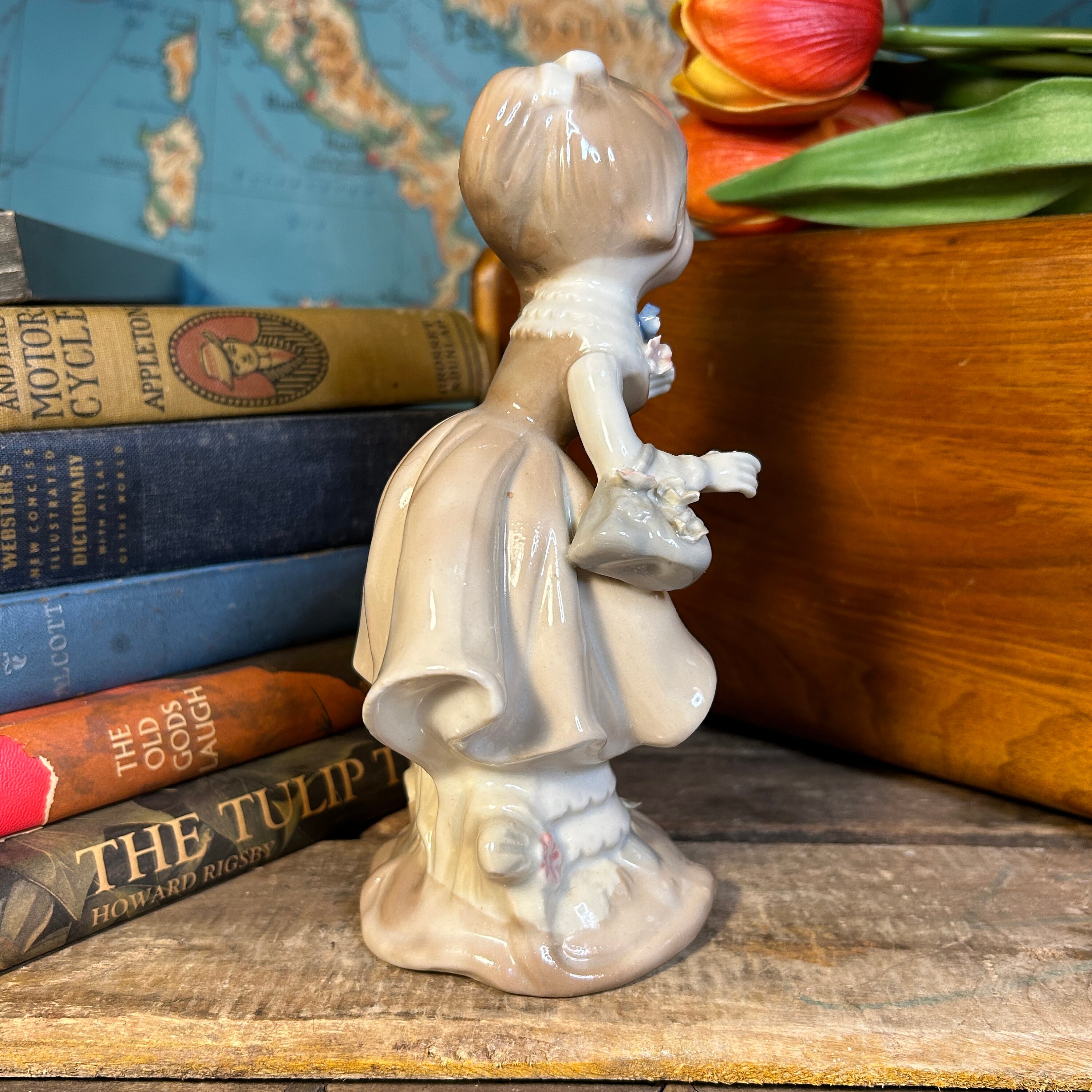 This sweet little girl with a ponytail holds a purse decorated with flowers and additional flowers on figure. She has no chips or cracks. I have included closeup photos of flowers. They do not look chipped to me, but please look at photos closely.