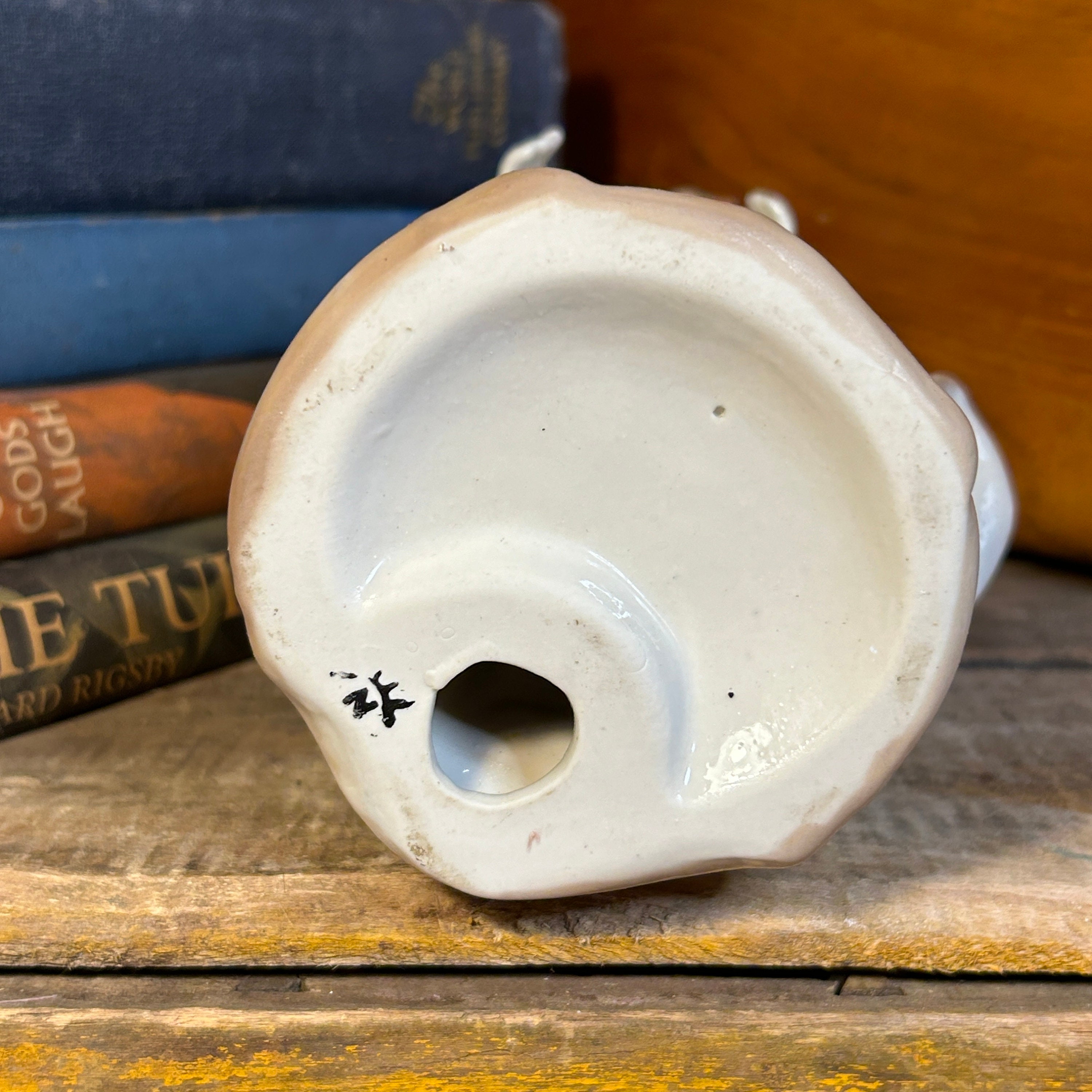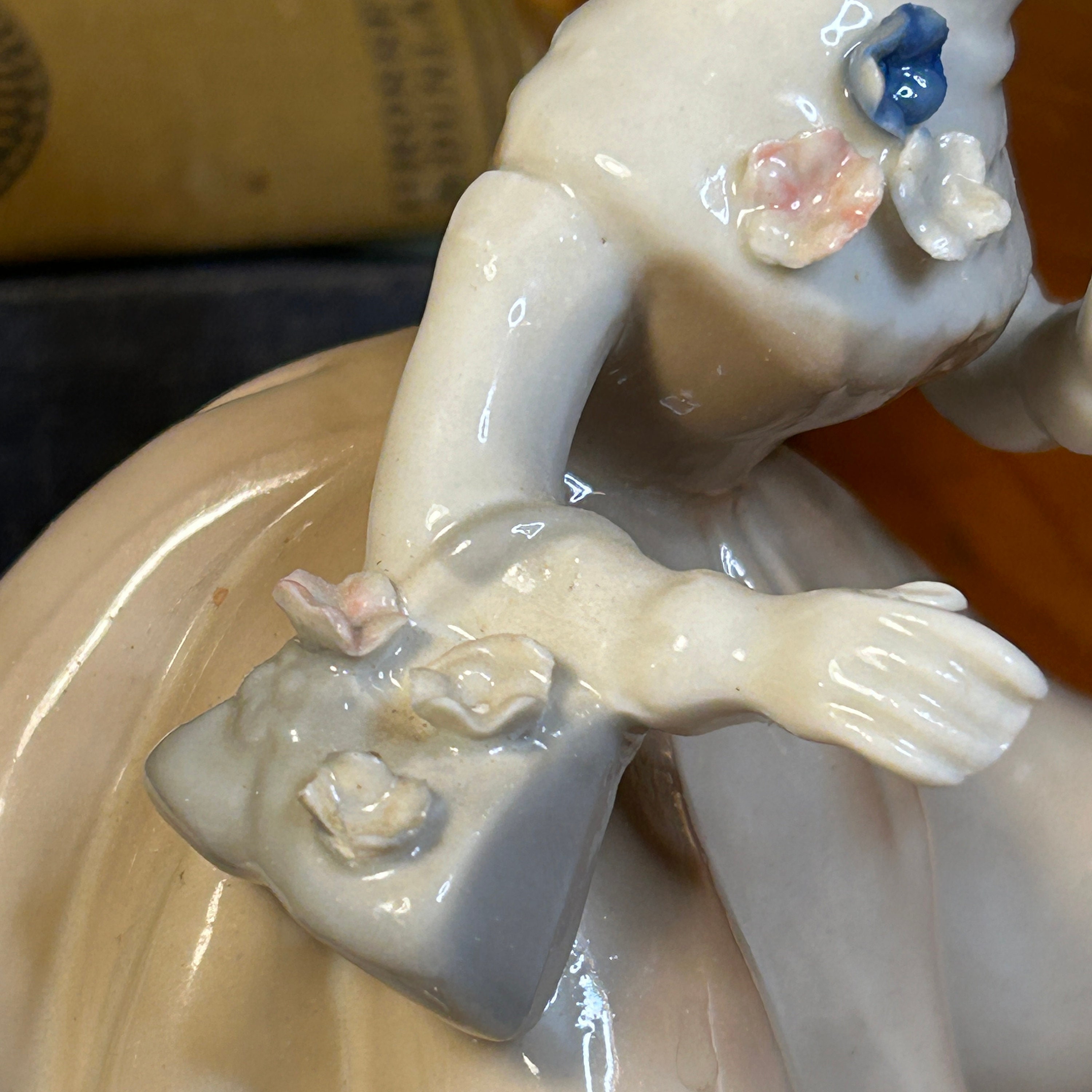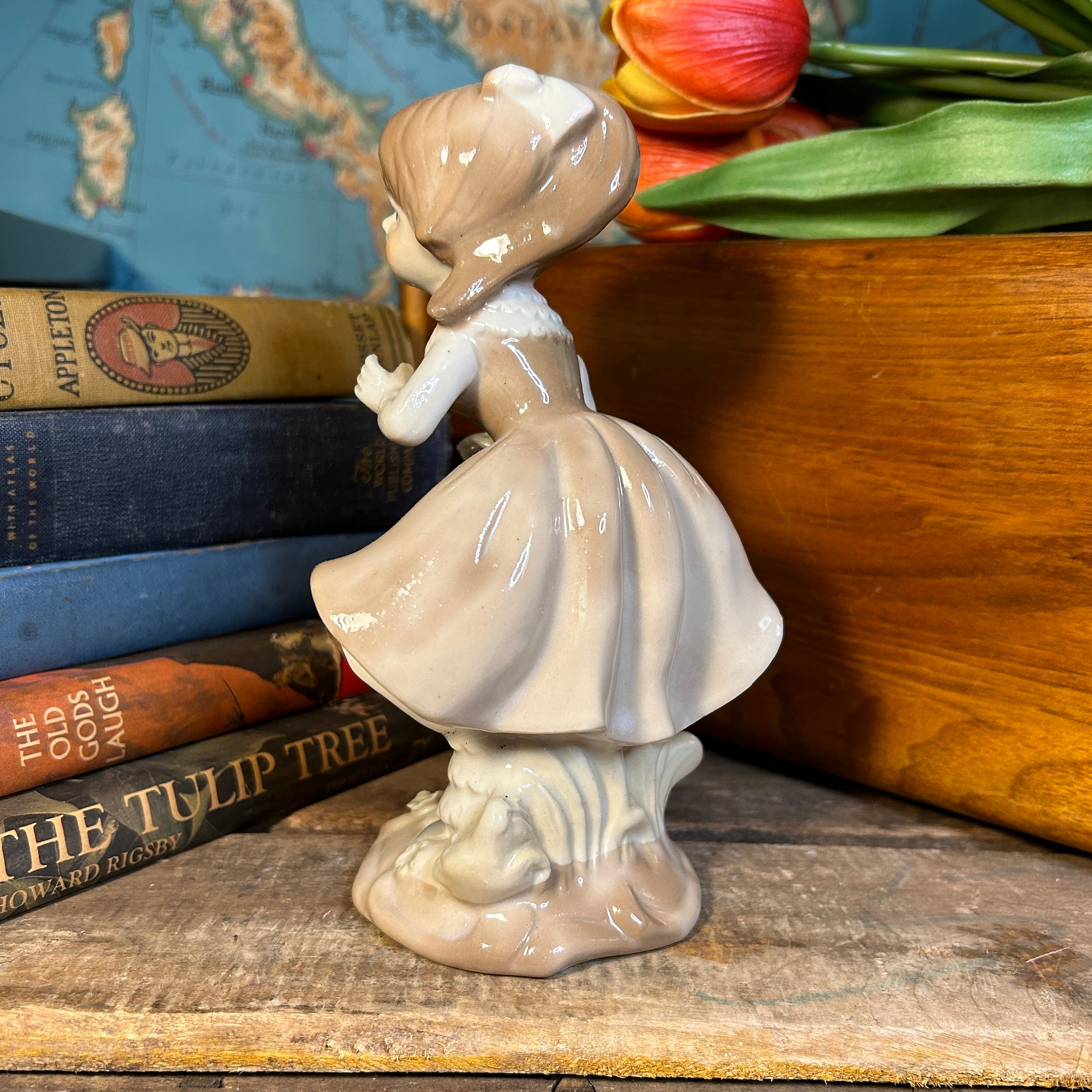 This sweet little girl with a ponytail holds a purse decorated with flowers and additional flowers on figure. She has no chips or cracks. I have included closeup photos of flowers. They do not look chipped to me, but please look at photos closely.