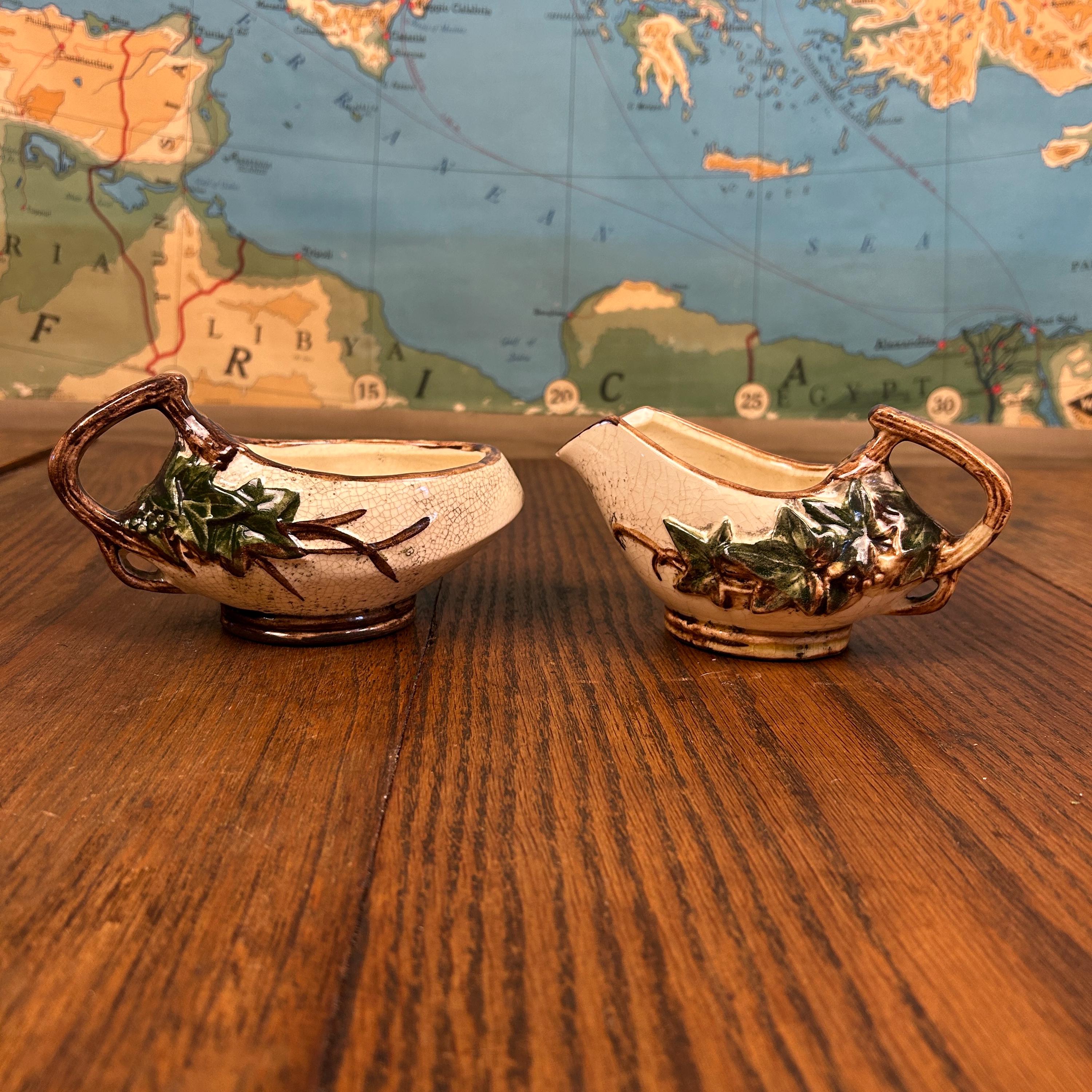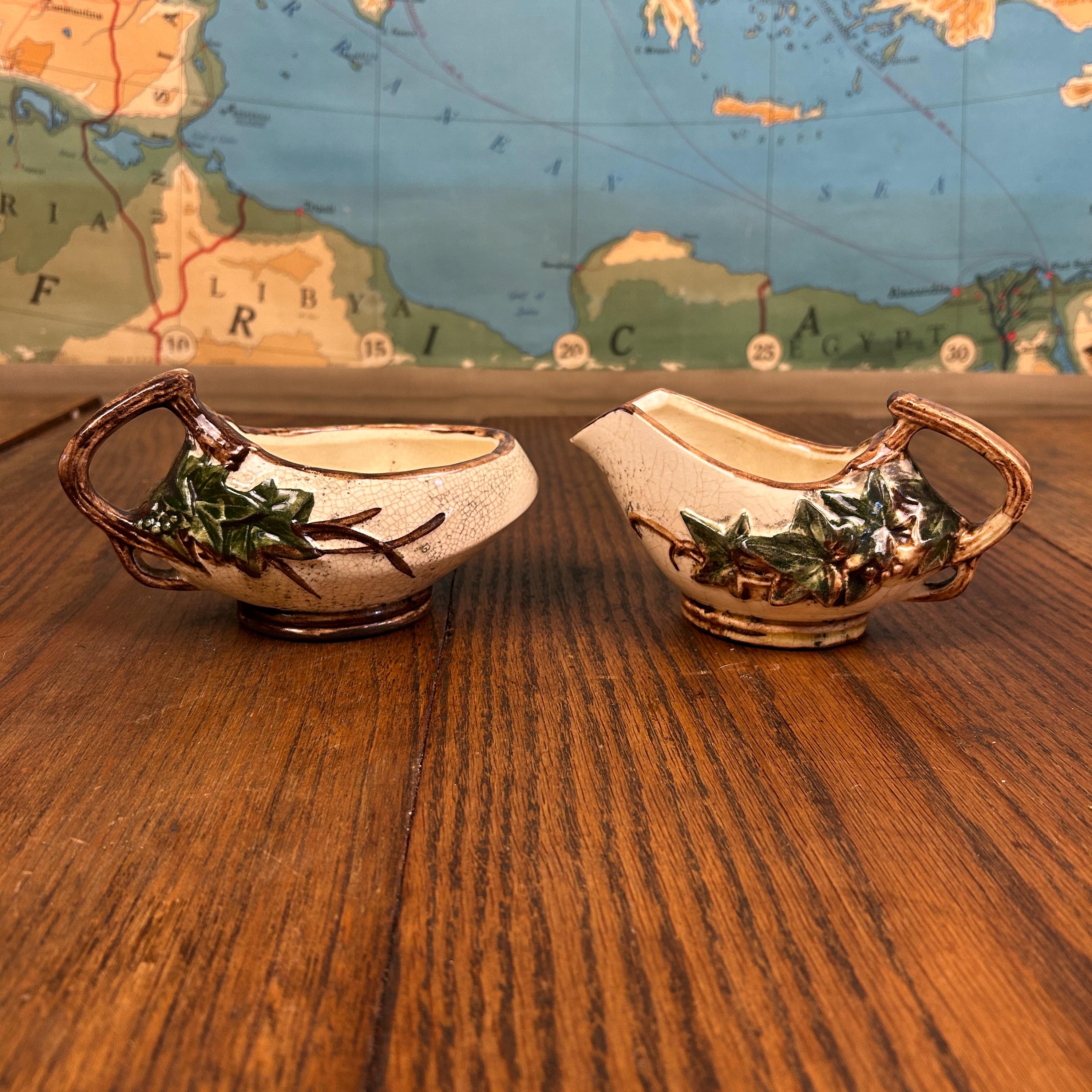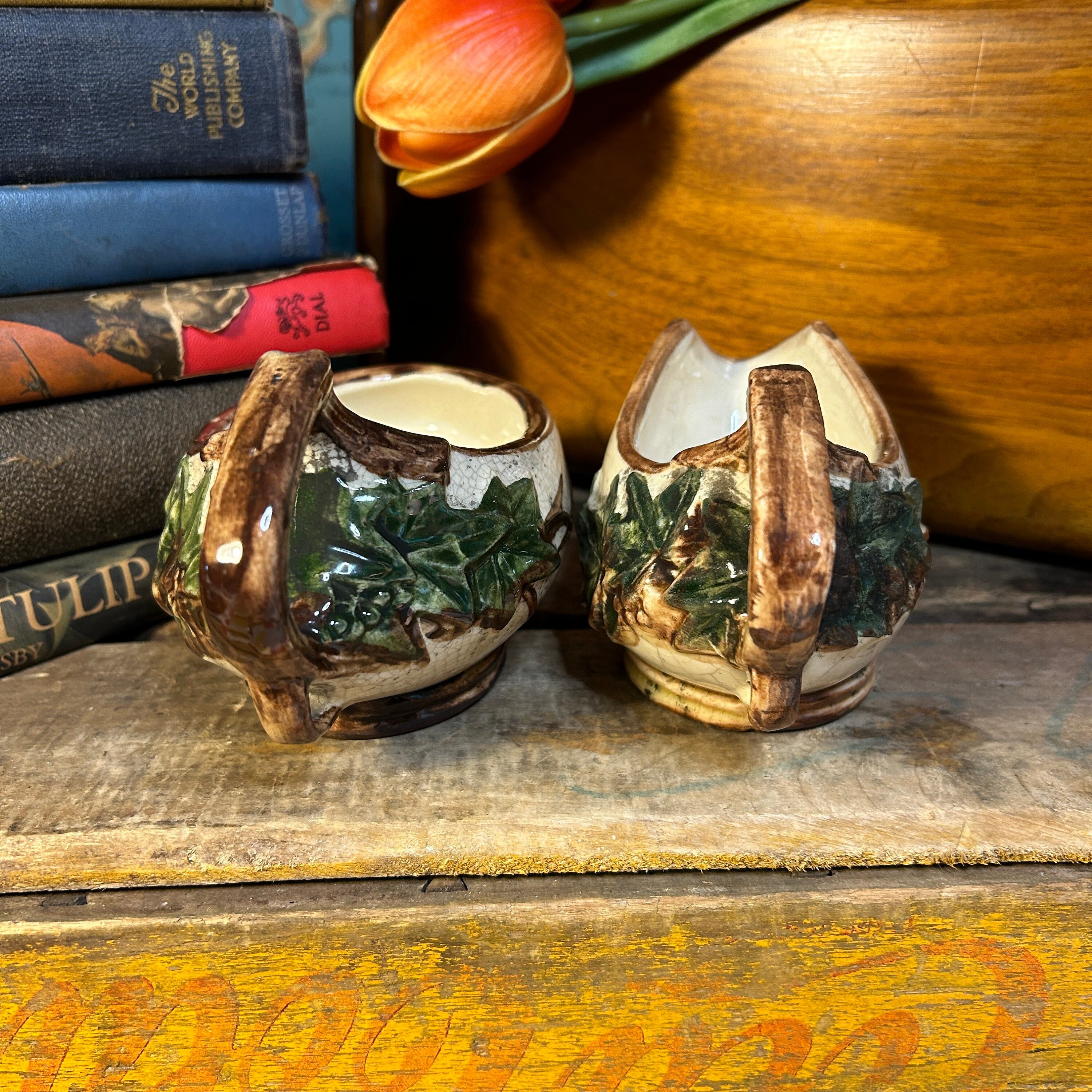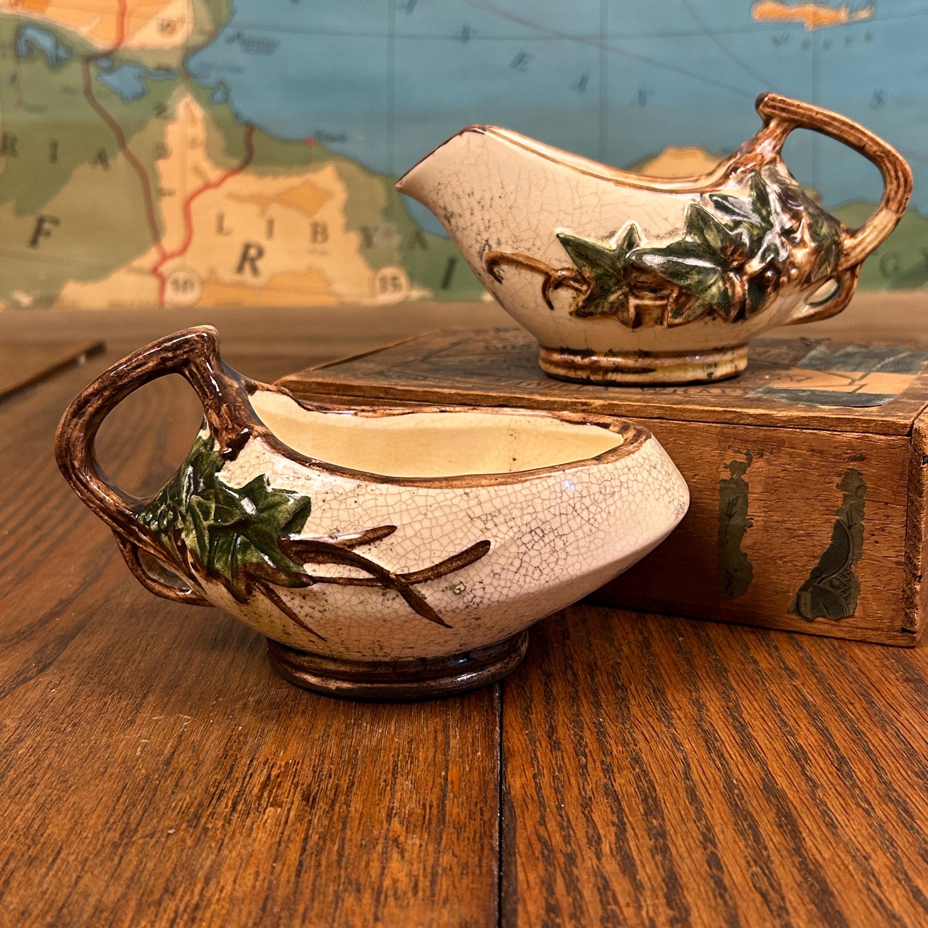 Light beige background with brown and green ivy on handles of creamer and open sugar bowl.