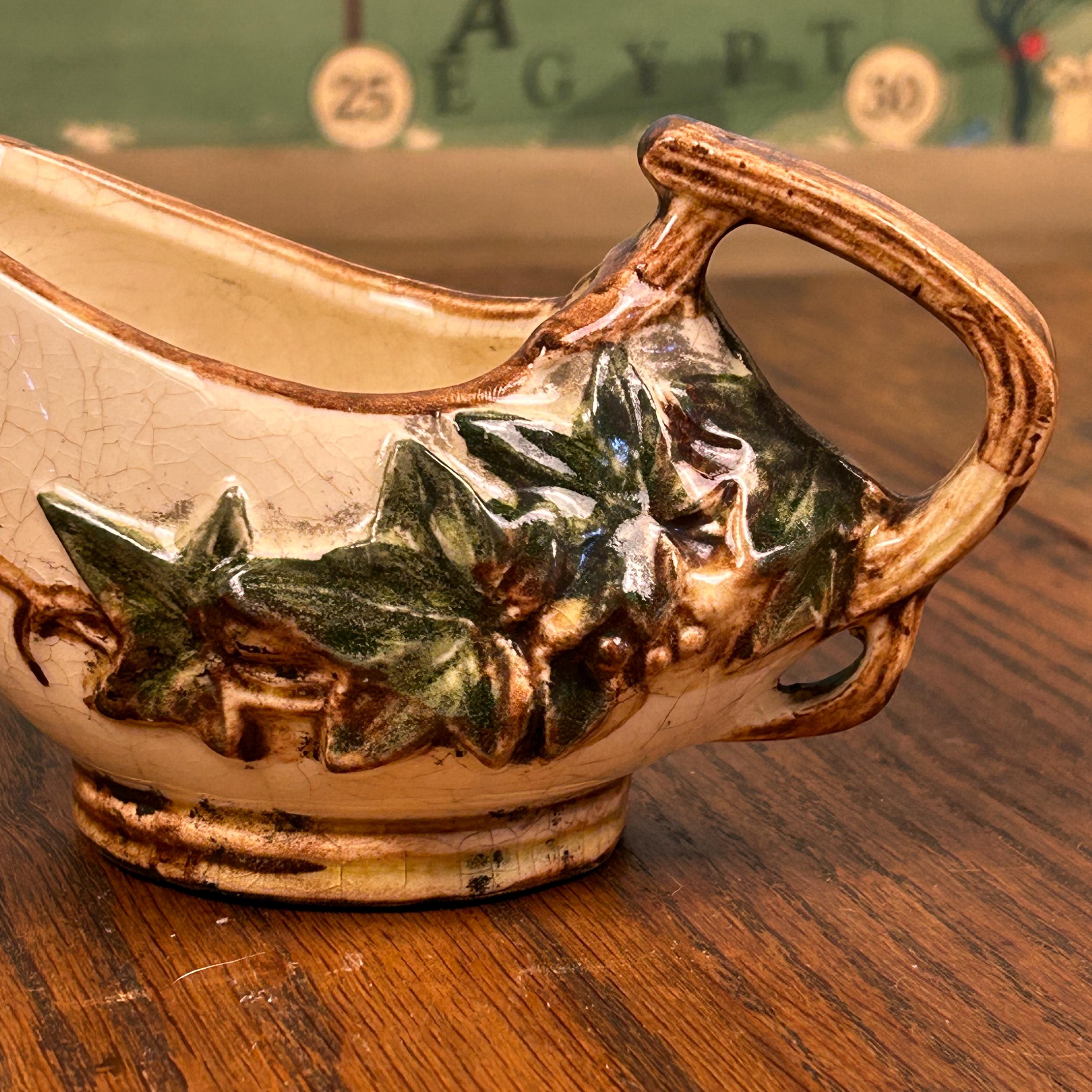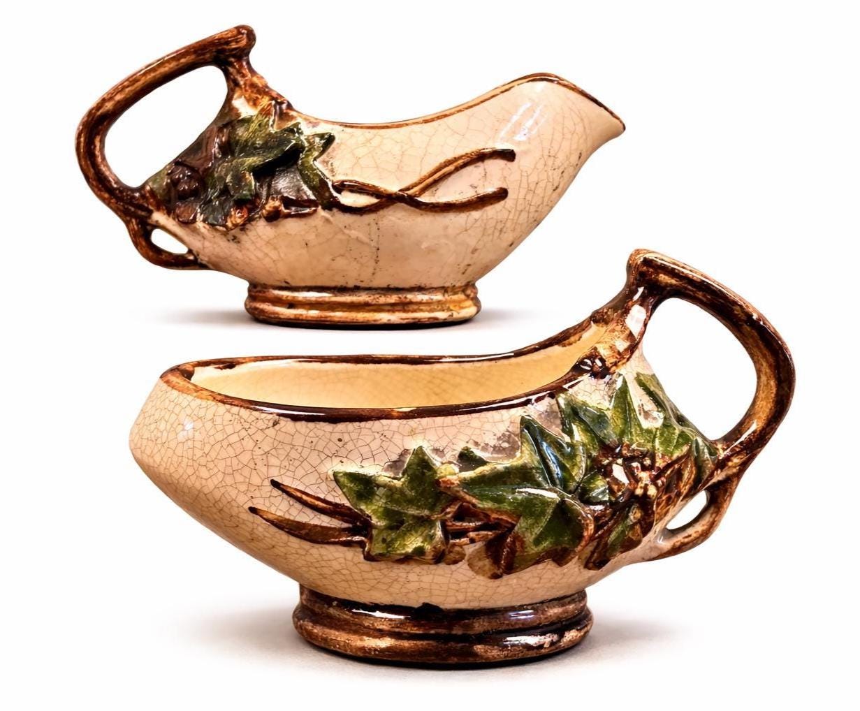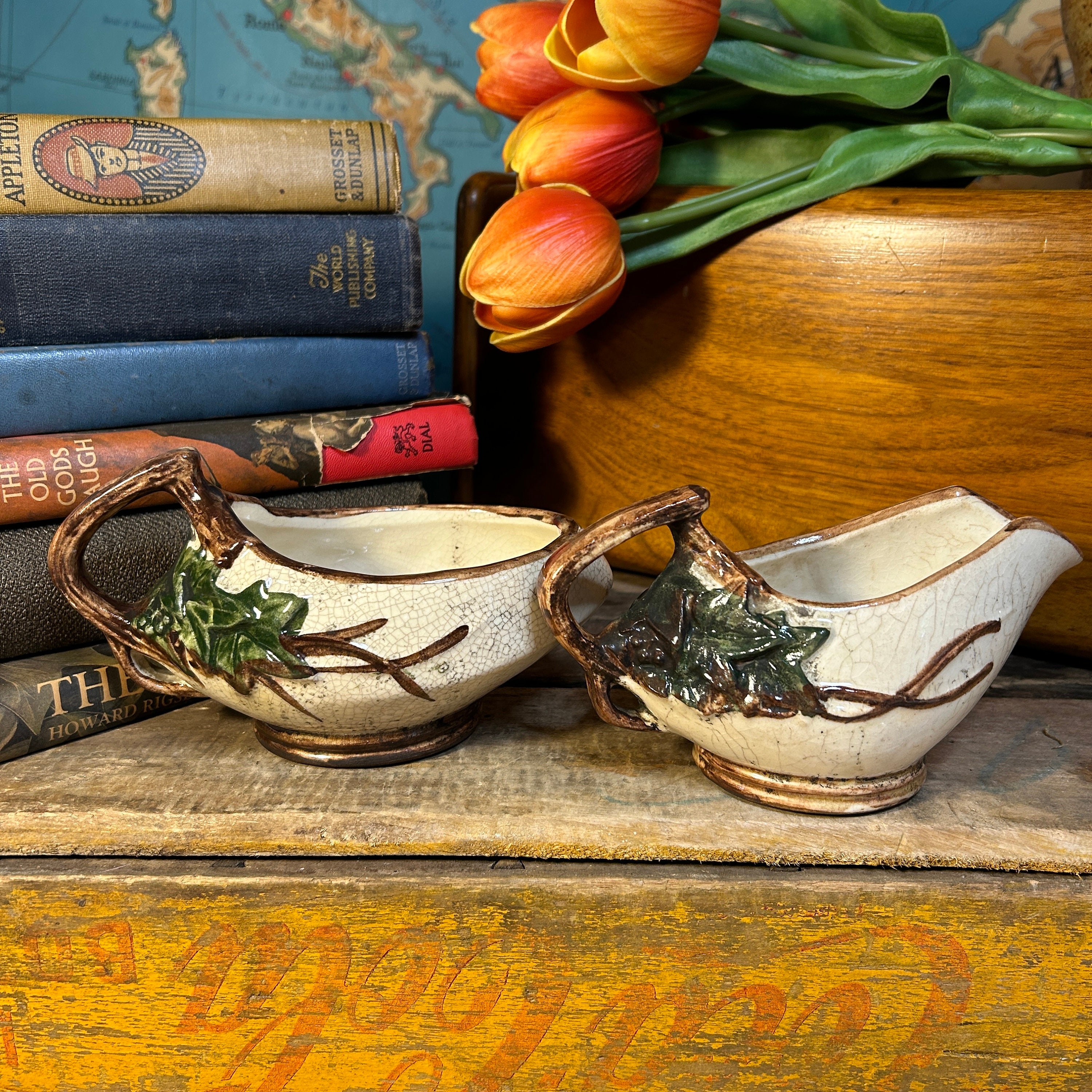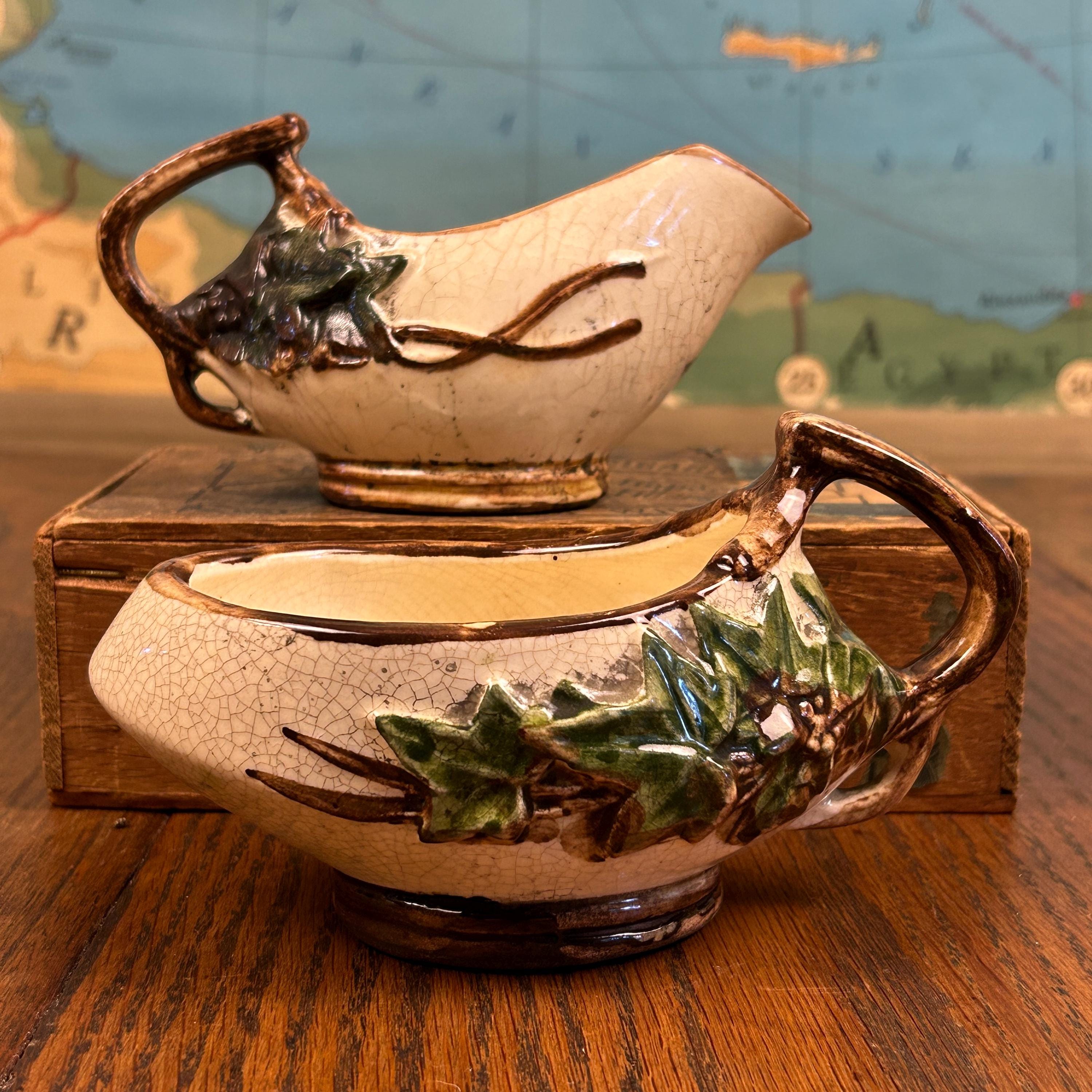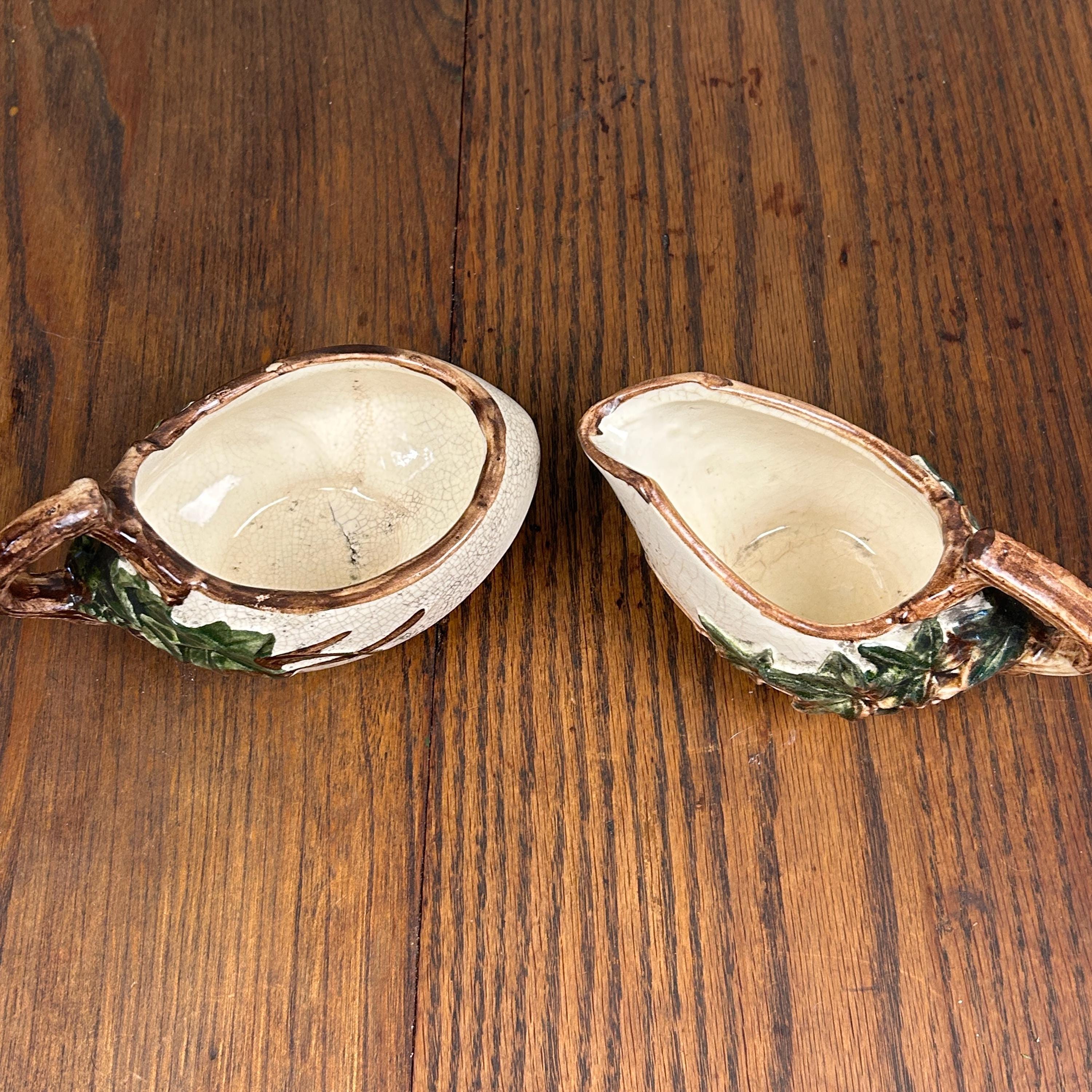 Light beige background with brown and green ivy on handles of creamer and open sugar bowl.