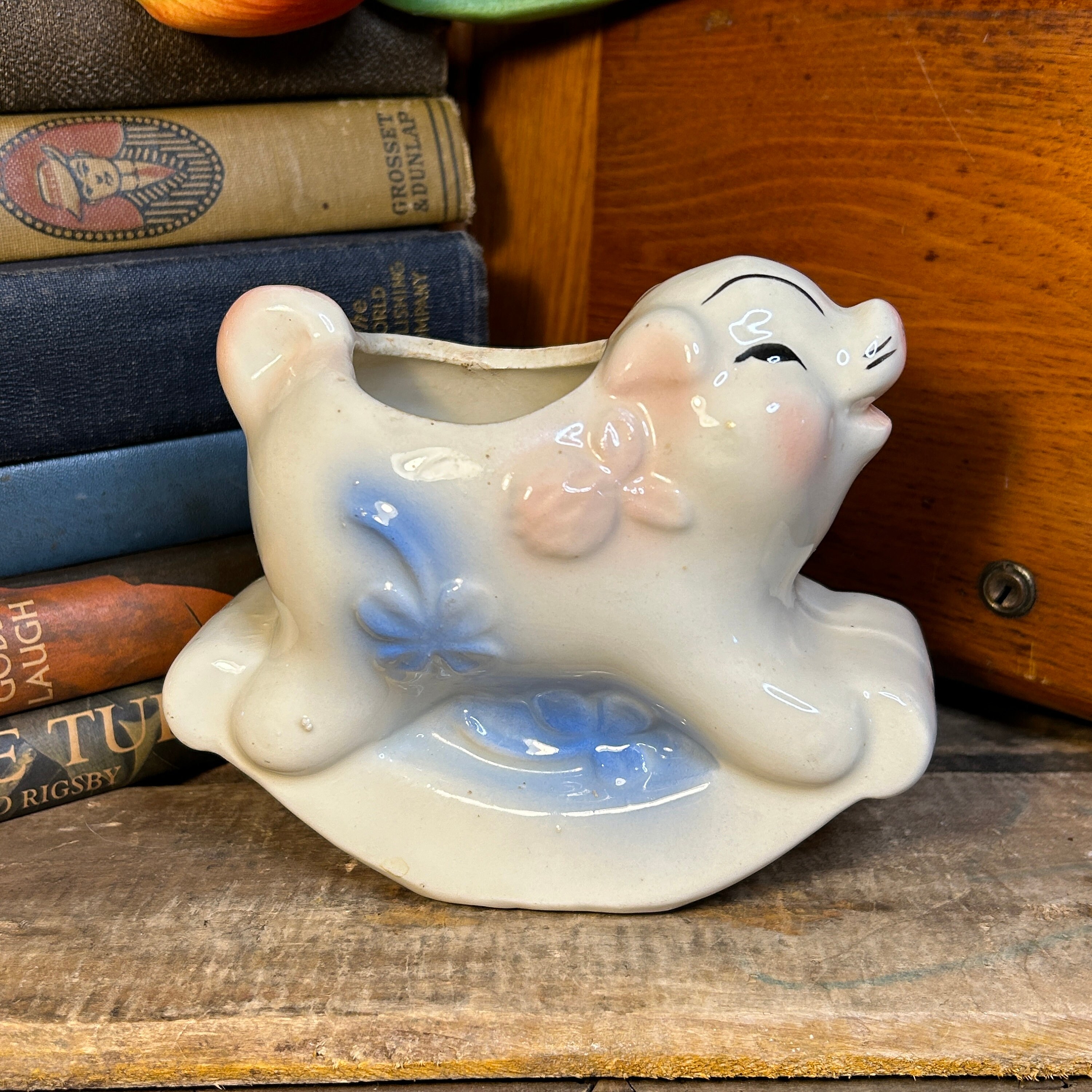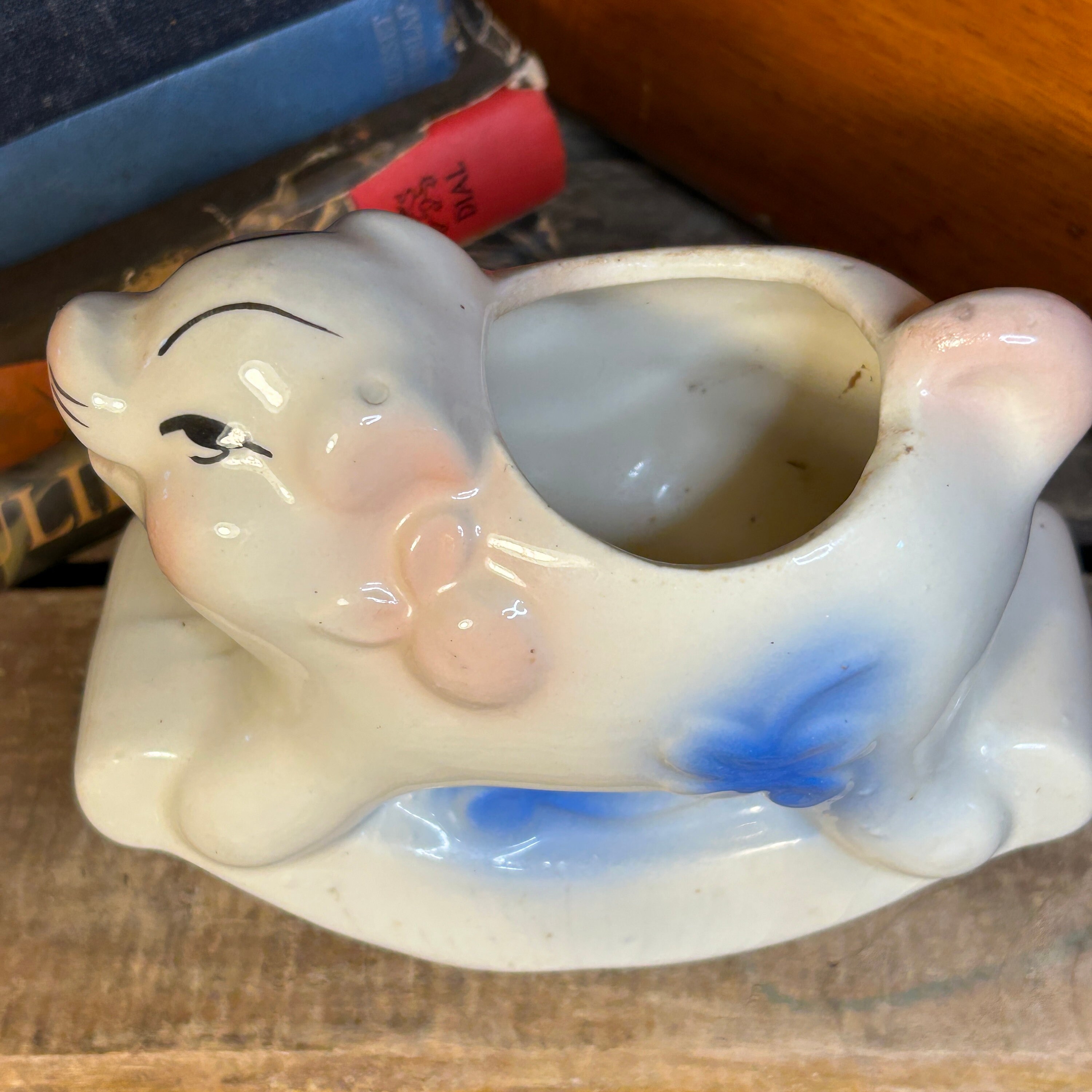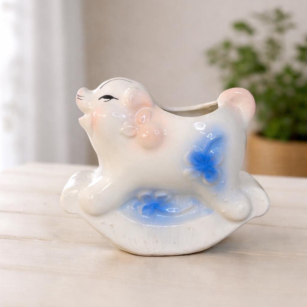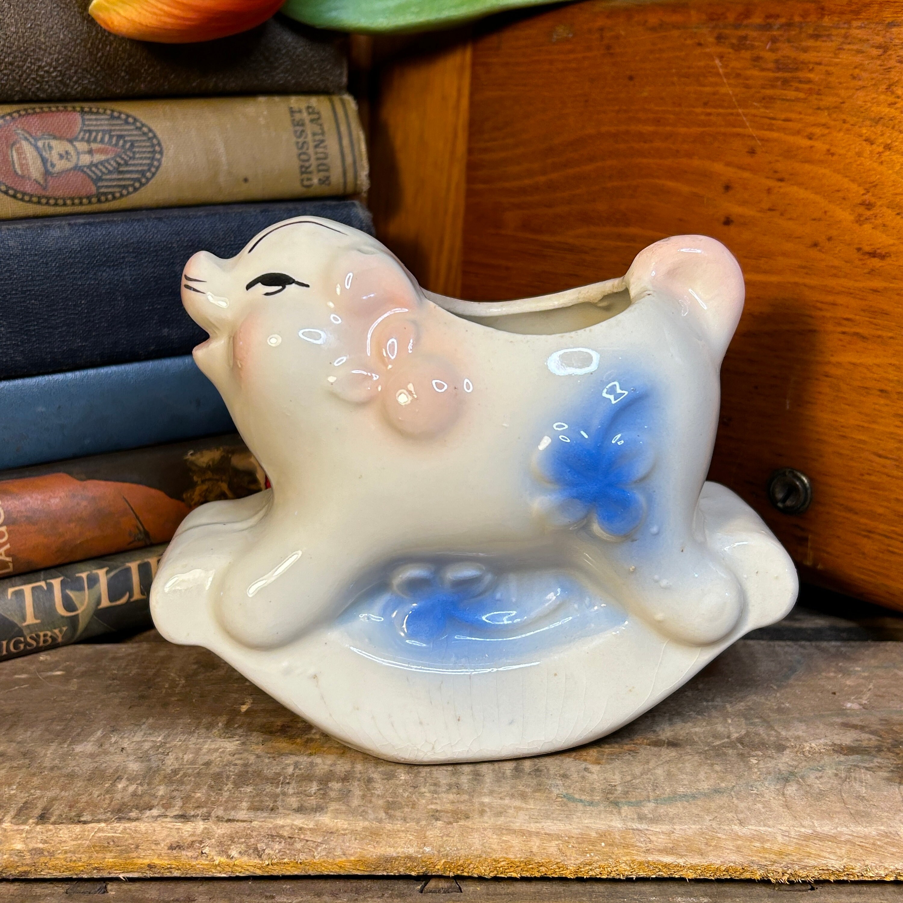 Cute pig rocker planter. Blue and pink accent colors. Big grin on it's face. Rocker is under it's feet. Pre-owned in good condition. USA Pottery. No chips or cracks. Light crazing. See photos closely.