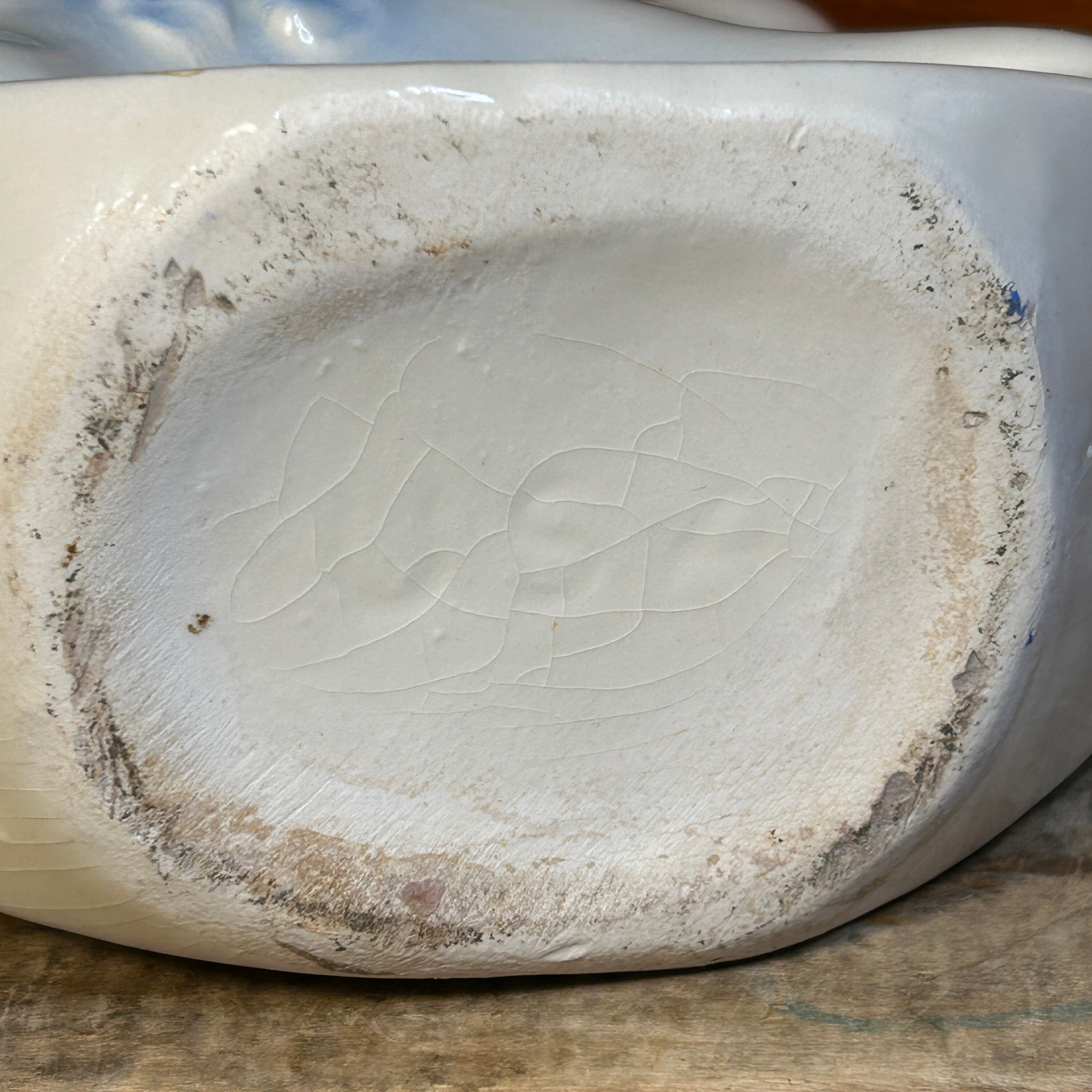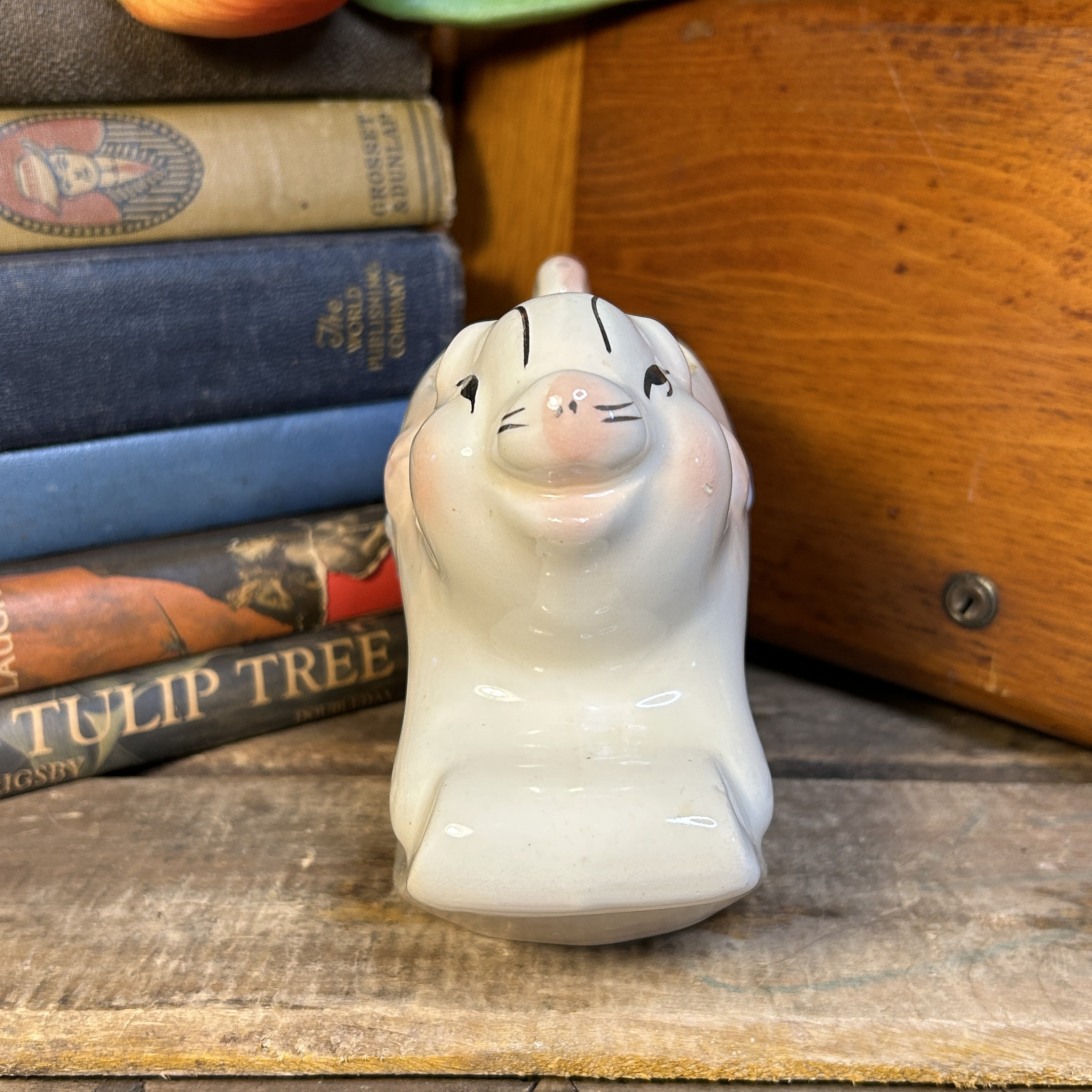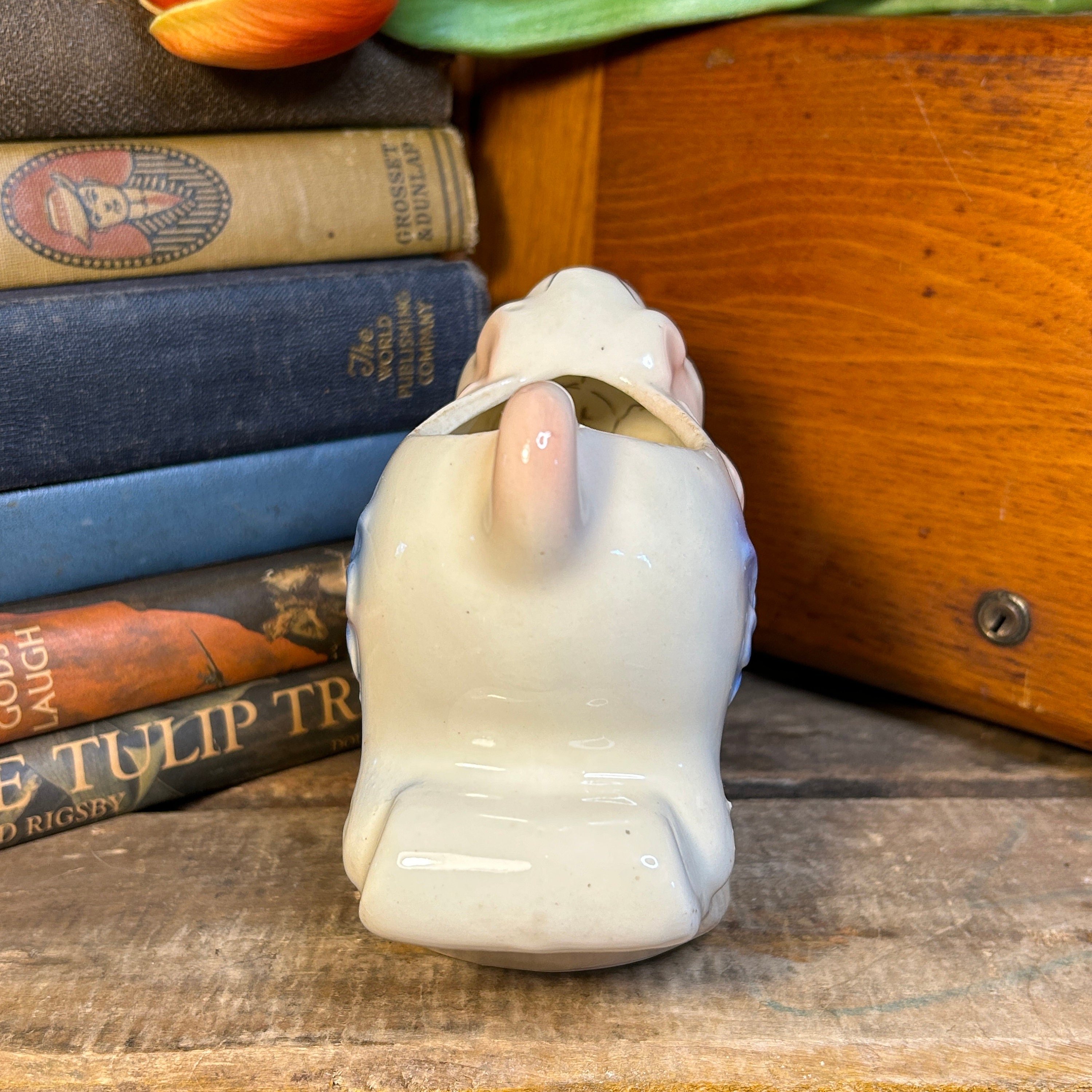 Cute pig rocker planter. Blue and pink accent colors. Big grin on it's face. Rocker is under it's feet. Pre-owned in good condition. USA Pottery. No chips or cracks. Light crazing. See photos closely.