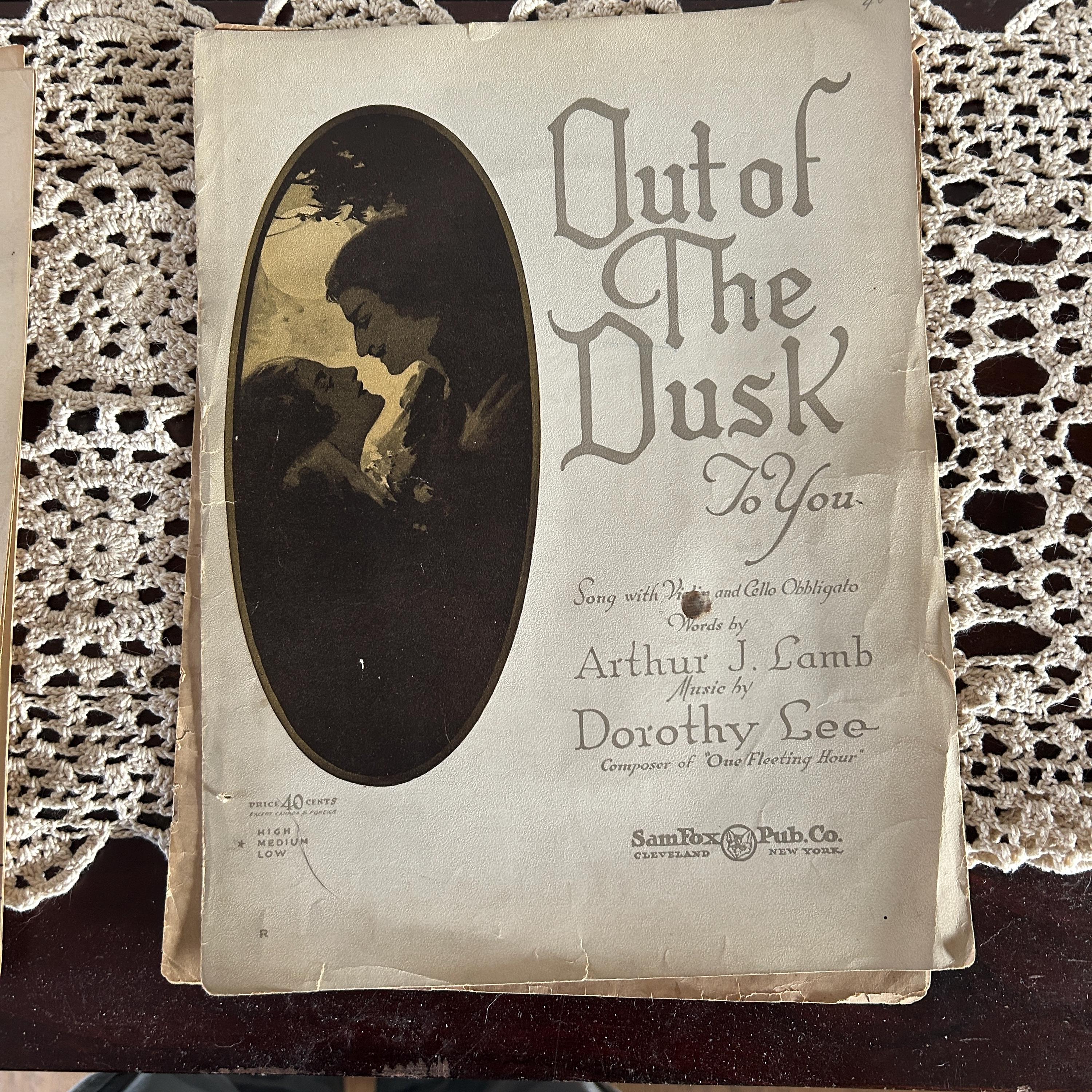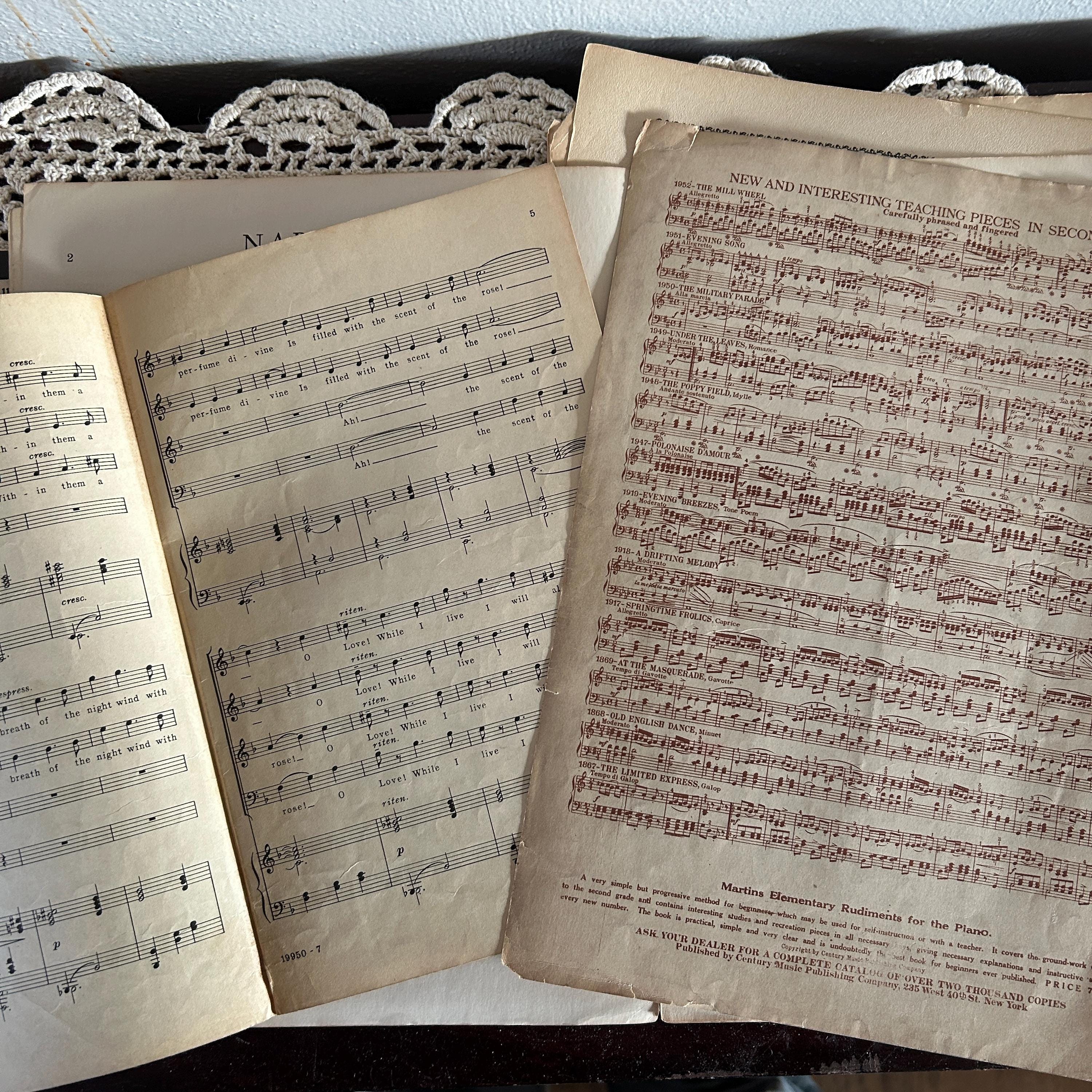 This is a set of 7 vintage sheet music ephemera. Most in good shape, Out of Dusk only contains the first page. The rest are complete. Would be lovely for journaling, art collage, scrapbooking. Beautiful artwork and colors. See photos. Dates are unknown, but are old! This is Set 1. There are several more available!