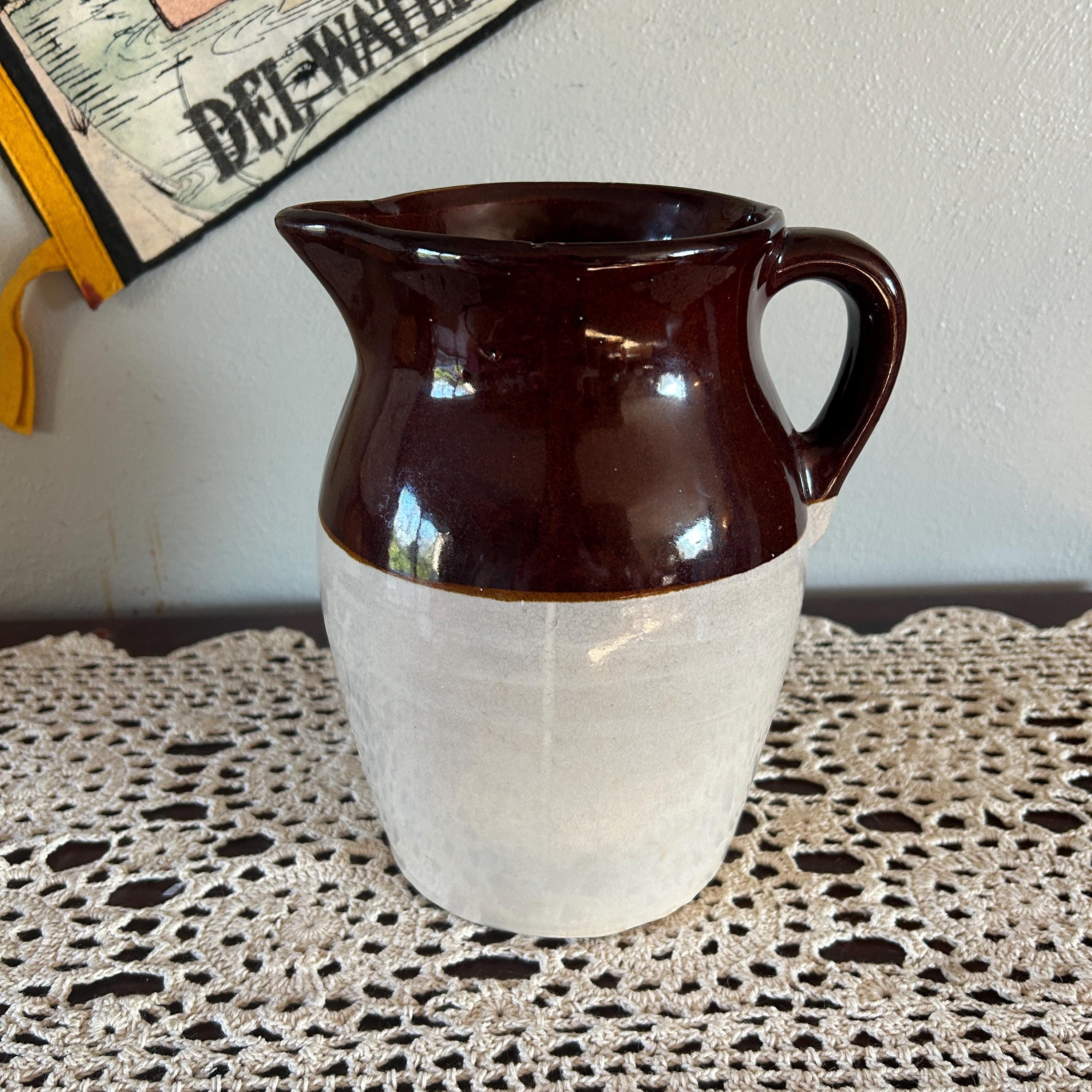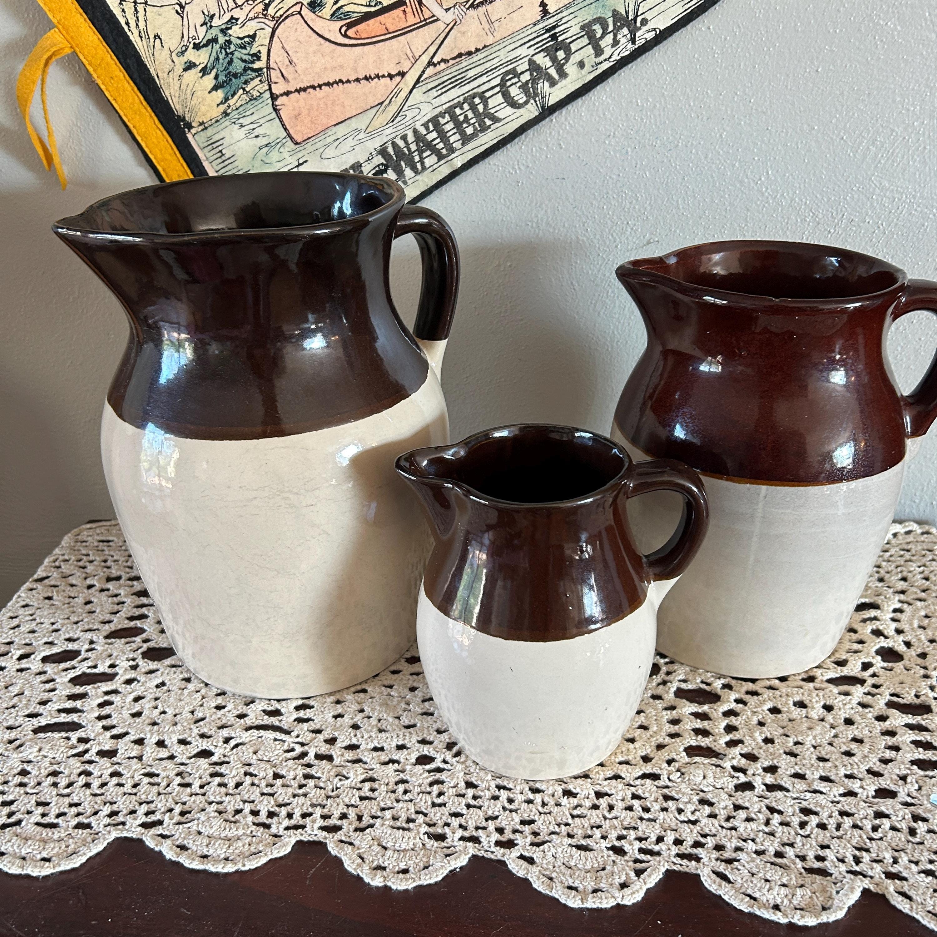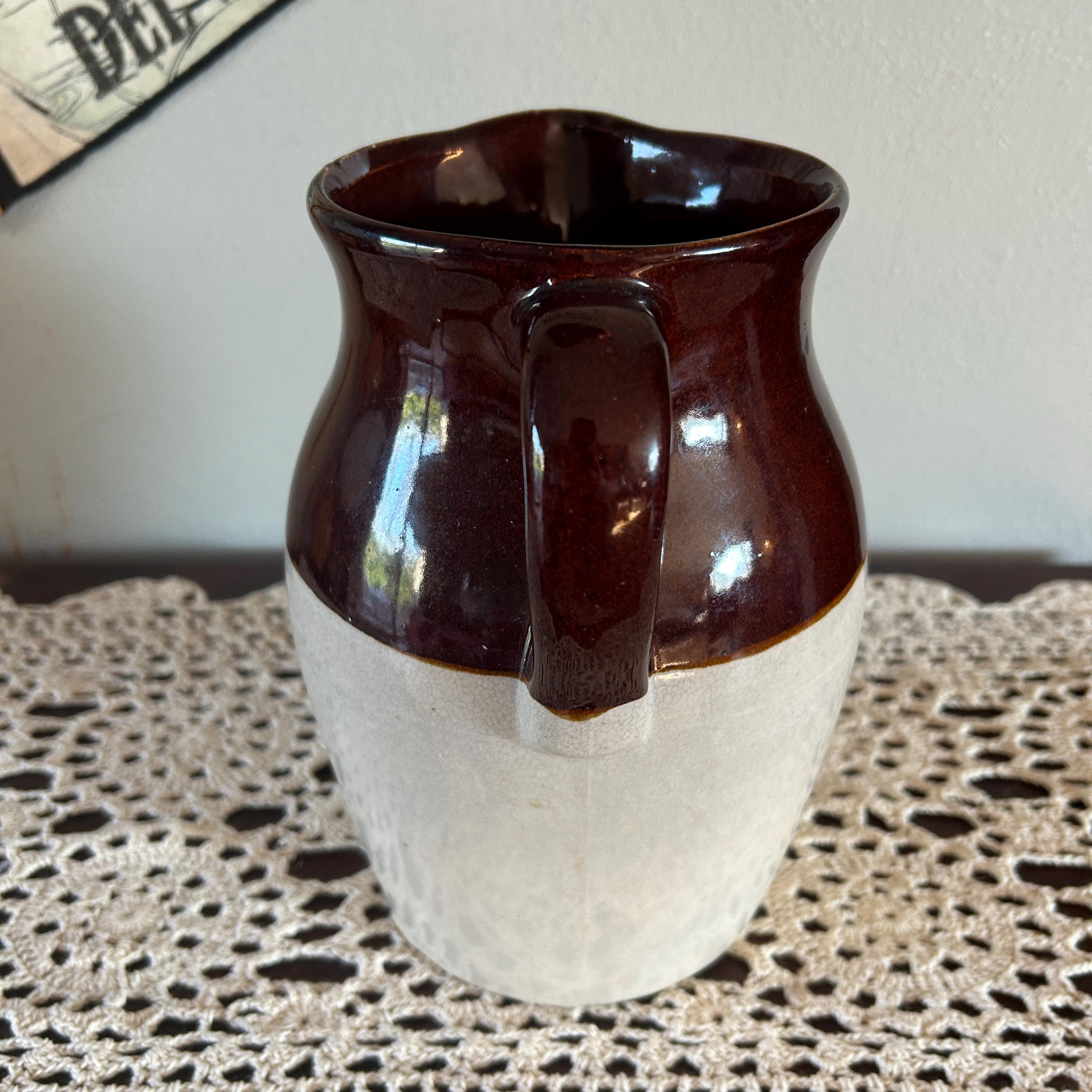 Vintage 8.5 in. USA Pottery Stoneware Milk Pitcher Brown Tan. No chips or cracks or crazing. Shows some minor wear on mouth of jug.