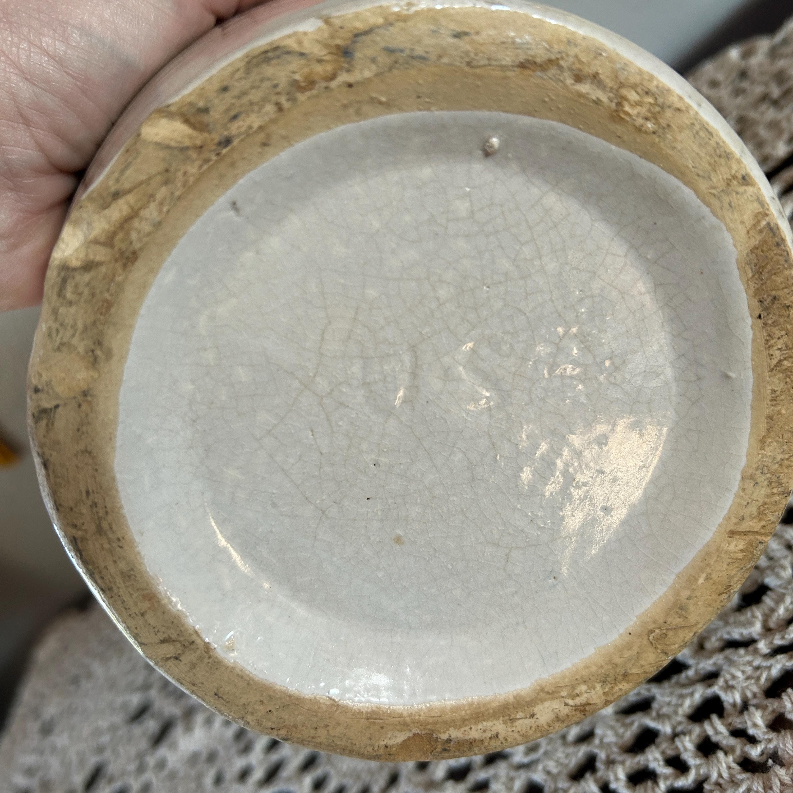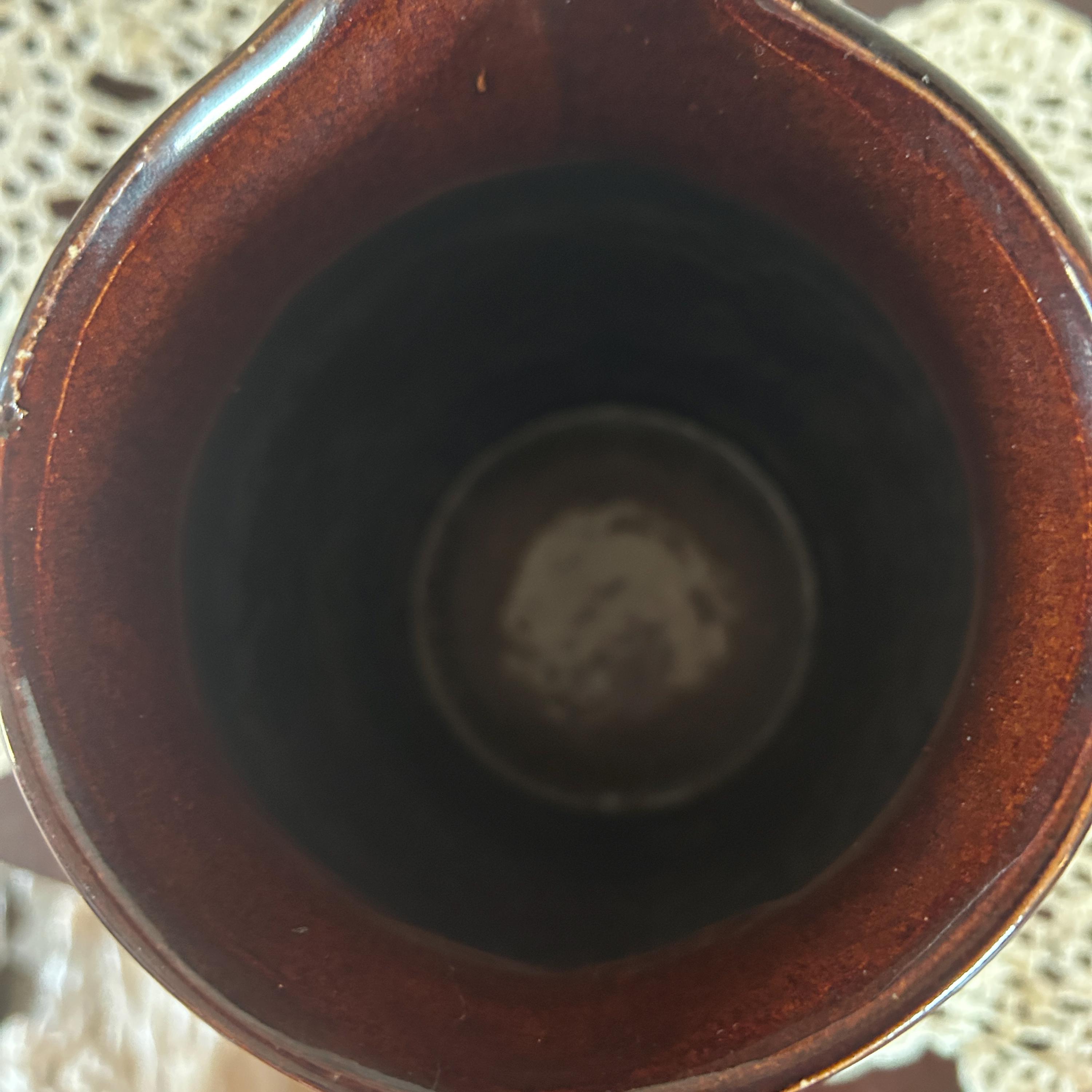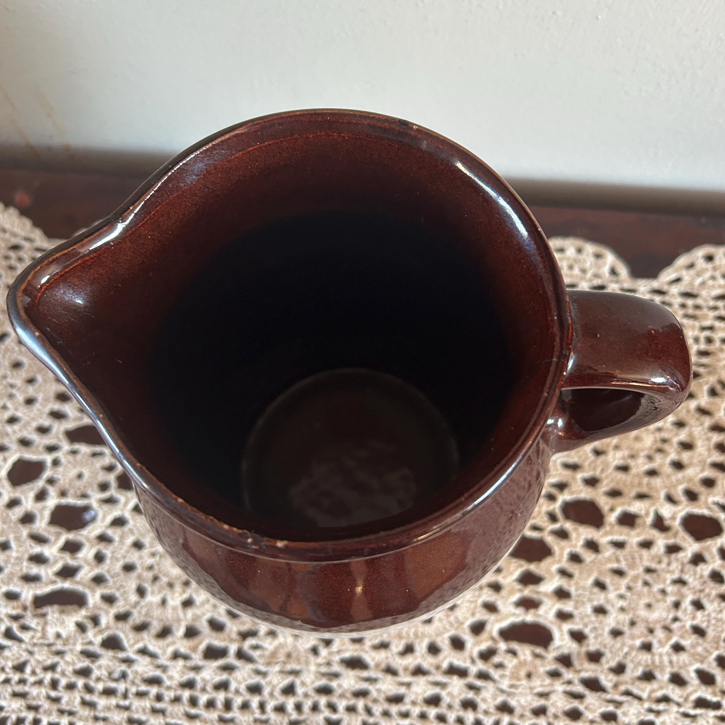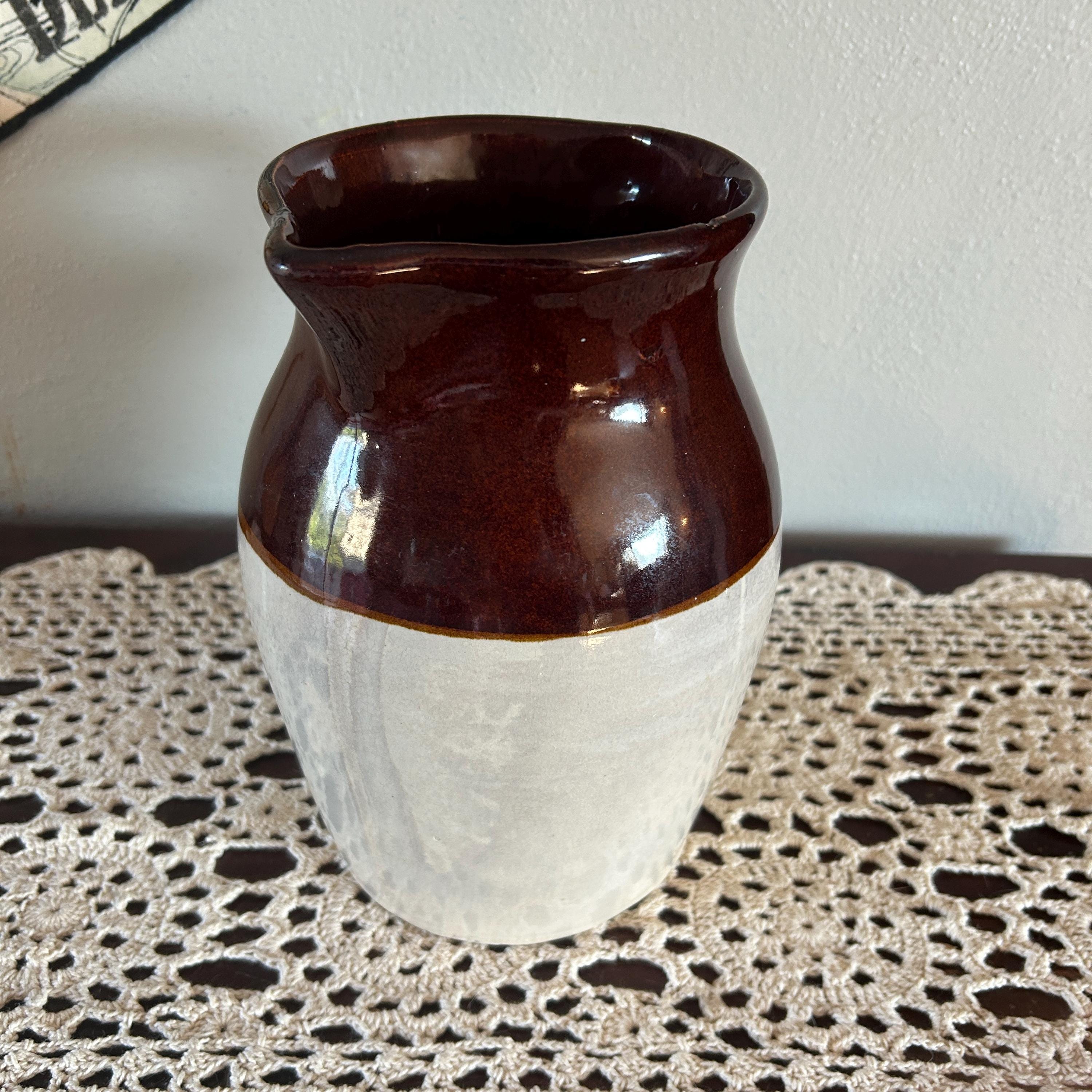 Vintage 8.5 in. USA Pottery Stoneware Milk Pitcher Brown Tan. No chips or cracks or crazing. Shows some minor wear on mouth of jug.