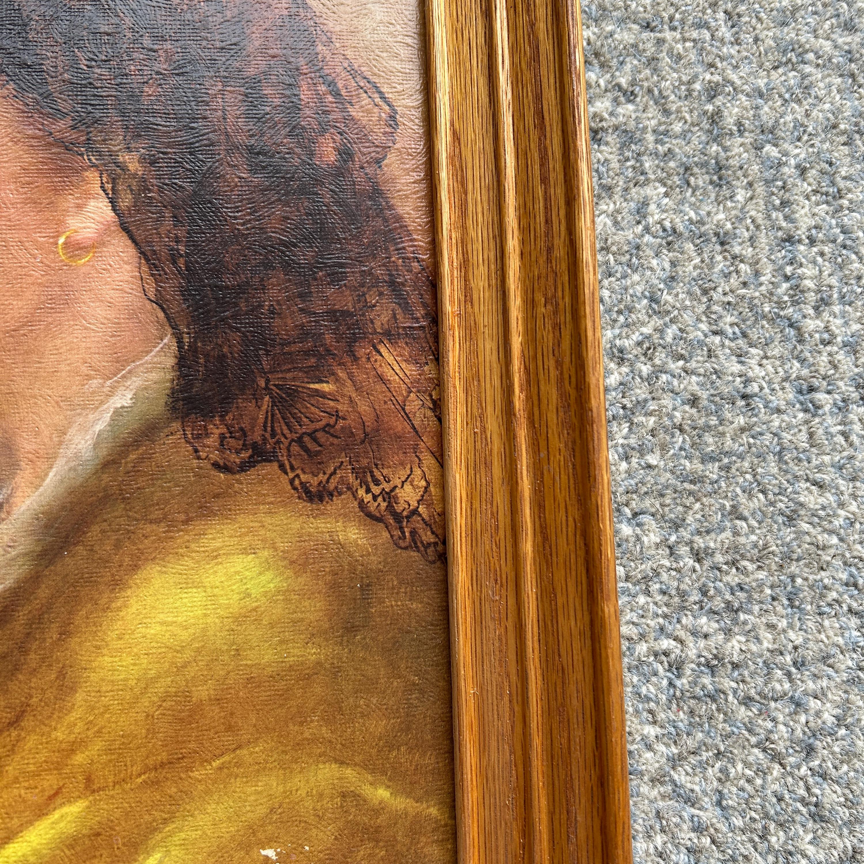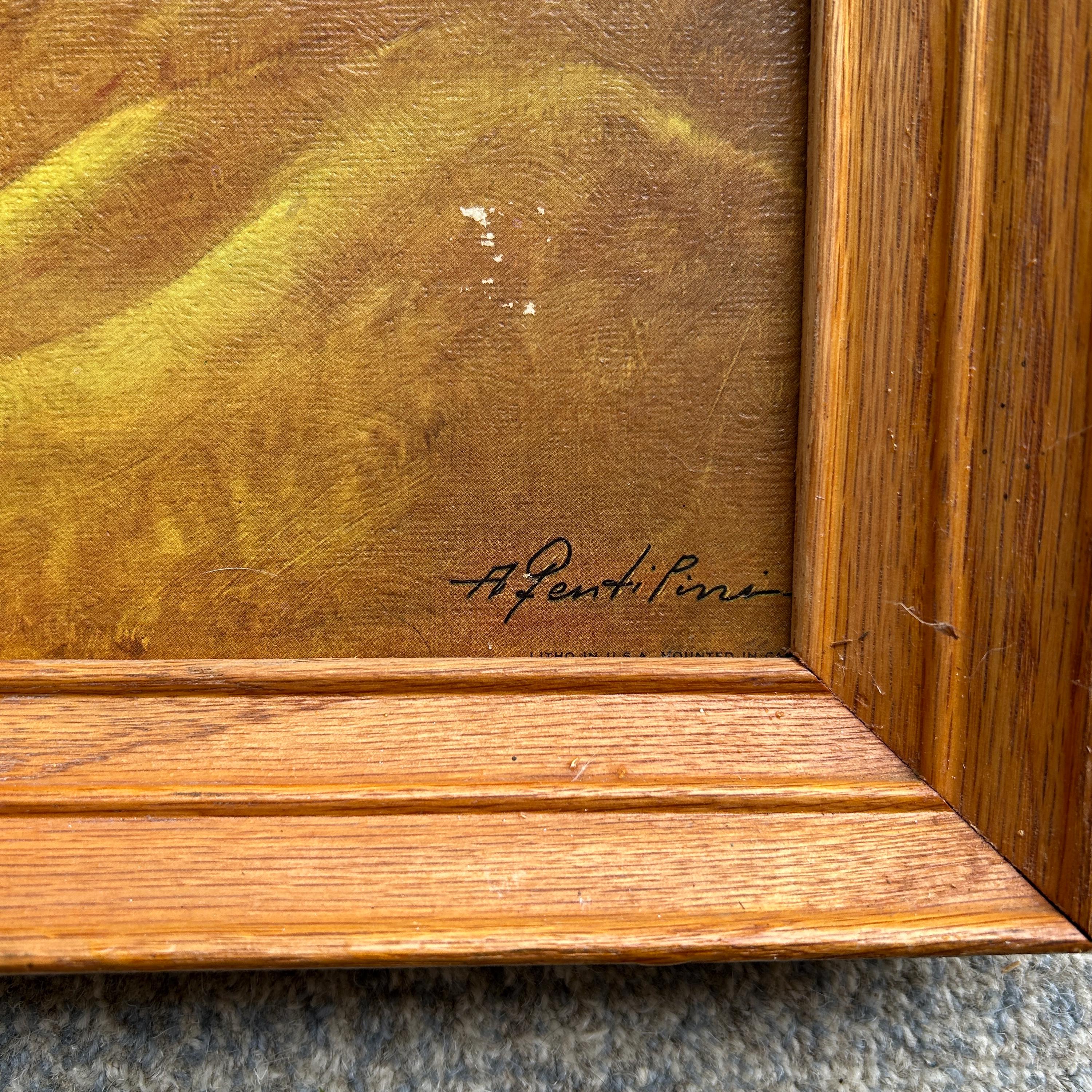 In vintage condition - please see all photos. There appears to be one scuff on the front of the painting. The frame and print are sturdy and solid. No staining.