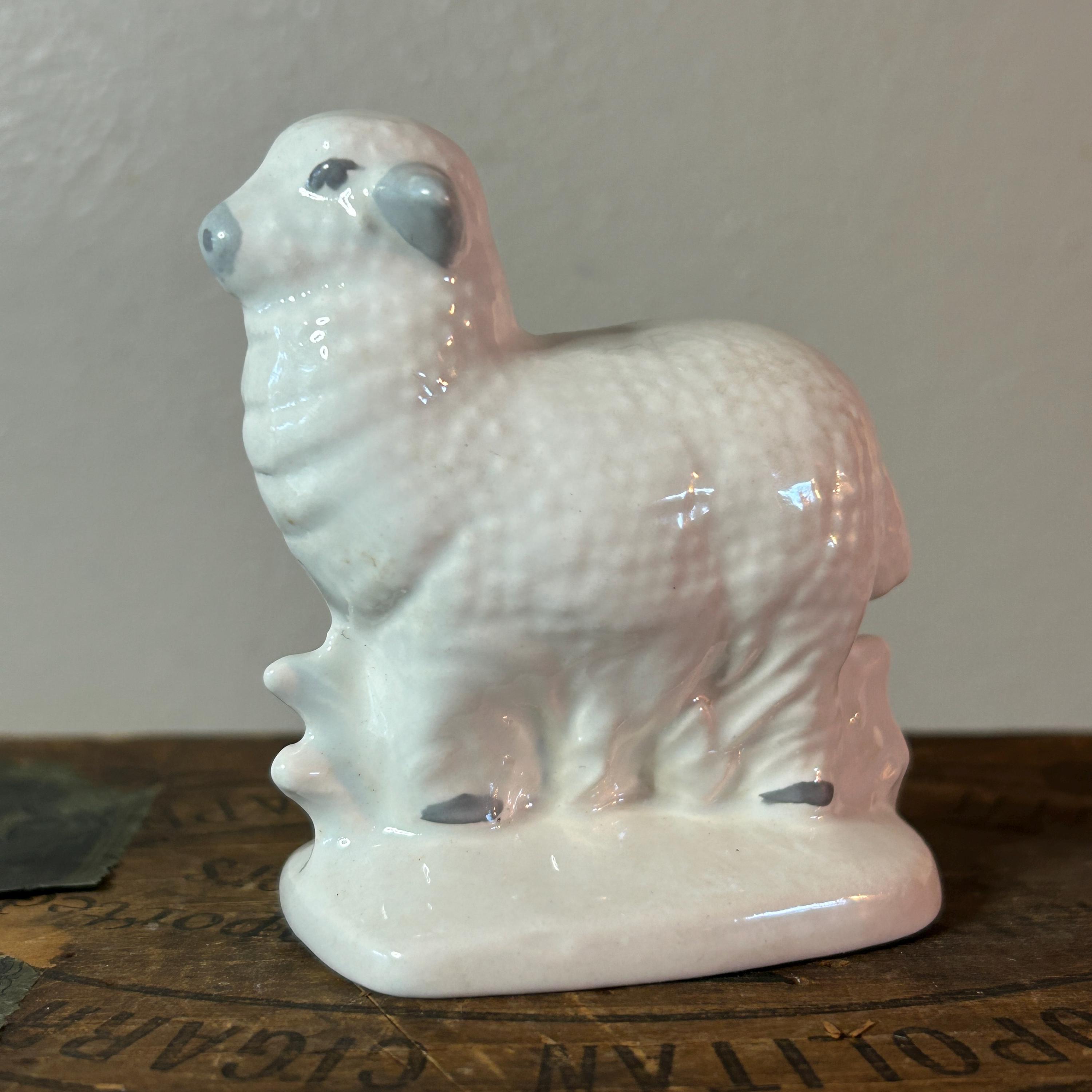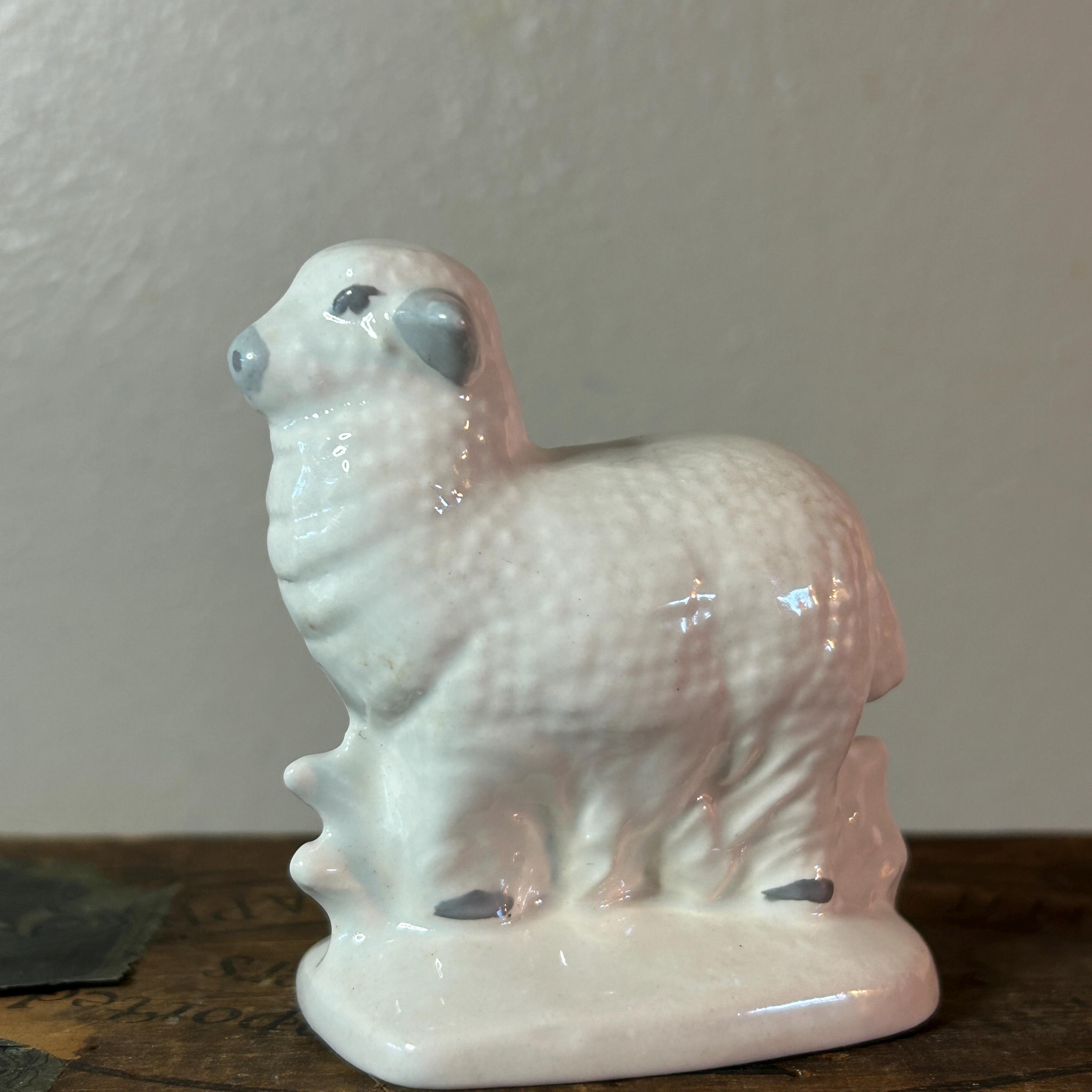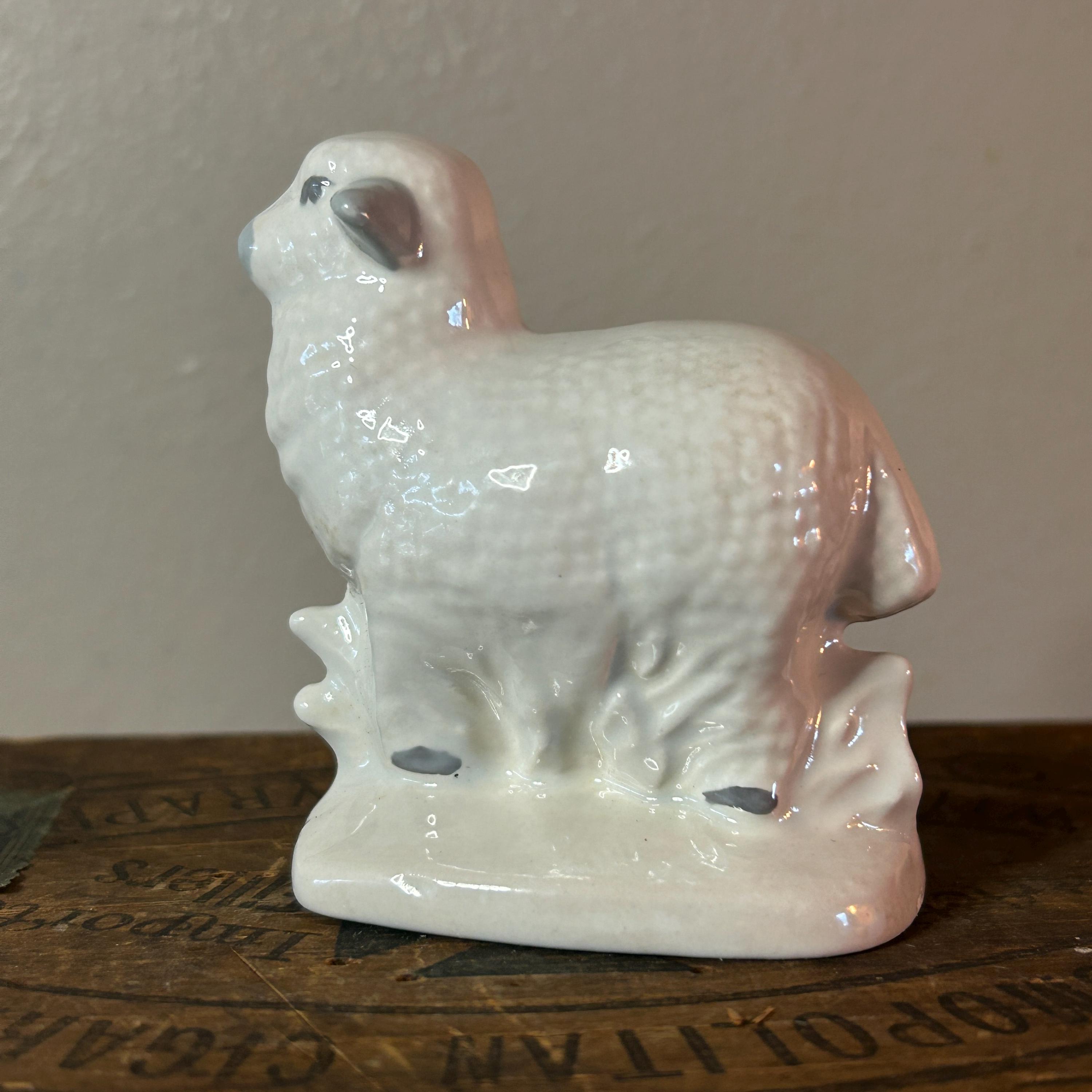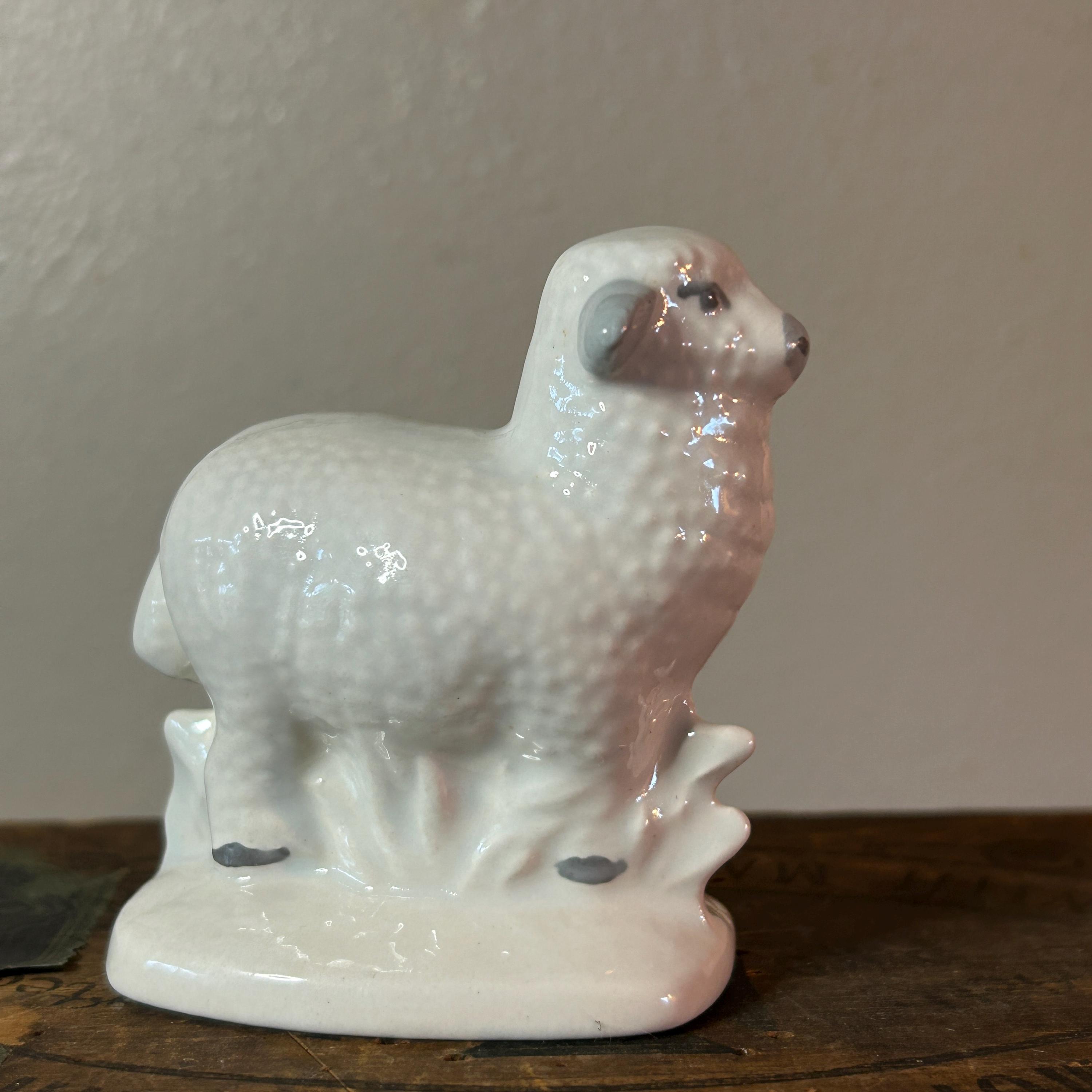This sweet lamb is handpainted and glazed. It appears to be standing next to a fence. In excellent condition with no cracks or chips or crazing. Unmarked, but may have been a part of Vintage Byron Mold Nativity Set Scene. Measures 3" x 2.75".