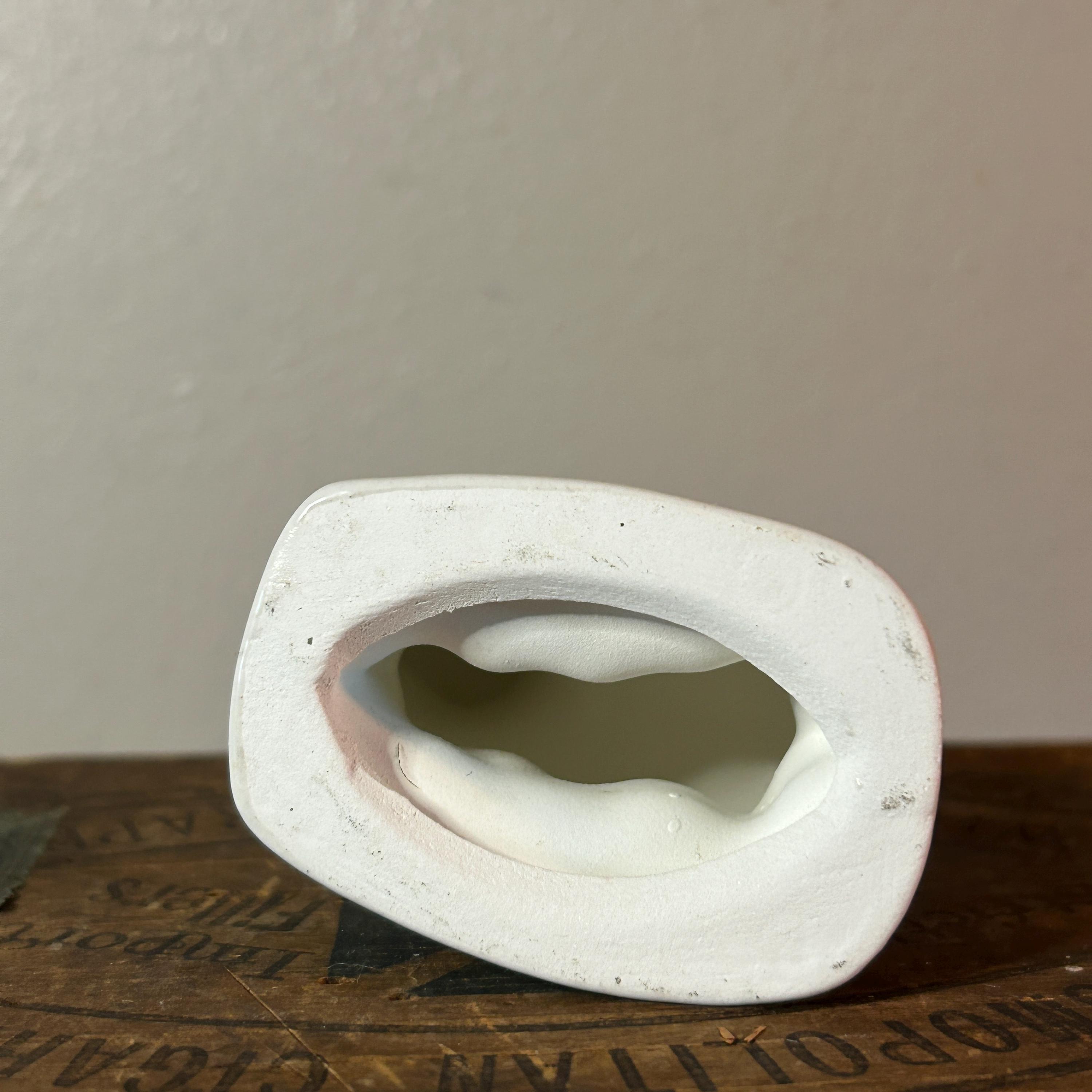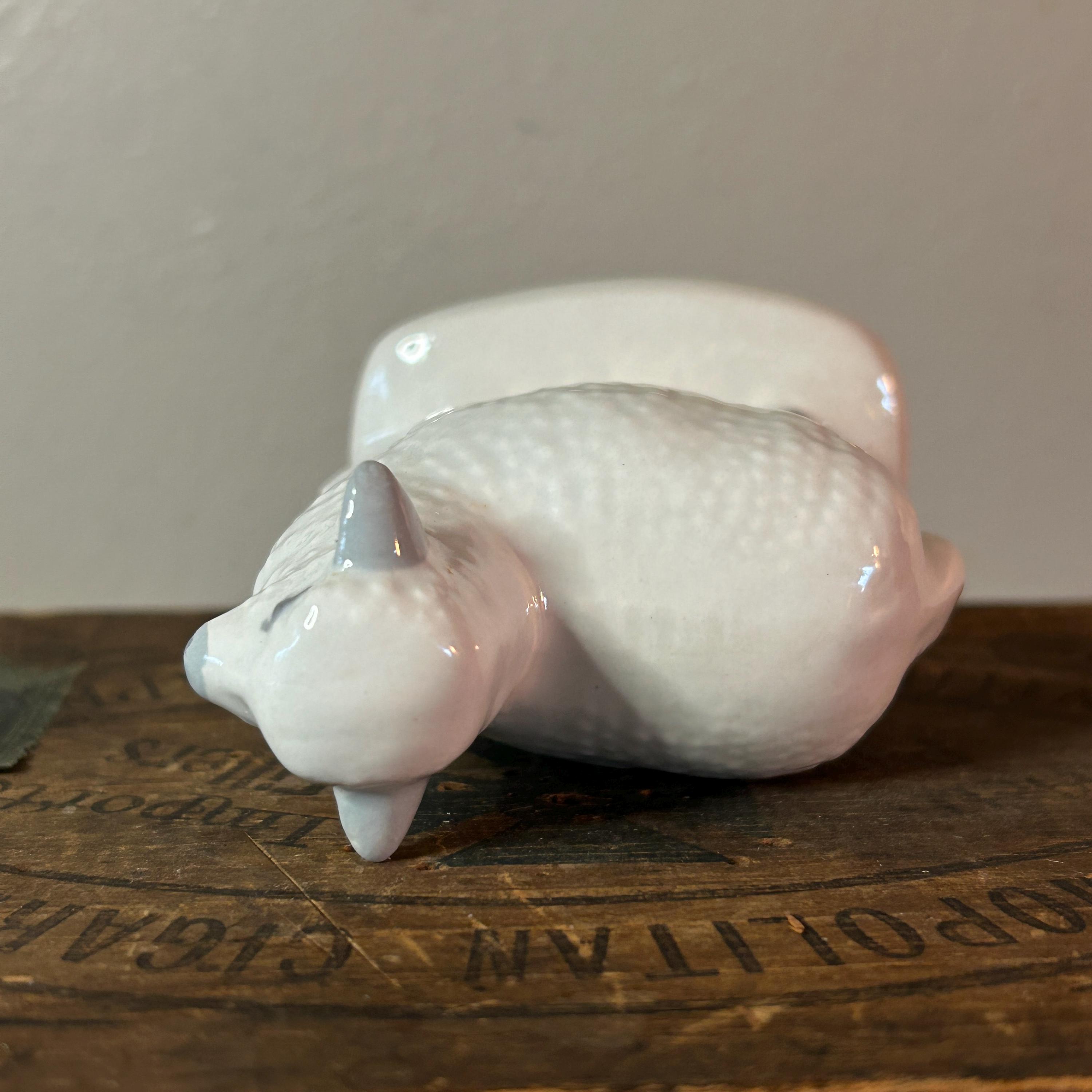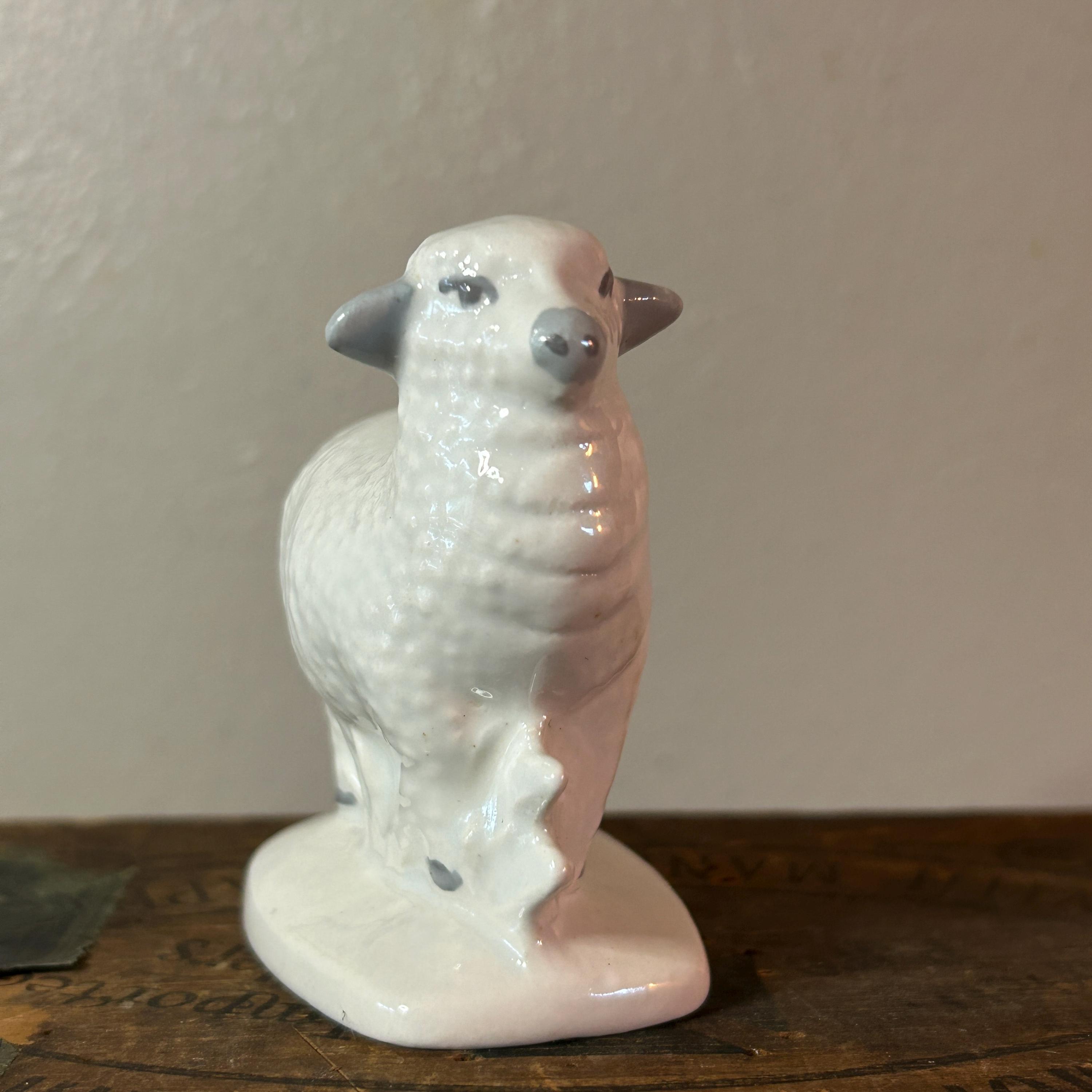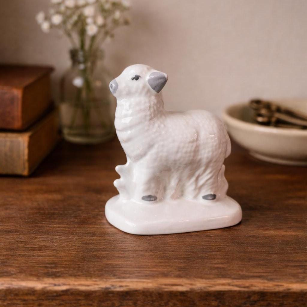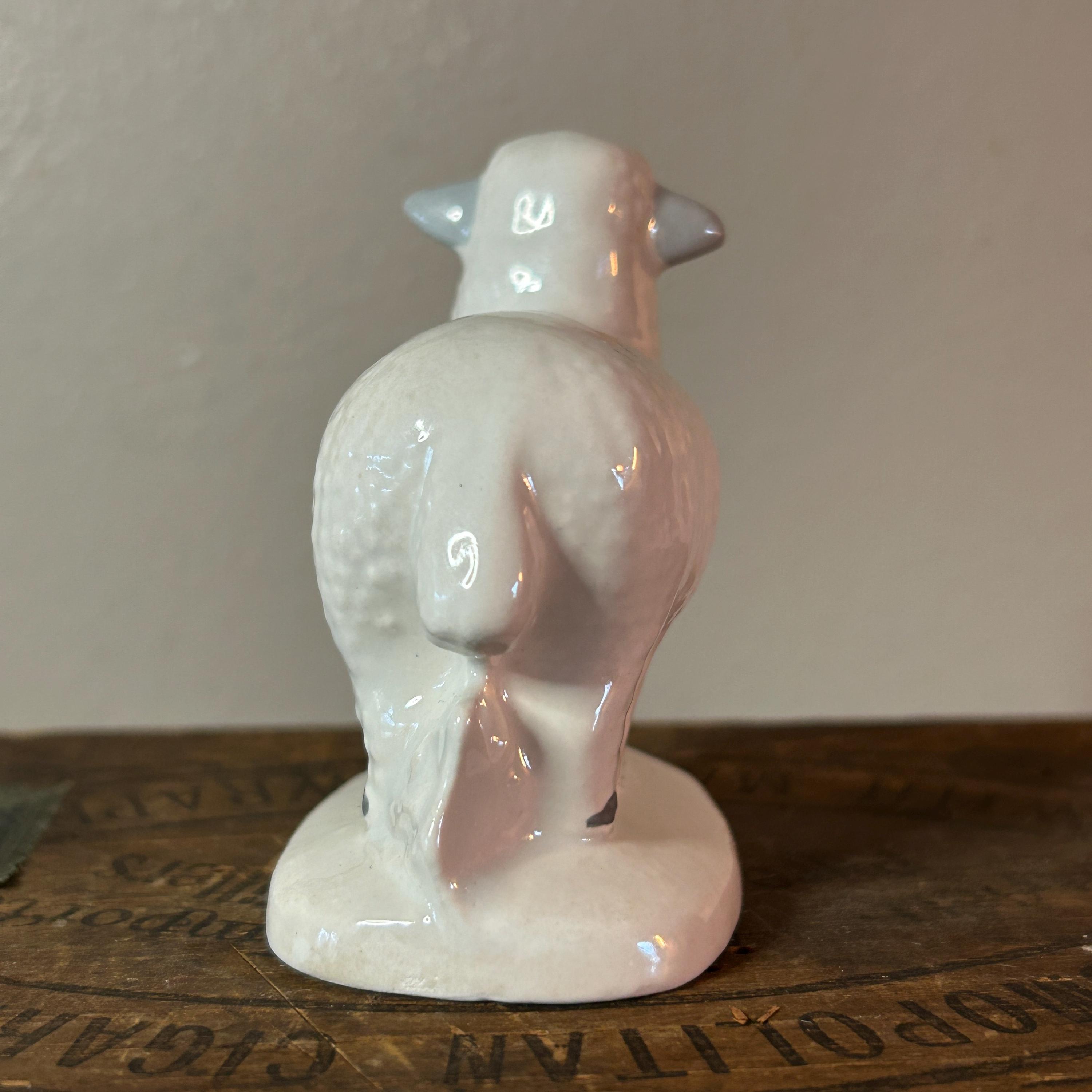 This sweet lamb is handpainted and glazed. It appears to be standing next to a fence. In excellent condition with no cracks or chips or crazing. Unmarked, but may have been a part of Vintage Byron Mold Nativity Set Scene. Measures 3" x 2.75".