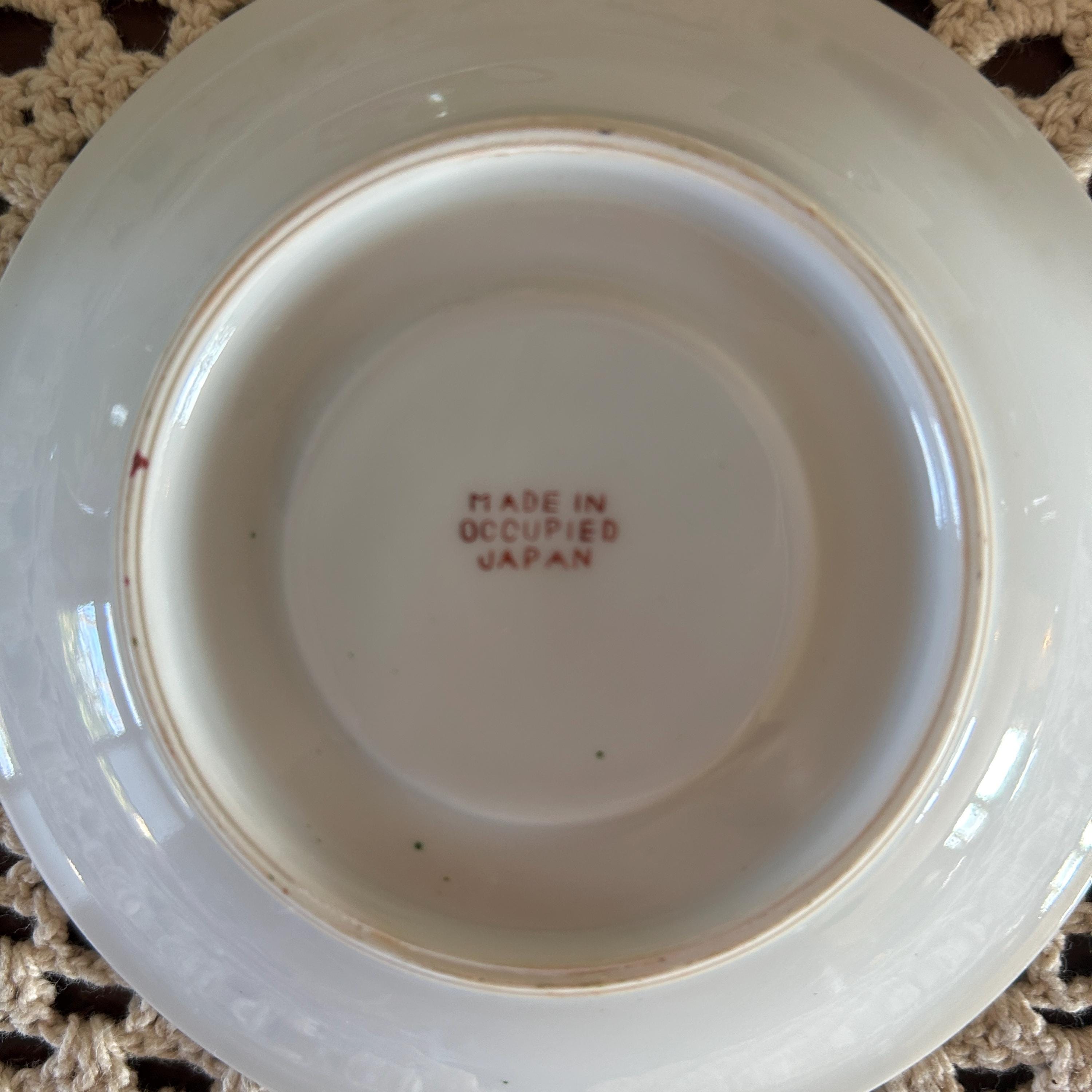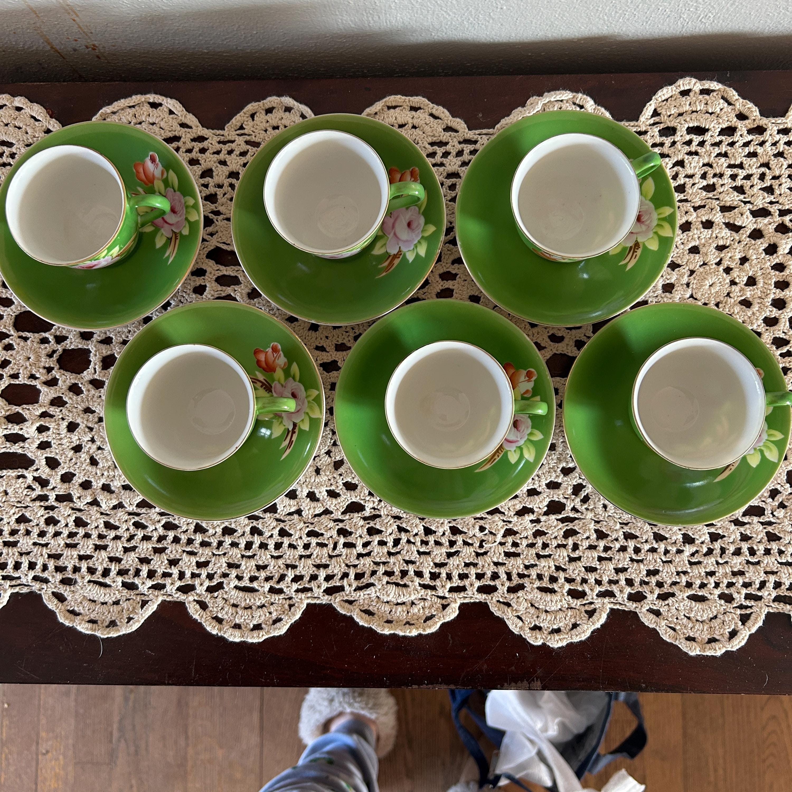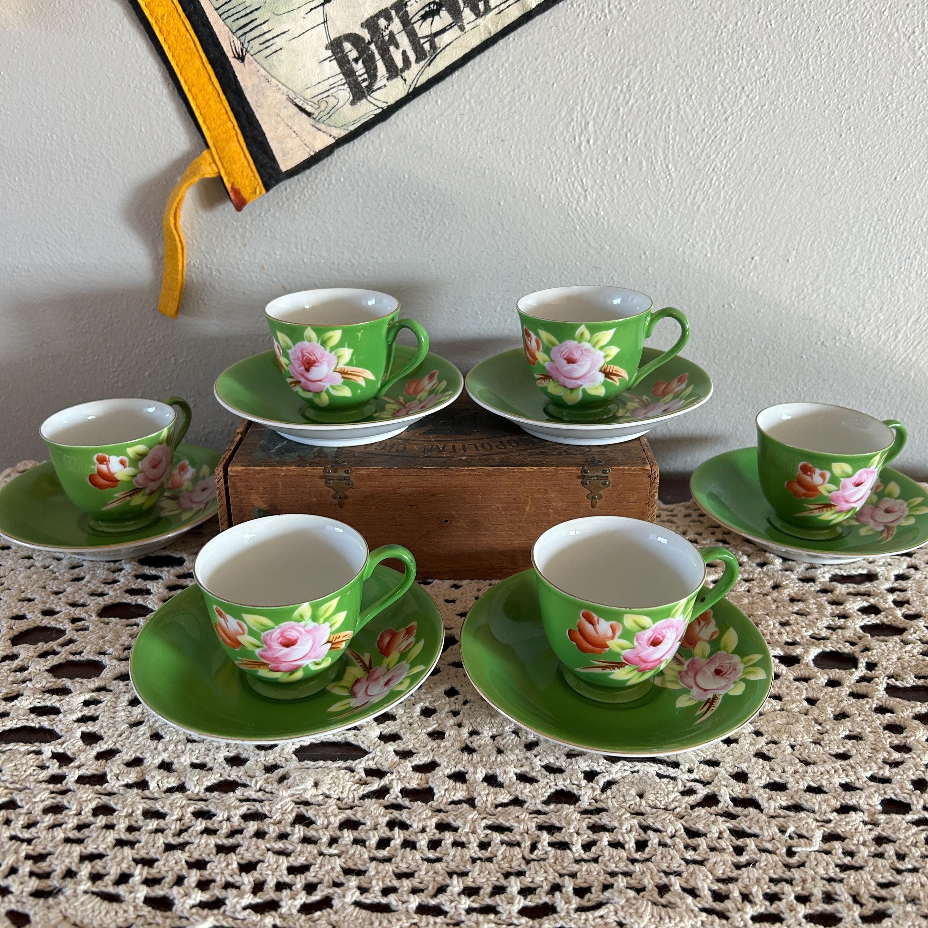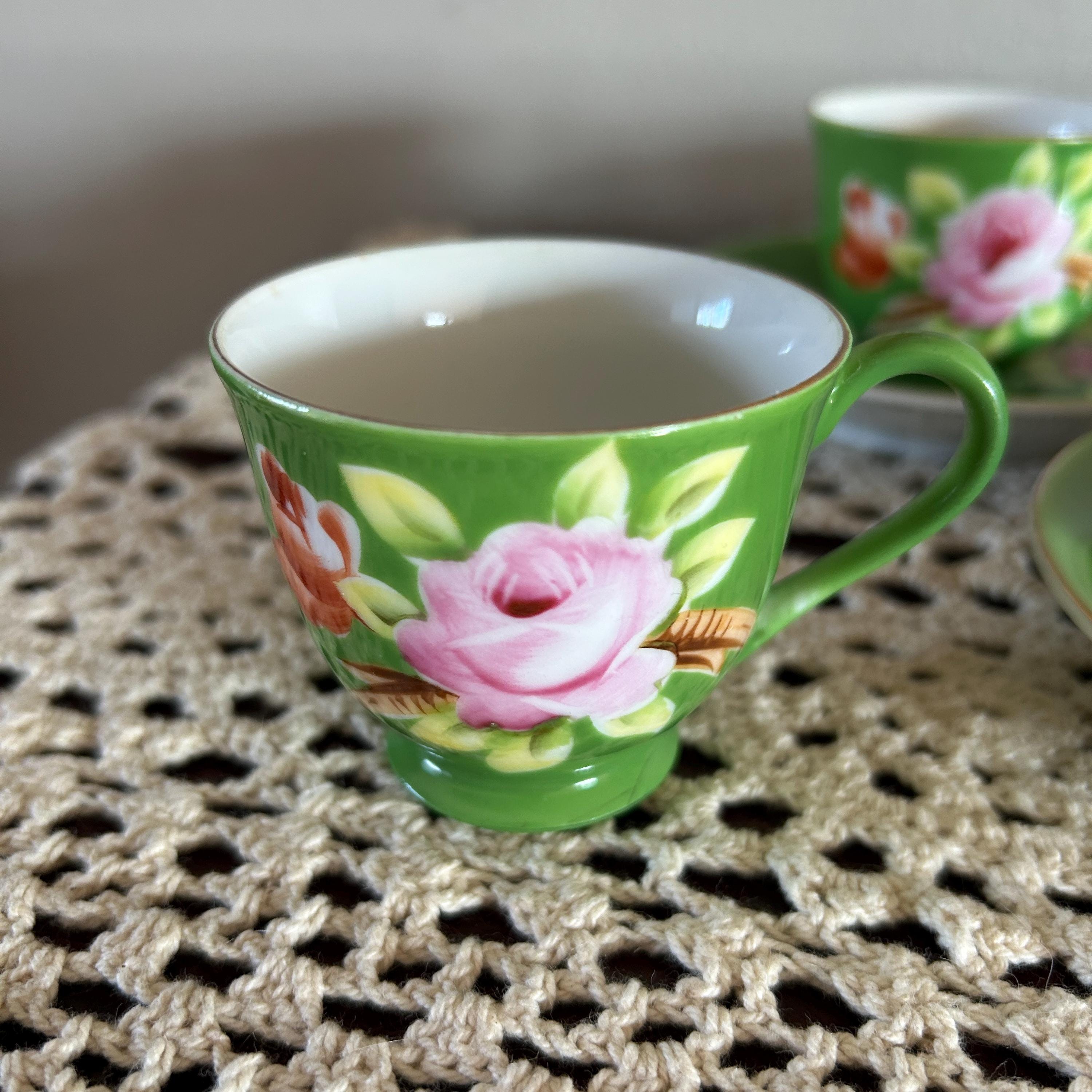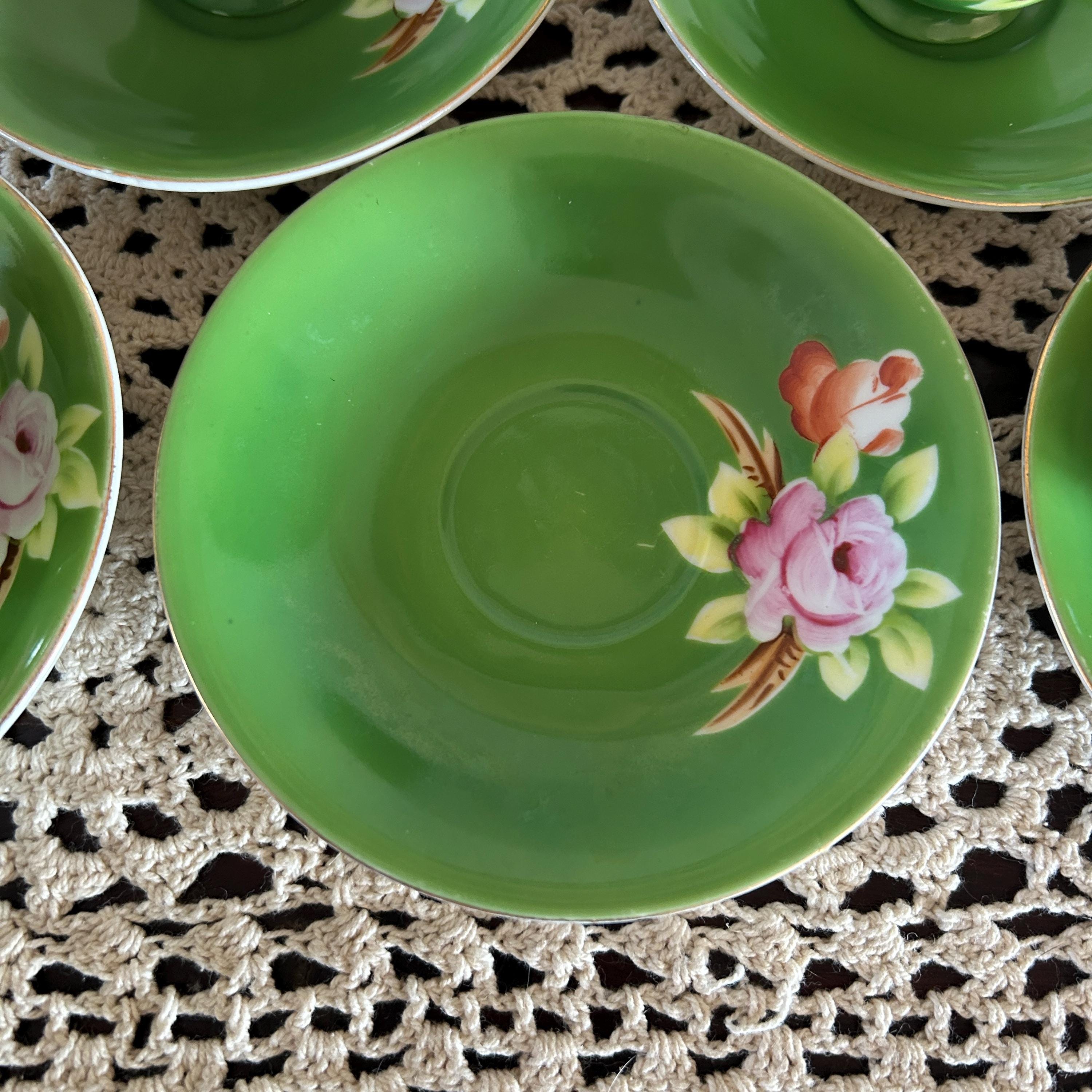 These charming cup and saucer sets have a bright kelly green coloring with light and dark pink roses on both cup and saucer. Clearly marked on the bottom of all pieces and all are in excellent condition, no chips or cracks. The cup alone stands 2 1/2” high and saucer is 4 3/4” in diameter. Nice addition to any cup and saucer or occupied Japan collection.