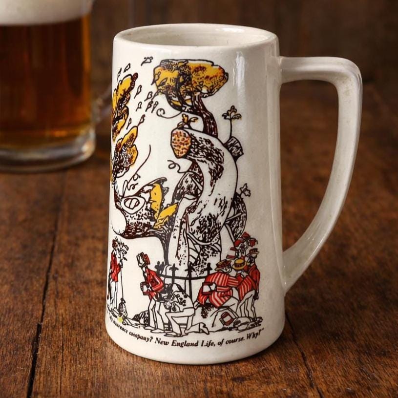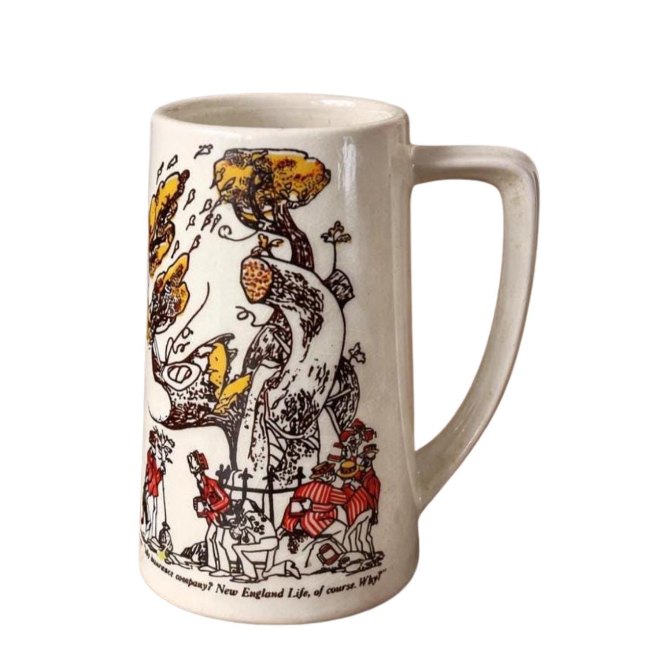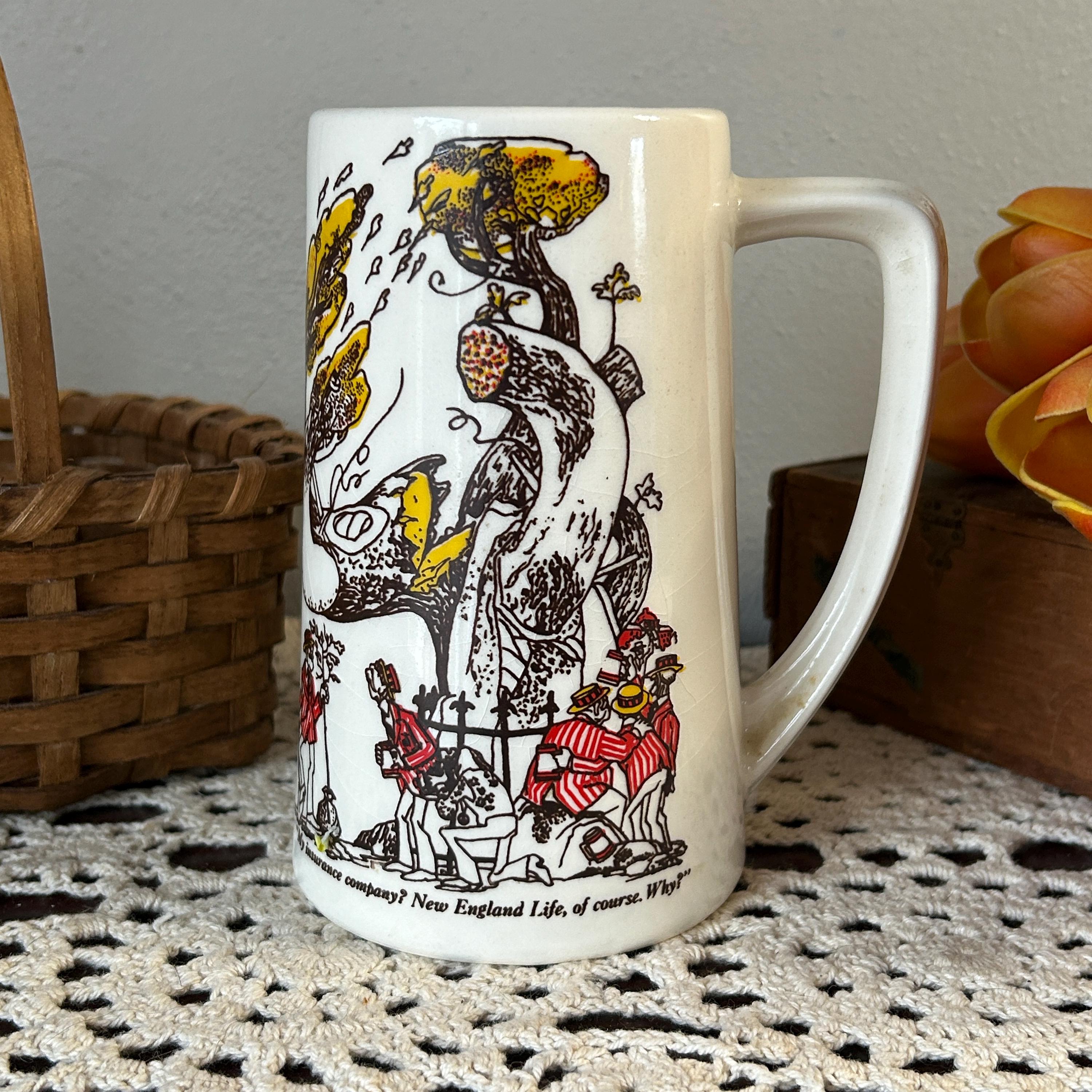 Vintage NEW ENGLAND LIFE INSURANCE COMPANY Advertising Cartoon Mug Cup Stein USA. In very good condition. It measures 5 1/2 " high and is 3" in diameter at the lid, 3 1/2" in diameter at the base.