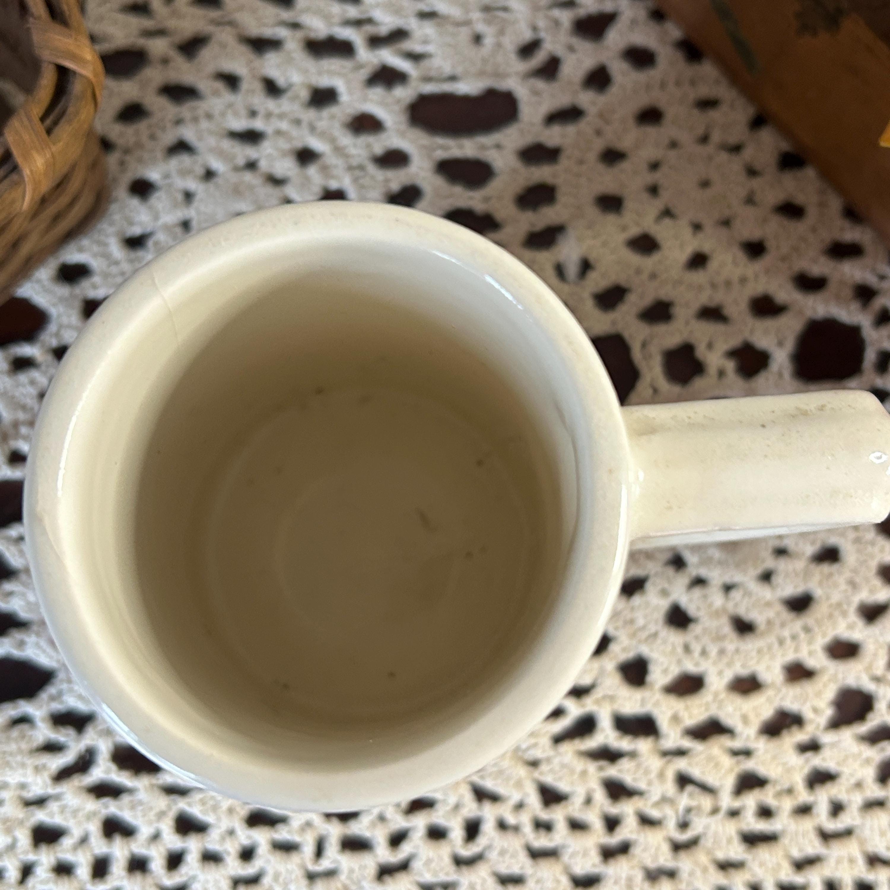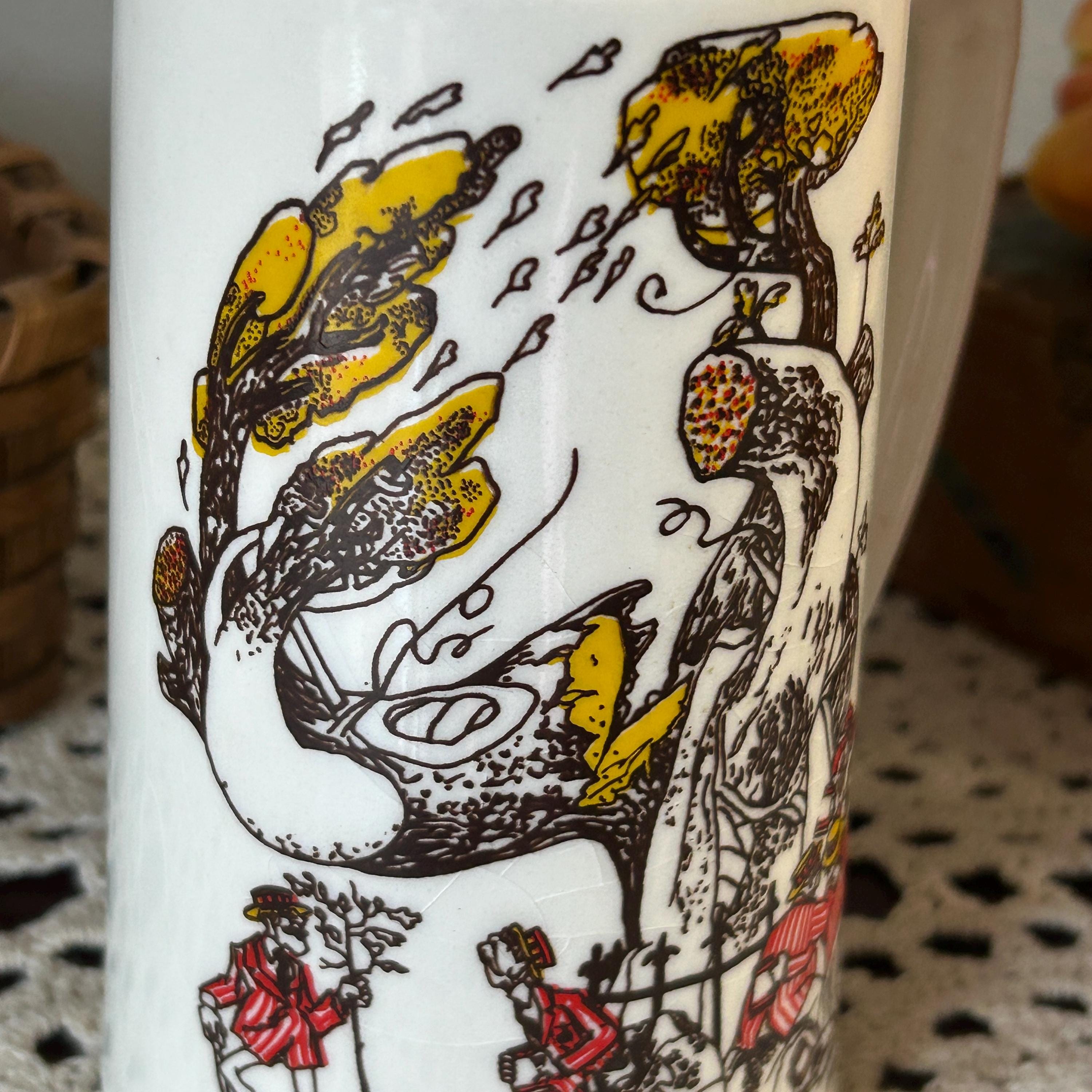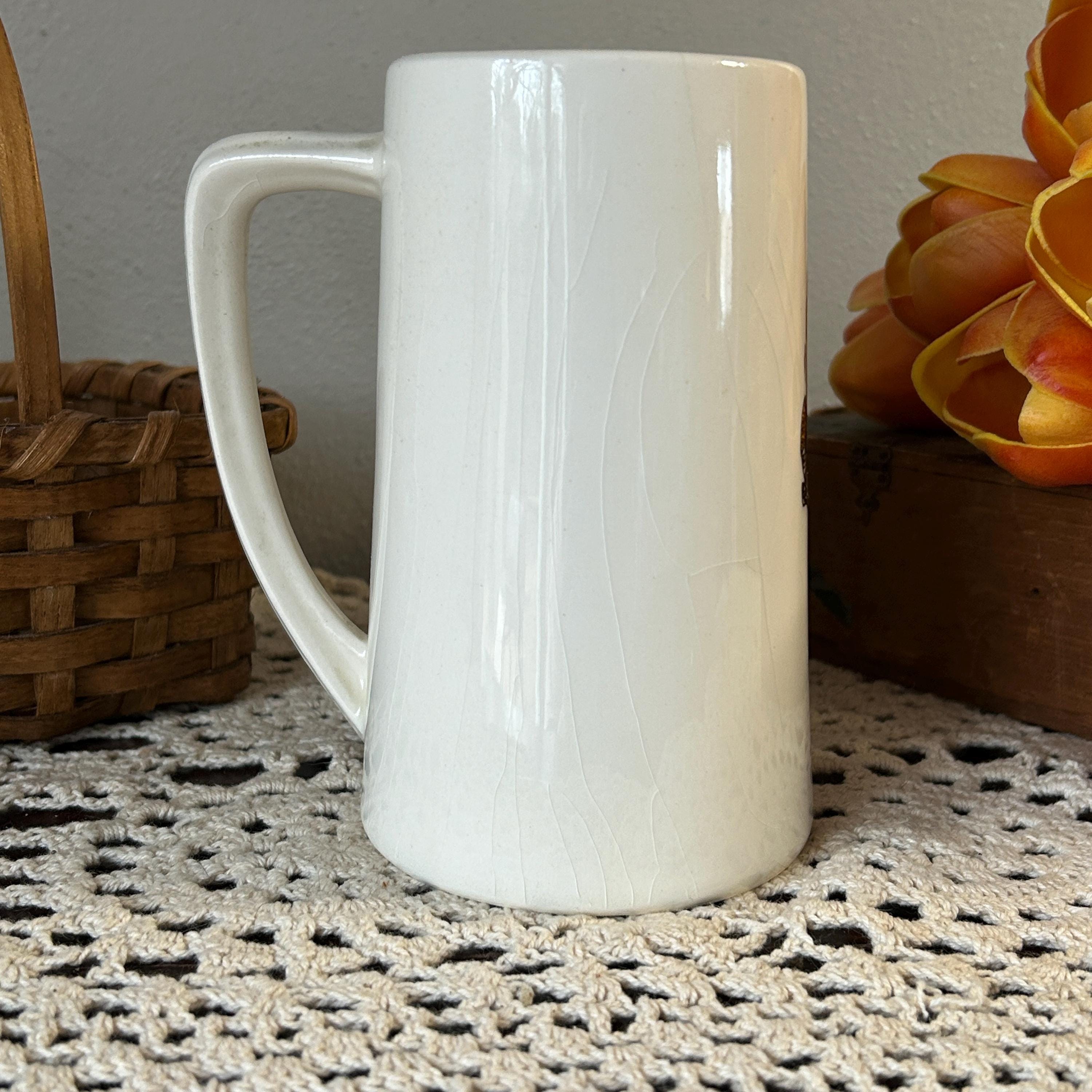 Vintage NEW ENGLAND LIFE INSURANCE COMPANY Advertising Cartoon Mug Cup Stein USA. In very good condition. It measures 5 1/2 " high and is 3" in diameter at the lid, 3 1/2" in diameter at the base.