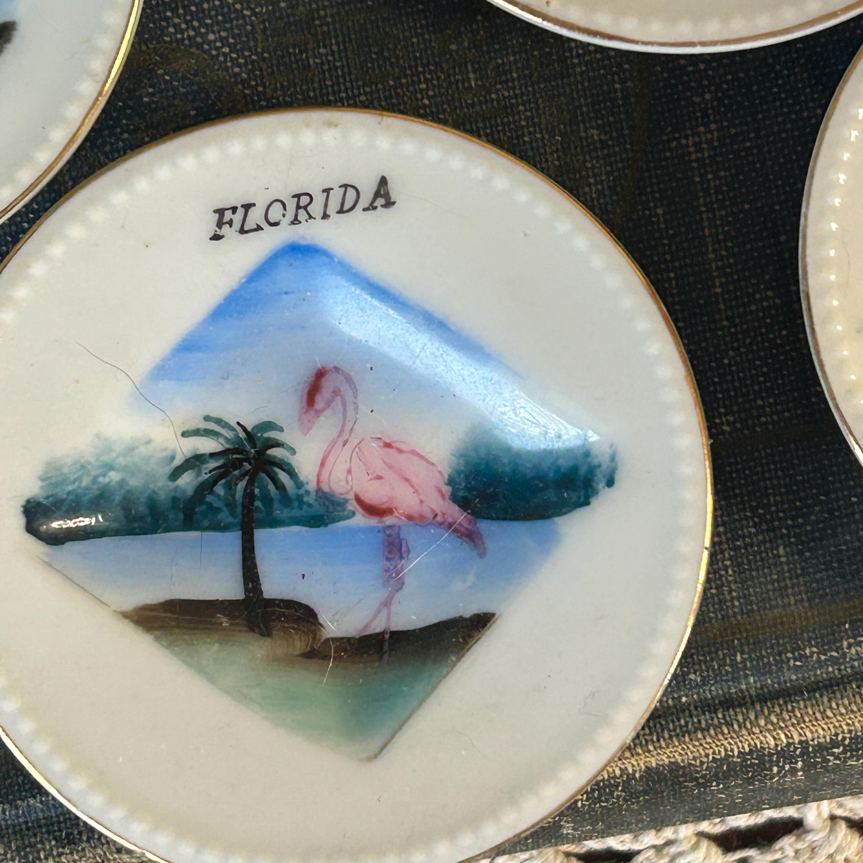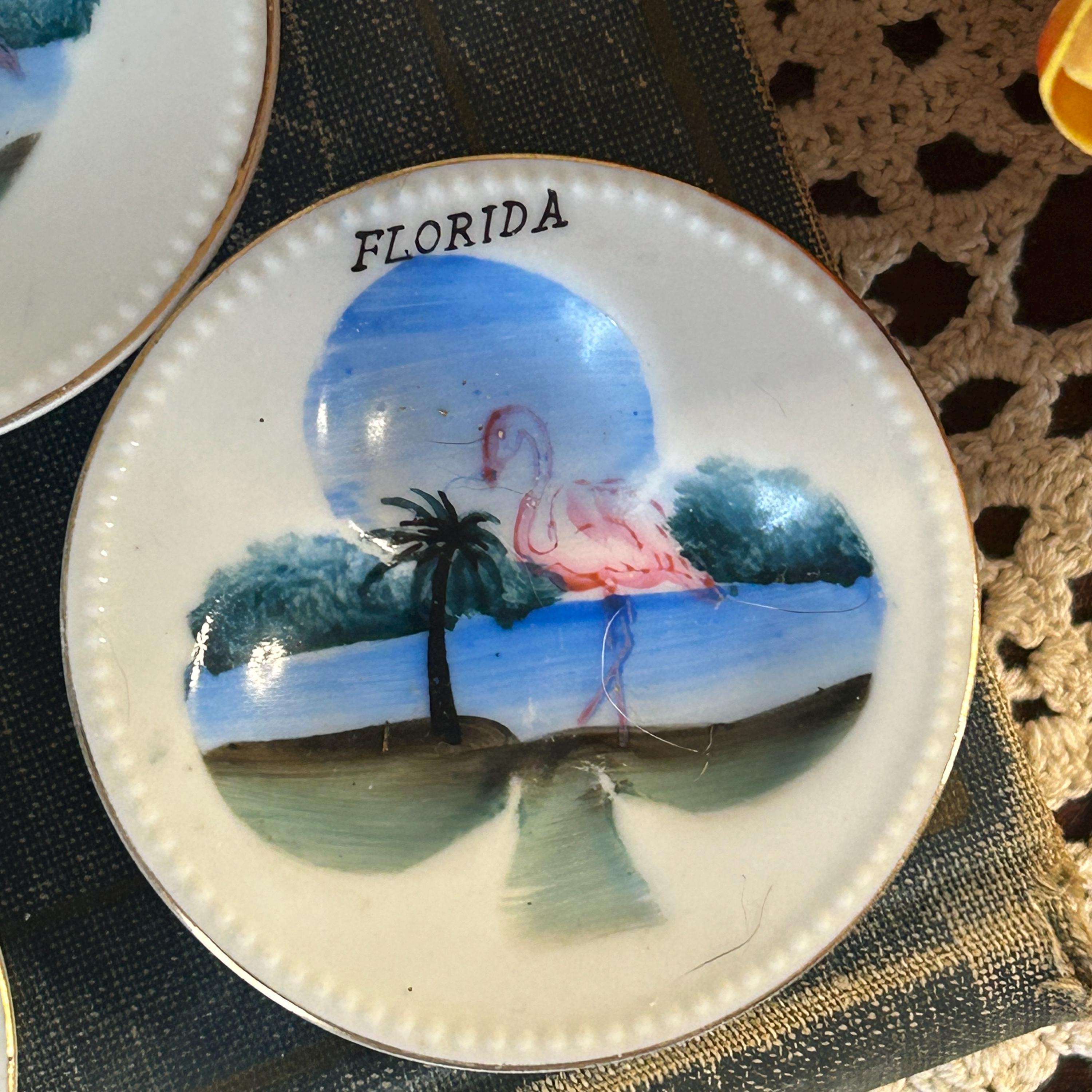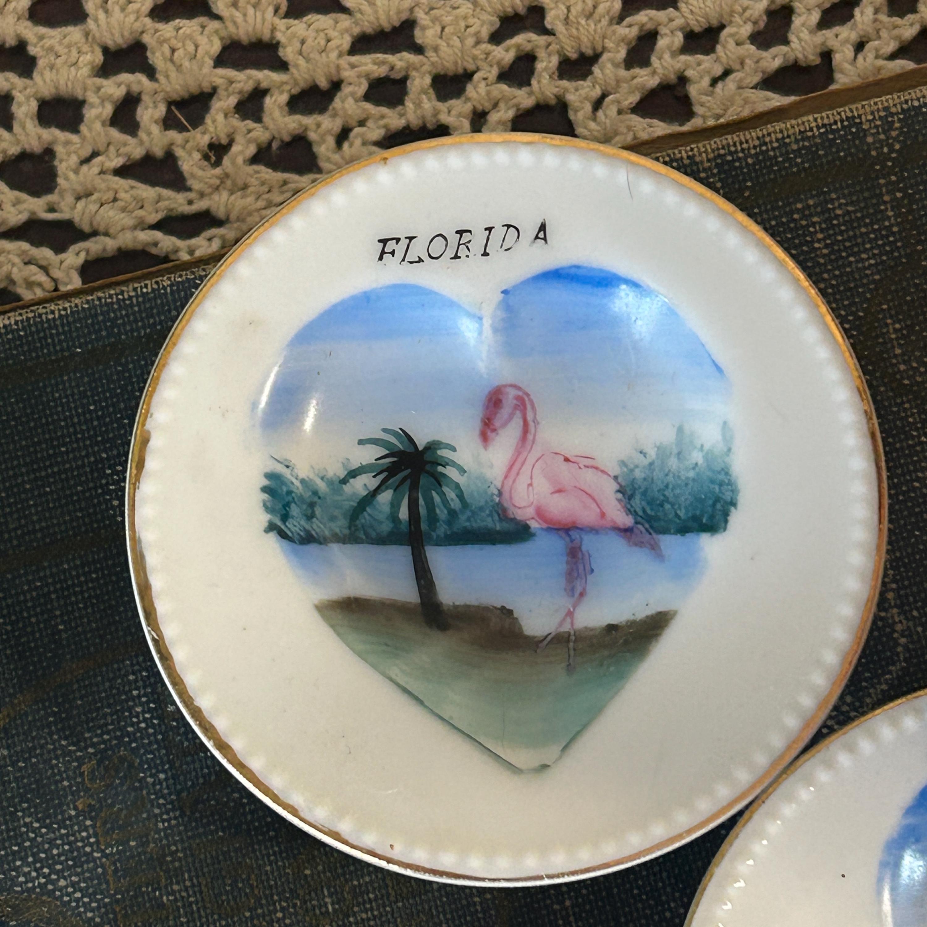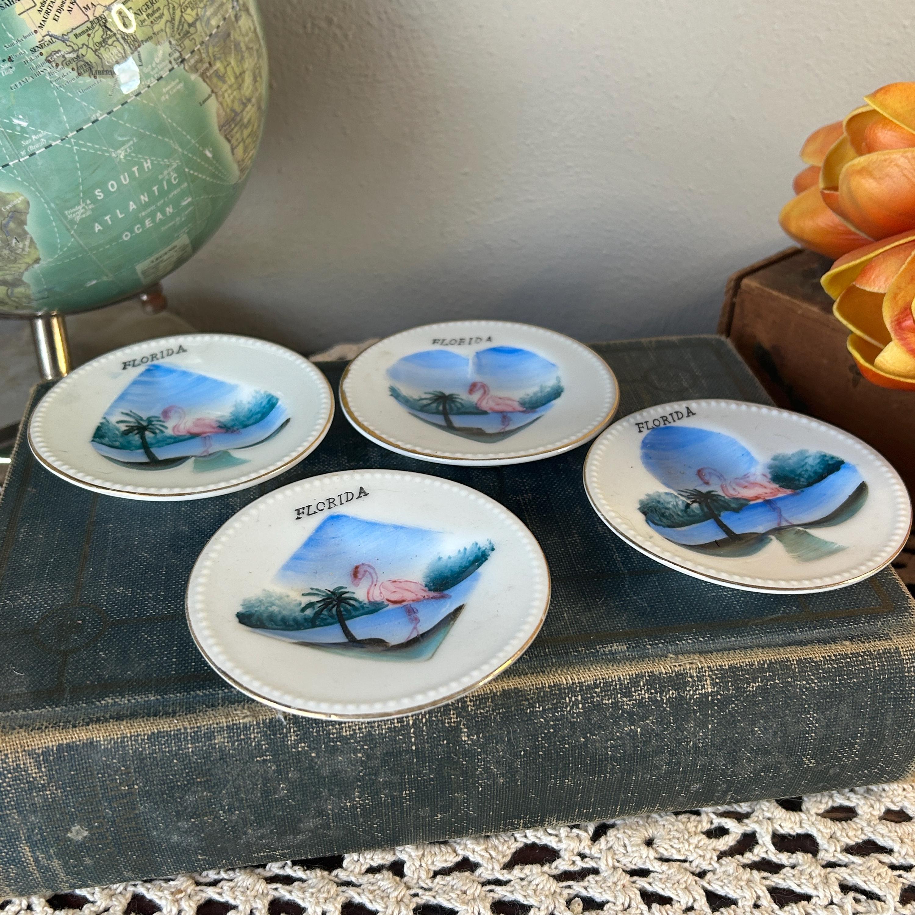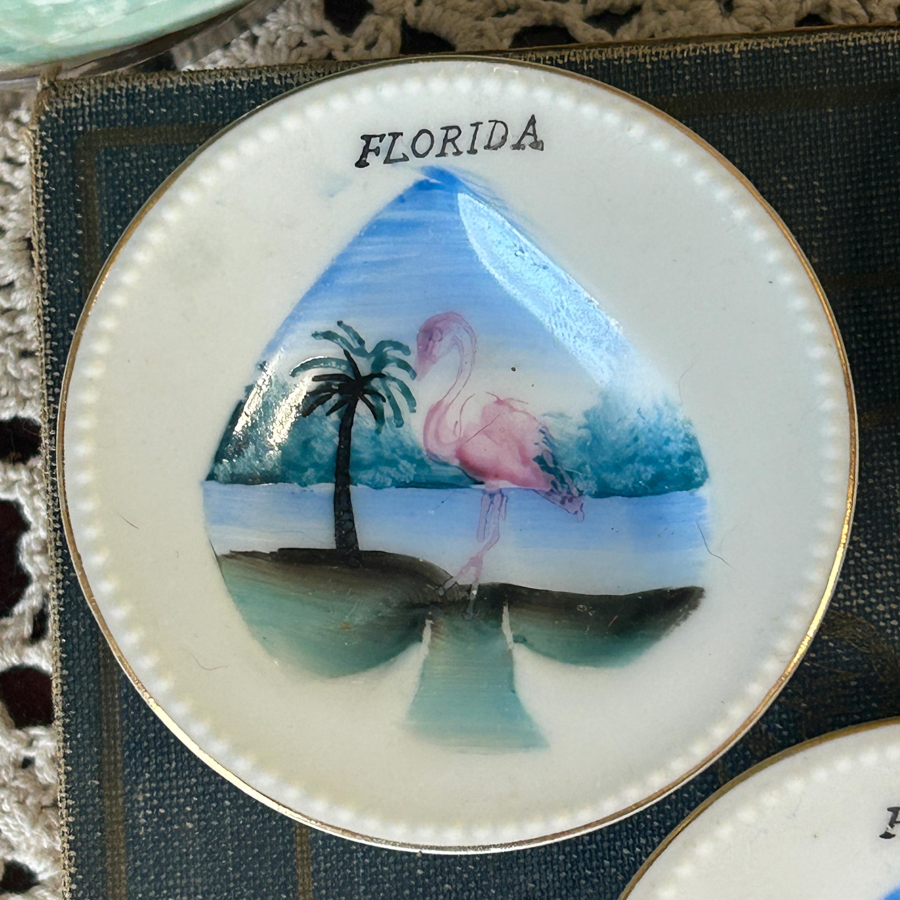 Bring back the days of card parties! These adorable souvenir Florida ashtrays feature the spade, club, diamond and heart of a card deck. Originally used as ashtrays, these little plates could be used for snacks or nuts. Great for your next Binko or Bridge game. Each plate measures 3 1/8" in diameter and feature flamingos and palm trees.