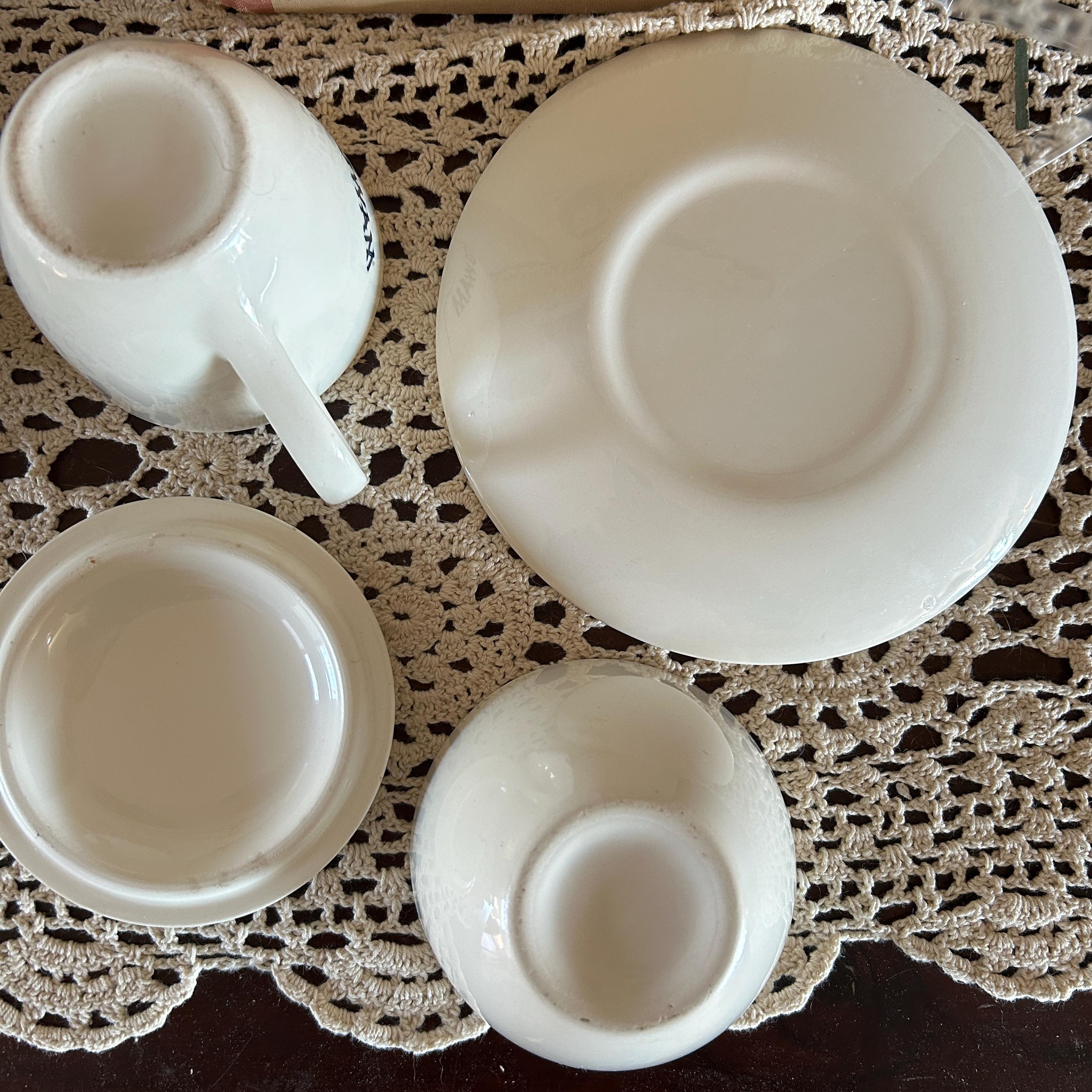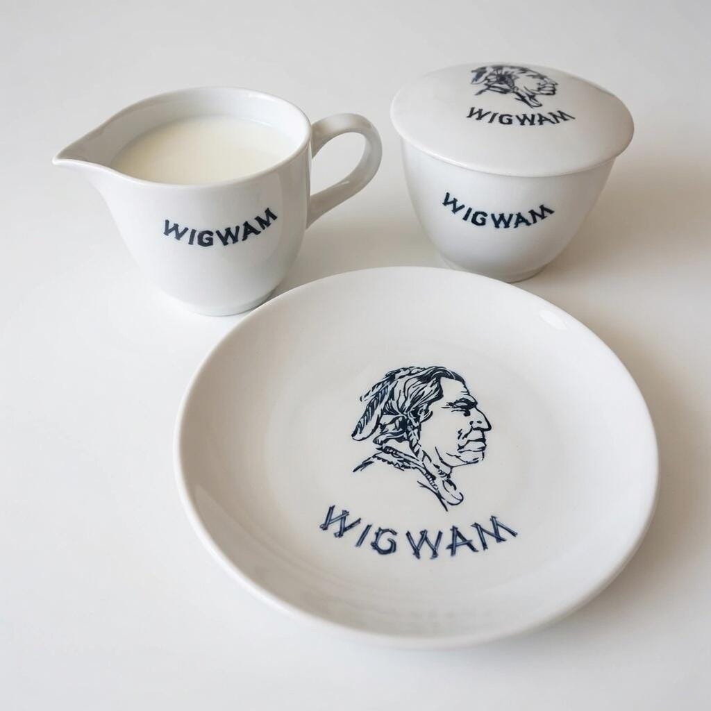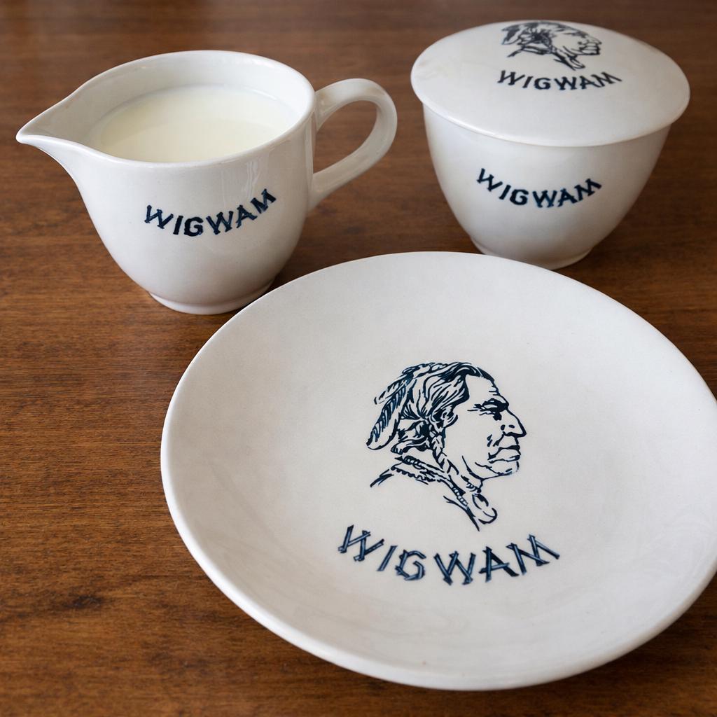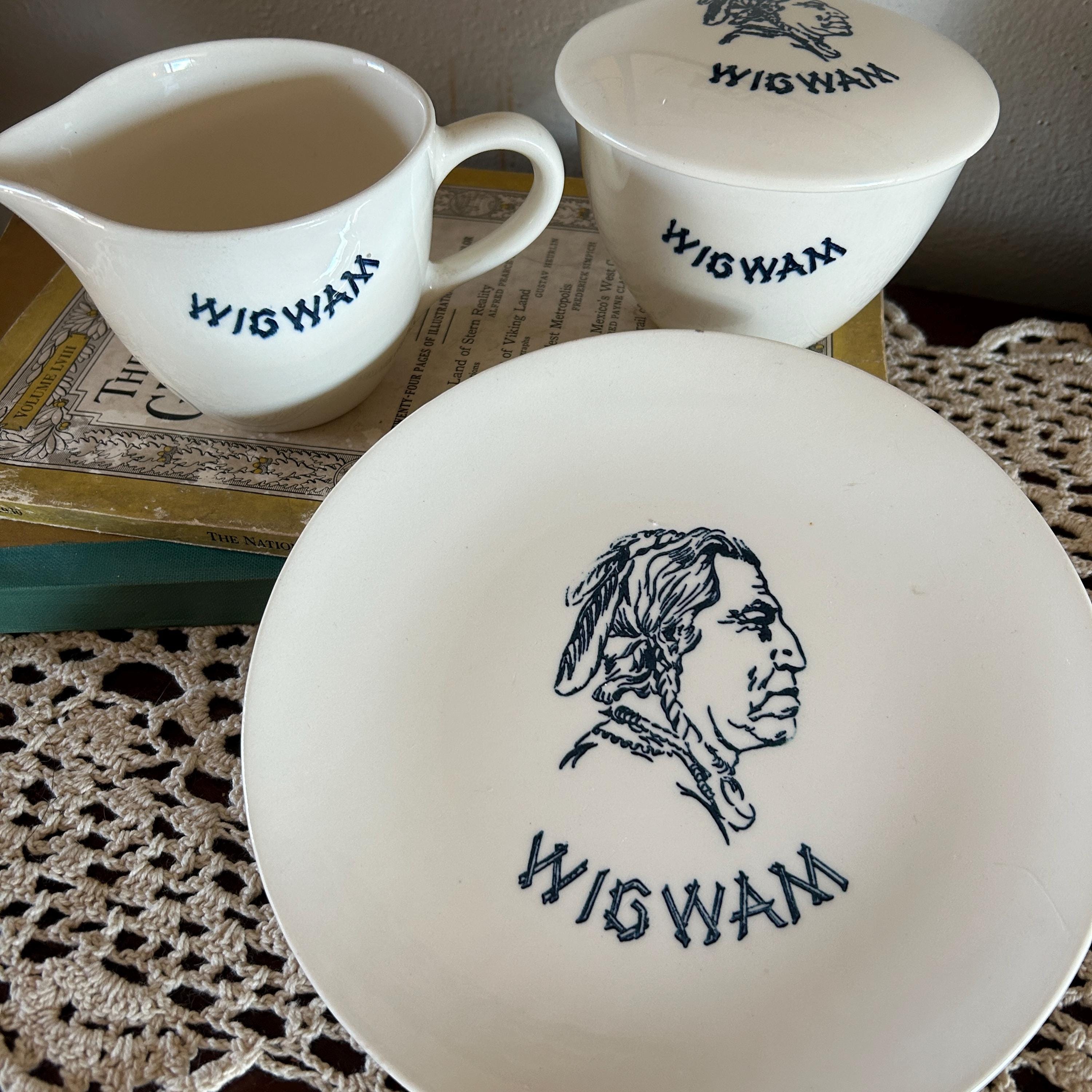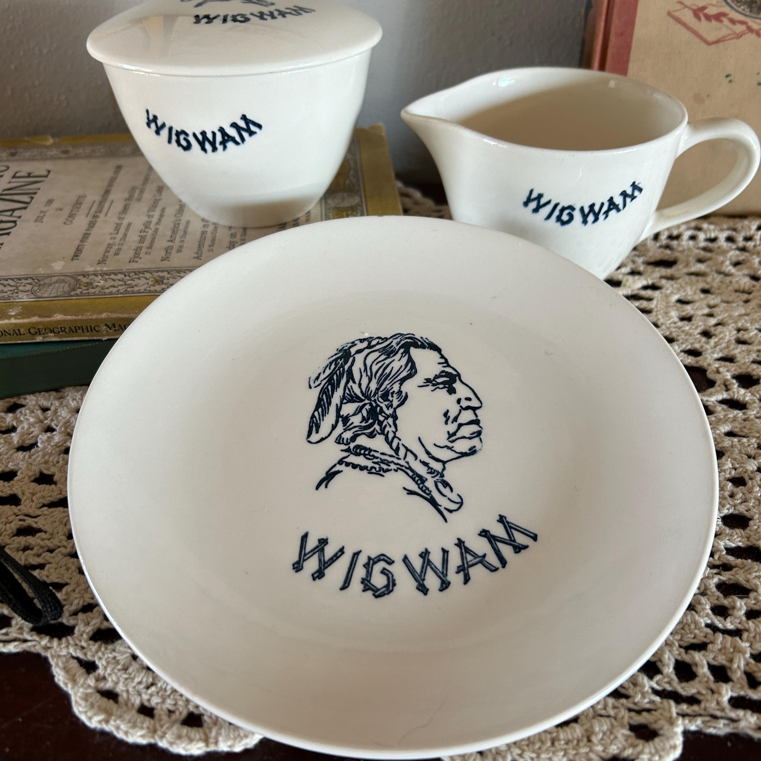 Set contains a creamer, a sugar bowl with lid, and a plate. All have the WIGWAM and plate and sugar lid have the American Indian artwork. They measure as follows:
