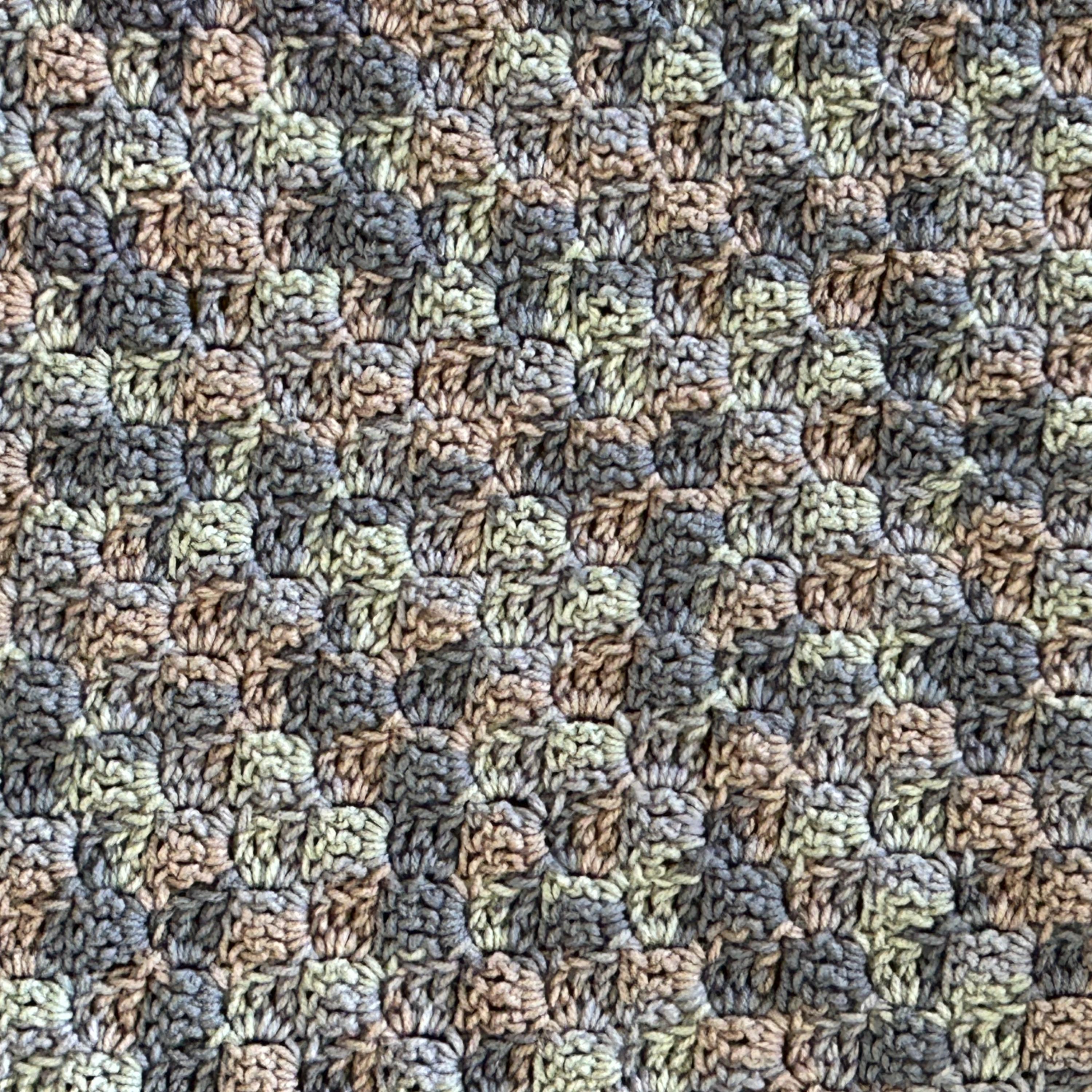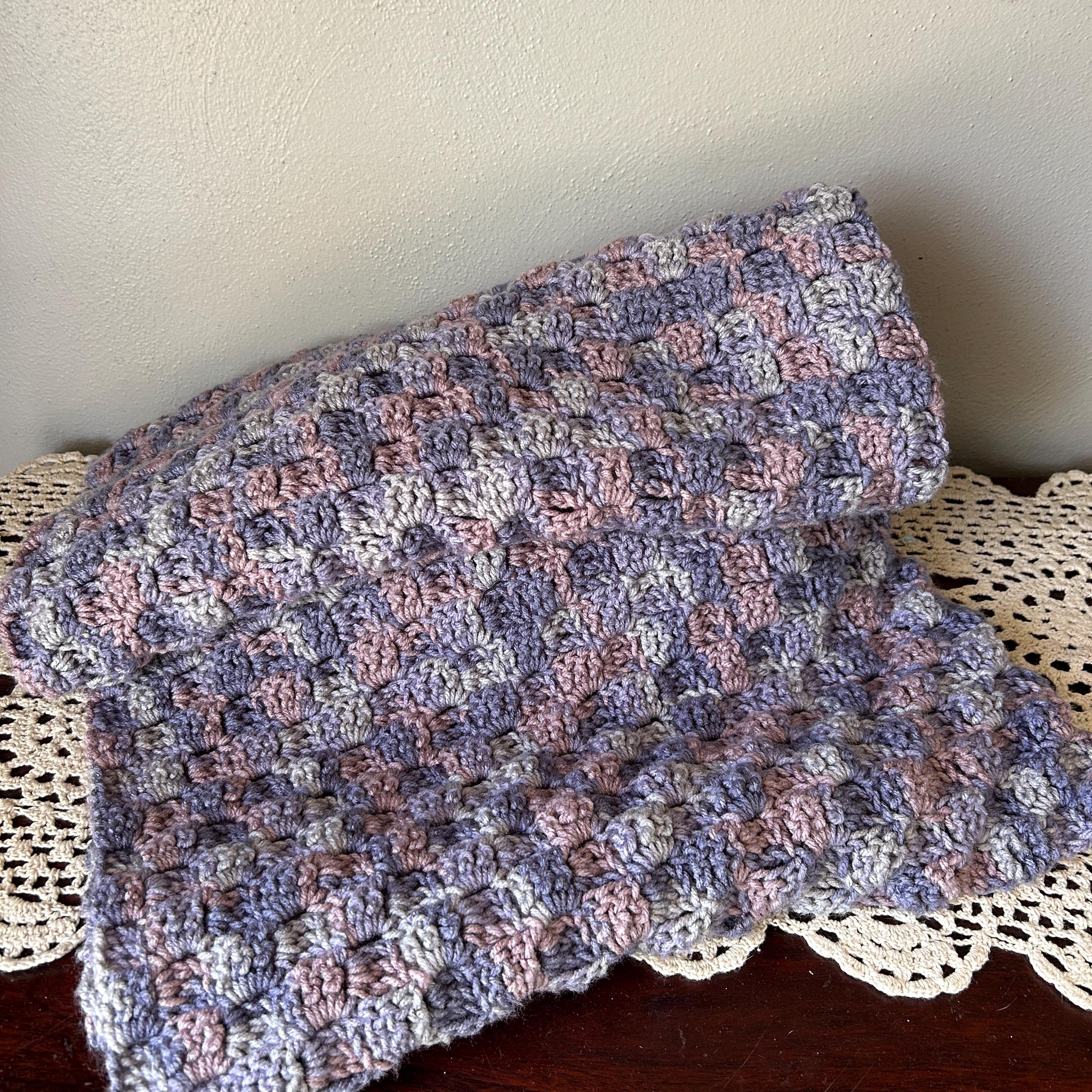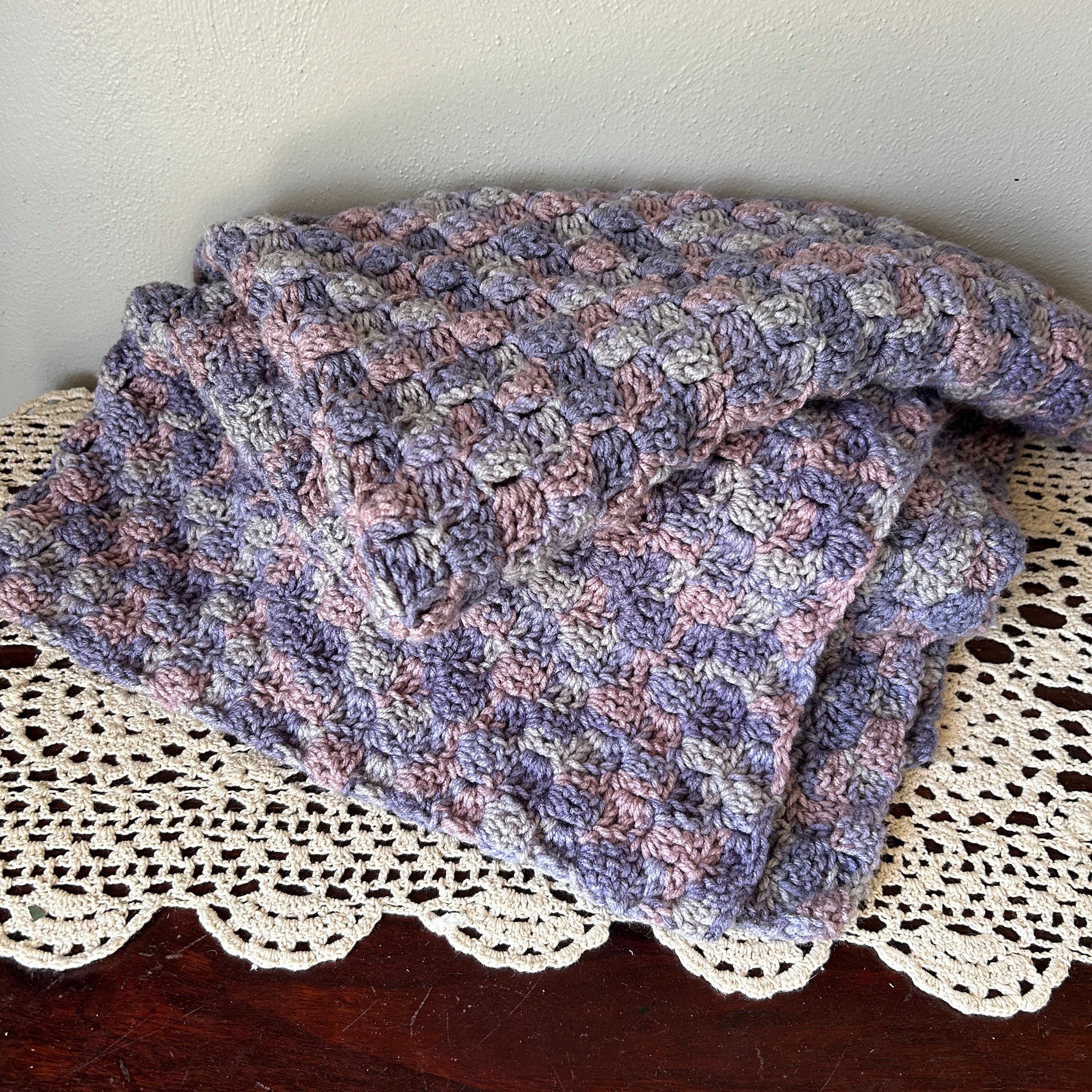 This is a flawless hand-knitted crocheted baby blanket or lap throw. The colors and craftsmanship are amazing. This would be beautiful thrown across a cozy chair. Would be appropriate for boy or girl. So soft and very clean!!!! No snags or pulls. It looks and feels to be made of acrylic or cotton wool yarn. The yarn has a bit of sheen to it. Gorgeous!!