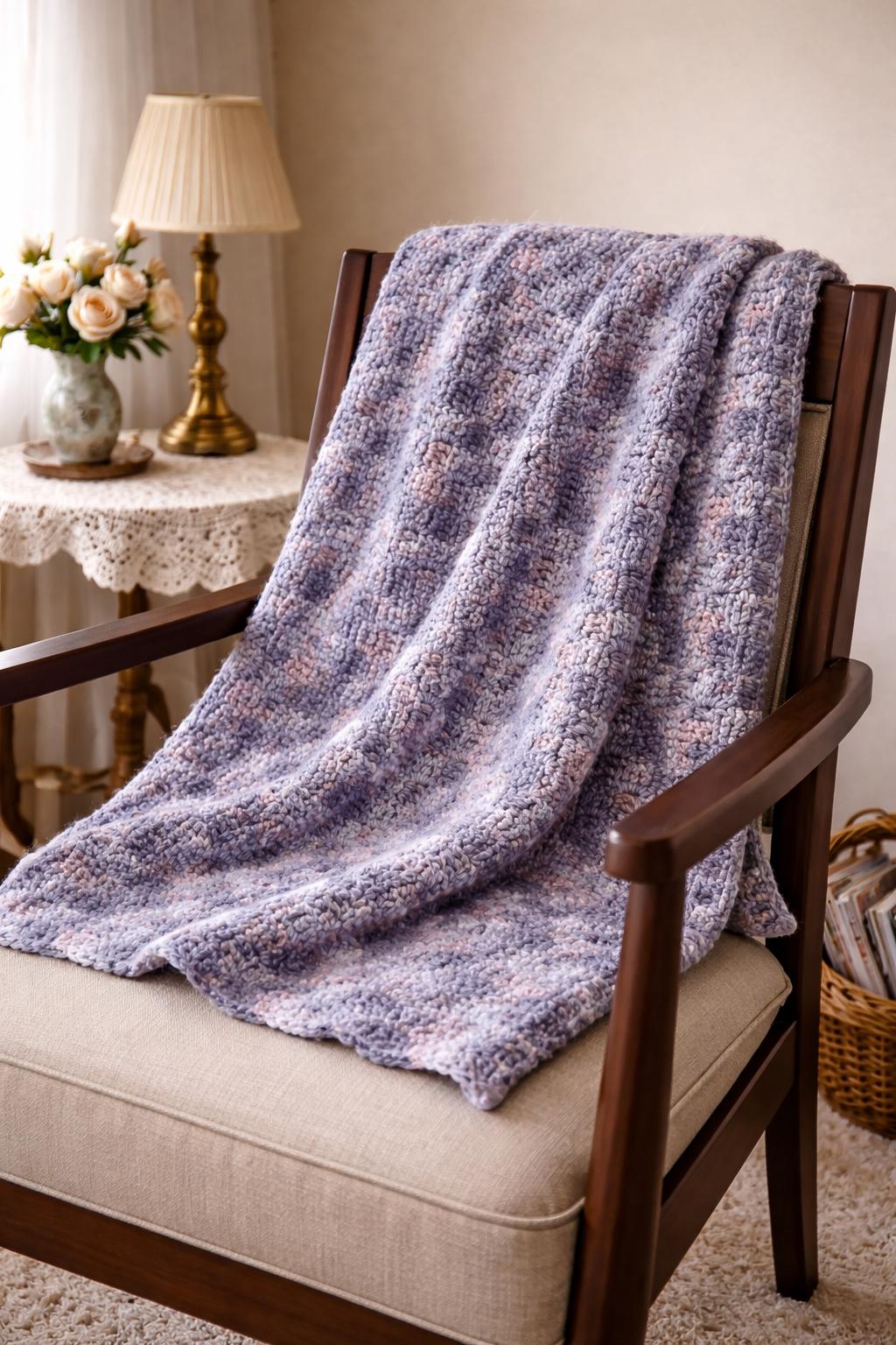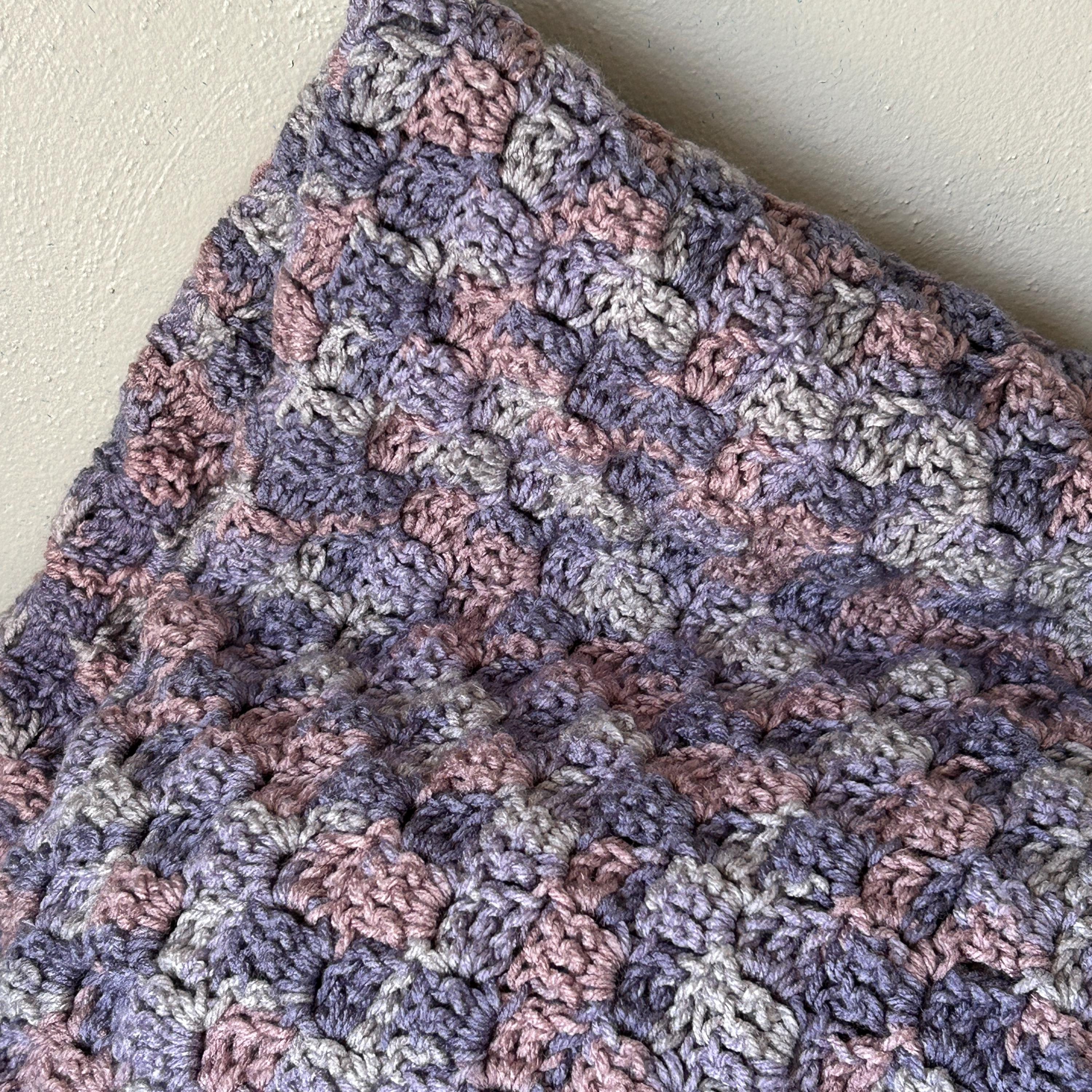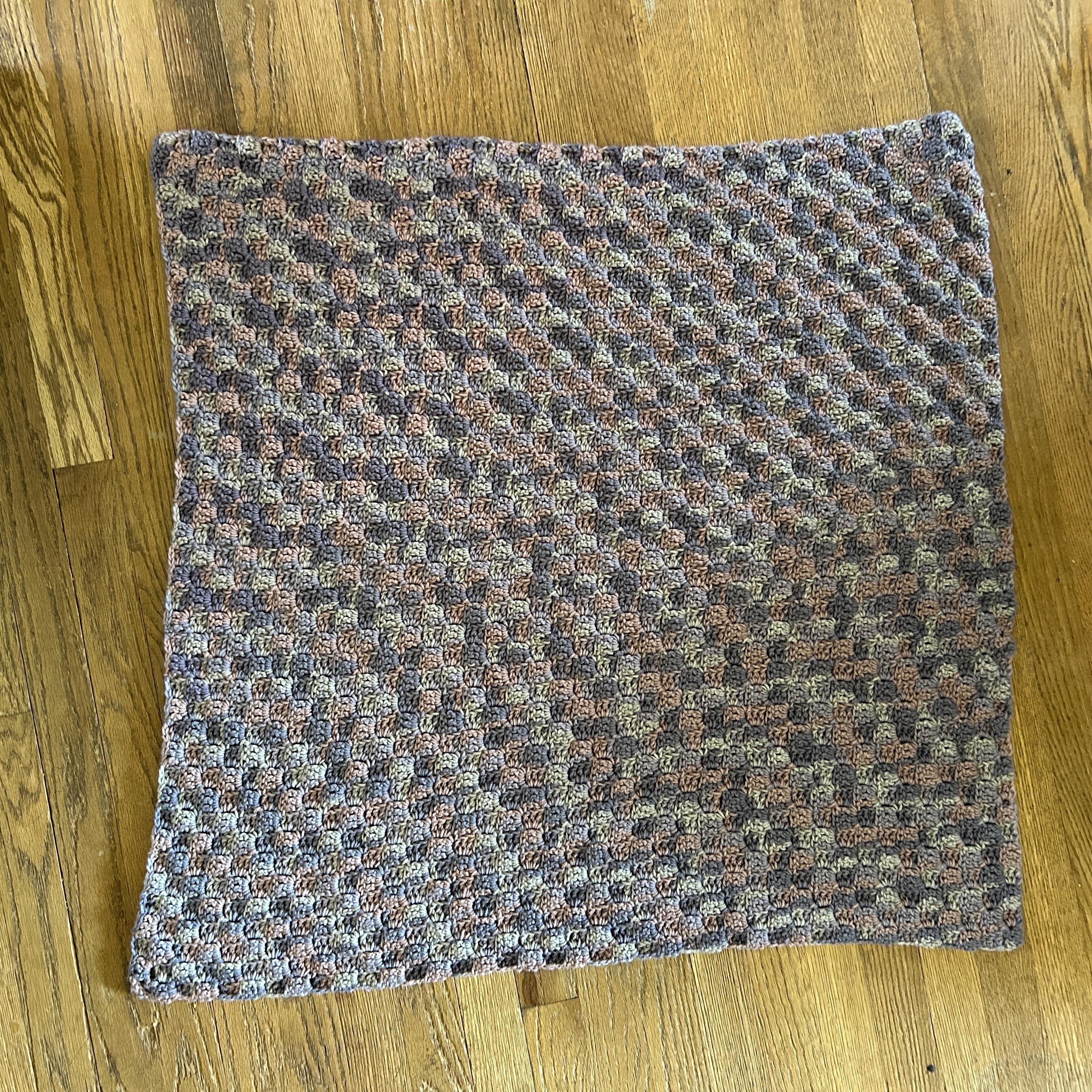 This is a flawless hand-knitted crocheted baby blanket or lap throw. The colors and craftsmanship are amazing. This would be beautiful thrown across a cozy chair. Would be appropriate for boy or girl. So soft and very clean!!!! No snags or pulls. It looks and feels to be made of acrylic or cotton wool yarn. The yarn has a bit of sheen to it. Gorgeous!!