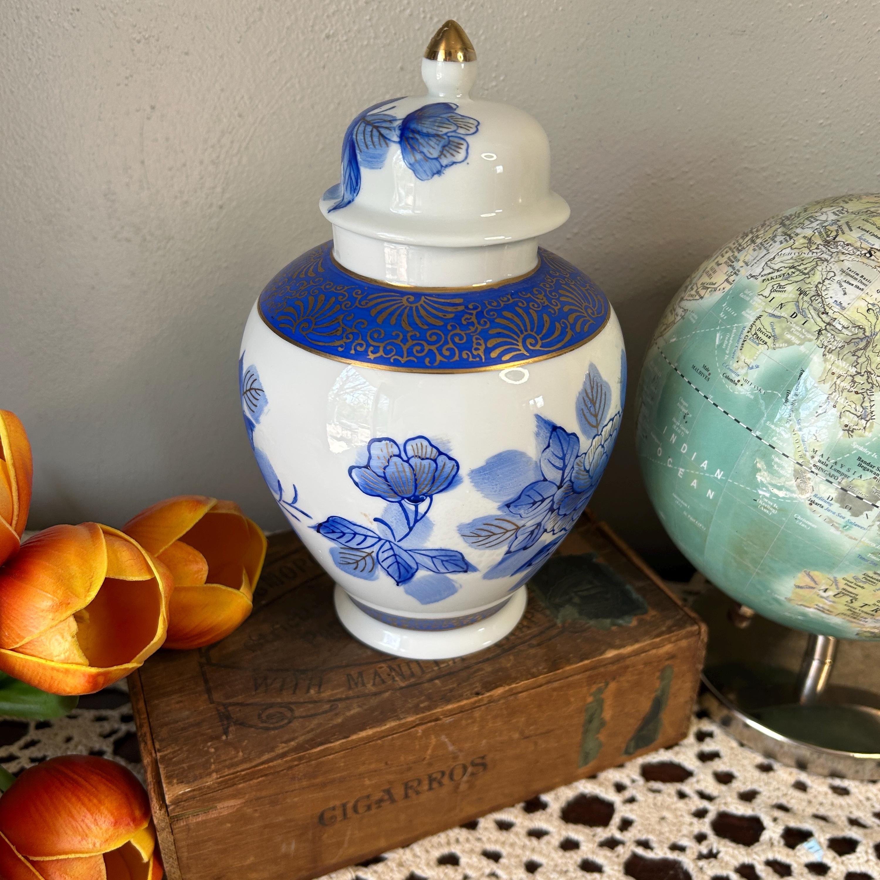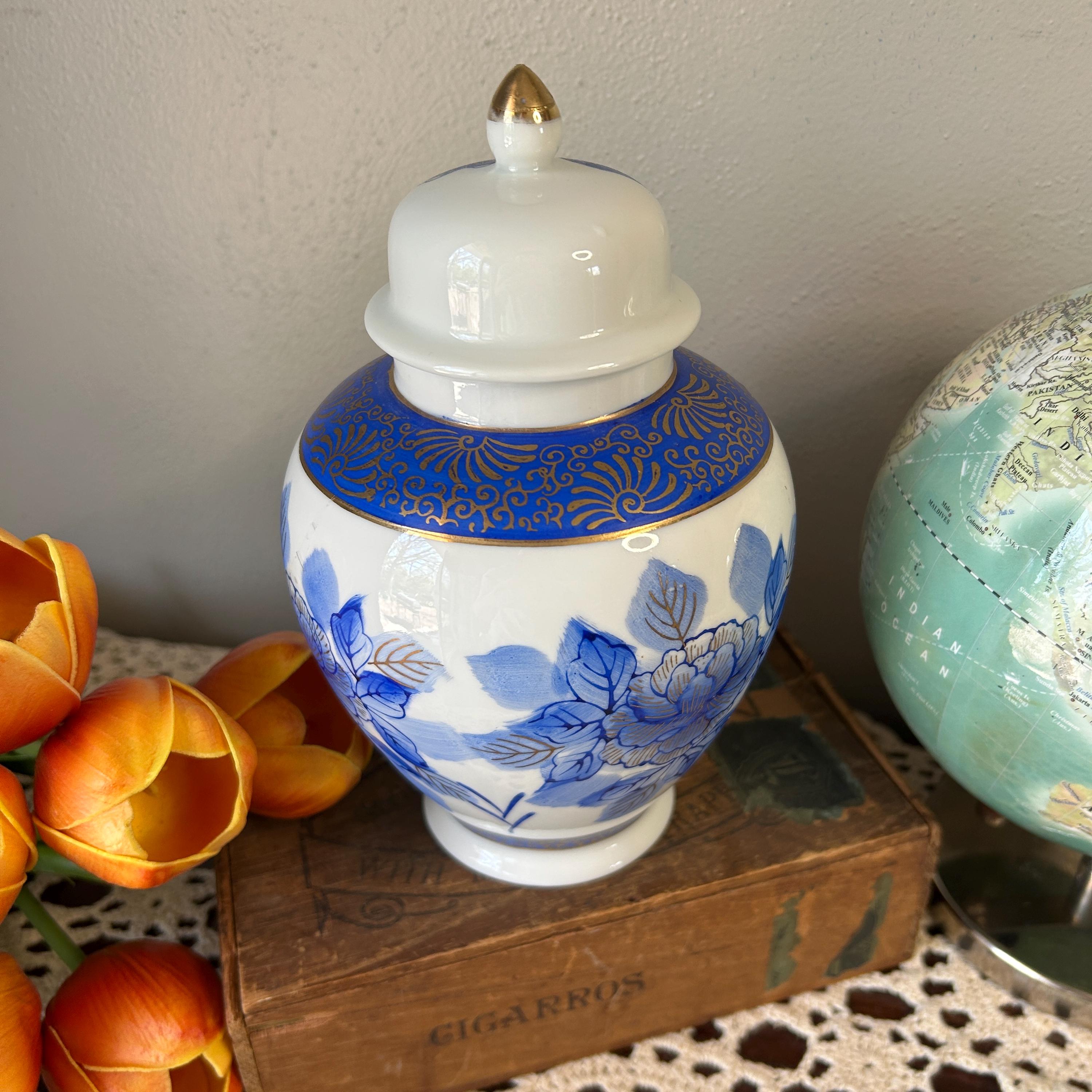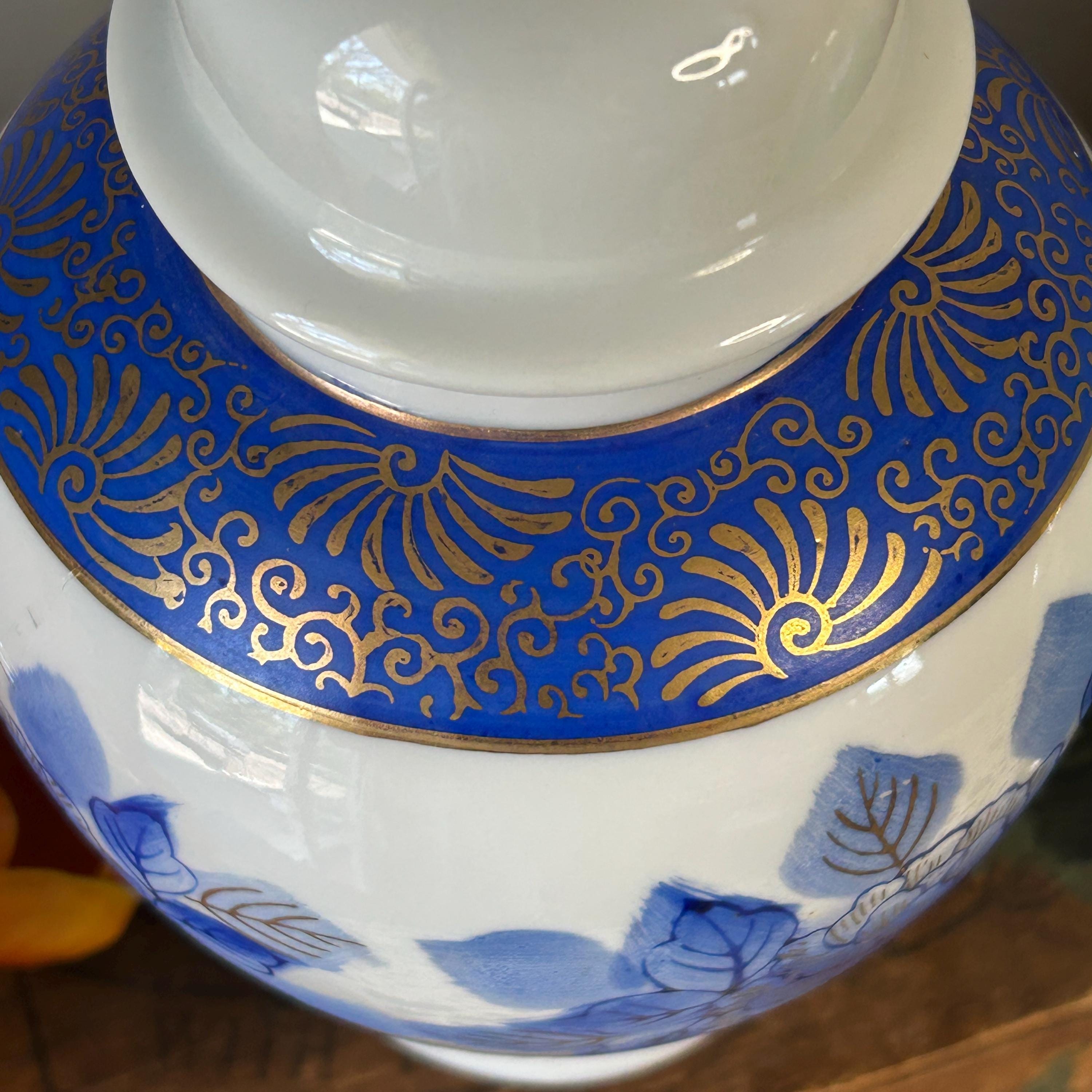 Vintage Andrea by Sadek lidded ginger jar, likely dating from the 1960s or 1970s. It features a white background with blue floral and leaf designs, accented with gold trim. The lid is topped with a gold finial and echoes the blue floral motif. The base of the jar is slightly flared. "Napcoware" was a brand name used by the National Potteries Corporation (NAPCO), which imported and distributed various ceramic and giftware items, including pieces from Andrea by Sadek.