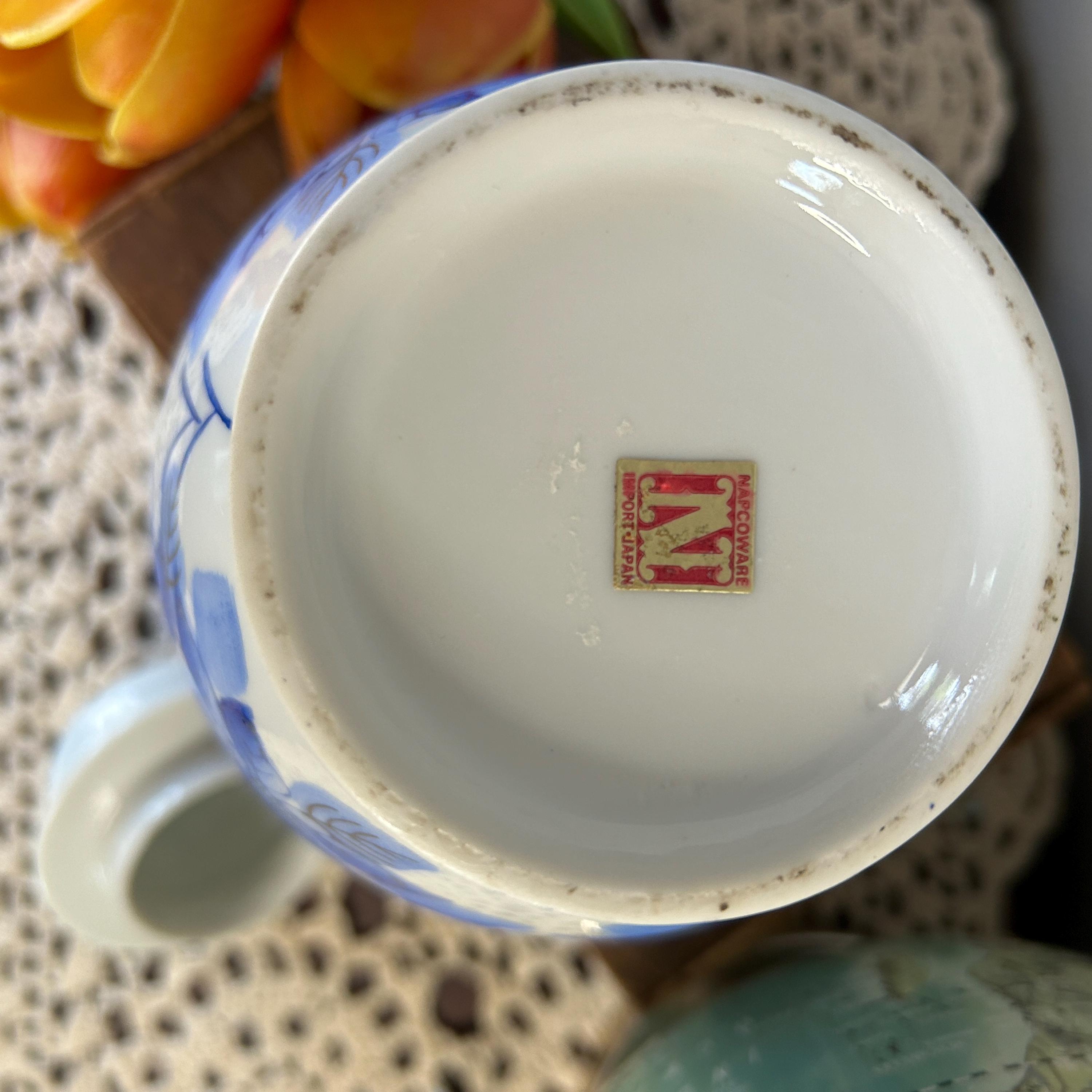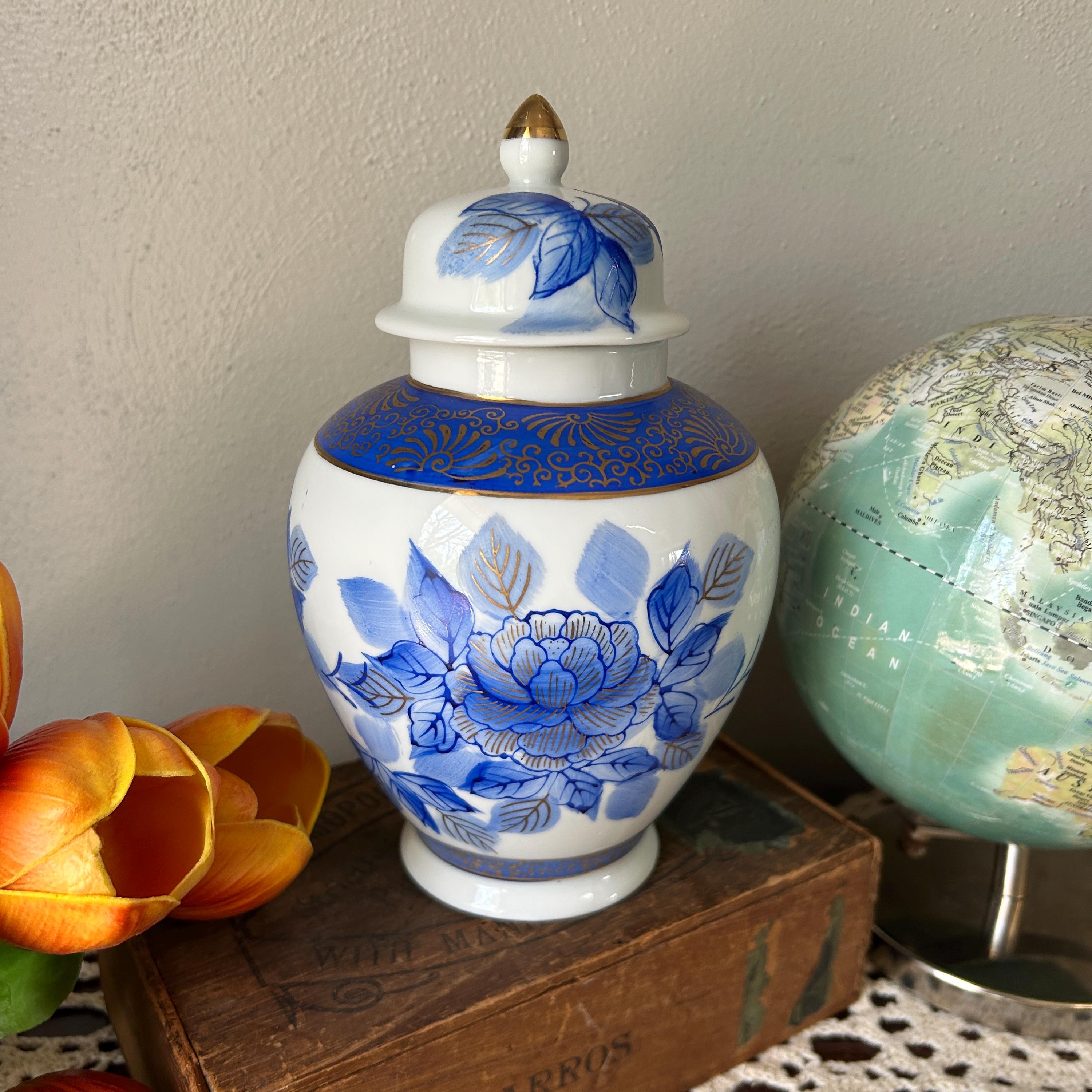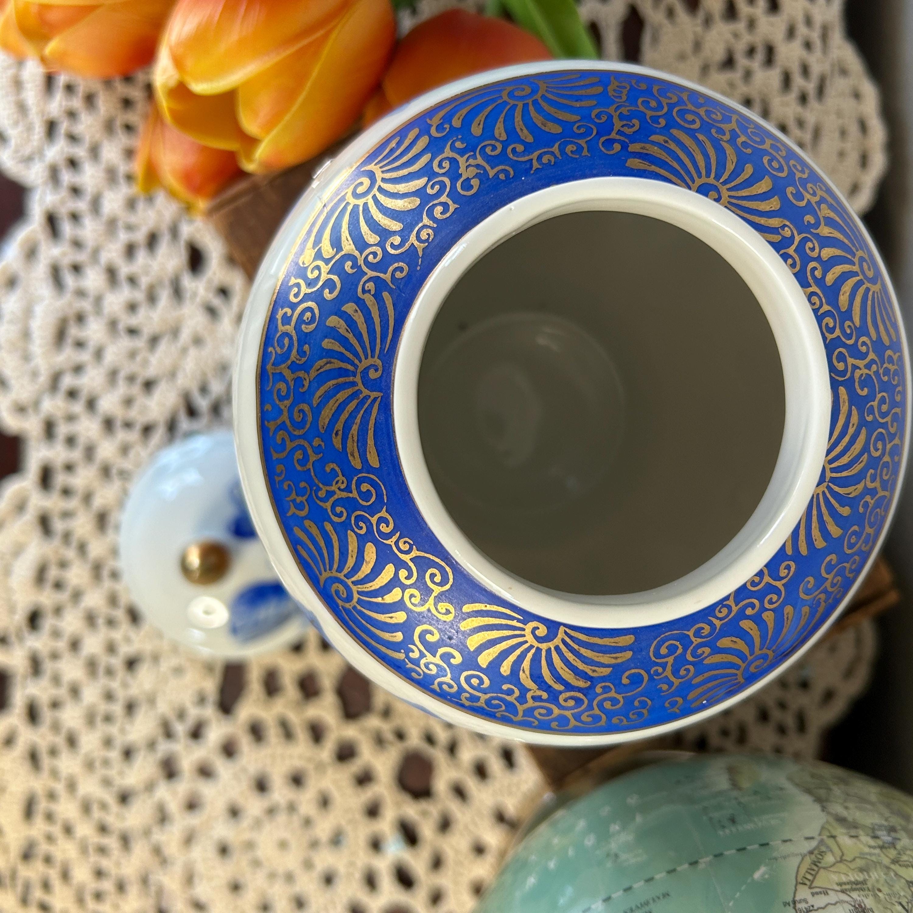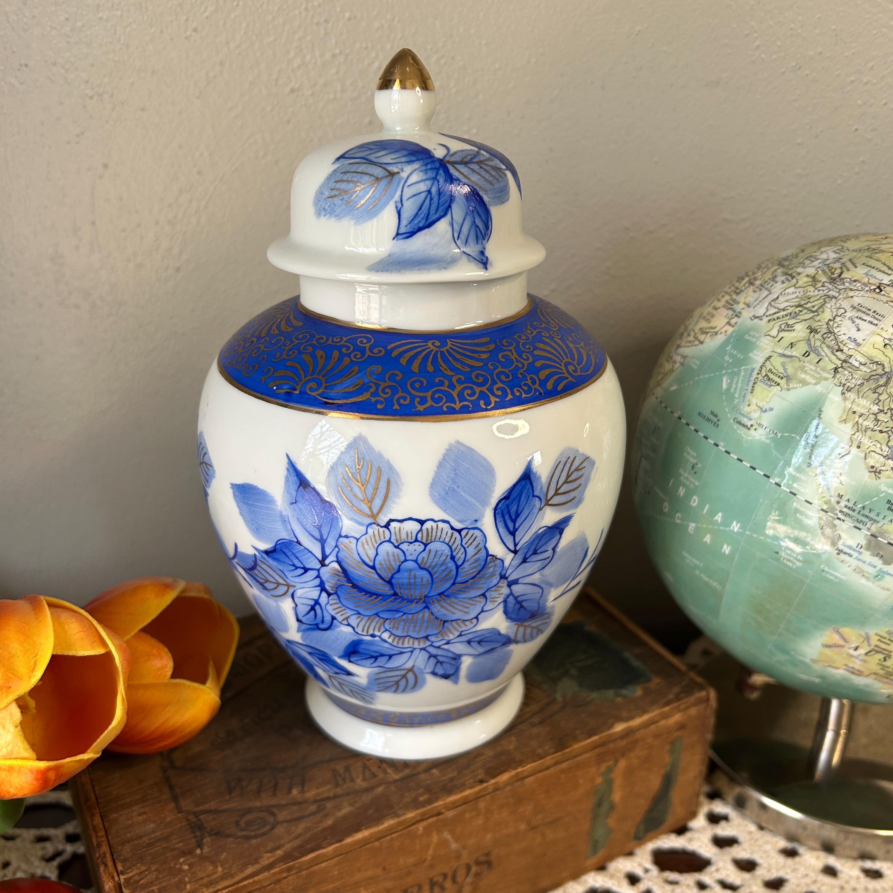 Vintage Andrea by Sadek lidded ginger jar, likely dating from the 1960s or 1970s. It features a white background with blue floral and leaf designs, accented with gold trim. The lid is topped with a gold finial and echoes the blue floral motif. The base of the jar is slightly flared. "Napcoware" was a brand name used by the National Potteries Corporation (NAPCO), which imported and distributed various ceramic and giftware items, including pieces from Andrea by Sadek.