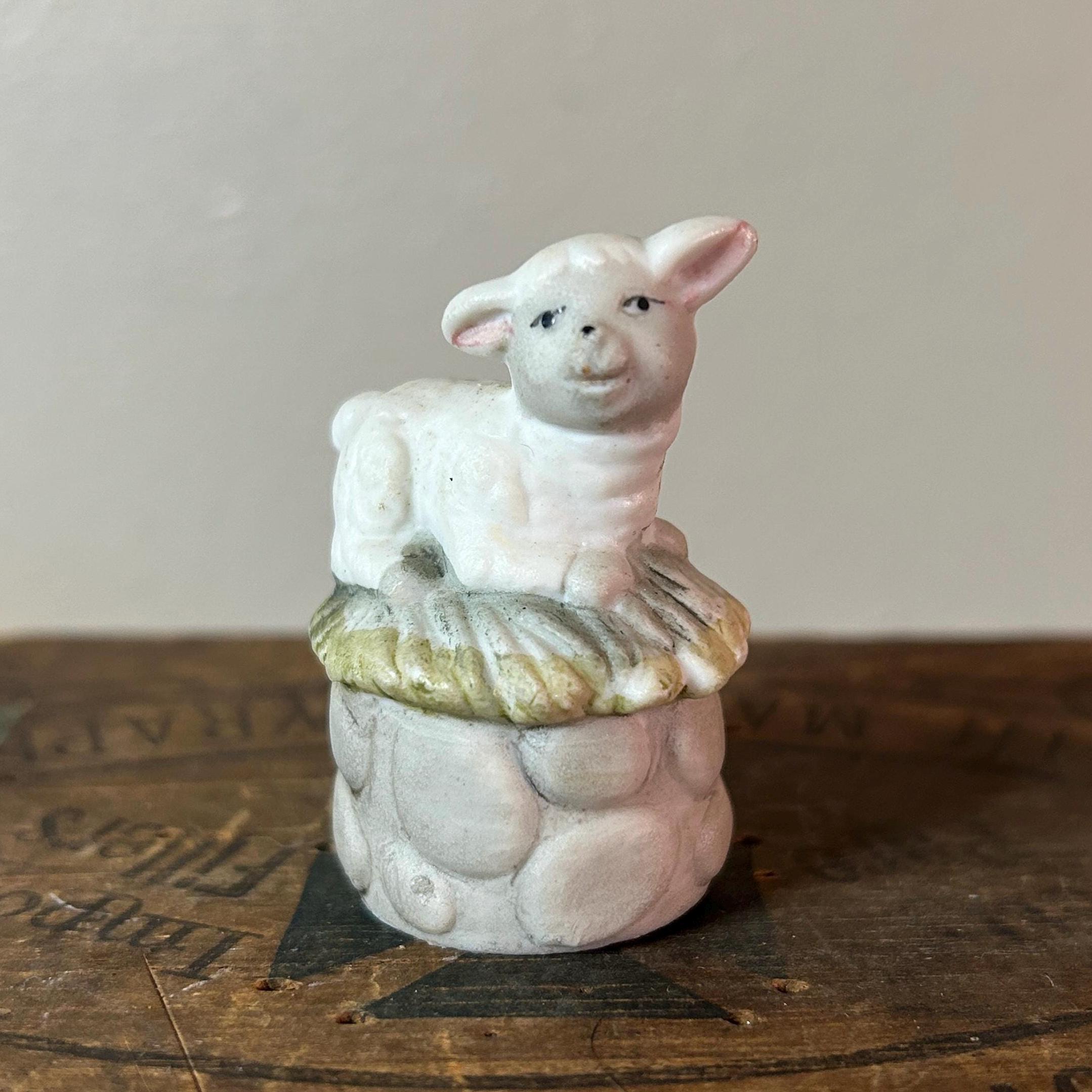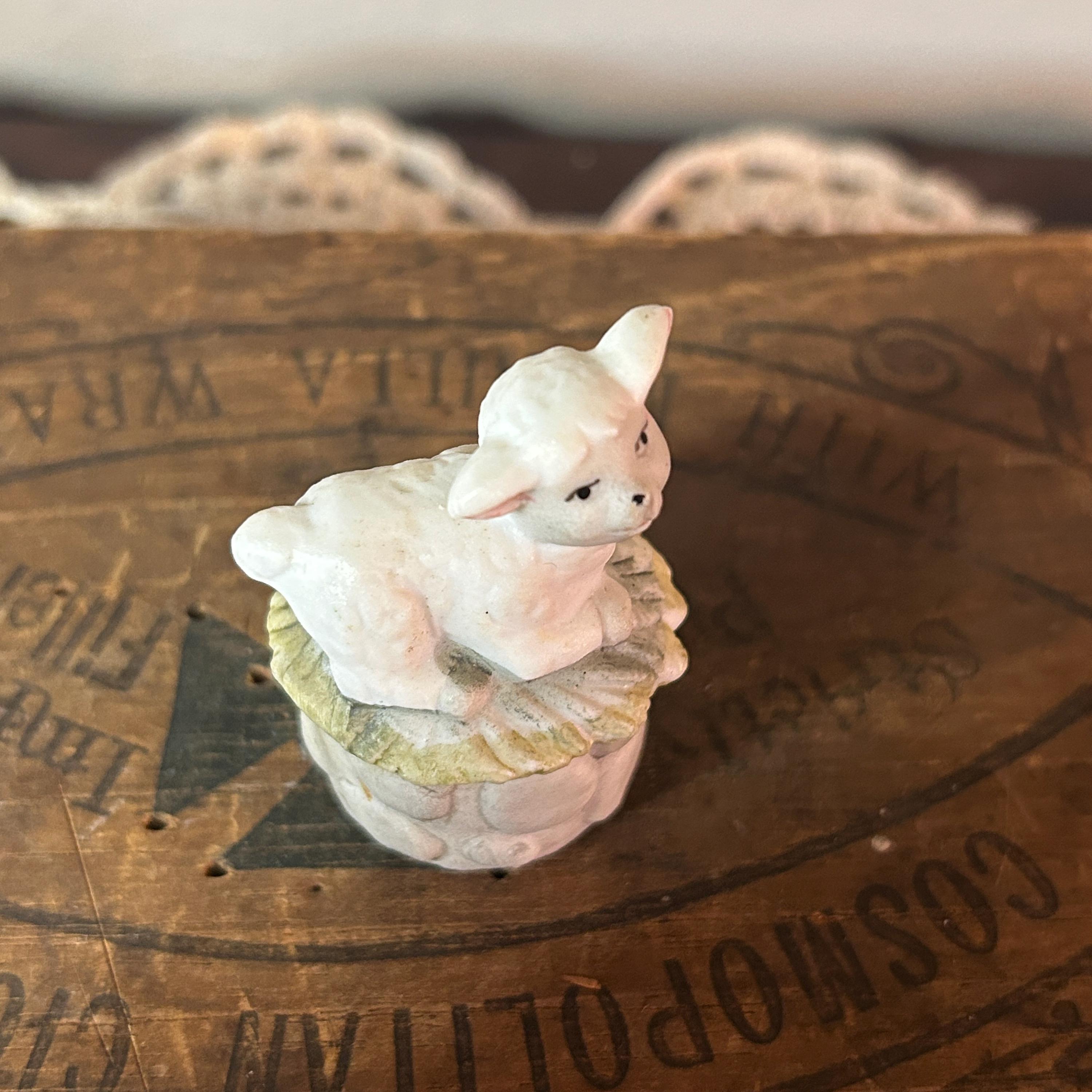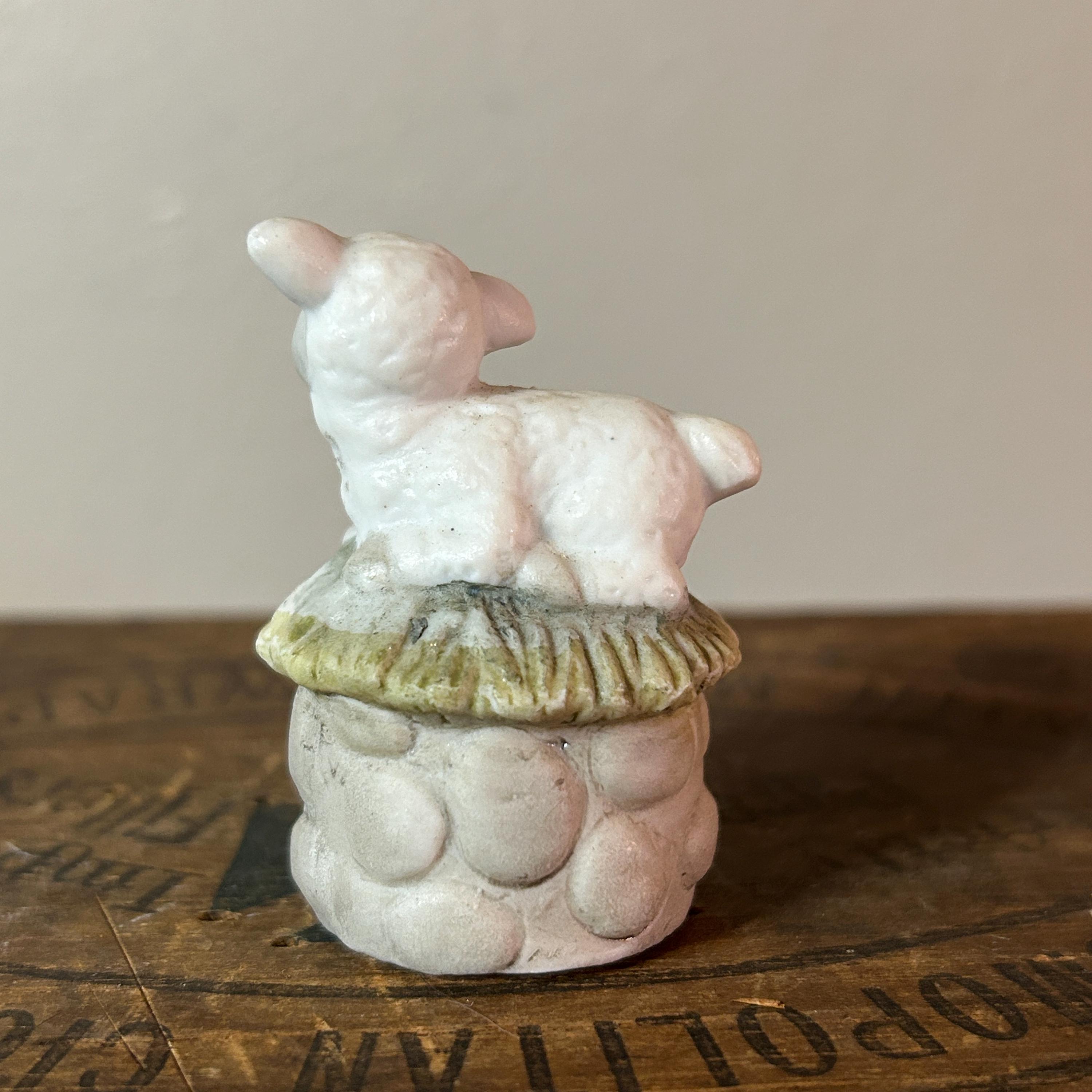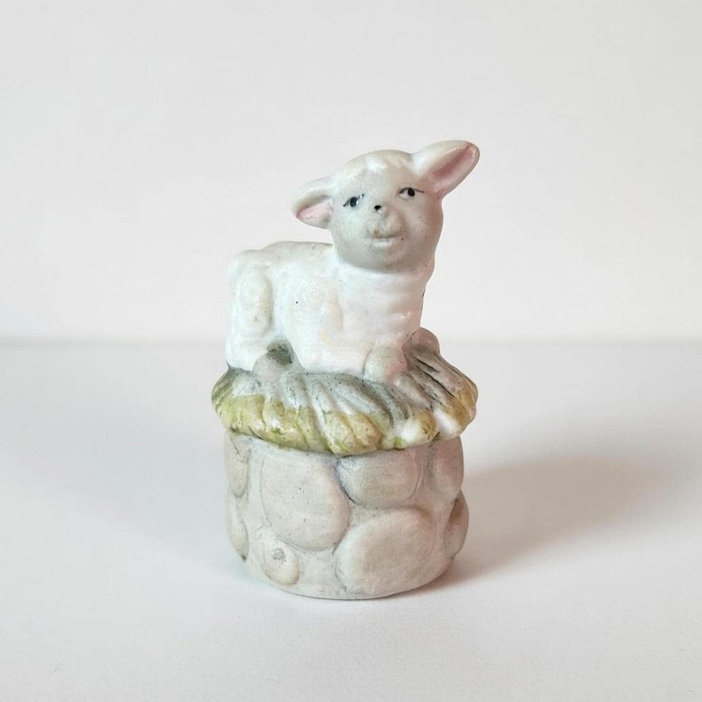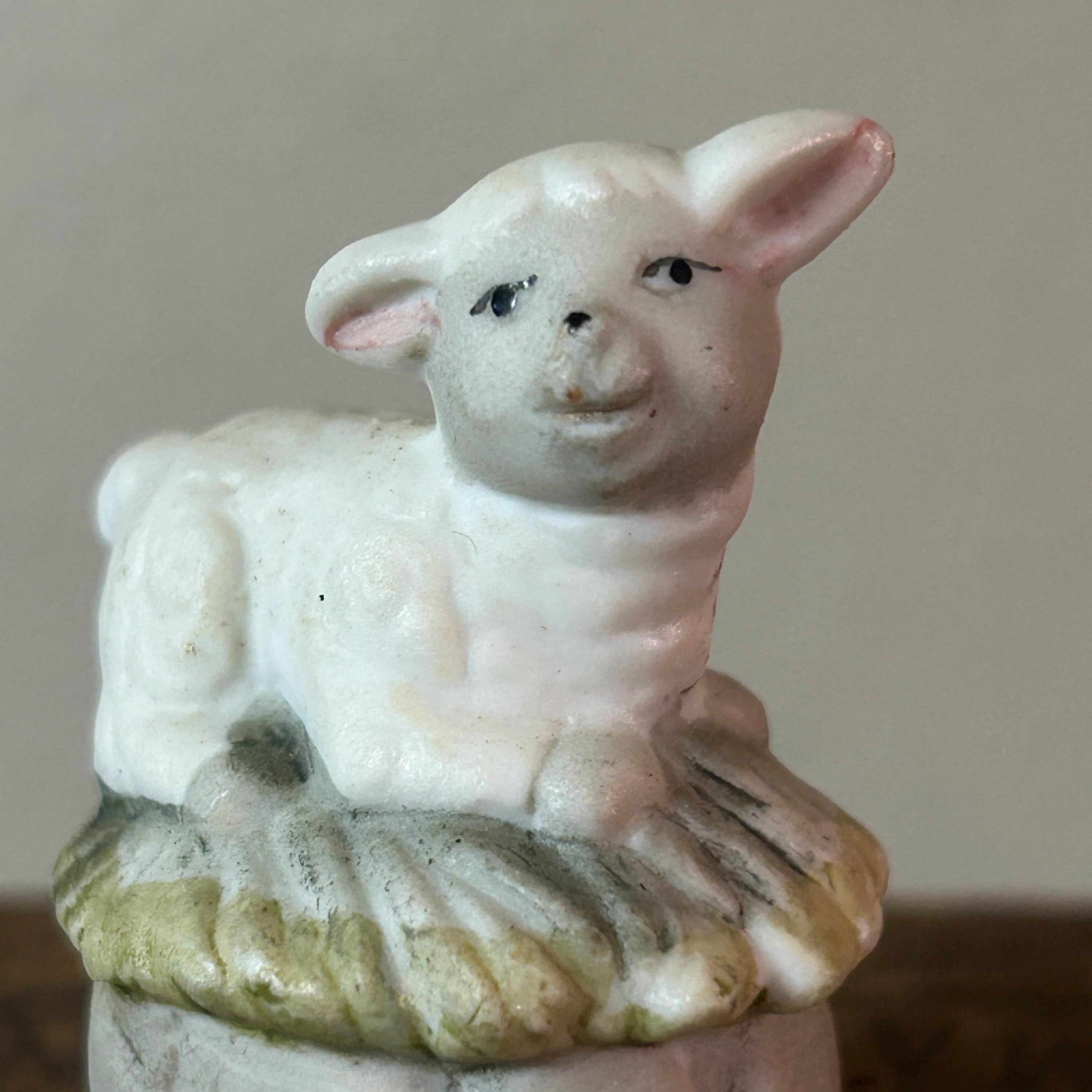 This tiny little lamb sits on a bed of grass and a stone wall. He has a matte porcelain finish. Measures 2" X 1 1/2". He is in excellent condition with no chips or cracks. Very clean.