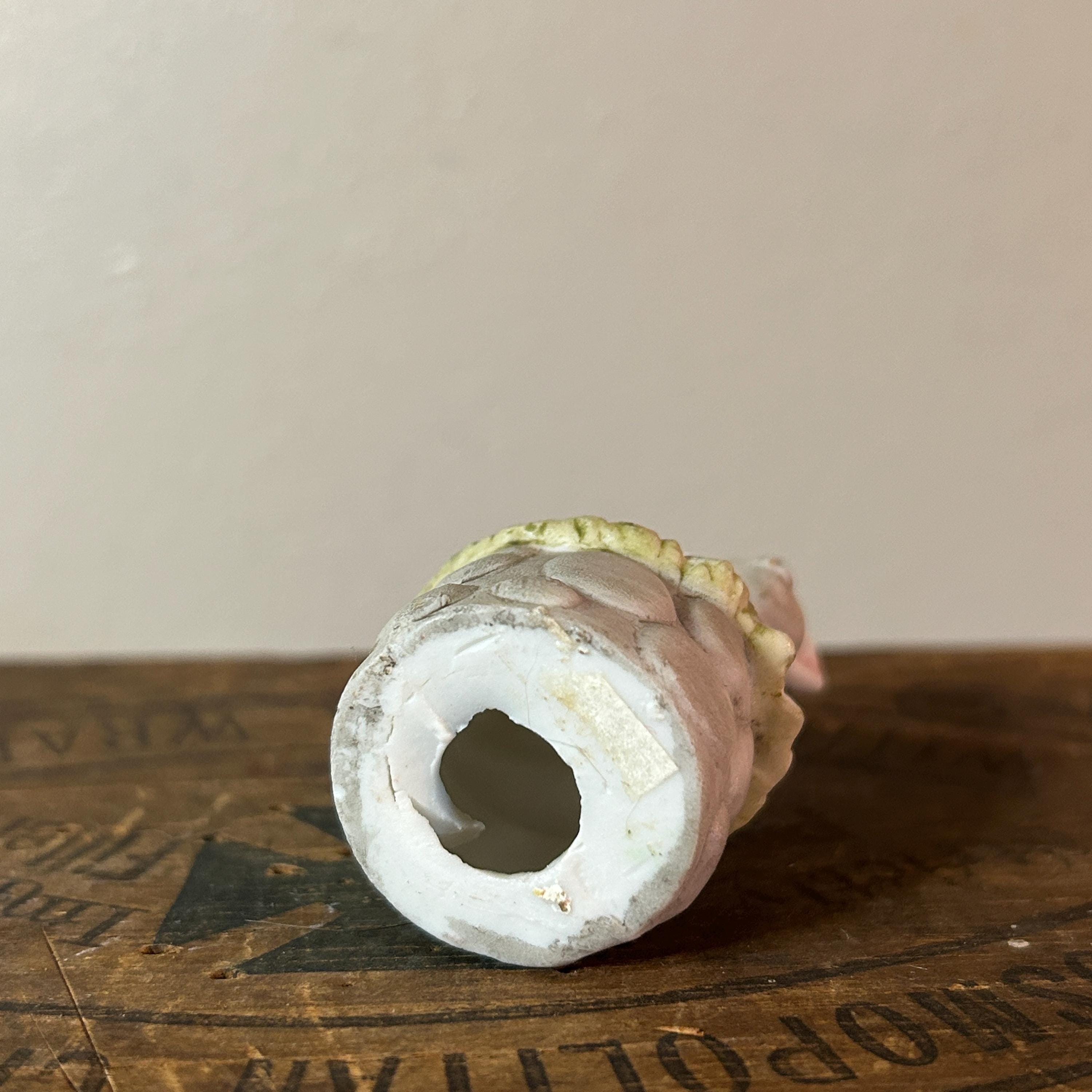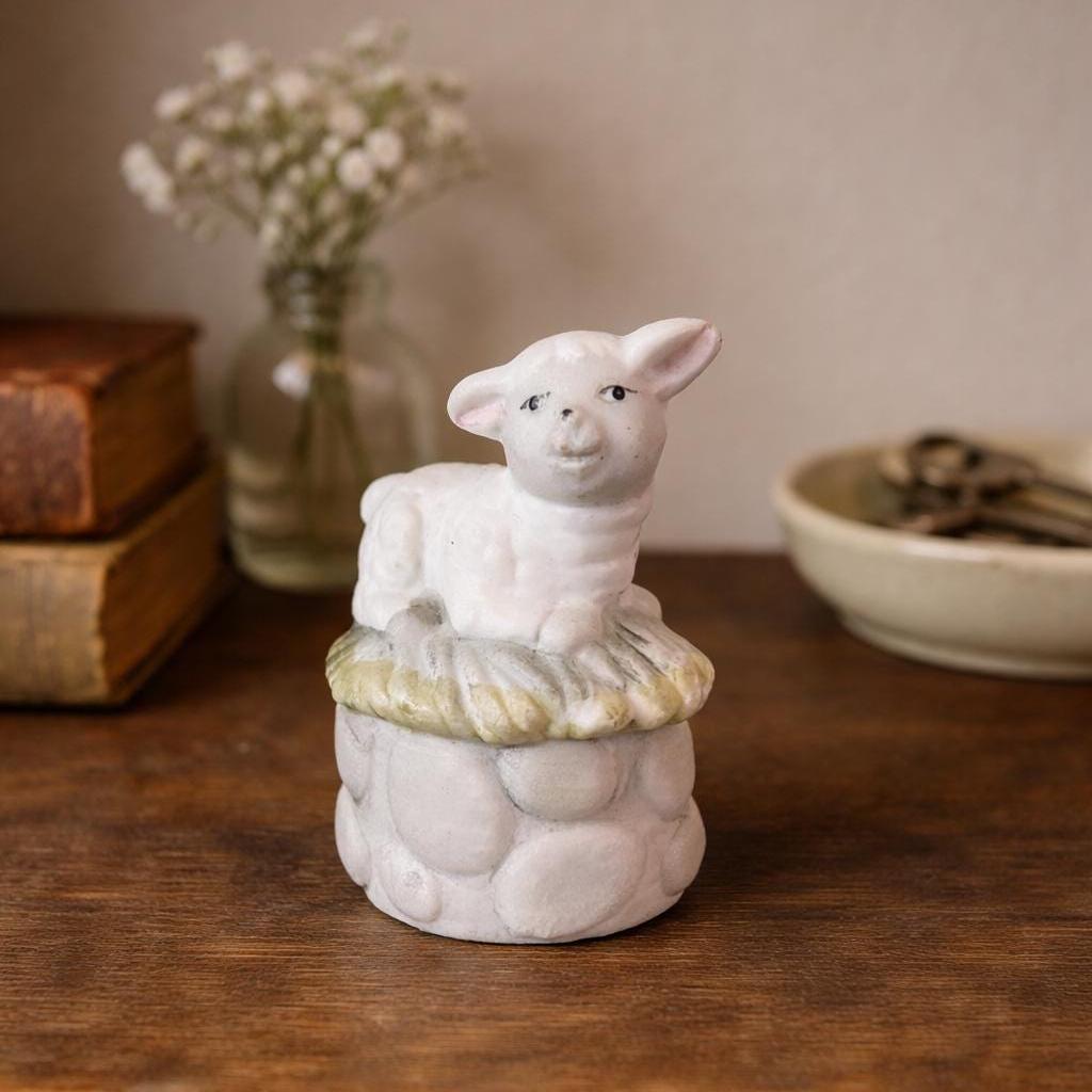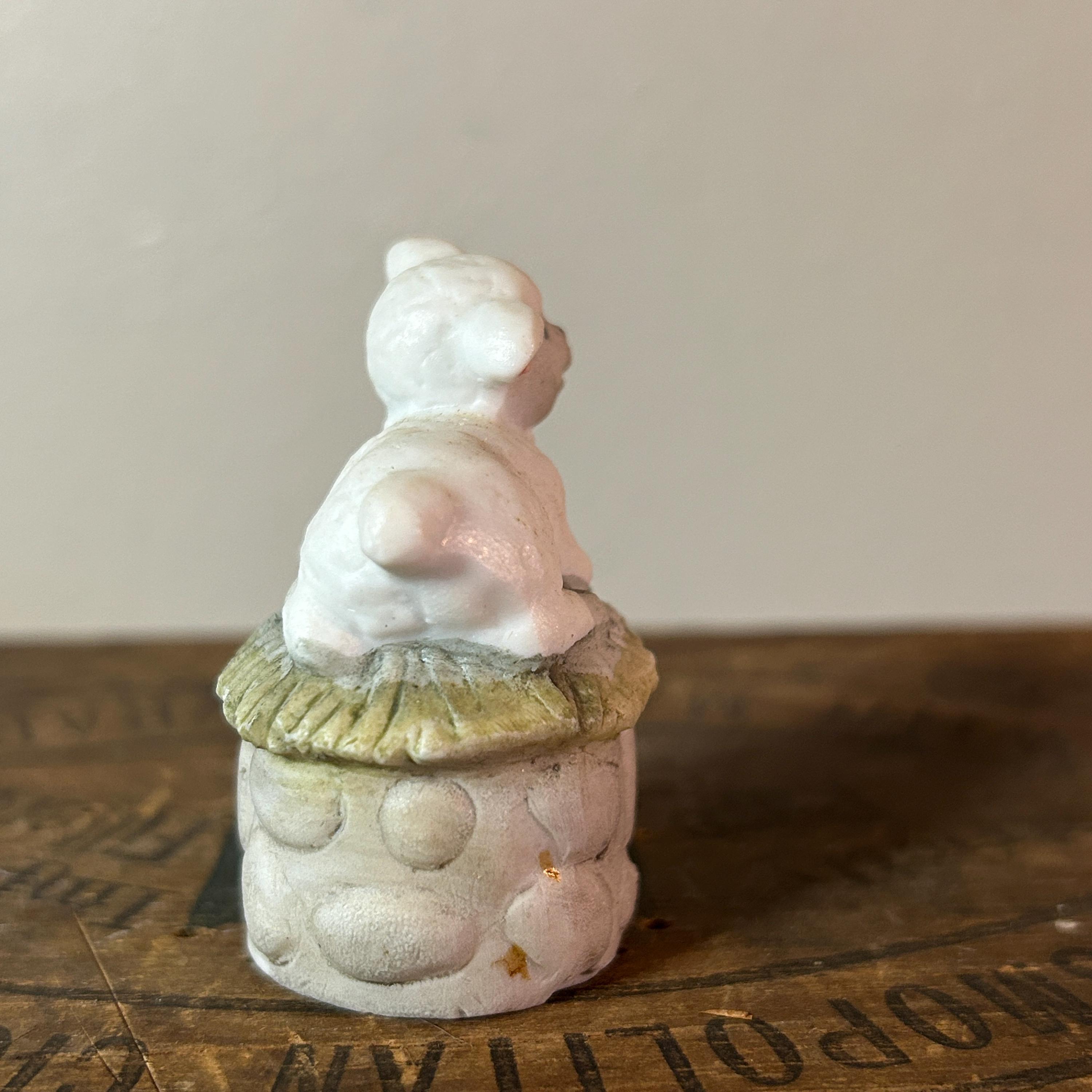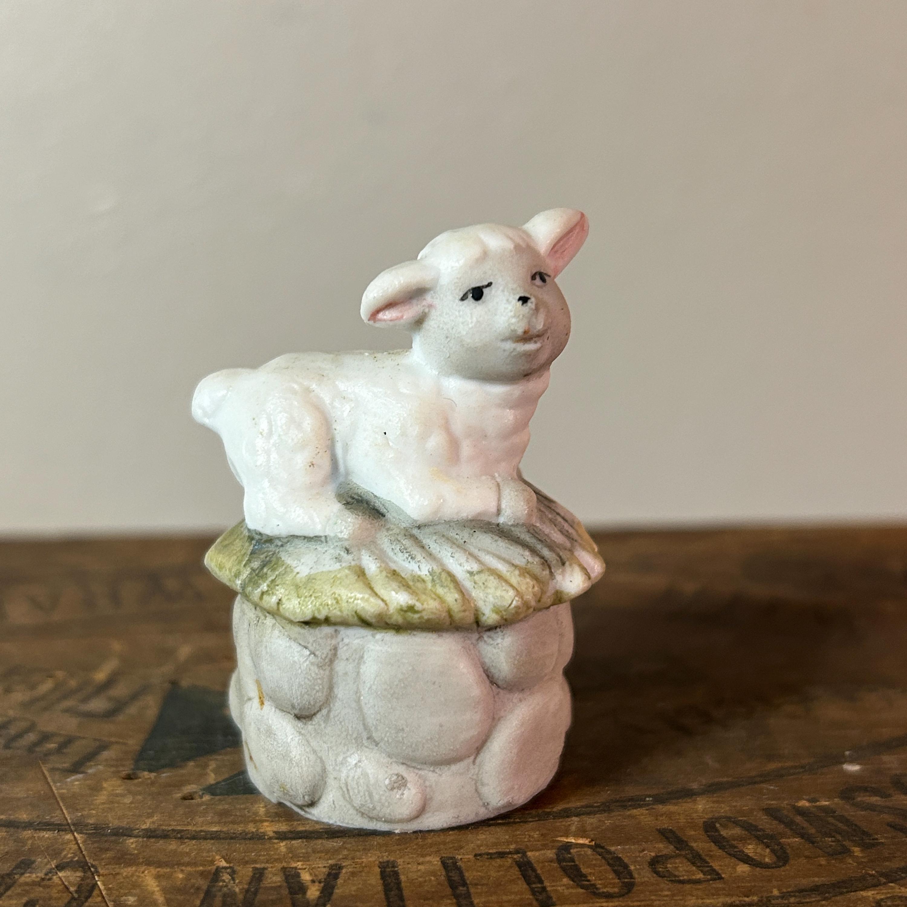 This tiny little lamb sits on a bed of grass and a stone wall. He has a matte porcelain finish. Measures 2" X 1 1/2". He is in excellent condition with no chips or cracks. Very clean.